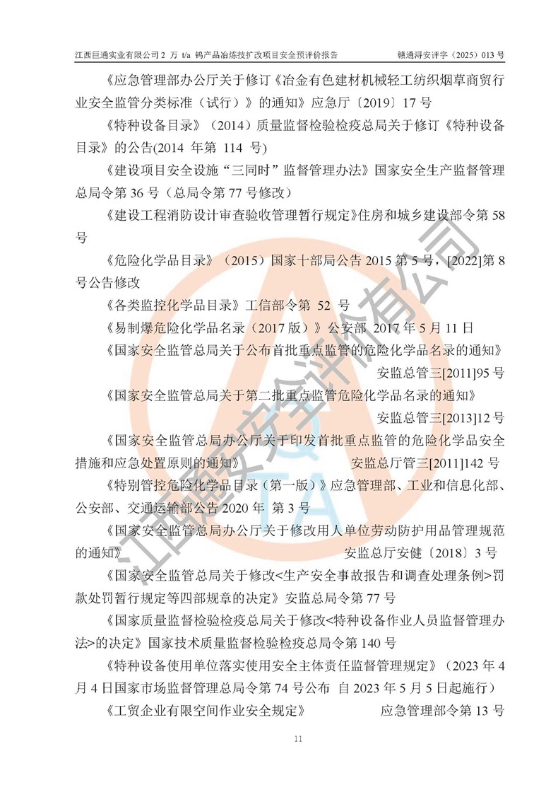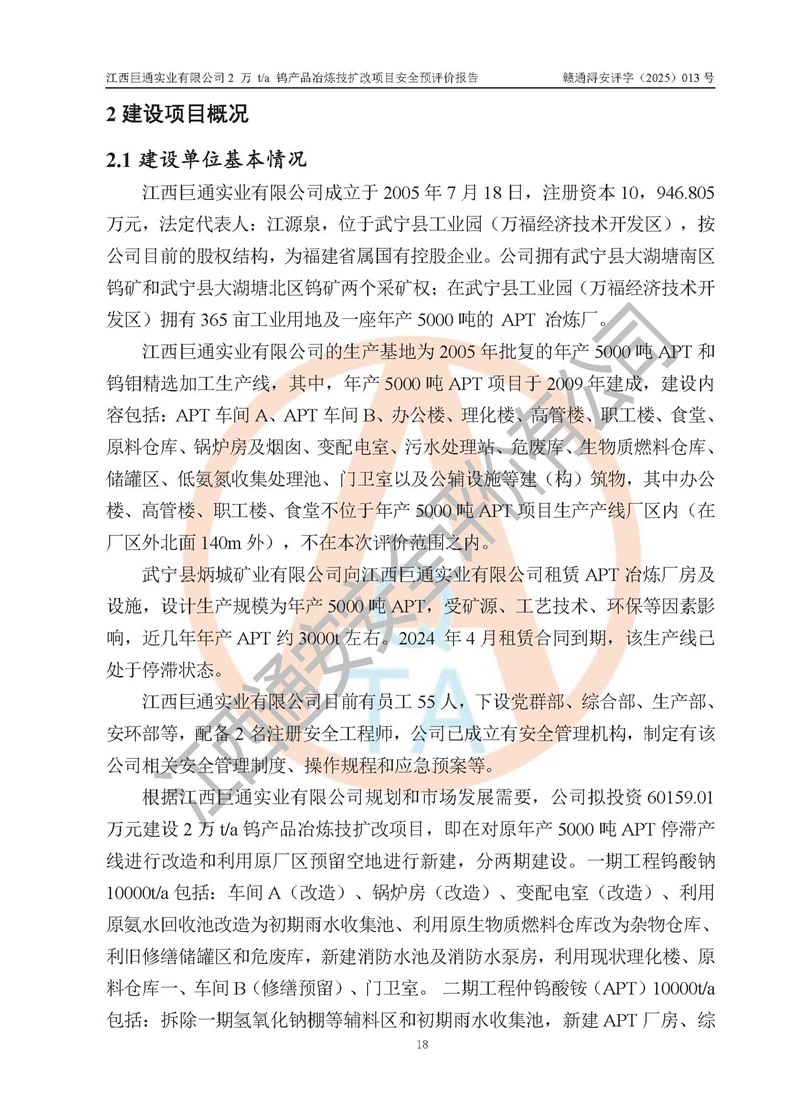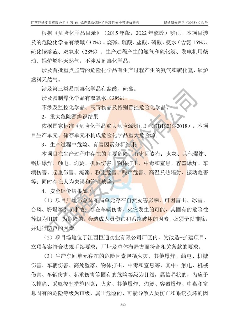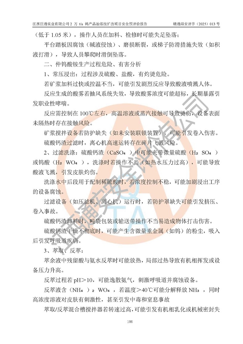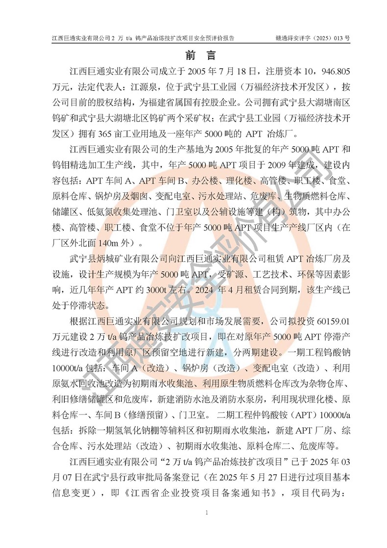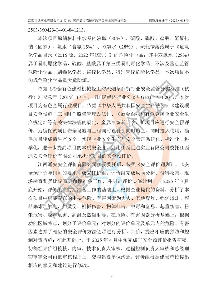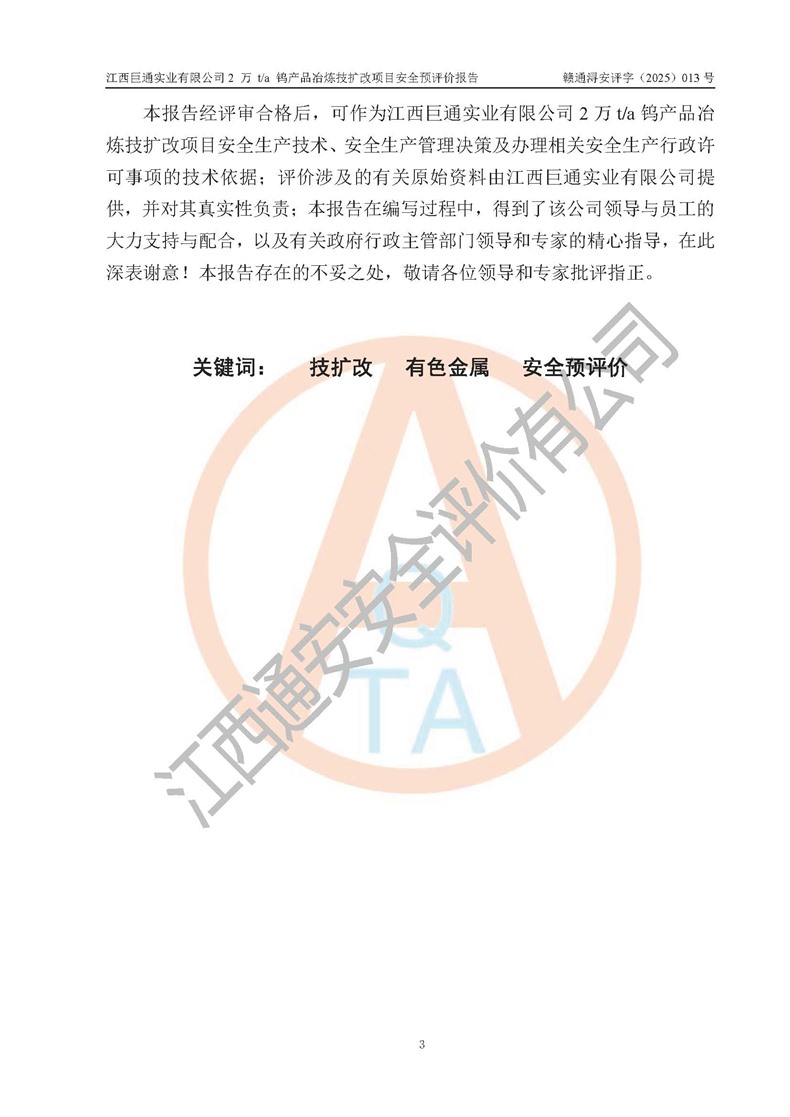 评价报告名称 | 江西巨通实业有限公司2 万 t/a 钨产品冶炼技扩改项目安全预评价报告 | |||