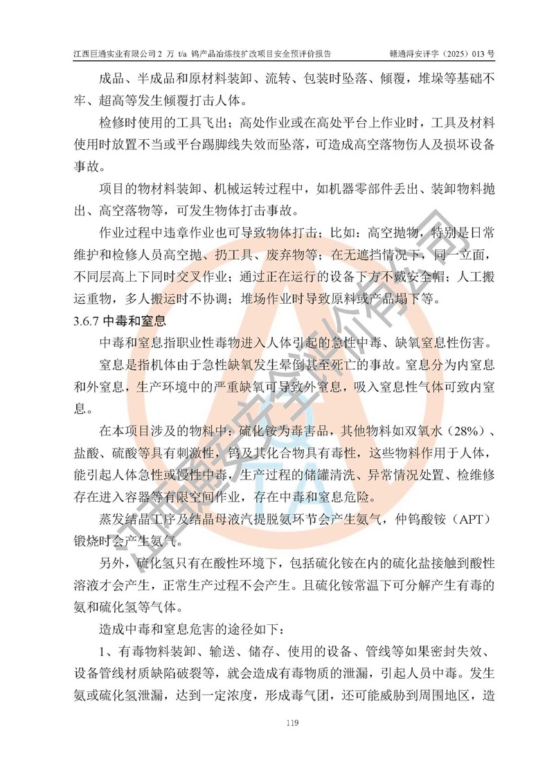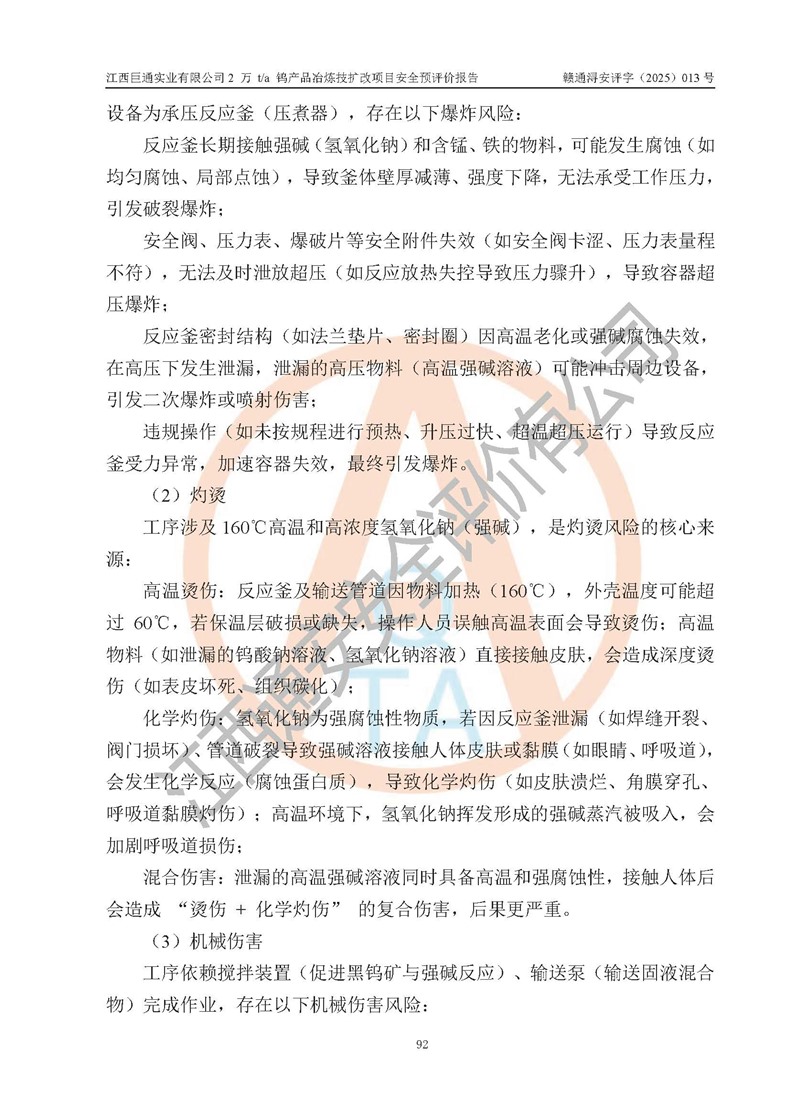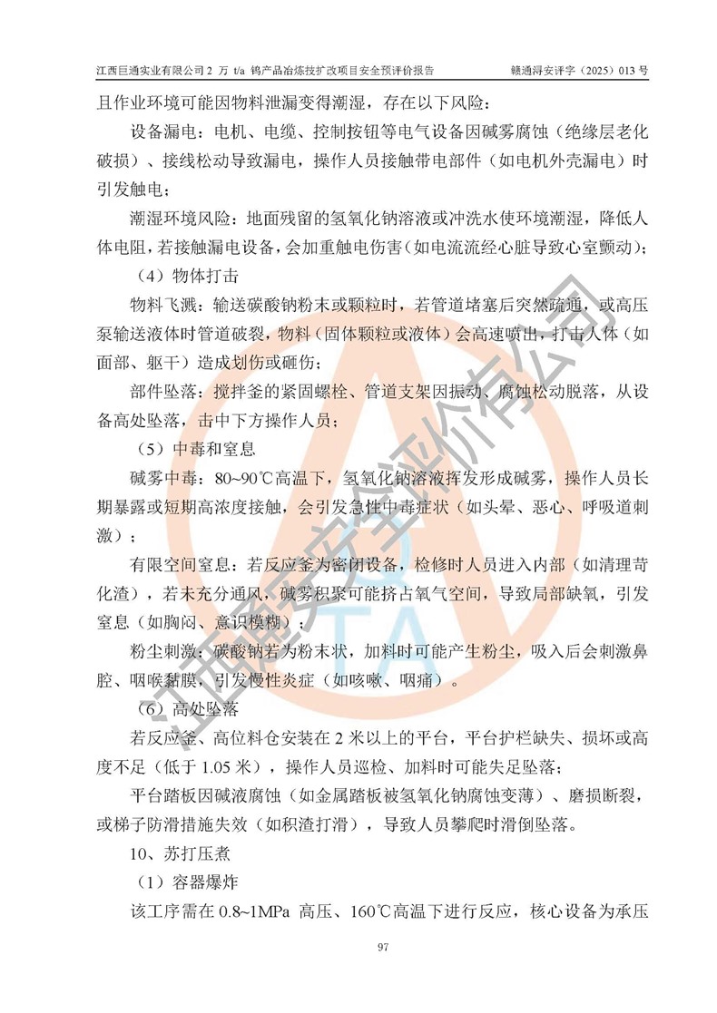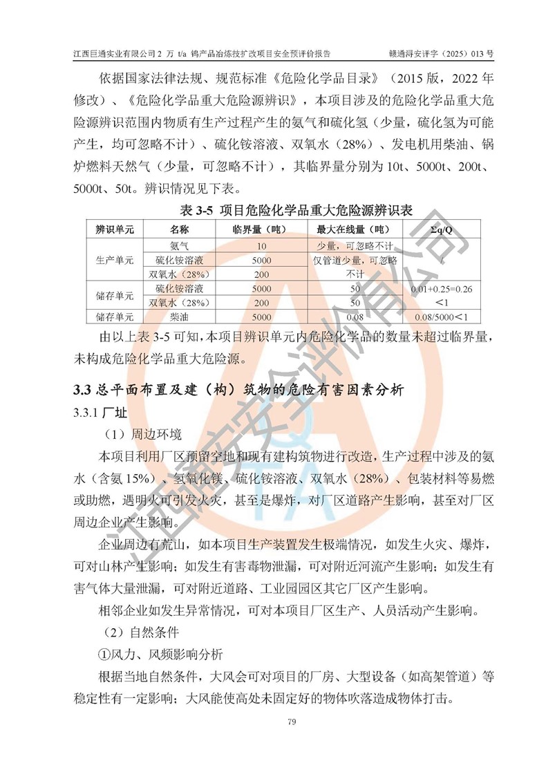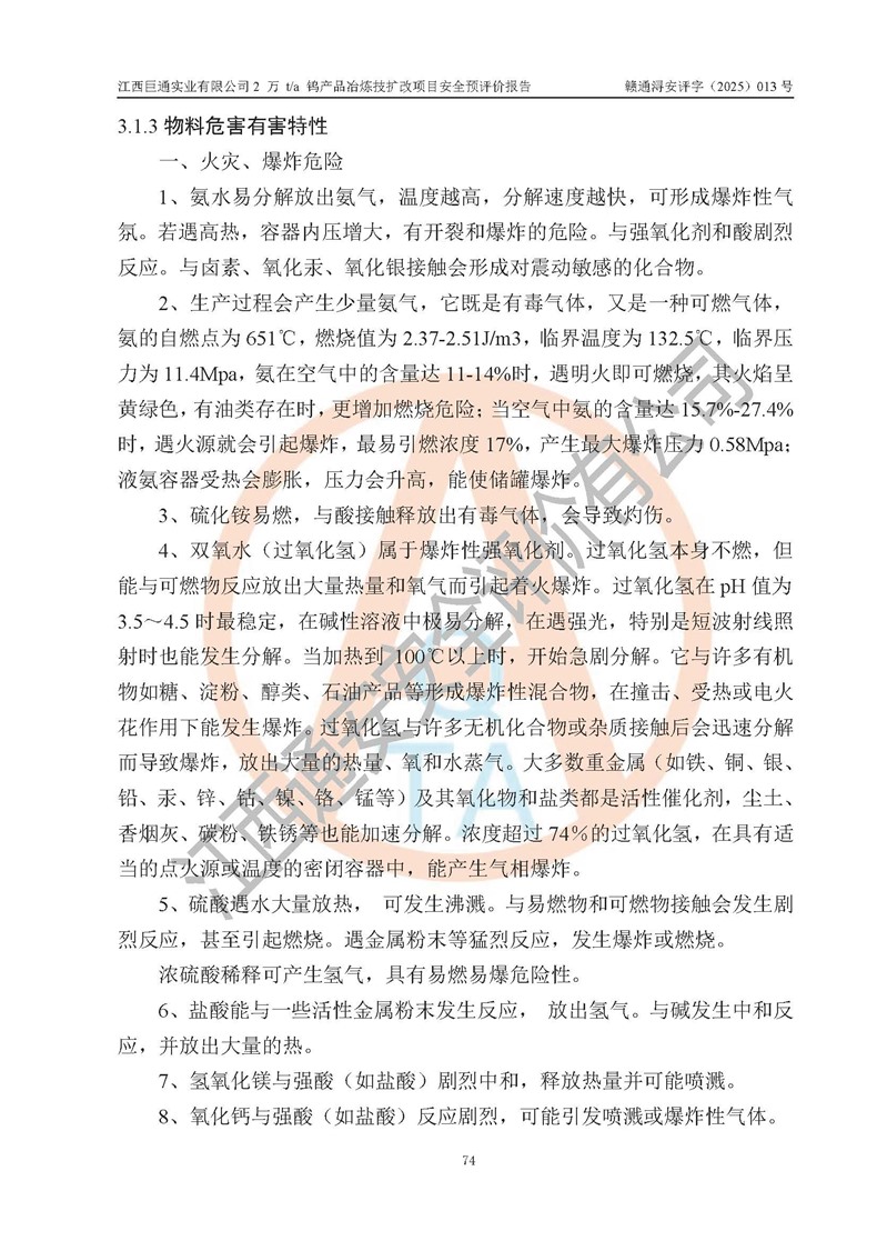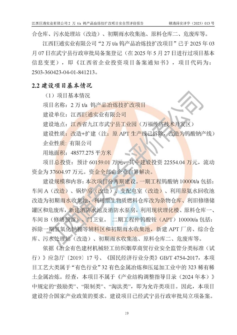 评价报告名称 | 江西巨通实业有限公司2 万 t/a 钨产品冶炼技扩改项目安全预评价报告 | |||