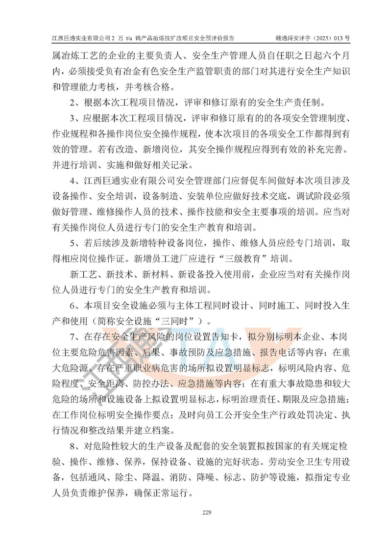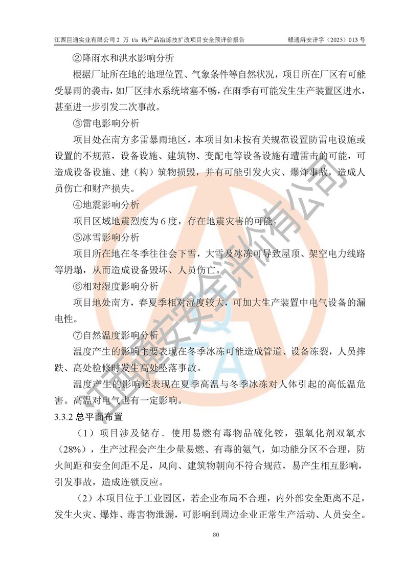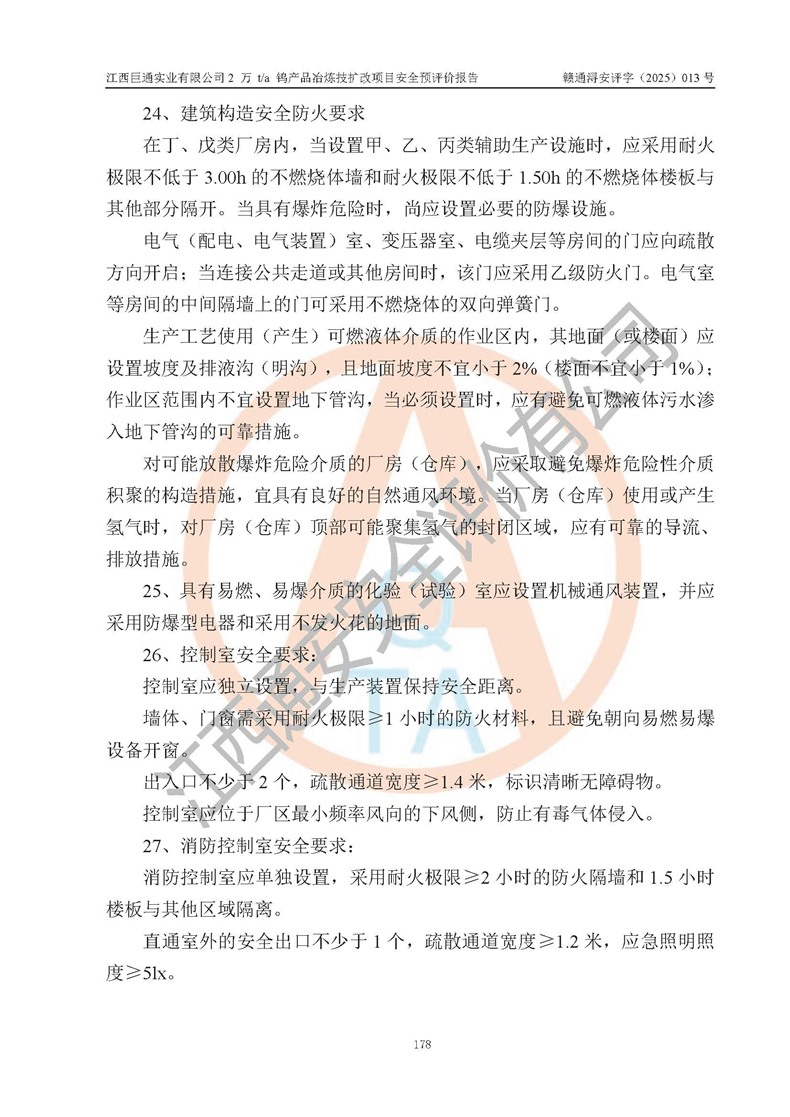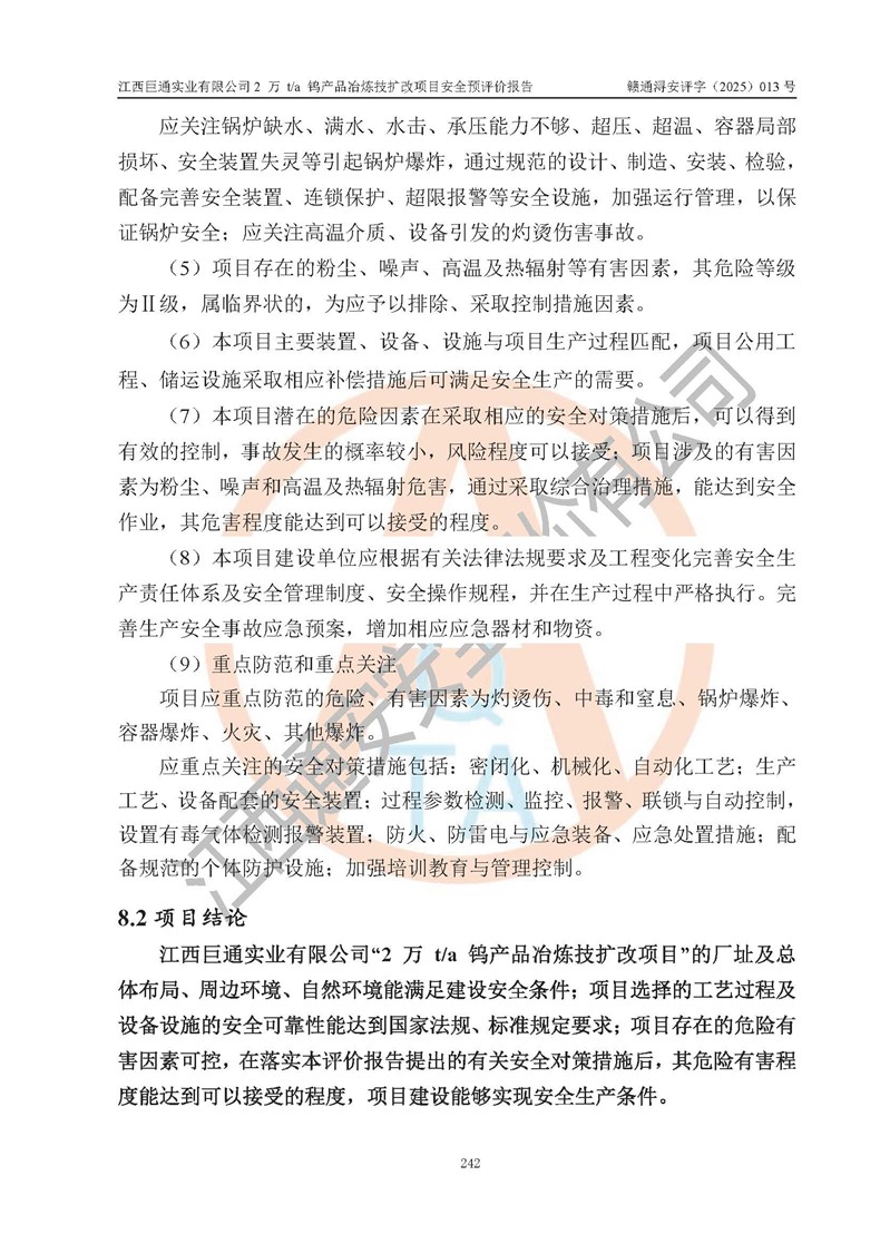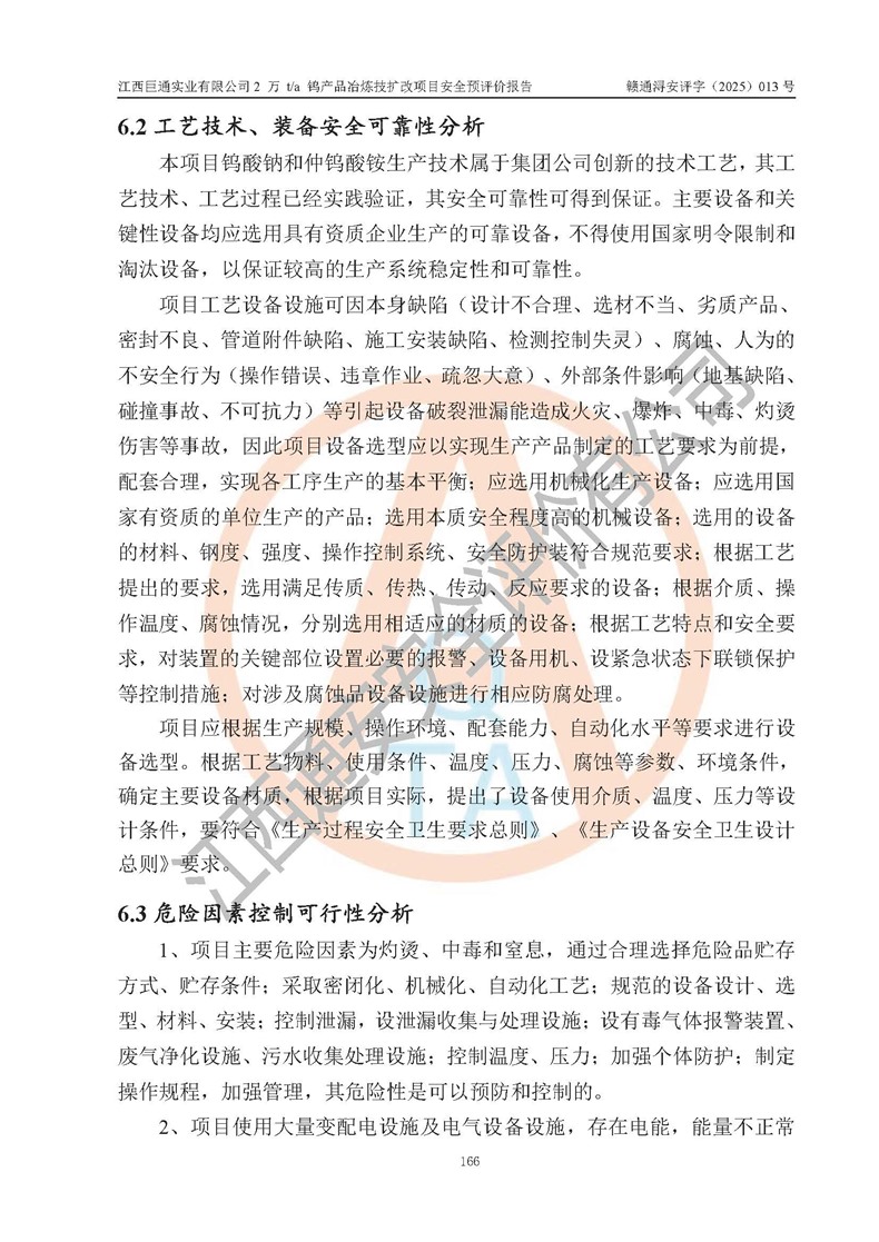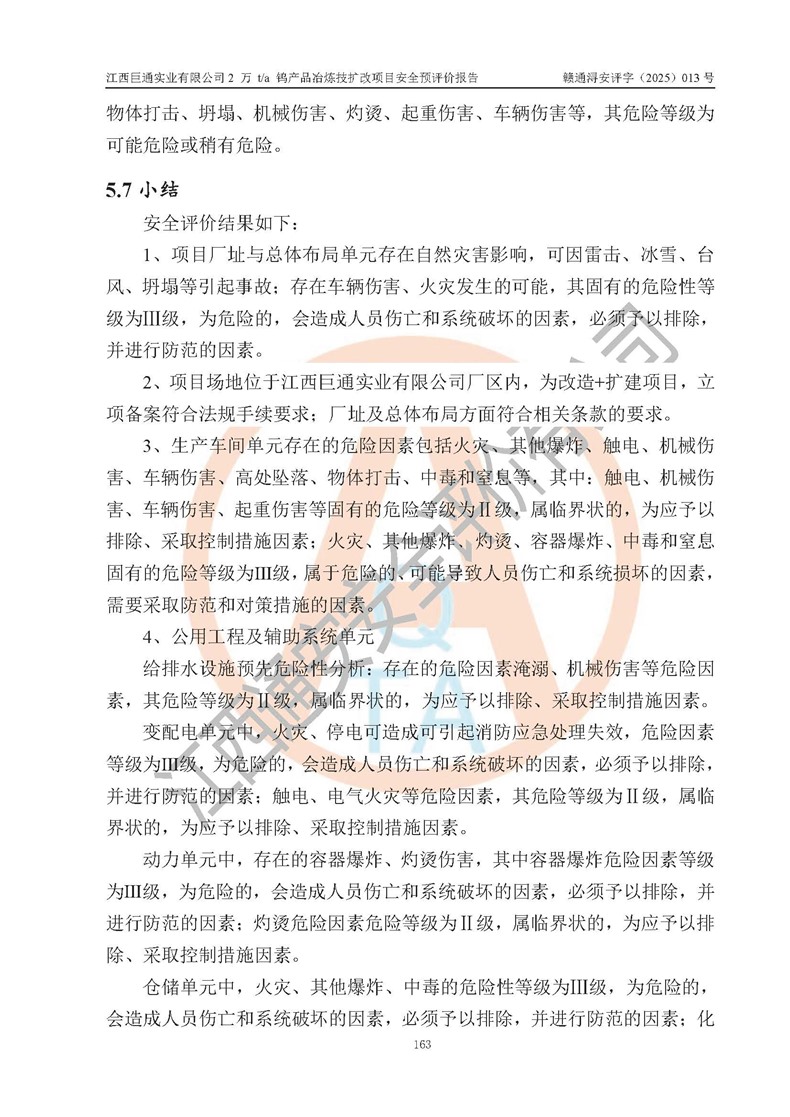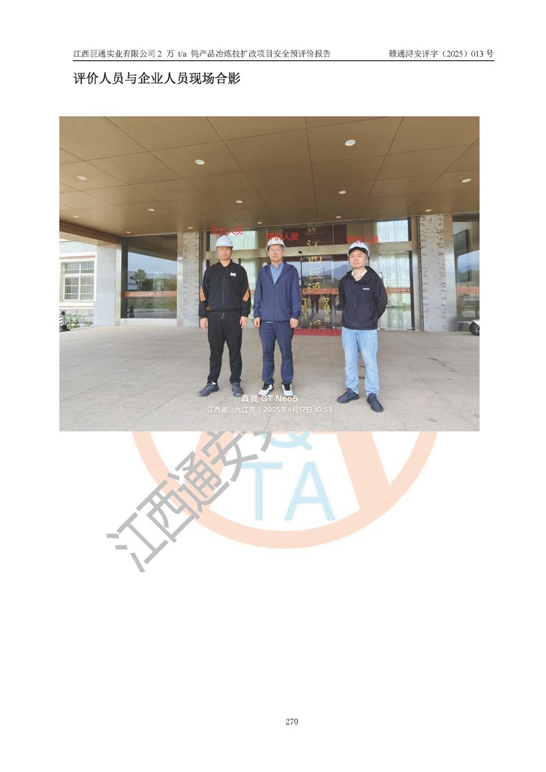 评价结论 | 江西巨通实业有限公司“2 万 t/a 钨产品冶炼技扩改项目”的厂址及总体布局、周边环境、自然环境能满足建设安全条件;项目选择的工艺过程及设备设施的安全可靠性能达到**法规、标准规定要求;项目存在的危险有害因素可控,在落实本评价报告提出的有关安全对策措施后,其危险有害程度能达到可以接受的程度,项目建设能够实现安全生产条件。 | |||
