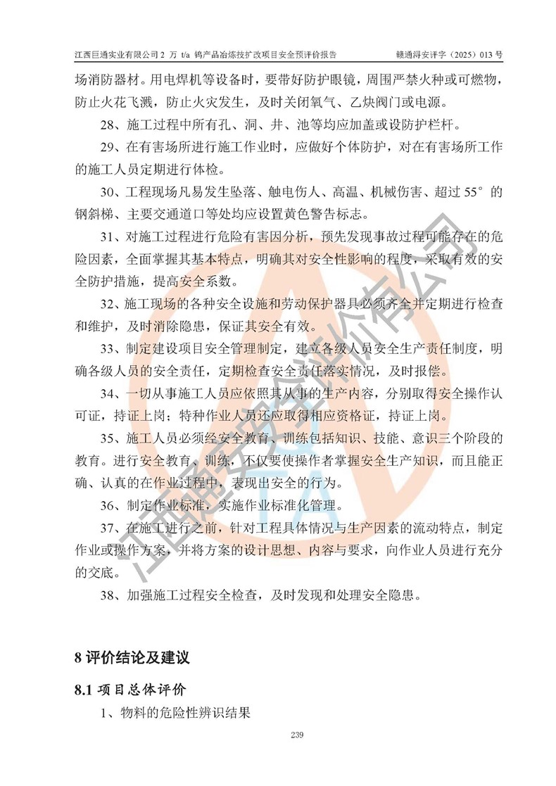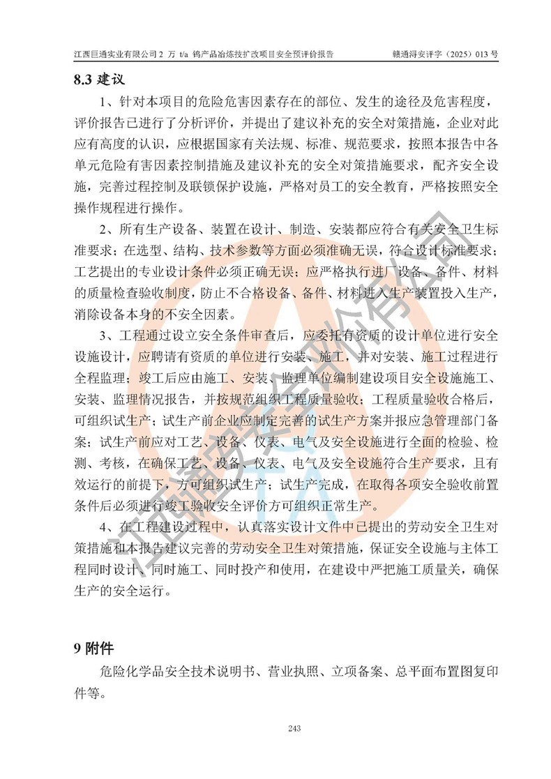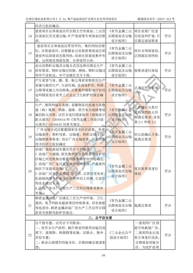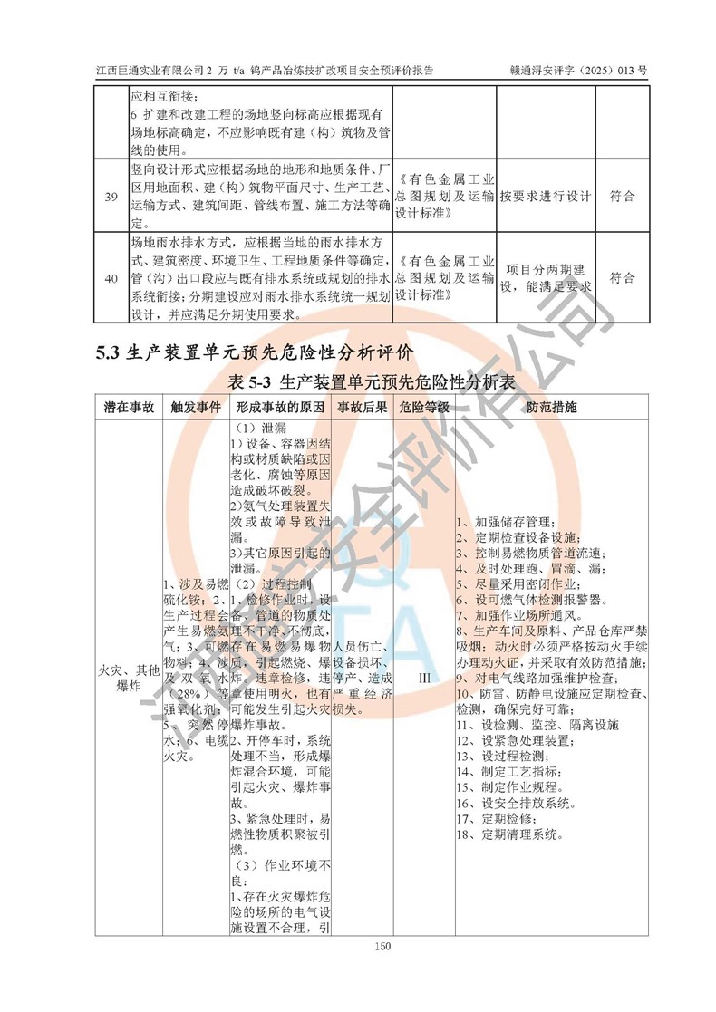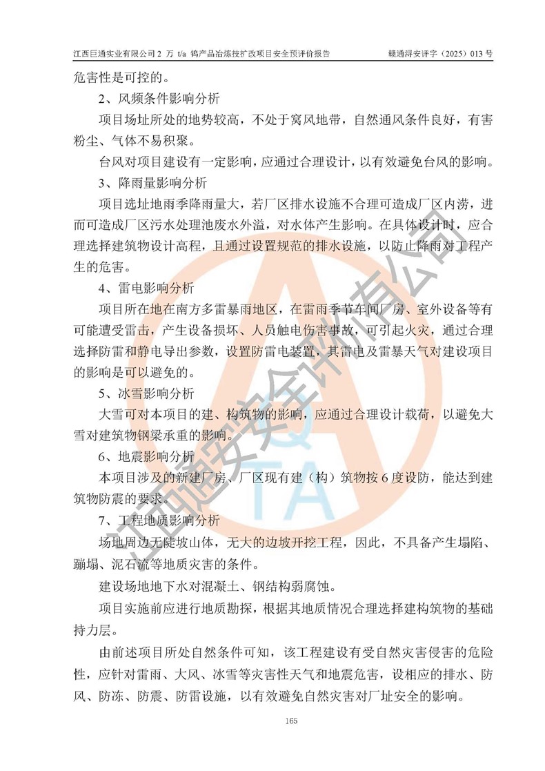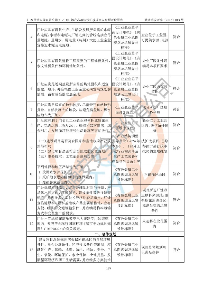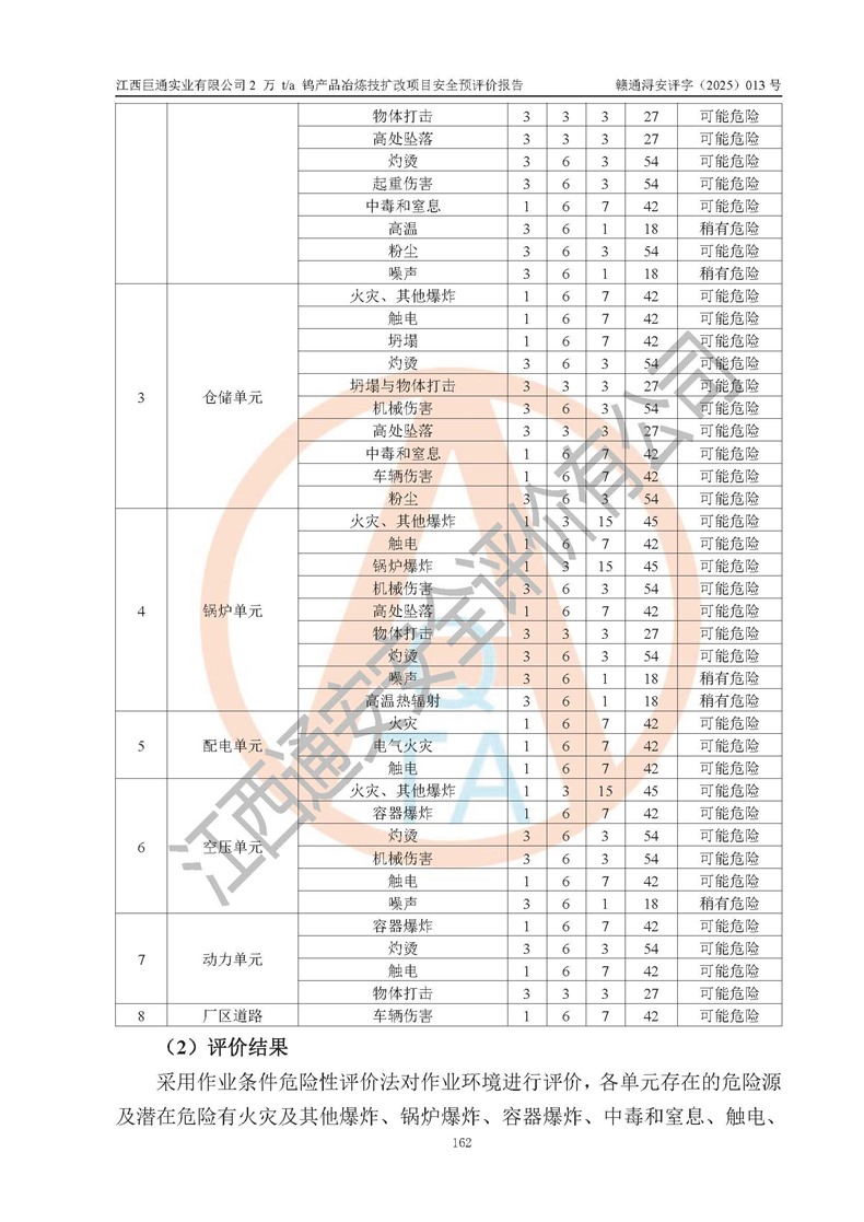 评价结论 | 江西巨通实业有限公司“2 万 t/a 钨产品冶炼技扩改项目”的厂址及总体布局、周边环境、自然环境能满足建设安全条件;项目选择的工艺过程及设备设施的安全可靠性能达到**法规、标准规定要求;项目存在的危险有害因素可控,在落实本评价报告提出的有关安全对策措施后,其危险有害程度能达到可以接受的程度,项目建设能够实现安全生产条件。 | |||