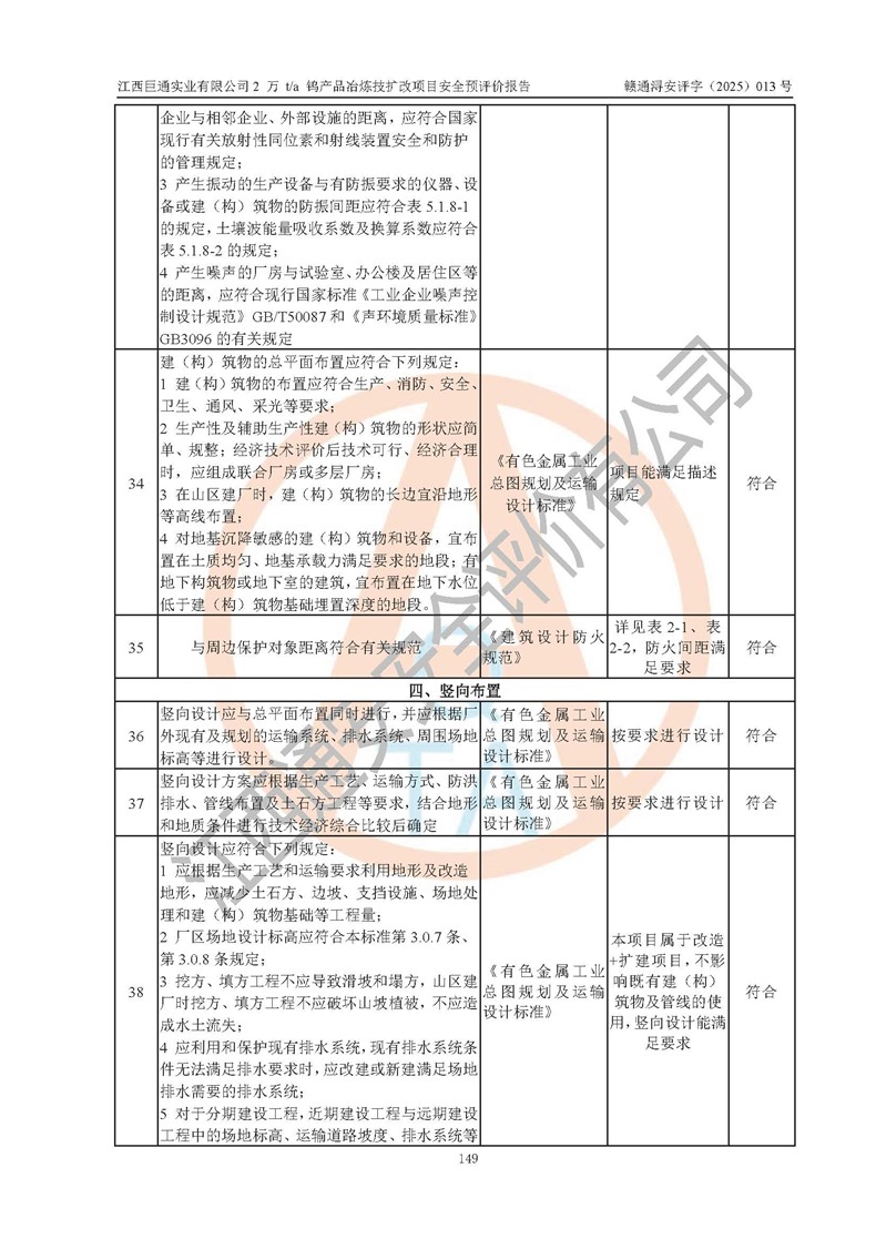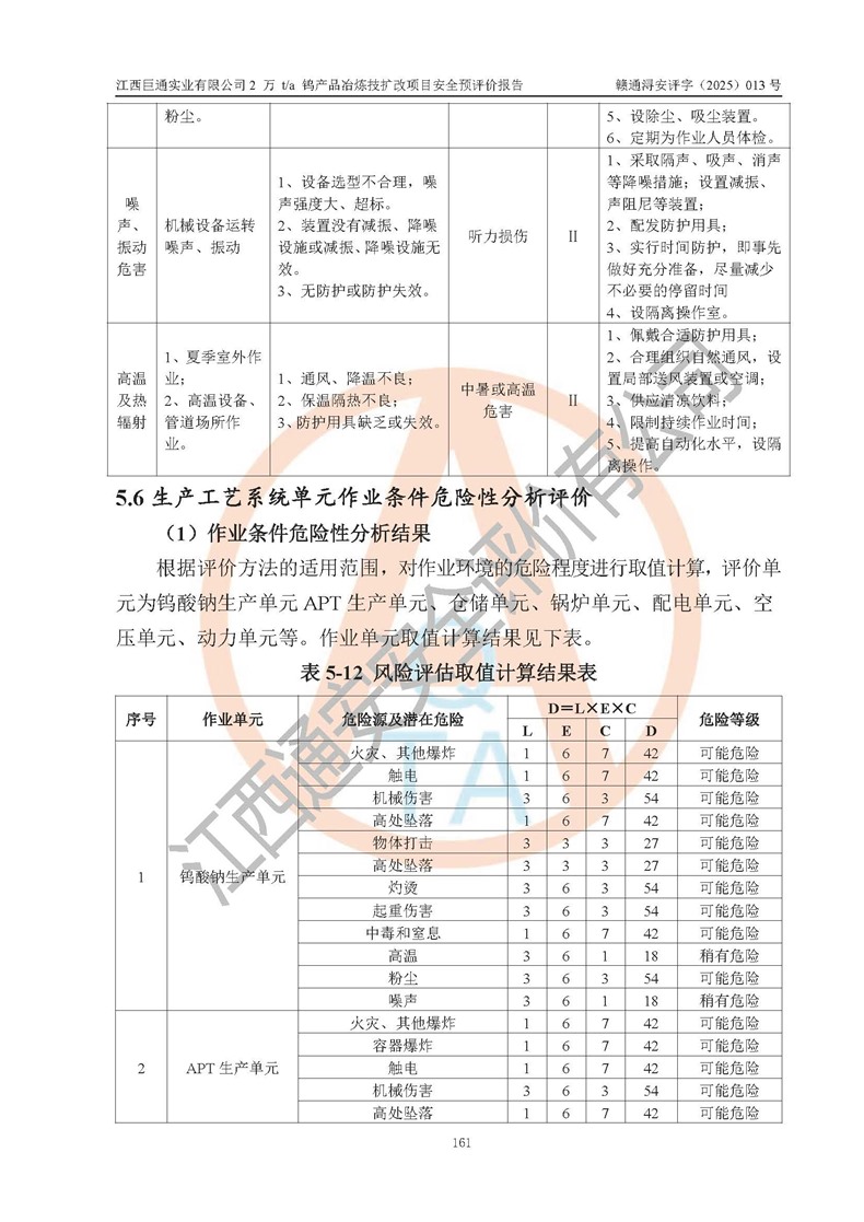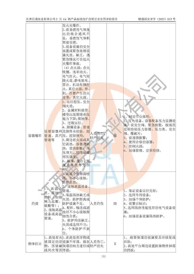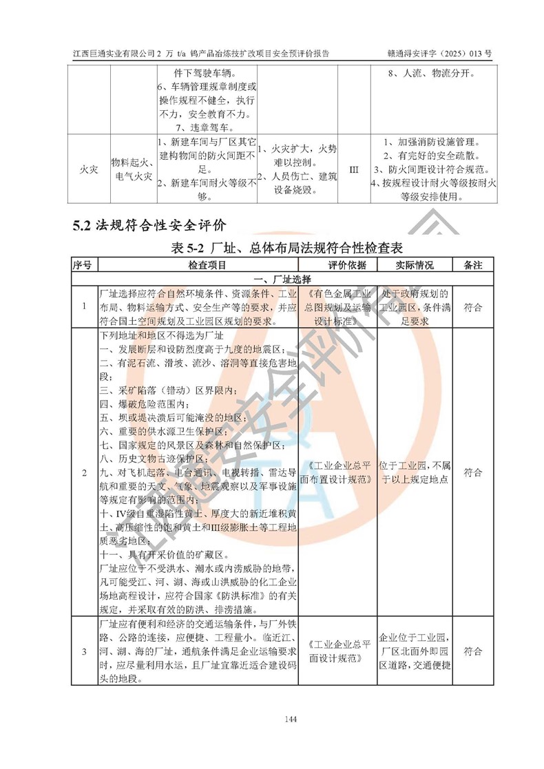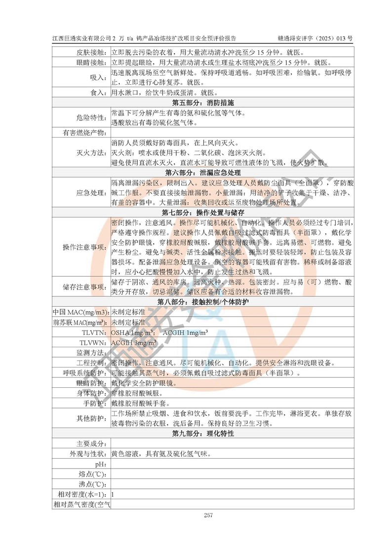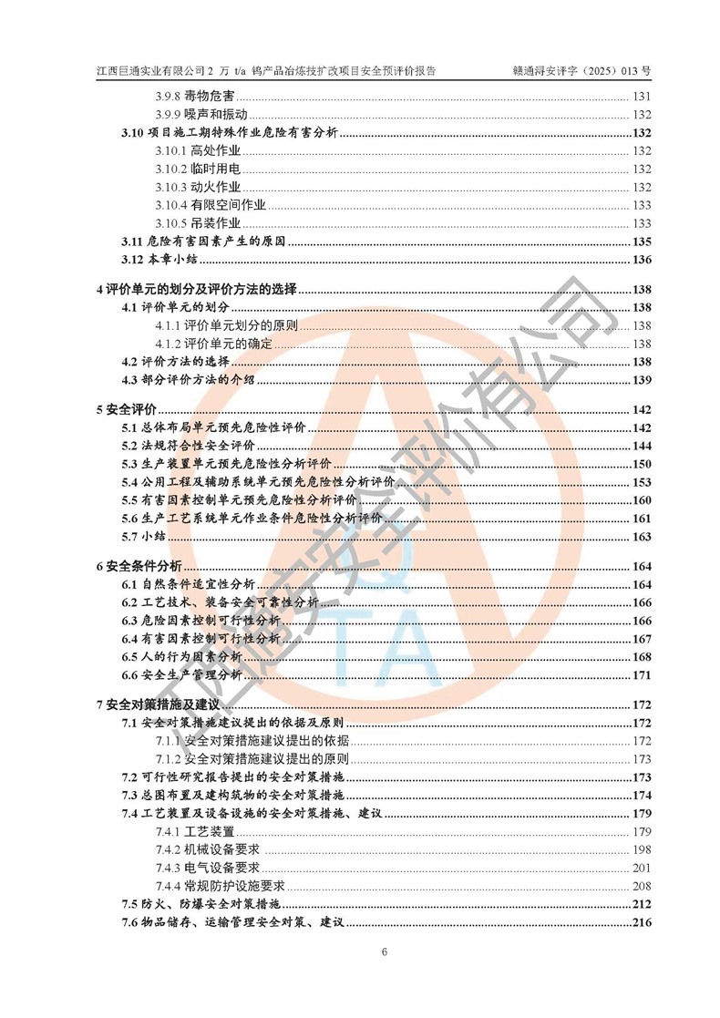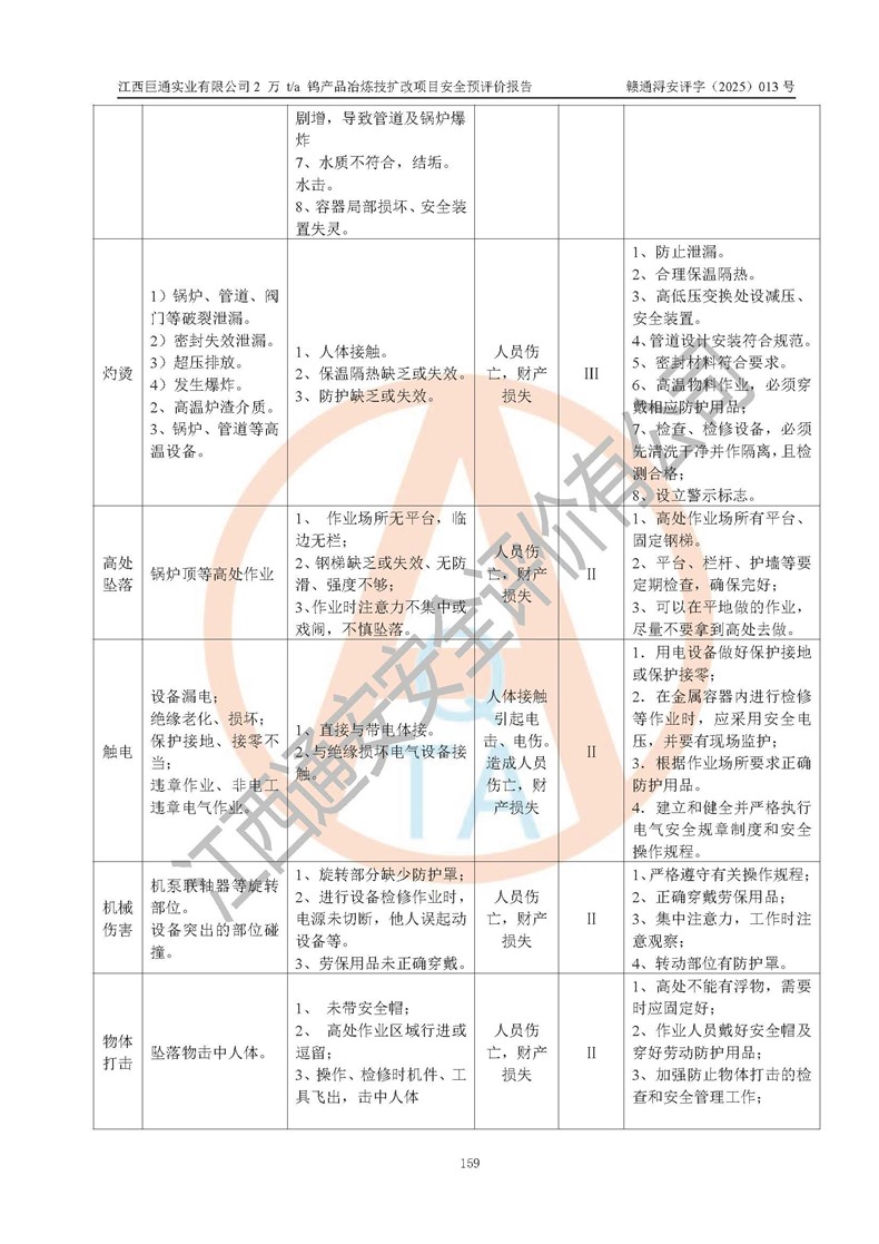 评价结论 | 江西巨通实业有限公司“2 万 t/a 钨产品冶炼技扩改项目”的厂址及总体布局、周边环境、自然环境能满足建设安全条件;项目选择的工艺过程及设备设施的安全可靠性能达到**法规、标准规定要求;项目存在的危险有害因素可控,在落实本评价报告提出的有关安全对策措施后,其危险有害程度能达到可以接受的程度,项目建设能够实现安全生产条件。 | |||