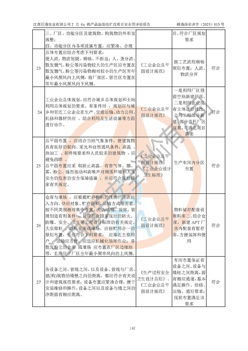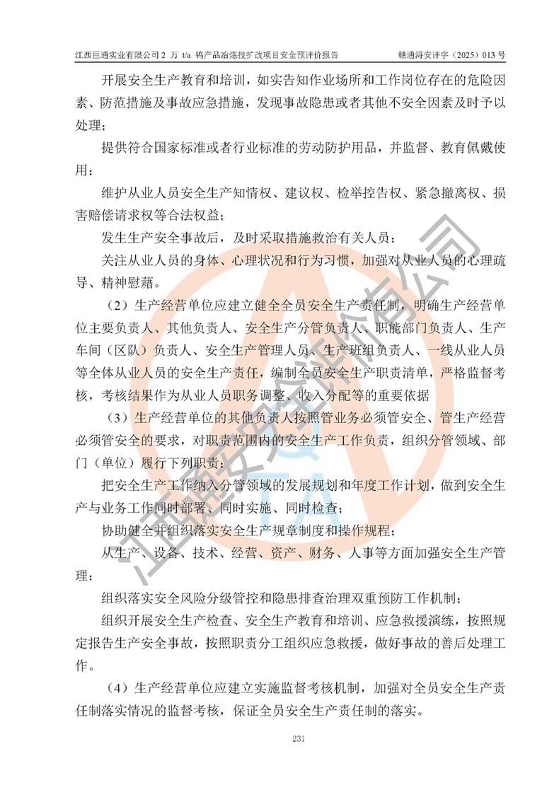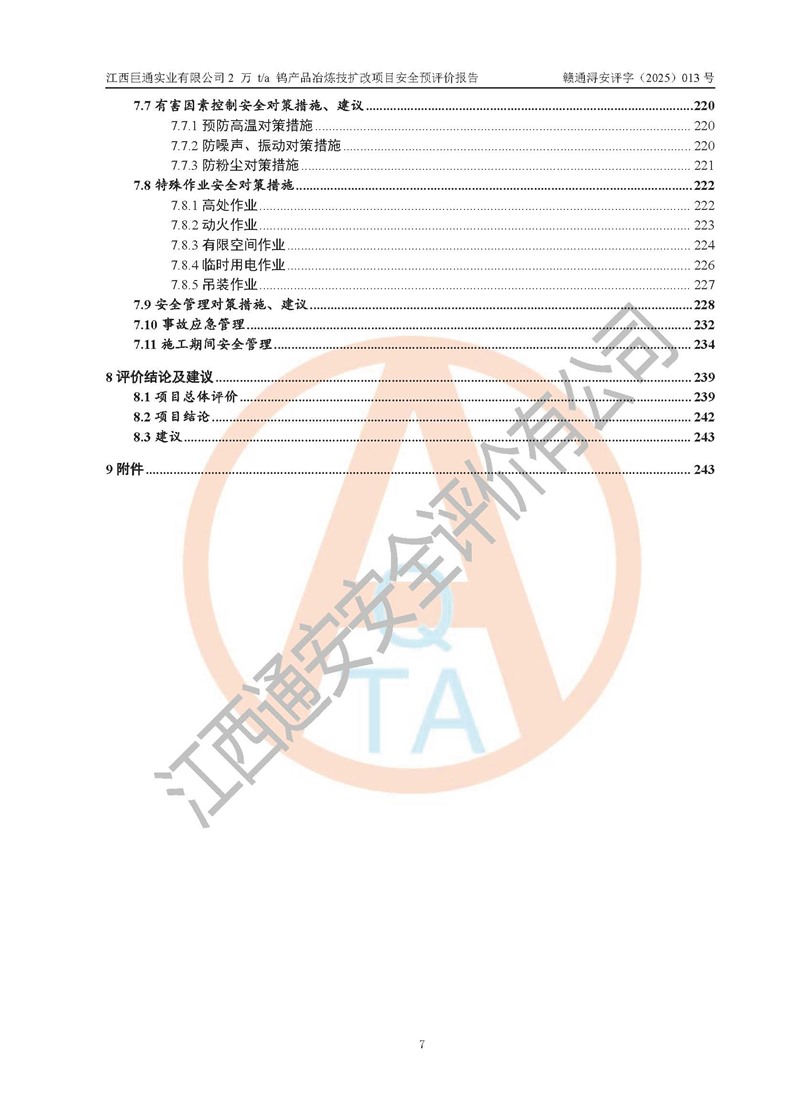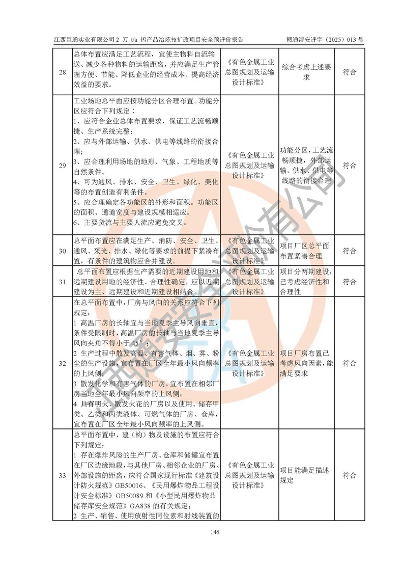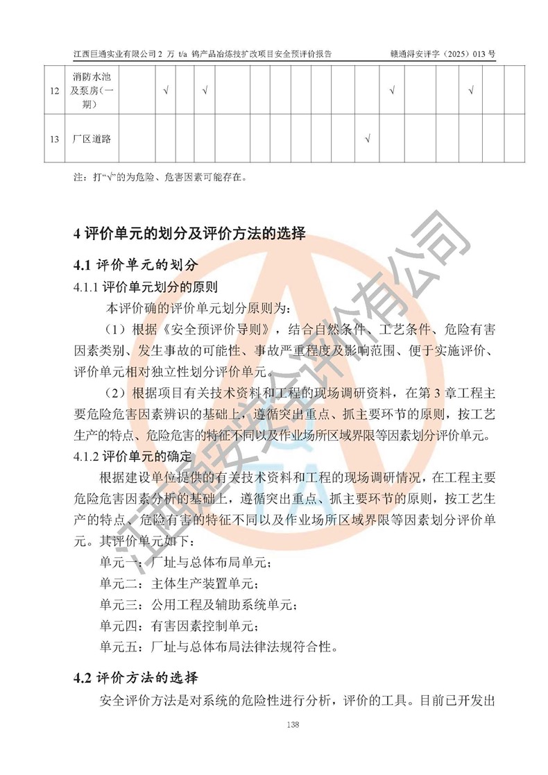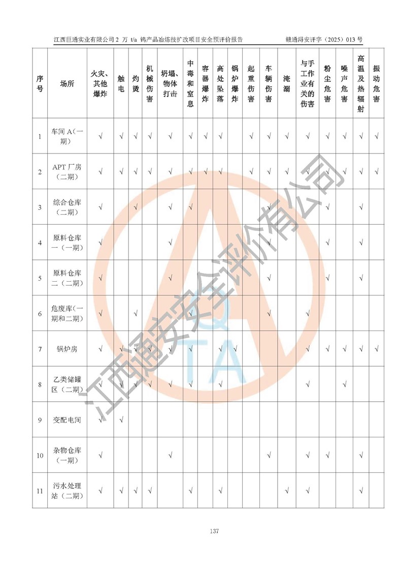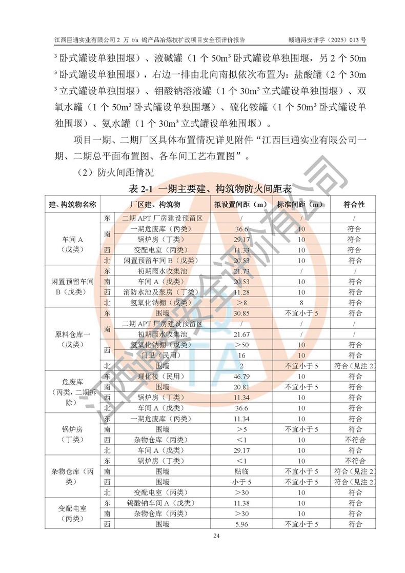 评价结论 | 江西巨通实业有限公司“2 万 t/a 钨产品冶炼技扩改项目”的厂址及总体布局、周边环境、自然环境能满足建设安全条件;项目选择的工艺过程及设备设施的安全可靠性能达到**法规、标准规定要求;项目存在的危险有害因素可控,在落实本评价报告提出的有关安全对策措施后,其危险有害程度能达到可以接受的程度,项目建设能够实现安全生产条件。 | |||