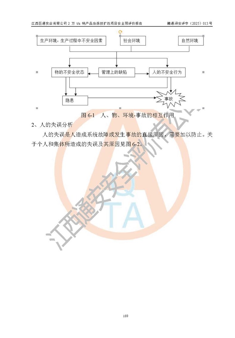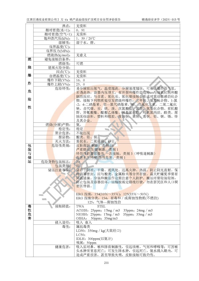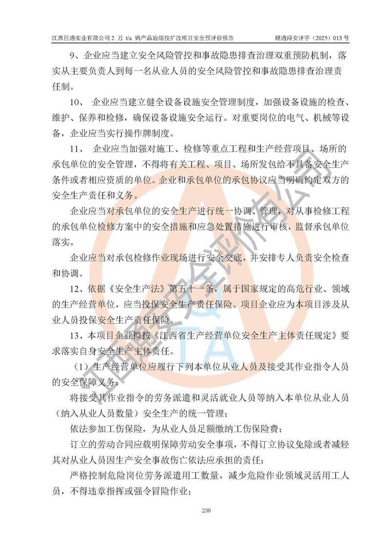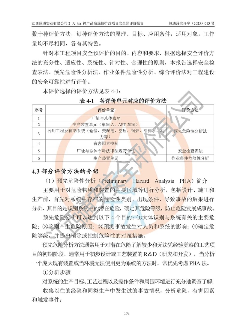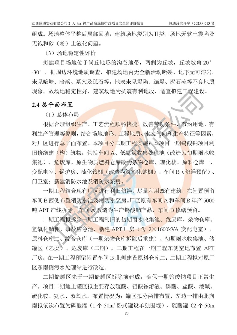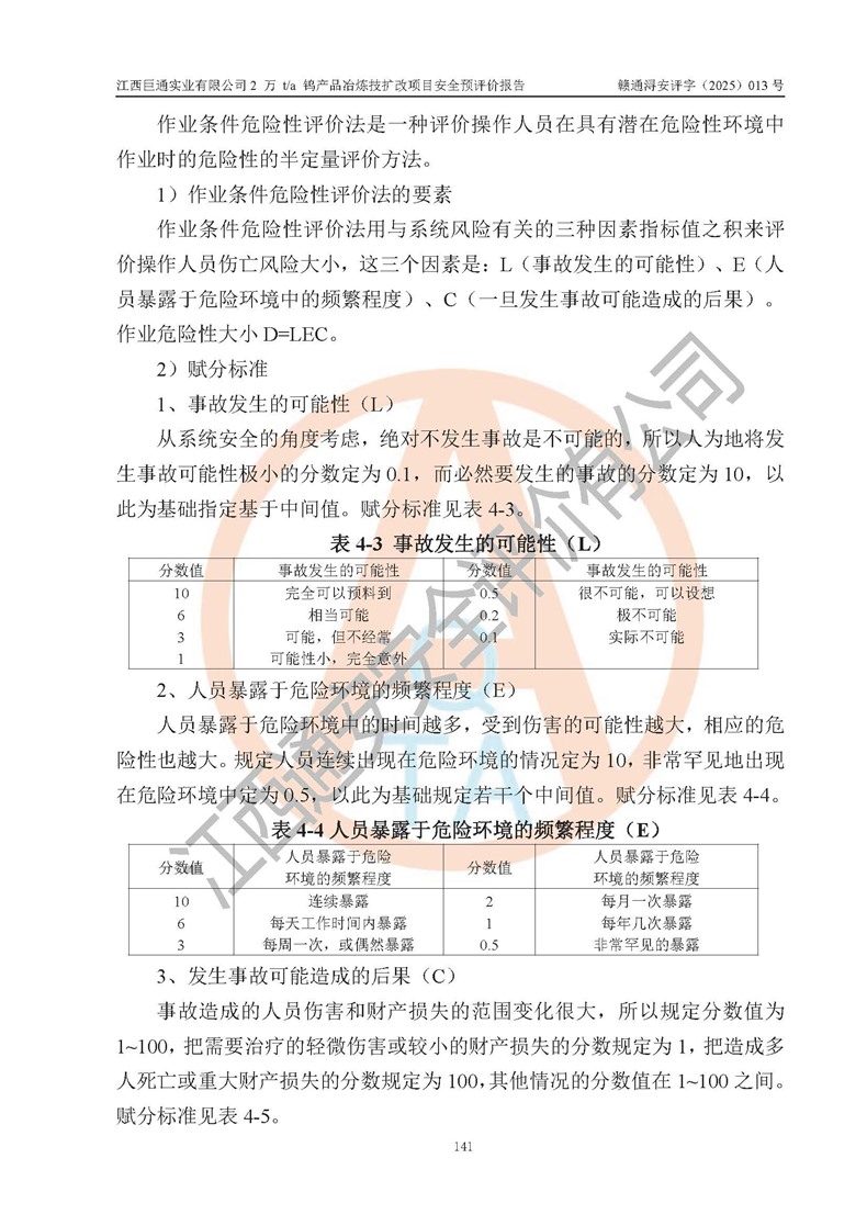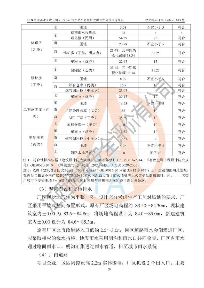 评价结论 | 江西巨通实业有限公司“2 万 t/a 钨产品冶炼技扩改项目”的厂址及总体布局、周边环境、自然环境能满足建设安全条件;项目选择的工艺过程及设备设施的安全可靠性能达到**法规、标准规定要求;项目存在的危险有害因素可控,在落实本评价报告提出的有关安全对策措施后,其危险有害程度能达到可以接受的程度,项目建设能够实现安全生产条件。 | |||