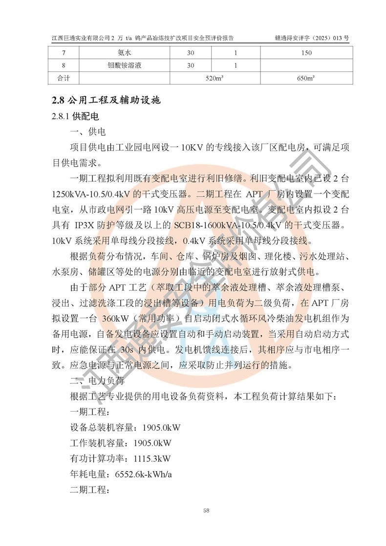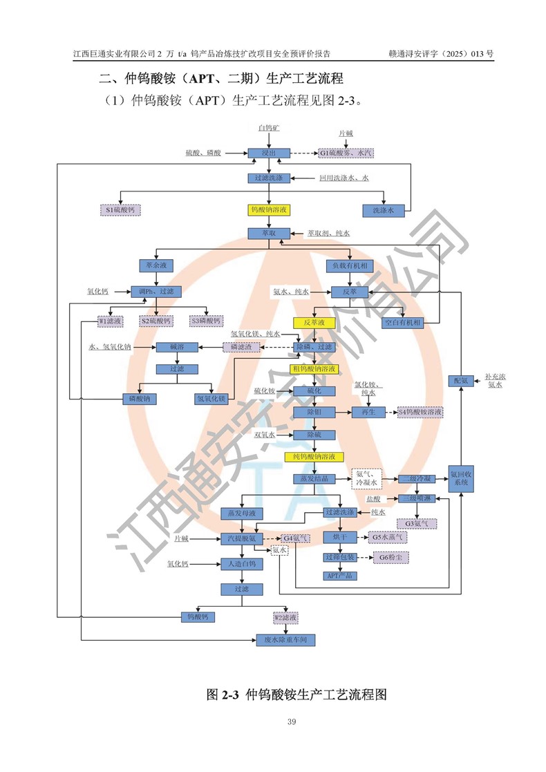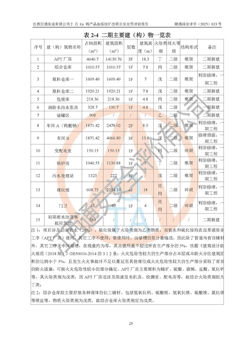 项目简介 | 江西巨通实业有限公司成立于2005年7月18日,注册资本10,946.805万元,法定**人:江源泉,位于武宁县工业园(万福经济技术开发区),按公司目前的股权结构,为福建省属国有控股企业。公司拥有武宁县大湖塘南区钨矿和武宁县大湖塘北区钨矿两个采矿权;在武宁县工业园(万福经济技术开发区)拥有365亩工业用地及一座年产5000吨的 APT 冶炼厂。 江西巨通实业有限公司的生产基地为2005年批复的年产5000吨APT和钨钼精选加工生产线,其中,年产5000吨APT项目于2009年建成,建设内容包括:APT车间A、APT车间B、办公楼、理化楼、高管楼、职工楼、食堂、原料仓库、锅炉房及烟囱、变配电室、污水处理站、危废库、生物质燃料仓库、储罐区、低氨氮收集处理池、门卫室以及公辅设施等建(构)筑物,其中办公楼、高管楼、职工楼、食堂不位于年产5000吨APT项目生产产线厂区内(在厂区外北面140m外),不在本次评价范围之内。 武宁县炳城矿业有限公司向江西巨通实业有限公司租赁APT冶炼厂房及设施,设计生产规模为年产5000吨APT,受矿源、工艺技术、**等因素影响,近几年年产APT约3000t左右。2024 年4月租赁合同到期,该生产线已处于停滞状态。 根据江西巨通实业有限公司规划和市场发展需要,公司拟投资60159.01万元建设2万t/a钨产品冶炼技扩改项目,即在对原年产5000吨APT停滞产线进行改造和利用原厂区预留空地进行新建,分两期建设。一期工程钨酸钠10000t/a包括:车间A(改造)、锅炉房(改造)、变配电室(改造)、利用原氨水回收池改造为初期雨水收集池、利用原生物质燃料仓库改为杂物仓库、利旧修缮储罐区和危废库,新建消防水池及消防水泵房,利用现状理化楼、原料仓库一、车间B(修缮预留)、门卫室。 二期工程仲钨酸铵(APT)10000t/a包括:拆除一期氢氧化钠棚等辅料区和初期雨水收集池,新建APT厂房、综合仓库、污水处理站(改造)、初期雨水收集池、原料仓库二、危废库等。 江西巨通实业有限公司“2万t/a钨产品冶炼技扩改项目”已于2025年03月07日在武宁县行政审批局备案登记(在2025年5月27日进行过项目基本信息变更),即《江西省企业投资项目备案通知书》,项目代码为:2503-360423-04-01-841213。 | |||