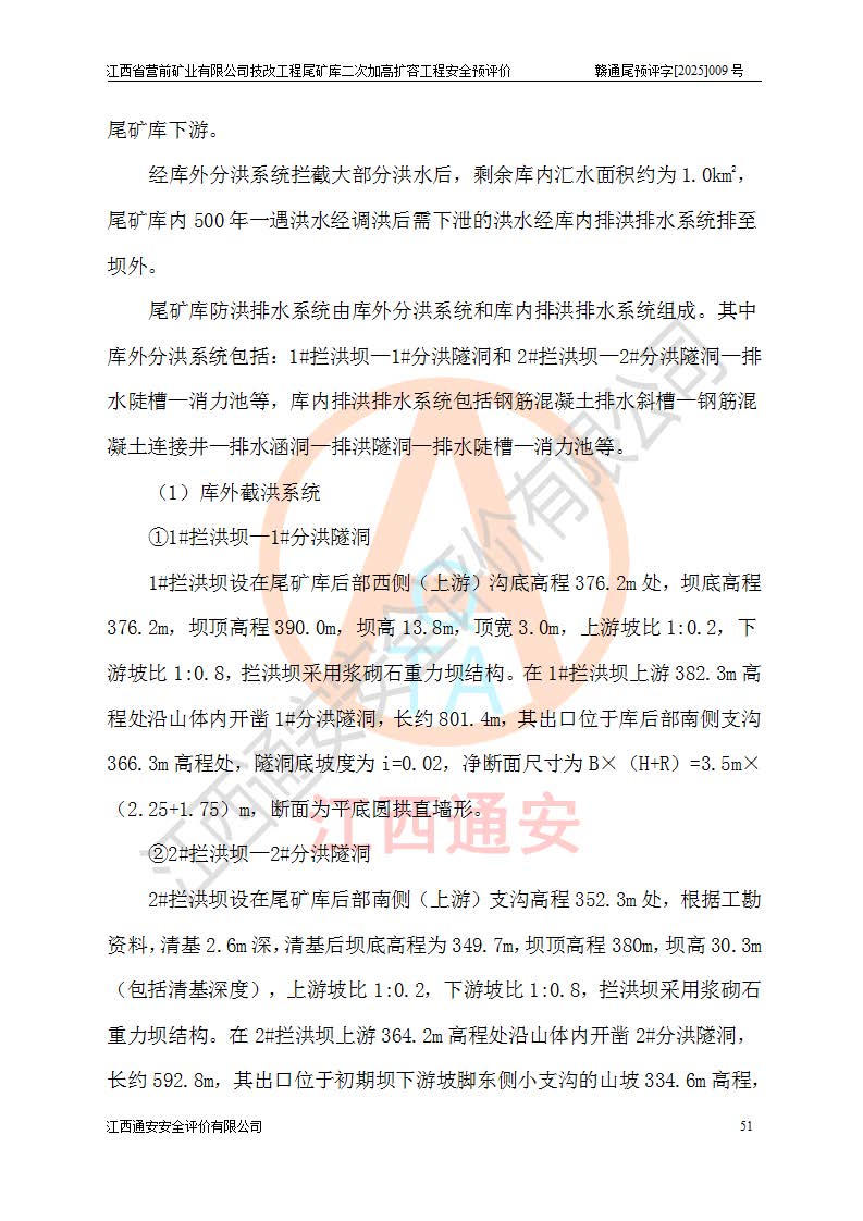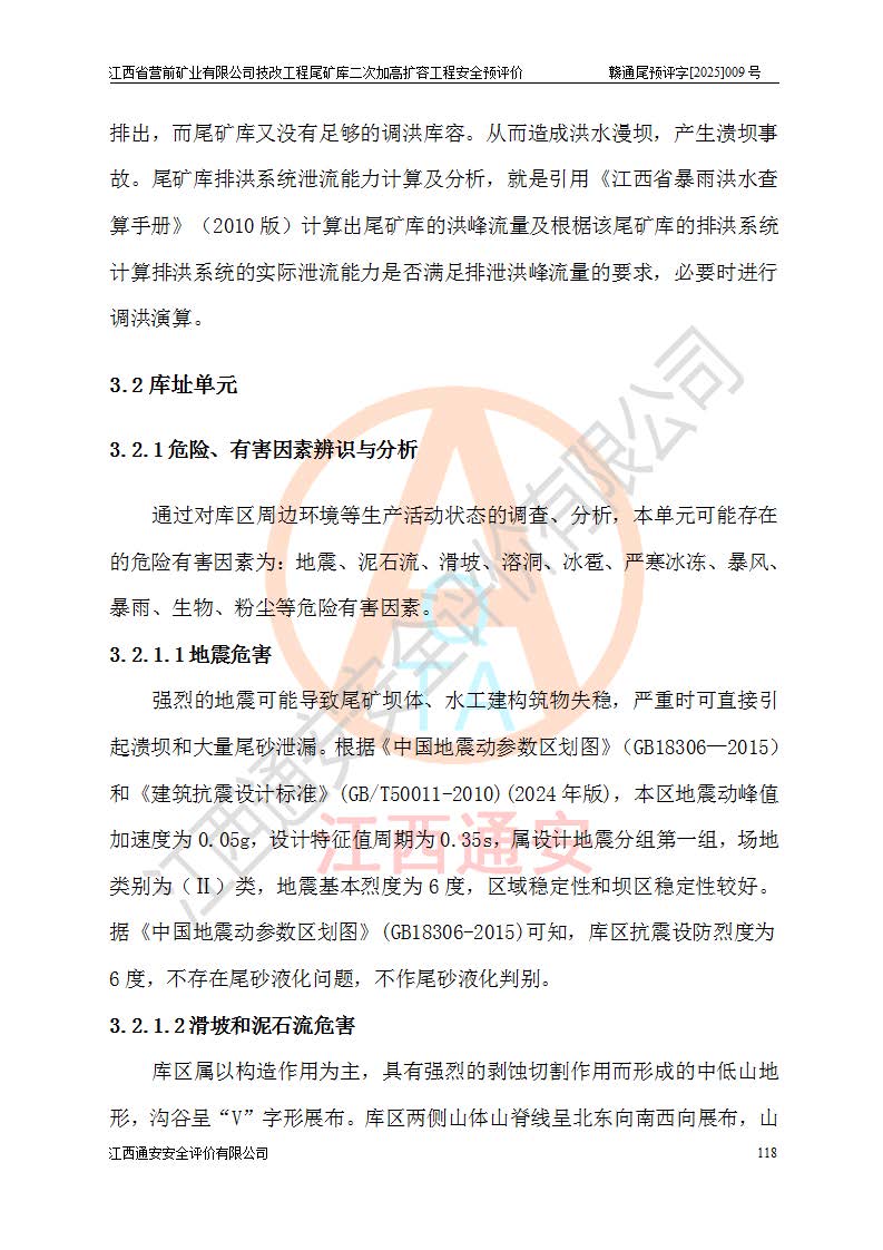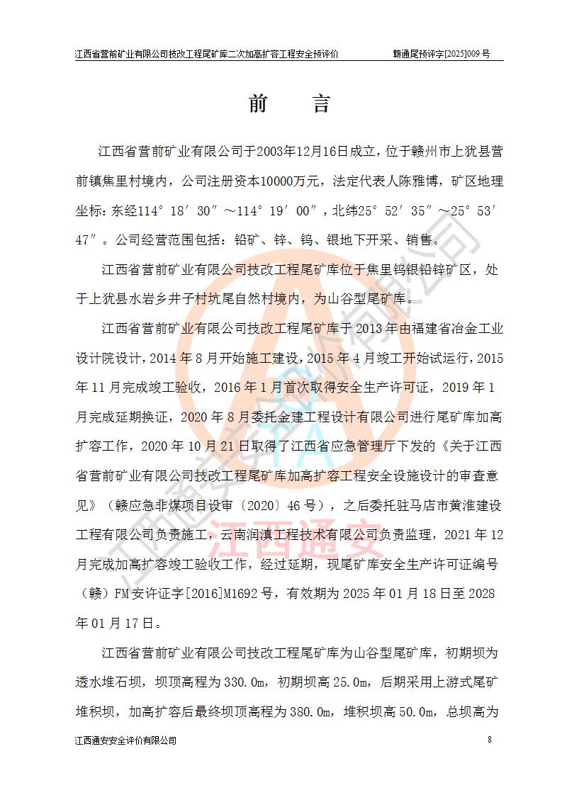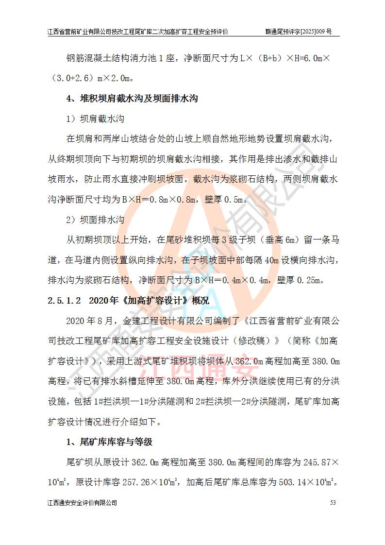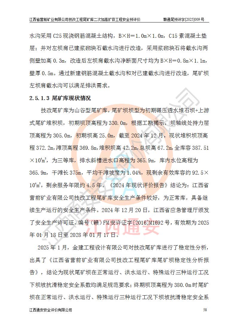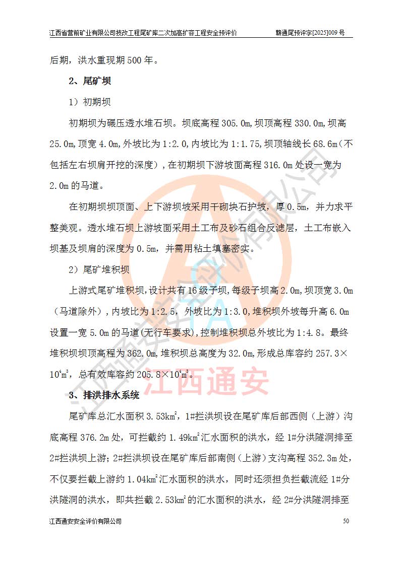江西省营前矿业有限公司于2003年12月16日成立,位于赣州市上犹县营前镇焦里村境内,公司注册资本10000万元,法定**人陈雅博,矿区地理坐标:东经114°18′30″~114°19′00″,北纬25°52′35″~25°53′47″。公司经营范围包括:铅矿、锌、钨、银地下开采、销售。 江西省营前矿业有限公司技改工程尾矿库位于焦里钨银铅锌矿区,处于上犹县水岩乡井子村坑尾自然村境内,为山谷型尾矿库。 江西省营前矿业有限公司技改工程尾矿库于2013年由福建省冶金工业设计院设计,2014年8月开始施工建设,2015年4月竣工开始试运行,2015年11月完成竣工验收,2016年1月首次取得安全生产许可证,2019年1月完成延期换证,2020年8月委托金建工程设计有限公司进行尾矿库加高扩容工作,2020年10月21日取得了江西省应急管理厅下发的《关于江西省营前矿业有限公司技改工程尾矿库加高扩容工程安全设施设计的审查意见》(赣应急非煤项目设审〔2020〕46号),之后委托驻马店市黄淮建设工程有限公司负责施工,云南润滇工程技术有限公司负责监理,2021年12月完成加高扩容竣工验收工作,经过延期,现尾矿库安全生产许可证编号(赣)FM安许证字[2016]M1692号,**期为2025年01月18日至2028年01月17日。 江西省营前矿业有限公司技改工程尾矿库为山谷型尾矿库,初期坝为透水堆石坝,坝顶高程为330.0m,初期坝高25.0m,后期采用上游式尾矿堆积坝,加高扩容后*终坝顶高程为380.0m,堆积坝高50.0m,总坝高为75.0m,总库容为为503.14×104m3,尾矿库为三等库。尾矿库初期坝以上总汇水面积3.53km2,防洪标准取500年一遇。 目前尾矿库由初期坝、堆积坝、库内排洪系统(双格排水斜槽+连接井+排水涵洞+排洪隧洞+排水陡槽+消力池)、1#拦洪坝、1#分洪隧洞、2#拦洪坝、2#分洪隧洞和安全监测设施组成。根据建设单位提供的尾矿库平面布置图,截至2024年12月,现状尾矿库堆积坝顶高程为372.2m,现状总坝高67.2m,滩顶高程为369.8m,现状全库容387.51×104m3,现状尾矿库为三等库,原加高扩容设计*终堆积坝顶高程为380.0m,现剩余库容115.63×104m3,剩余**库容约92.5×104m3,剩余服务年限约4.5年;矿山现有储量较大,剩余库容及服务年限不满足矿山后期生产需要。 技改工程尾矿库尾矿坝下游1**范围无居民,不存在工矿企业等建构筑物,不属于“头顶库”;尾矿库不压矿;距赣江直线距离60**;不涉及保护区及生态红线;尾矿库所在沟谷较长,谷底平均纵坡9%,上游周边山体地形有利于尾矿库二次加高扩容工程的实施,因此为了增加尾矿库库容,延长服务年限,充分利用尾矿库所在沟谷地形,江西省营前矿业有限公司对技改尾矿库进行二次加高扩容。 2024年12月,江西省营前矿业有限公司委托地矿赣西地质工程勘察院编制了《江西省营前矿业有限公司技改工程尾矿库二次扩容工程(水文)地质勘察报告》,2025年4月,江西省营前矿业有限公司委托金建工程设计有限公司编制了《江西省营前矿业有限公司技改工程尾矿库二次加高扩容工程可行性研究报告》。 按照非煤矿山建设项目安全设施“三同时”的规定要求,技改工程尾矿库为二次加高扩容工程,**进行安全预评价;江西省营前矿业有限公司委托我公司承担技改工程尾矿库二次加高扩容工程建设项目的安全预评价工作。 |