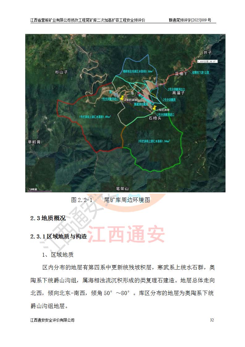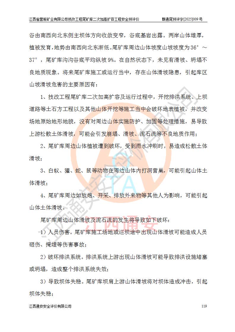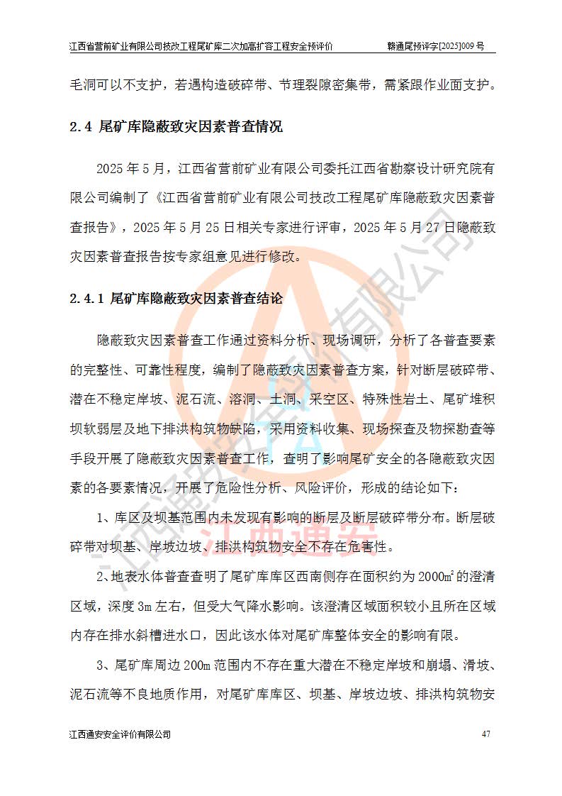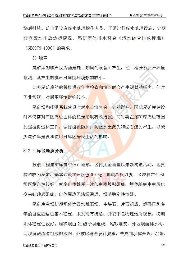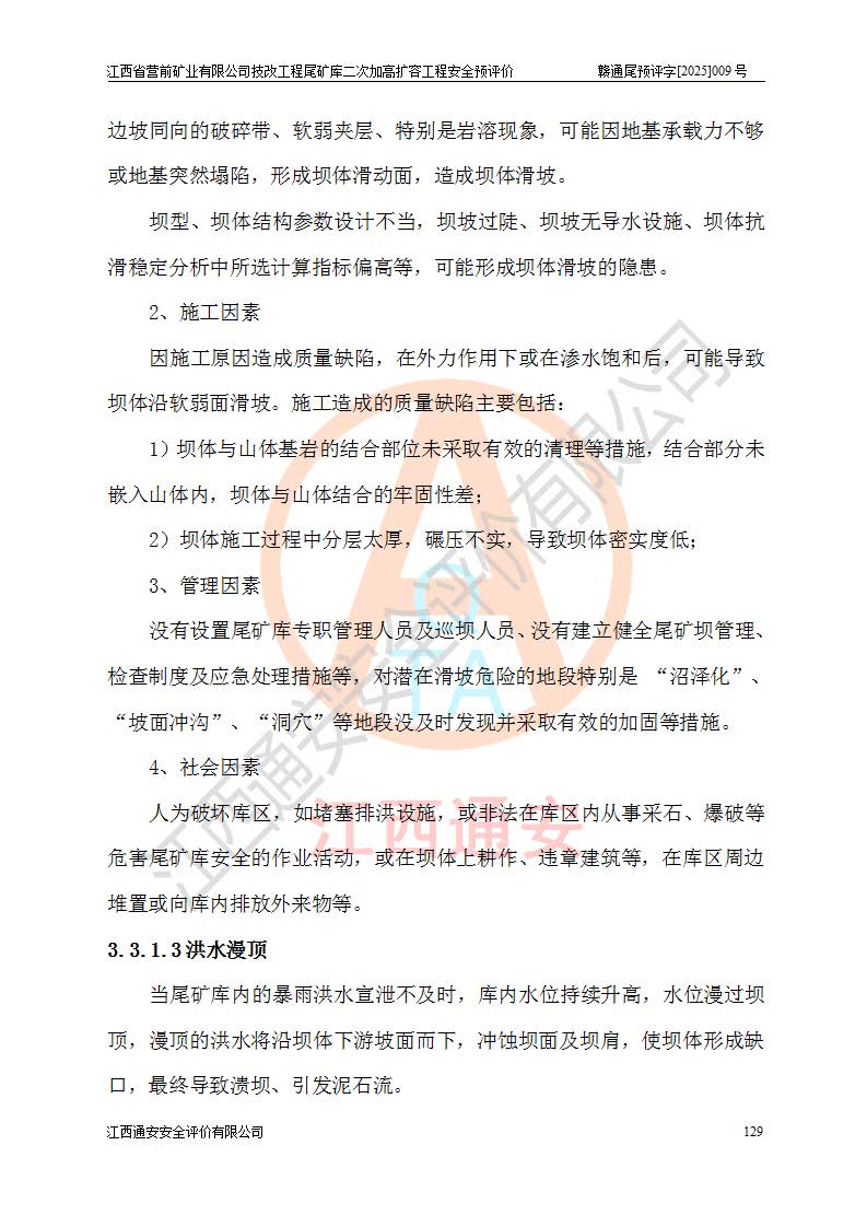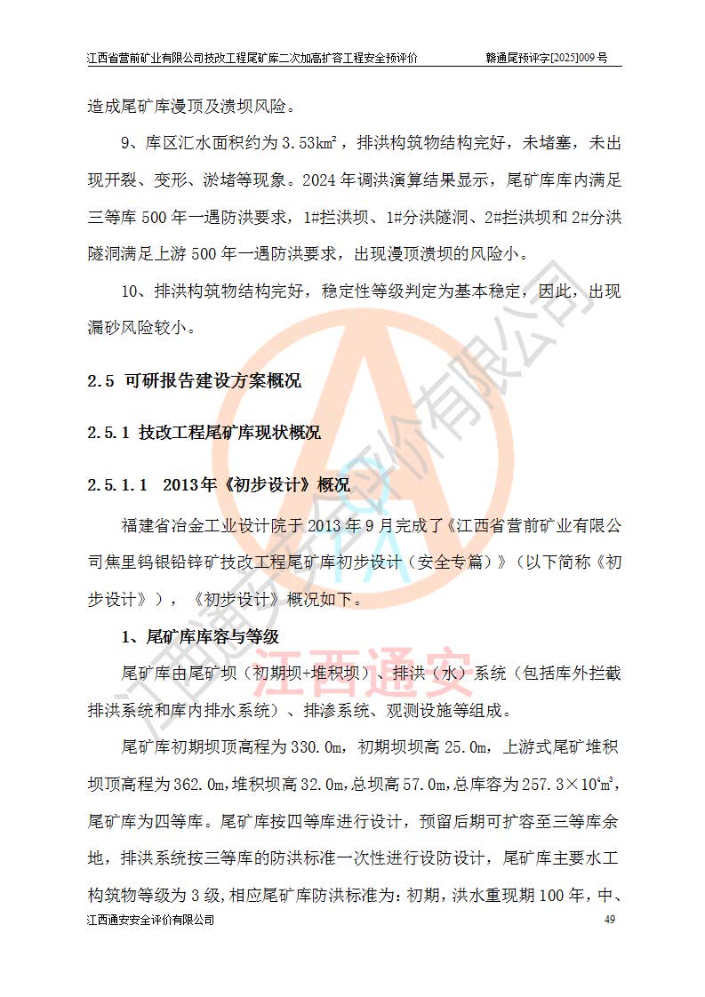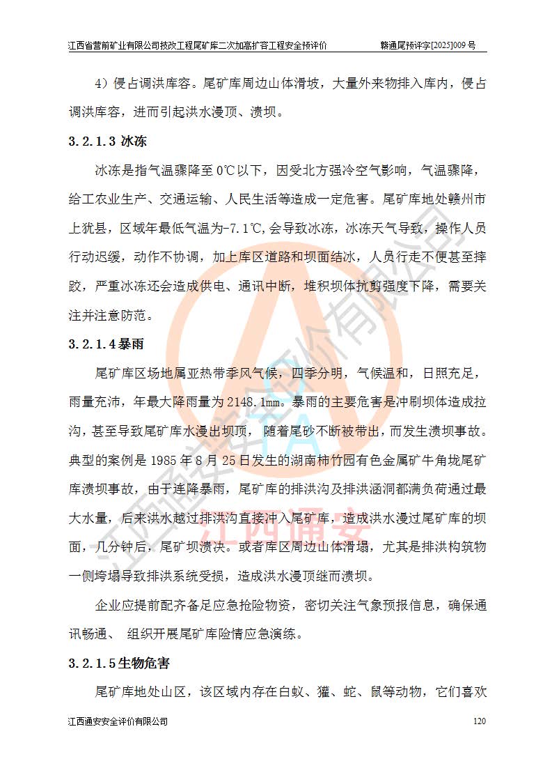 江西省营前矿业有限公司于2003年12月16日成立,位于赣州市上犹县营前镇焦里村境内,公司注册资本10000万元,法定**人陈雅博,矿区地理坐标:东经114°18′30″~114°19′00″,北纬25°52′35″~25°53′47″。公司经营范围包括:铅矿、锌、钨、银地下开采、销售。 江西省营前矿业有限公司技改工程尾矿库位于焦里钨银铅锌矿区,处于上犹县水岩乡井子村坑尾自然村境内,为山谷型尾矿库。 江西省营前矿业有限公司技改工程尾矿库于2013年由福建省冶金工业设计院设计,2014年8月开始施工建设,2015年4月竣工开始试运行,2015年11月完成竣工验收,2016年1月首次取得安全生产许可证,2019年1月完成延期换证,2020年8月委托金建工程设计有限公司进行尾矿库加高扩容工作,2020年10月21日取得了江西省应急管理厅下发的《关于江西省营前矿业有限公司技改工程尾矿库加高扩容工程安全设施设计的审查意见》(赣应急非煤项目设审〔2020〕46号),之后委托驻马店市黄淮建设工程有限公司负责施工,云南润滇工程技术有限公司负责监理,2021年12月完成加高扩容竣工验收工作,经过延期,现尾矿库安全生产许可证编号(赣)FM安许证字[2016]M1692号,**期为2025年01月18日至2028年01月17日。 江西省营前矿业有限公司技改工程尾矿库为山谷型尾矿库,初期坝为透水堆石坝,坝顶高程为330.0m,初期坝高25.0m,后期采用上游式尾矿堆积坝,加高扩容后*终坝顶高程为380.0m,堆积坝高50.0m,总坝高为75.0m,总库容为为503.14×104m3,尾矿库为三等库。尾矿库初期坝以上总汇水面积3.53km2,防洪标准取500年一遇。 目前尾矿库由初期坝、堆积坝、库内排洪系统(双格排水斜槽+连接井+排水涵洞+排洪隧洞+排水陡槽+消力池)、1#拦洪坝、1#分洪隧洞、2#拦洪坝、2#分洪隧洞和安全监测设施组成。根据建设单位提供的尾矿库平面布置图,截至2024年12月,现状尾矿库堆积坝顶高程为372.2m,现状总坝高67.2m,滩顶高程为369.8m,现状全库容387.51×104m3,现状尾矿库为三等库,原加高扩容设计*终堆积坝顶高程为380.0m,现剩余库容115.63×104m3,剩余**库容约92.5×104m3,剩余服务年限约4.5年;矿山现有储量较大,剩余库容及服务年限不满足矿山后期生产需要。 技改工程尾矿库尾矿坝下游1**范围无居民,不存在工矿企业等建构筑物,不属于“头顶库”;尾矿库不压矿;距赣江直线距离60**;不涉及保护区及生态红线;尾矿库所在沟谷较长,谷底平均纵坡9%,上游周边山体地形有利于尾矿库二次加高扩容工程的实施,因此为了增加尾矿库库容,延长服务年限,充分利用尾矿库所在沟谷地形,江西省营前矿业有限公司对技改尾矿库进行二次加高扩容。 2024年12月,江西省营前矿业有限公司委托地矿赣西地质工程勘察院编制了《江西省营前矿业有限公司技改工程尾矿库二次扩容工程(水文)地质勘察报告》,2025年4月,江西省营前矿业有限公司委托金建工程设计有限公司编制了《江西省营前矿业有限公司技改工程尾矿库二次加高扩容工程可行性研究报告》。 按照非煤矿山建设项目安全设施“三同时”的规定要求,技改工程尾矿库为二次加高扩容工程,**进行安全预评价;江西省营前矿业有限公司委托我公司承担技改工程尾矿库二次加高扩容工程建设项目的安全预评价工作。 |