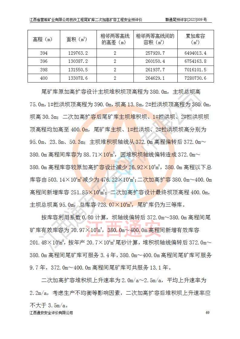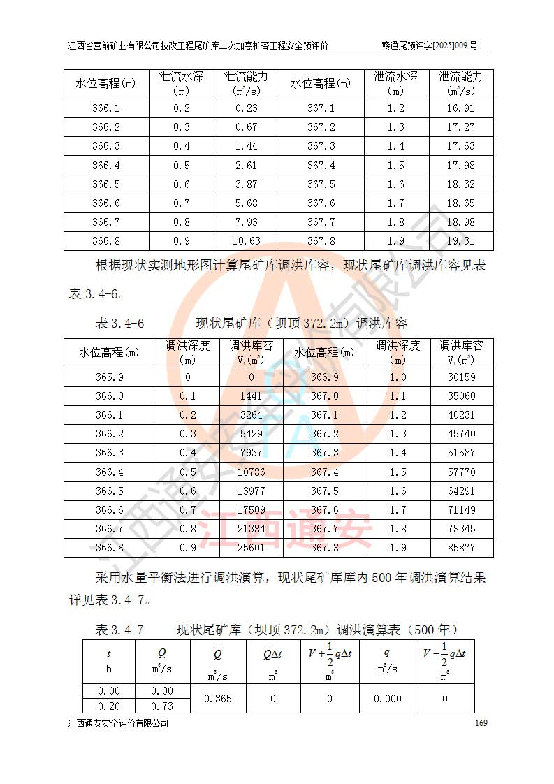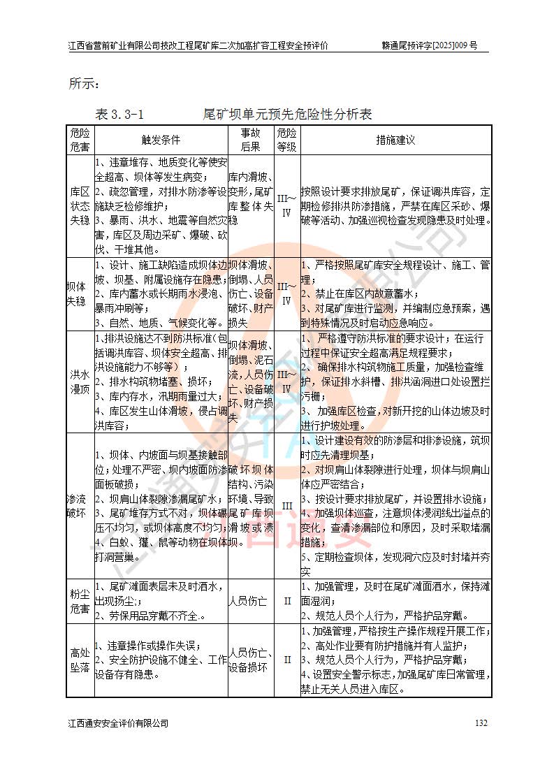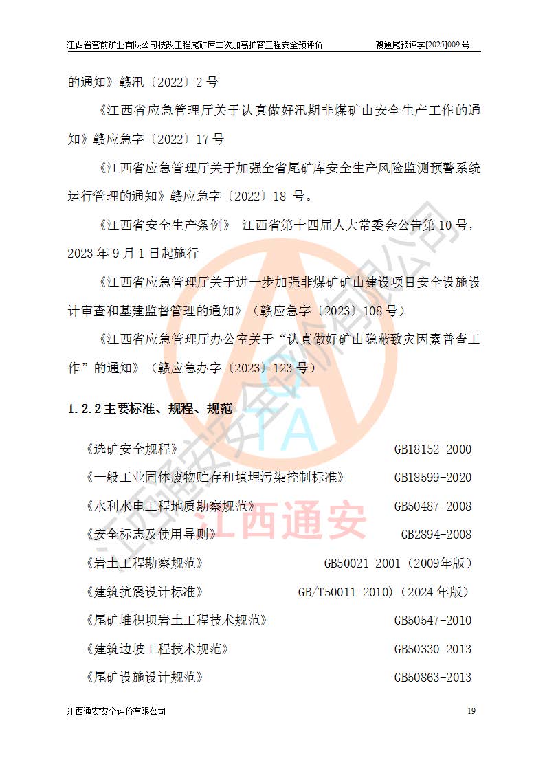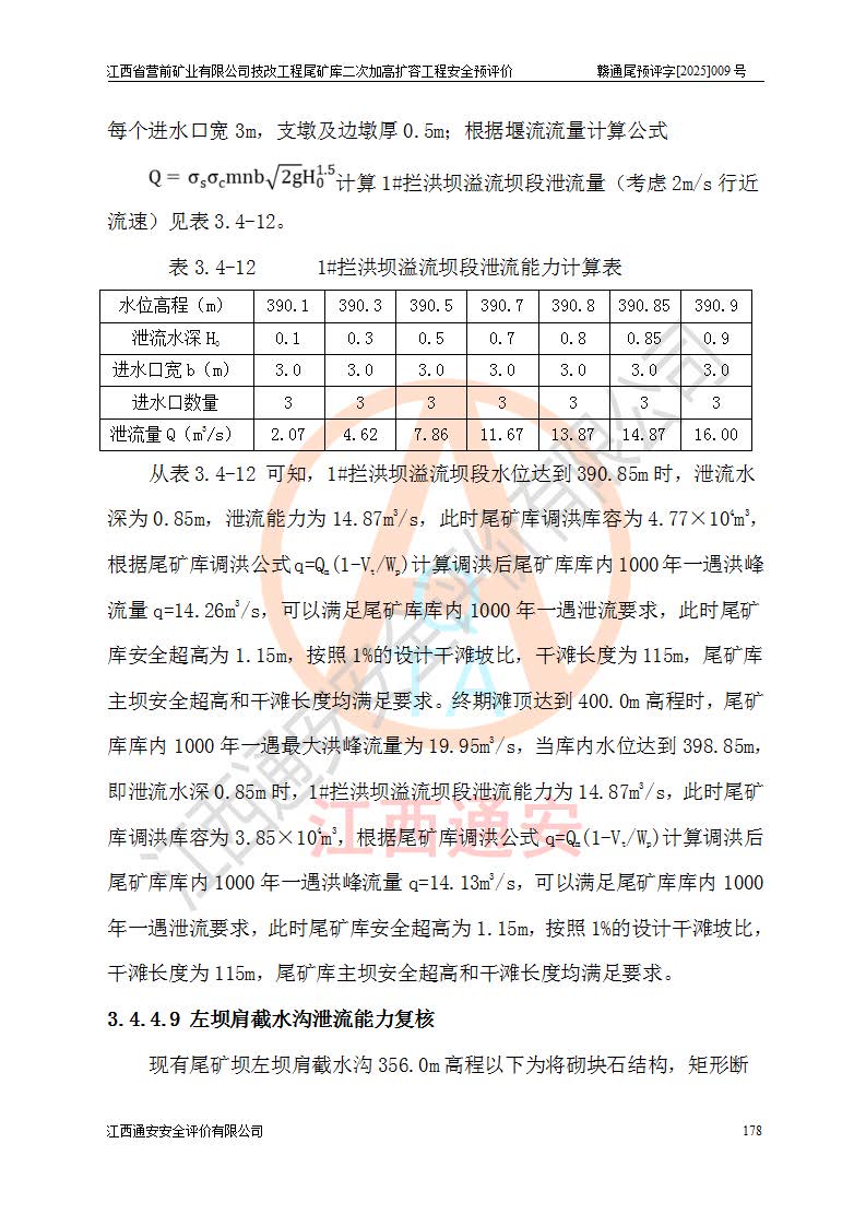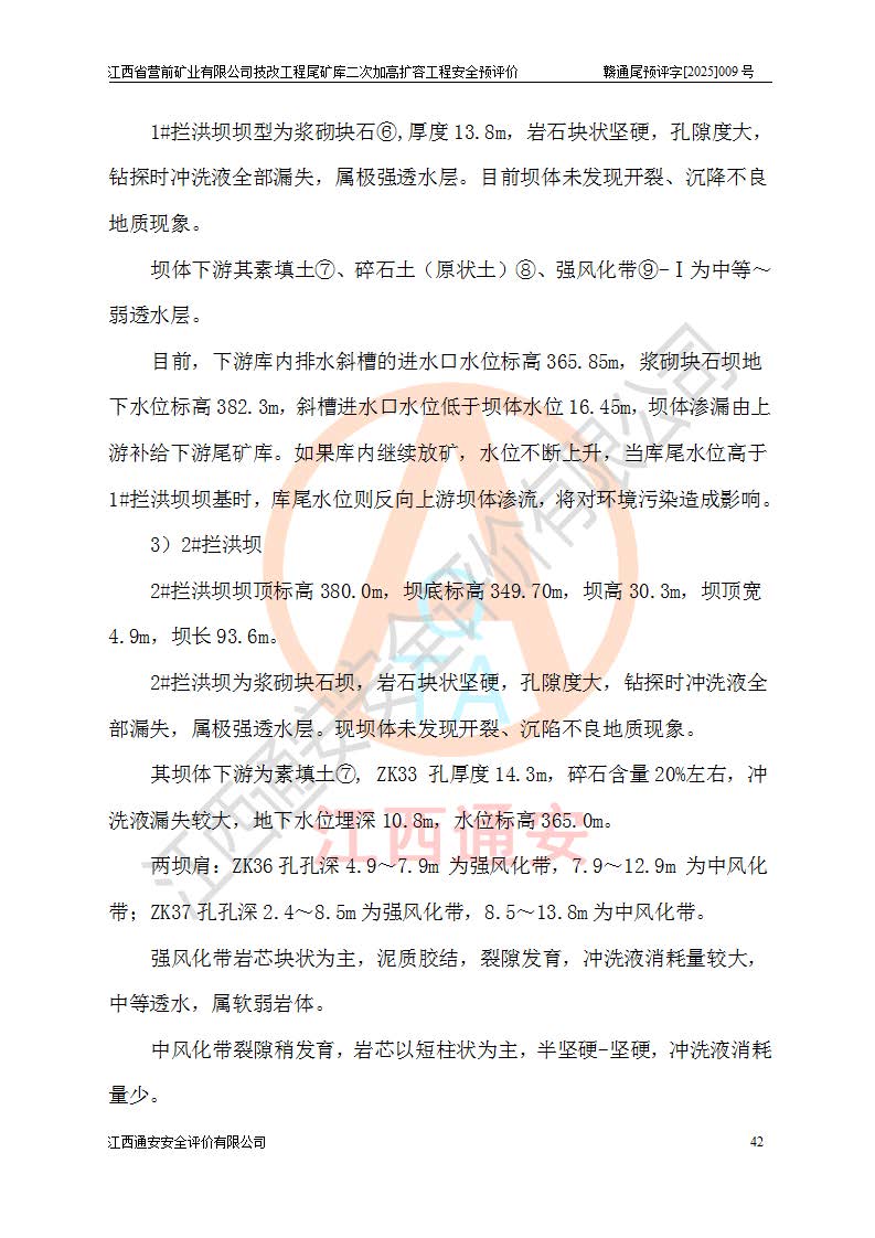 江西省营前矿业有限公司于2003年12月16日成立,位于赣州市上犹县营前镇焦里村境内,公司注册资本10000万元,法定**人陈雅博,矿区地理坐标:东经114°18′30″~114°19′00″,北纬25°52′35″~25°53′47″。公司经营范围包括:铅矿、锌、钨、银地下开采、销售。 江西省营前矿业有限公司技改工程尾矿库位于焦里钨银铅锌矿区,处于上犹县水岩乡井子村坑尾自然村境内,为山谷型尾矿库。 江西省营前矿业有限公司技改工程尾矿库于2013年由福建省冶金工业设计院设计,2014年8月开始施工建设,2015年4月竣工开始试运行,2015年11月完成竣工验收,2016年1月首次取得安全生产许可证,2019年1月完成延期换证,2020年8月委托金建工程设计有限公司进行尾矿库加高扩容工作,2020年10月21日取得了江西省应急管理厅下发的《关于江西省营前矿业有限公司技改工程尾矿库加高扩容工程安全设施设计的审查意见》(赣应急非煤项目设审〔2020〕46号),之后委托驻马店市黄淮建设工程有限公司负责施工,云南润滇工程技术有限公司负责监理,2021年12月完成加高扩容竣工验收工作,经过延期,现尾矿库安全生产许可证编号(赣)FM安许证字[2016]M1692号,**期为2025年01月18日至2028年01月17日。 江西省营前矿业有限公司技改工程尾矿库为山谷型尾矿库,初期坝为透水堆石坝,坝顶高程为330.0m,初期坝高25.0m,后期采用上游式尾矿堆积坝,加高扩容后*终坝顶高程为380.0m,堆积坝高50.0m,总坝高为75.0m,总库容为为503.14×104m3,尾矿库为三等库。尾矿库初期坝以上总汇水面积3.53km2,防洪标准取500年一遇。 目前尾矿库由初期坝、堆积坝、库内排洪系统(双格排水斜槽+连接井+排水涵洞+排洪隧洞+排水陡槽+消力池)、1#拦洪坝、1#分洪隧洞、2#拦洪坝、2#分洪隧洞和安全监测设施组成。根据建设单位提供的尾矿库平面布置图,截至2024年12月,现状尾矿库堆积坝顶高程为372.2m,现状总坝高67.2m,滩顶高程为369.8m,现状全库容387.51×104m3,现状尾矿库为三等库,原加高扩容设计*终堆积坝顶高程为380.0m,现剩余库容115.63×104m3,剩余**库容约92.5×104m3,剩余服务年限约4.5年;矿山现有储量较大,剩余库容及服务年限不满足矿山后期生产需要。 技改工程尾矿库尾矿坝下游1**范围无居民,不存在工矿企业等建构筑物,不属于“头顶库”;尾矿库不压矿;距赣江直线距离60**;不涉及保护区及生态红线;尾矿库所在沟谷较长,谷底平均纵坡9%,上游周边山体地形有利于尾矿库二次加高扩容工程的实施,因此为了增加尾矿库库容,延长服务年限,充分利用尾矿库所在沟谷地形,江西省营前矿业有限公司对技改尾矿库进行二次加高扩容。 2024年12月,江西省营前矿业有限公司委托地矿赣西地质工程勘察院编制了《江西省营前矿业有限公司技改工程尾矿库二次扩容工程(水文)地质勘察报告》,2025年4月,江西省营前矿业有限公司委托金建工程设计有限公司编制了《江西省营前矿业有限公司技改工程尾矿库二次加高扩容工程可行性研究报告》。 按照非煤矿山建设项目安全设施“三同时”的规定要求,技改工程尾矿库为二次加高扩容工程,**进行安全预评价;江西省营前矿业有限公司委托我公司承担技改工程尾矿库二次加高扩容工程建设项目的安全预评价工作。 |