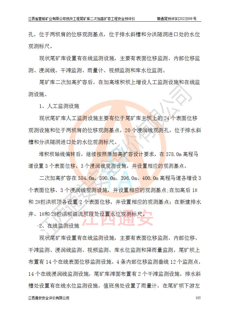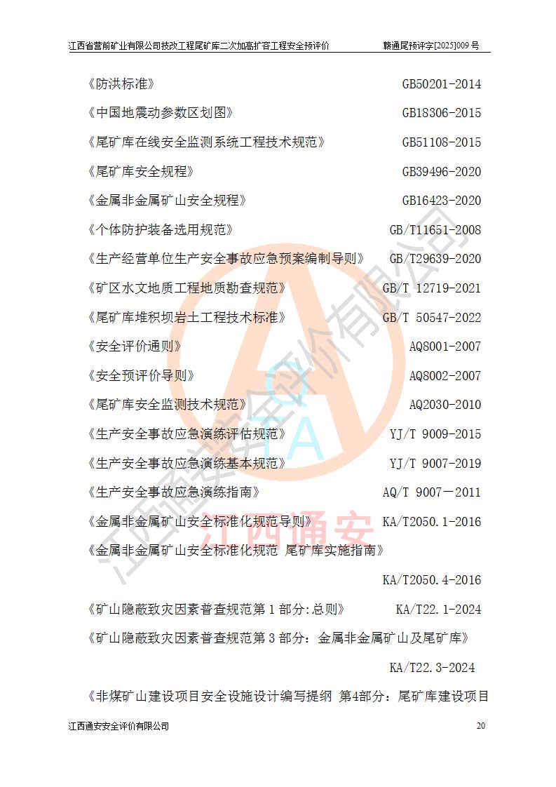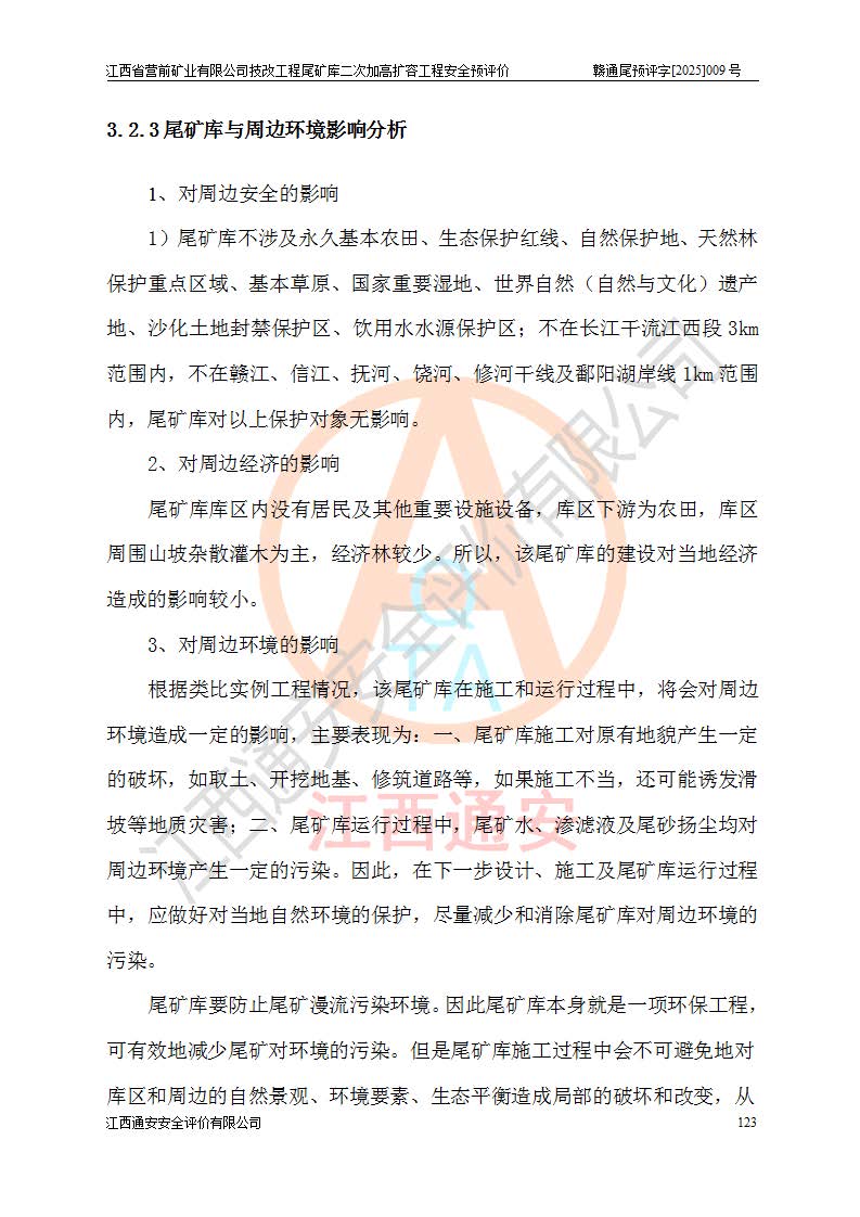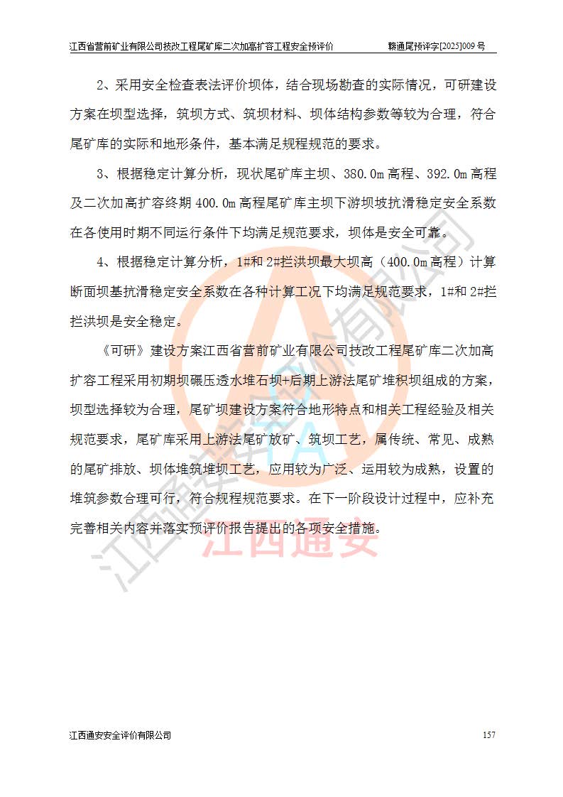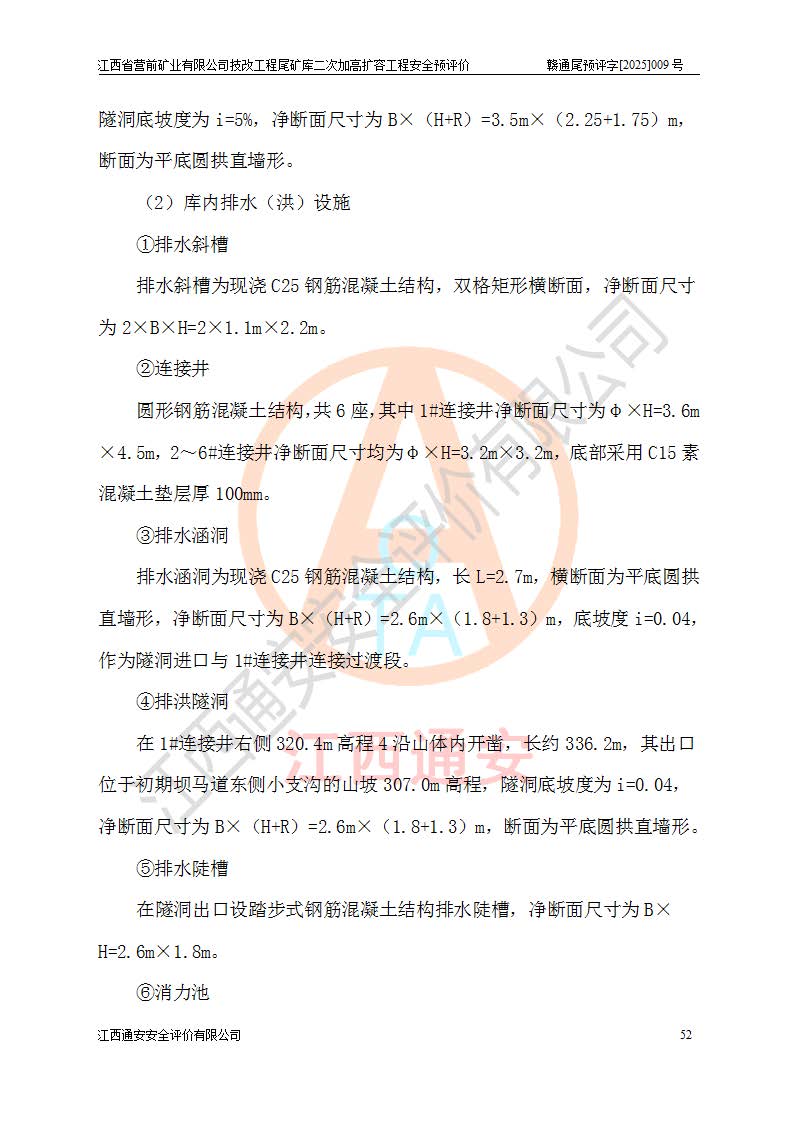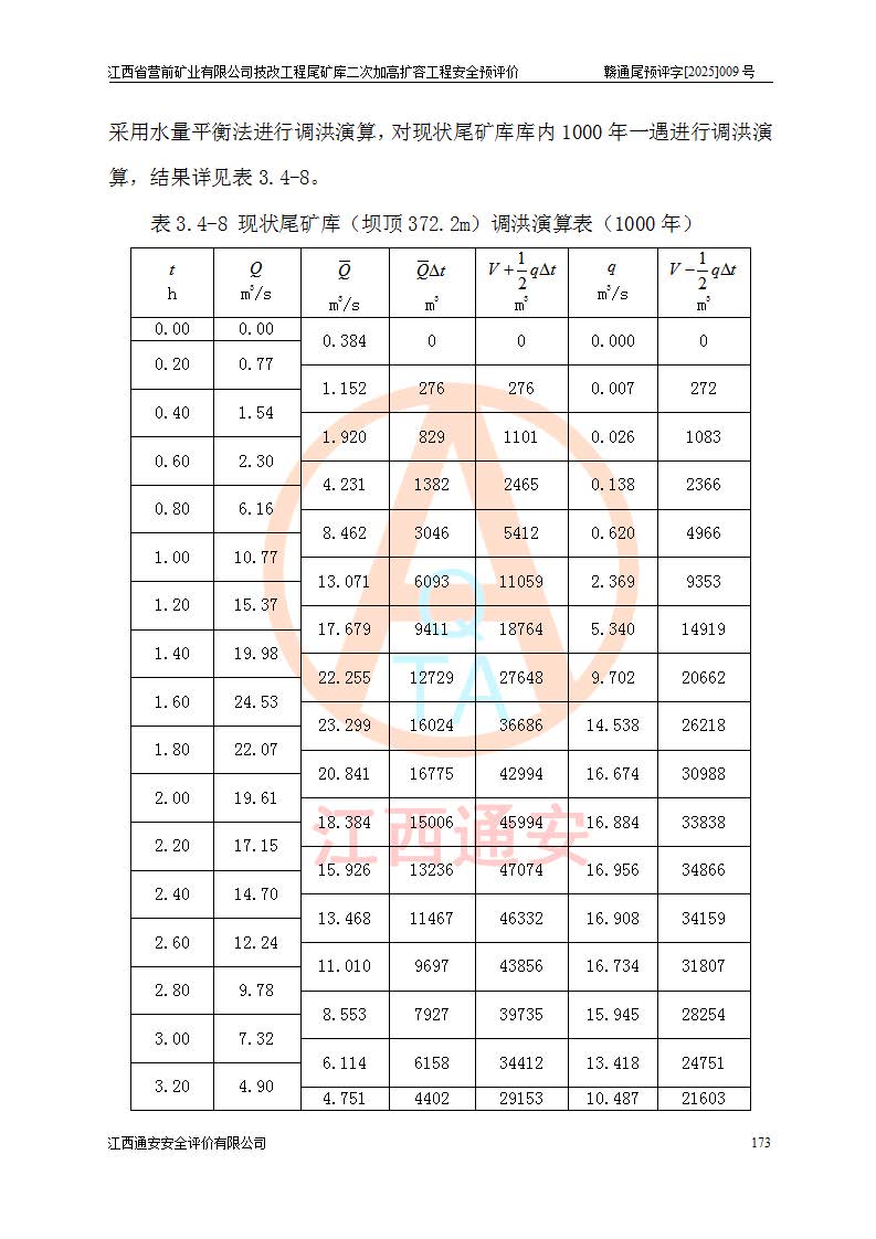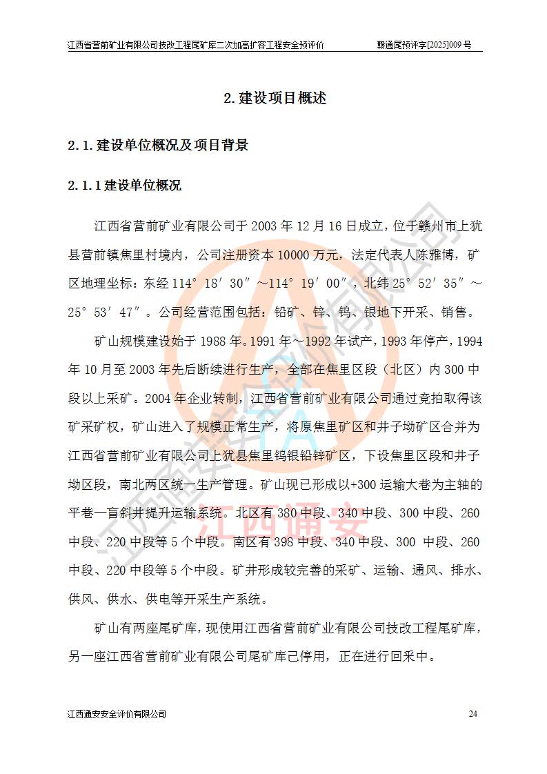 江西省营前矿业有限公司于2003年12月16日成立,位于赣州市上犹县营前镇焦里村境内,公司注册资本10000万元,法定**人陈雅博,矿区地理坐标:东经114°18′30″~114°19′00″,北纬25°52′35″~25°53′47″。公司经营范围包括:铅矿、锌、钨、银地下开采、销售。 江西省营前矿业有限公司技改工程尾矿库位于焦里钨银铅锌矿区,处于上犹县水岩乡井子村坑尾自然村境内,为山谷型尾矿库。 江西省营前矿业有限公司技改工程尾矿库于2013年由福建省冶金工业设计院设计,2014年8月开始施工建设,2015年4月竣工开始试运行,2015年11月完成竣工验收,2016年1月首次取得安全生产许可证,2019年1月完成延期换证,2020年8月委托金建工程设计有限公司进行尾矿库加高扩容工作,2020年10月21日取得了江西省应急管理厅下发的《关于江西省营前矿业有限公司技改工程尾矿库加高扩容工程安全设施设计的审查意见》(赣应急非煤项目设审〔2020〕46号),之后委托驻马店市黄淮建设工程有限公司负责施工,云南润滇工程技术有限公司负责监理,2021年12月完成加高扩容竣工验收工作,经过延期,现尾矿库安全生产许可证编号(赣)FM安许证字[2016]M1692号,**期为2025年01月18日至2028年01月17日。 江西省营前矿业有限公司技改工程尾矿库为山谷型尾矿库,初期坝为透水堆石坝,坝顶高程为330.0m,初期坝高25.0m,后期采用上游式尾矿堆积坝,加高扩容后*终坝顶高程为380.0m,堆积坝高50.0m,总坝高为75.0m,总库容为为503.14×104m3,尾矿库为三等库。尾矿库初期坝以上总汇水面积3.53km2,防洪标准取500年一遇。 目前尾矿库由初期坝、堆积坝、库内排洪系统(双格排水斜槽+连接井+排水涵洞+排洪隧洞+排水陡槽+消力池)、1#拦洪坝、1#分洪隧洞、2#拦洪坝、2#分洪隧洞和安全监测设施组成。根据建设单位提供的尾矿库平面布置图,截至2024年12月,现状尾矿库堆积坝顶高程为372.2m,现状总坝高67.2m,滩顶高程为369.8m,现状全库容387.51×104m3,现状尾矿库为三等库,原加高扩容设计*终堆积坝顶高程为380.0m,现剩余库容115.63×104m3,剩余**库容约92.5×104m3,剩余服务年限约4.5年;矿山现有储量较大,剩余库容及服务年限不满足矿山后期生产需要。 技改工程尾矿库尾矿坝下游1**范围无居民,不存在工矿企业等建构筑物,不属于“头顶库”;尾矿库不压矿;距赣江直线距离60**;不涉及保护区及生态红线;尾矿库所在沟谷较长,谷底平均纵坡9%,上游周边山体地形有利于尾矿库二次加高扩容工程的实施,因此为了增加尾矿库库容,延长服务年限,充分利用尾矿库所在沟谷地形,江西省营前矿业有限公司对技改尾矿库进行二次加高扩容。 2024年12月,江西省营前矿业有限公司委托地矿赣西地质工程勘察院编制了《江西省营前矿业有限公司技改工程尾矿库二次扩容工程(水文)地质勘察报告》,2025年4月,江西省营前矿业有限公司委托金建工程设计有限公司编制了《江西省营前矿业有限公司技改工程尾矿库二次加高扩容工程可行性研究报告》。 按照非煤矿山建设项目安全设施“三同时”的规定要求,技改工程尾矿库为二次加高扩容工程,**进行安全预评价;江西省营前矿业有限公司委托我公司承担技改工程尾矿库二次加高扩容工程建设项目的安全预评价工作。 |