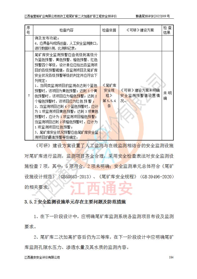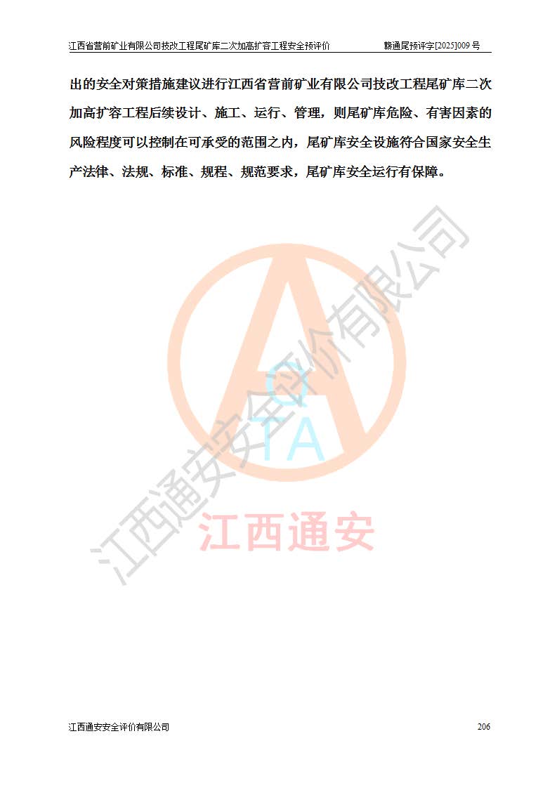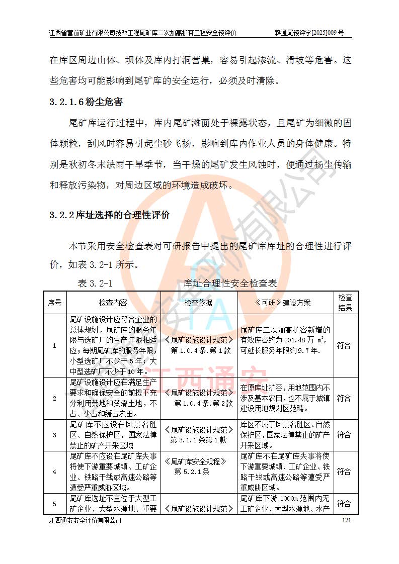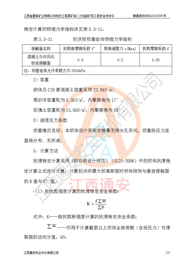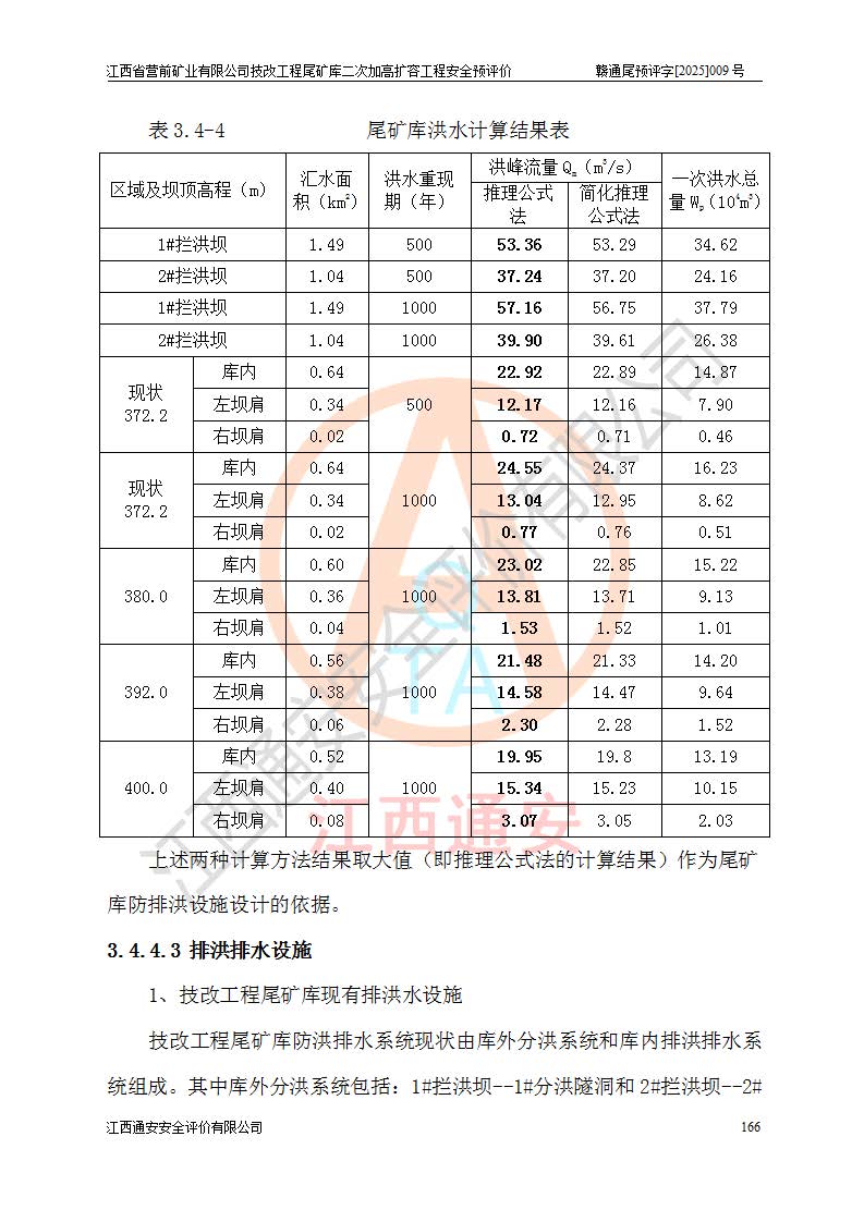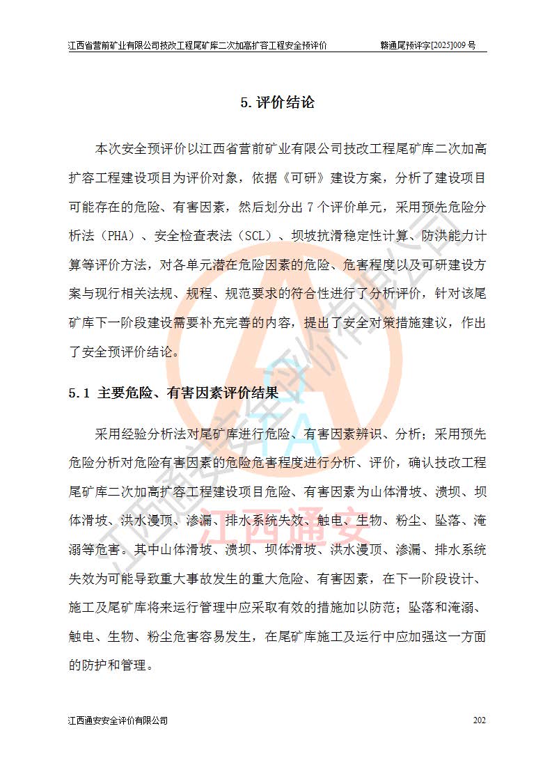 江西省营前矿业有限公司于2003年12月16日成立,位于赣州市上犹县营前镇焦里村境内,公司注册资本10000万元,法定**人陈雅博,矿区地理坐标:东经114°18′30″~114°19′00″,北纬25°52′35″~25°53′47″。公司经营范围包括:铅矿、锌、钨、银地下开采、销售。 江西省营前矿业有限公司技改工程尾矿库位于焦里钨银铅锌矿区,处于上犹县水岩乡井子村坑尾自然村境内,为山谷型尾矿库。 江西省营前矿业有限公司技改工程尾矿库于2013年由福建省冶金工业设计院设计,2014年8月开始施工建设,2015年4月竣工开始试运行,2015年11月完成竣工验收,2016年1月首次取得安全生产许可证,2019年1月完成延期换证,2020年8月委托金建工程设计有限公司进行尾矿库加高扩容工作,2020年10月21日取得了江西省应急管理厅下发的《关于江西省营前矿业有限公司技改工程尾矿库加高扩容工程安全设施设计的审查意见》(赣应急非煤项目设审〔2020〕46号),之后委托驻马店市黄淮建设工程有限公司负责施工,云南润滇工程技术有限公司负责监理,2021年12月完成加高扩容竣工验收工作,经过延期,现尾矿库安全生产许可证编号(赣)FM安许证字[2016]M1692号,**期为2025年01月18日至2028年01月17日。 江西省营前矿业有限公司技改工程尾矿库为山谷型尾矿库,初期坝为透水堆石坝,坝顶高程为330.0m,初期坝高25.0m,后期采用上游式尾矿堆积坝,加高扩容后*终坝顶高程为380.0m,堆积坝高50.0m,总坝高为75.0m,总库容为为503.14×104m3,尾矿库为三等库。尾矿库初期坝以上总汇水面积3.53km2,防洪标准取500年一遇。 目前尾矿库由初期坝、堆积坝、库内排洪系统(双格排水斜槽+连接井+排水涵洞+排洪隧洞+排水陡槽+消力池)、1#拦洪坝、1#分洪隧洞、2#拦洪坝、2#分洪隧洞和安全监测设施组成。根据建设单位提供的尾矿库平面布置图,截至2024年12月,现状尾矿库堆积坝顶高程为372.2m,现状总坝高67.2m,滩顶高程为369.8m,现状全库容387.51×104m3,现状尾矿库为三等库,原加高扩容设计*终堆积坝顶高程为380.0m,现剩余库容115.63×104m3,剩余**库容约92.5×104m3,剩余服务年限约4.5年;矿山现有储量较大,剩余库容及服务年限不满足矿山后期生产需要。 技改工程尾矿库尾矿坝下游1**范围无居民,不存在工矿企业等建构筑物,不属于“头顶库”;尾矿库不压矿;距赣江直线距离60**;不涉及保护区及生态红线;尾矿库所在沟谷较长,谷底平均纵坡9%,上游周边山体地形有利于尾矿库二次加高扩容工程的实施,因此为了增加尾矿库库容,延长服务年限,充分利用尾矿库所在沟谷地形,江西省营前矿业有限公司对技改尾矿库进行二次加高扩容。 2024年12月,江西省营前矿业有限公司委托地矿赣西地质工程勘察院编制了《江西省营前矿业有限公司技改工程尾矿库二次扩容工程(水文)地质勘察报告》,2025年4月,江西省营前矿业有限公司委托金建工程设计有限公司编制了《江西省营前矿业有限公司技改工程尾矿库二次加高扩容工程可行性研究报告》。 按照非煤矿山建设项目安全设施“三同时”的规定要求,技改工程尾矿库为二次加高扩容工程,**进行安全预评价;江西省营前矿业有限公司委托我公司承担技改工程尾矿库二次加高扩容工程建设项目的安全预评价工作。 |
