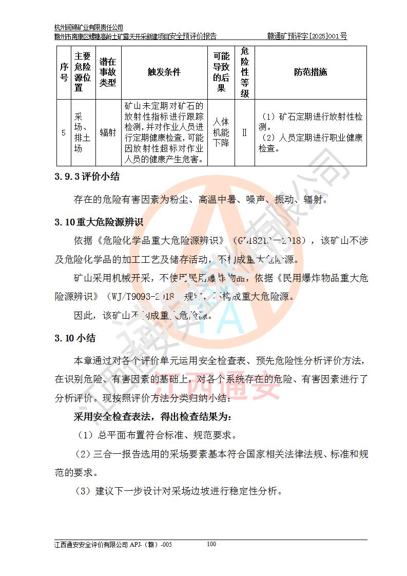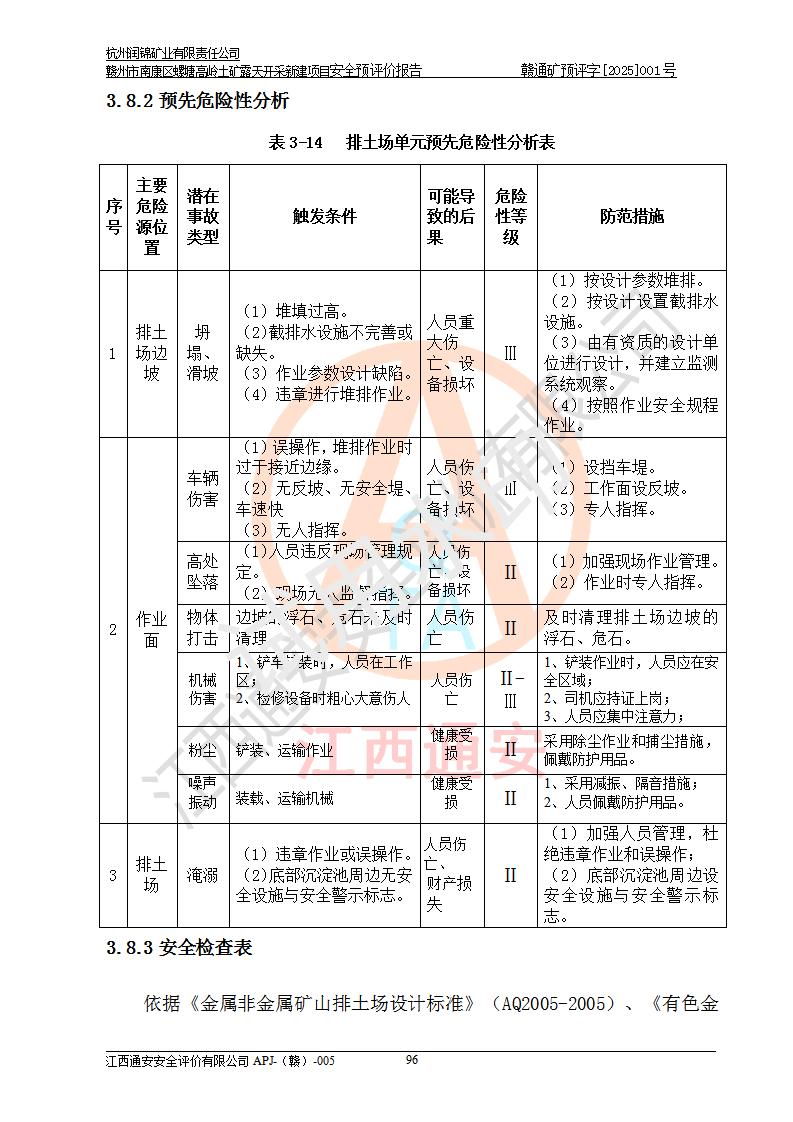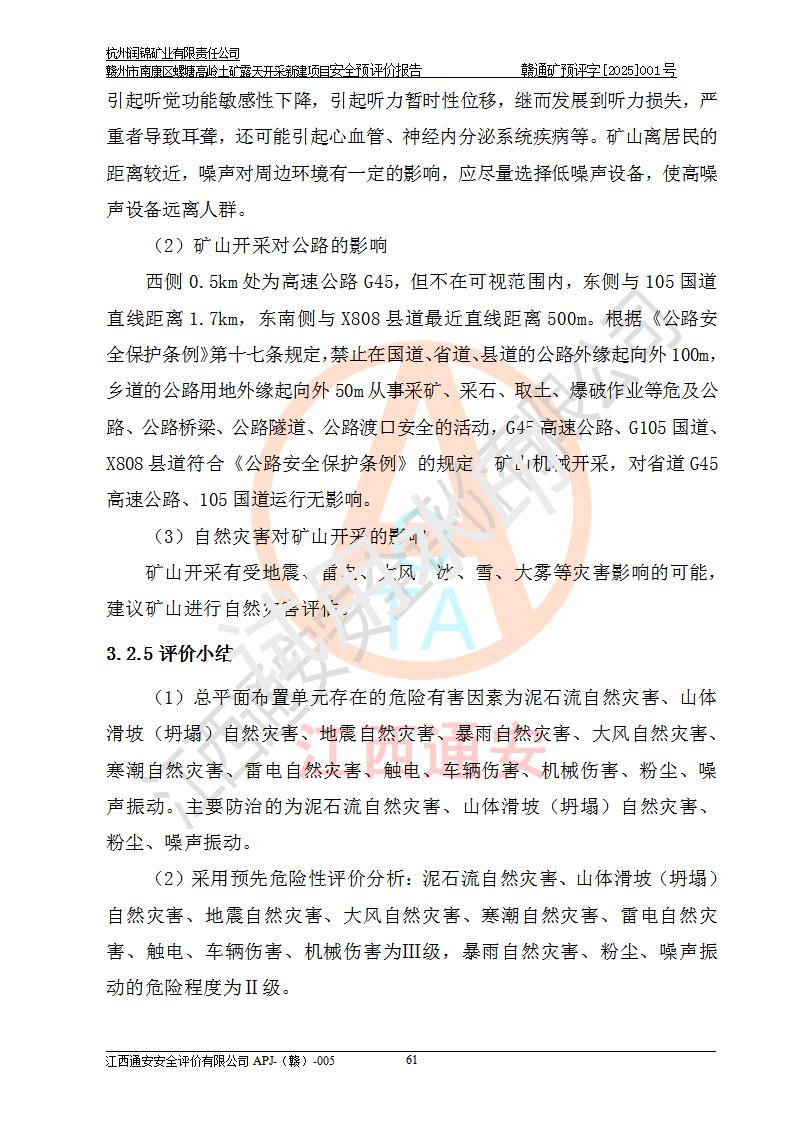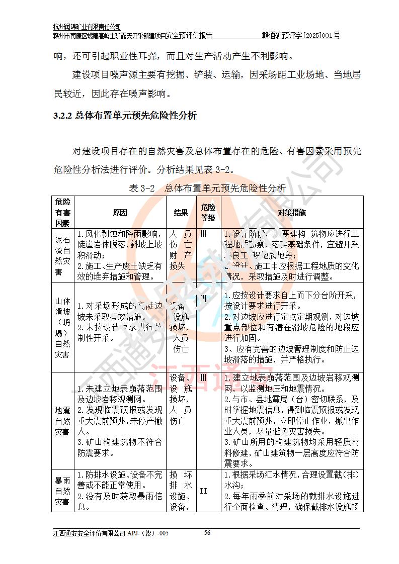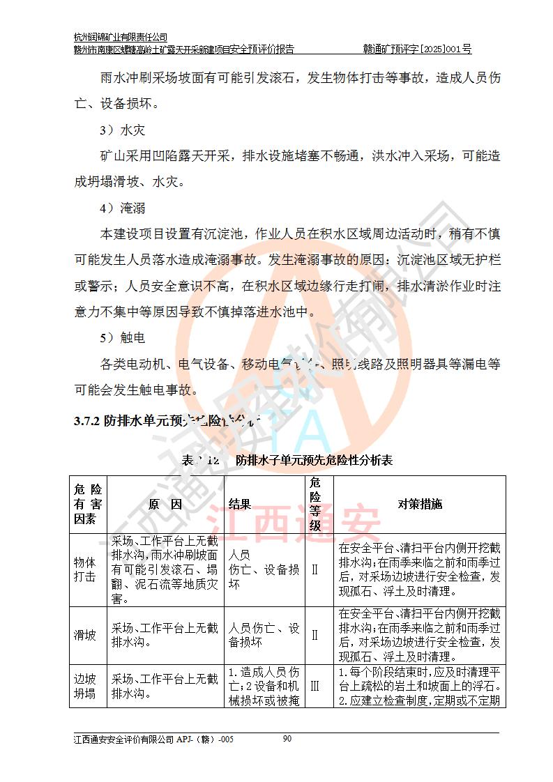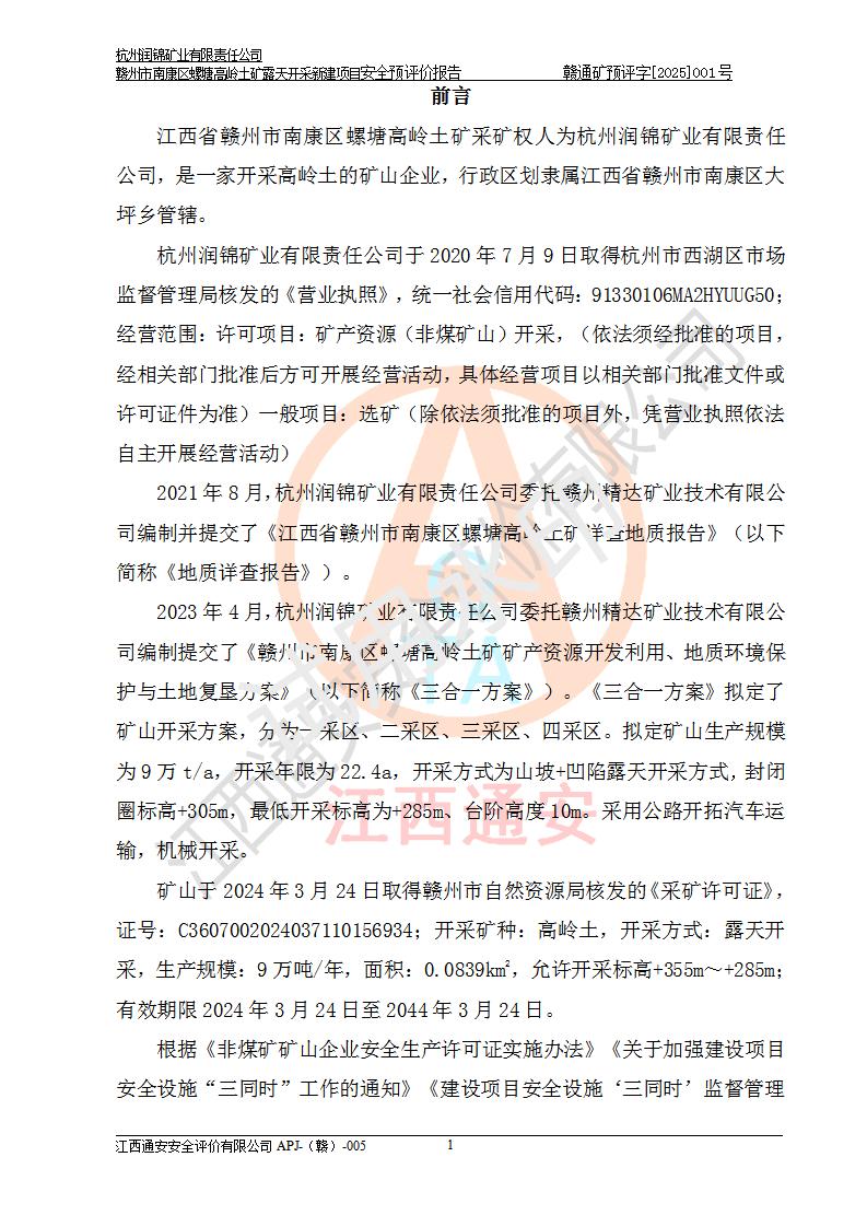 其它 | 评价范围为该新建项目《采矿许可证》划定范围内(平面范围面积:0.0839km2,垂直范围:标高+355m~+285m)拟选用的生产系统(设备设施、采矿工艺)和辅助设施的安全设施、总平面布置(包括项目选址、与周边环境的相互影响)等安全生产管理。 该公司的**问题、产品的厂外运输等不在本次评价范围内。 运用模拟法和类推原理对企业在建设、生产活动中可能存在的危险有害因素进行了辨识。 选用了安全检查表分析和预先危险性分析两种评价方法,进行定性定量的分析评价。 针对评价结果提出相应的对策措施和建议, 针对该项目在今后生产中存在的危险、危害因素,在下一步进行的《安全设施设计》中应充分采纳《三合一报告》及《安全预评价报告》中提出的安全对策措施,严格遵守《金属非金属矿山安全规程》的要求,杭州润锦矿业有限责任公司赣州市南康区螺塘高岭土矿露天开采新建项目可以满足安全生产法律法规和技术规程、标准和规范的要求,风险处在可控范围。 | ||||