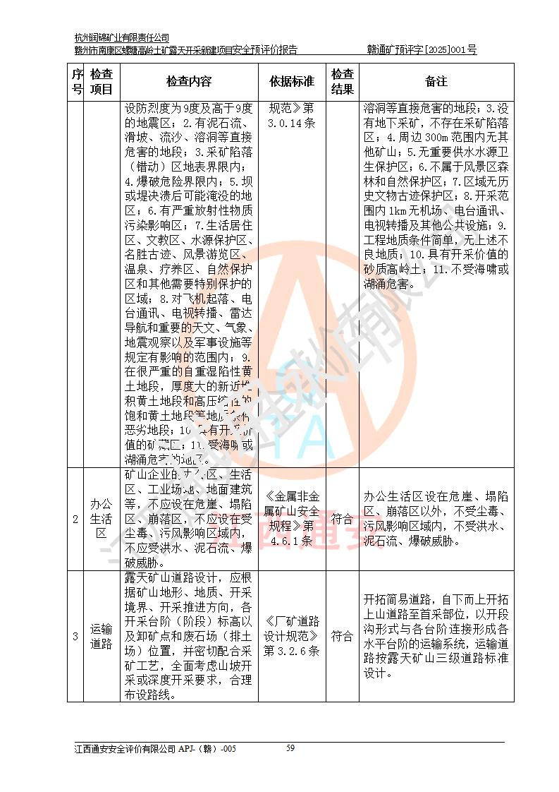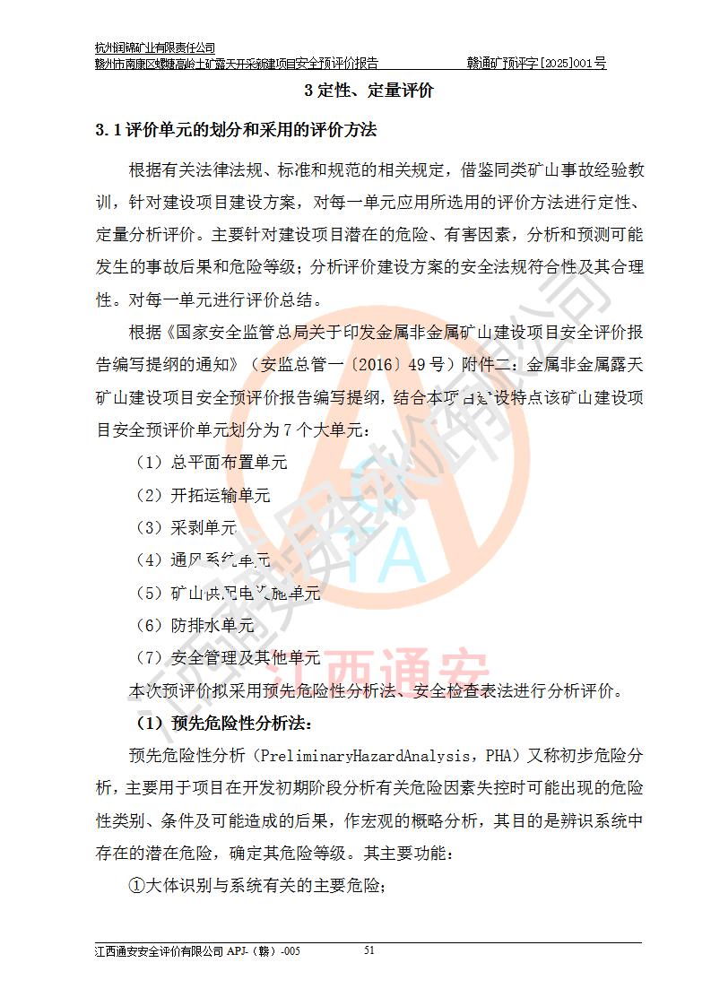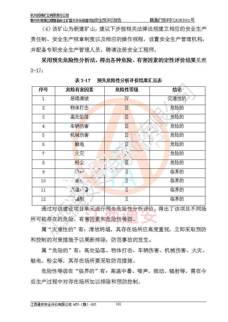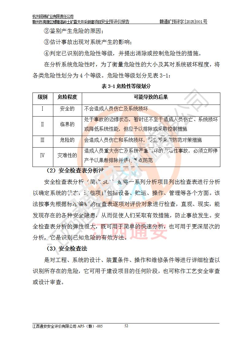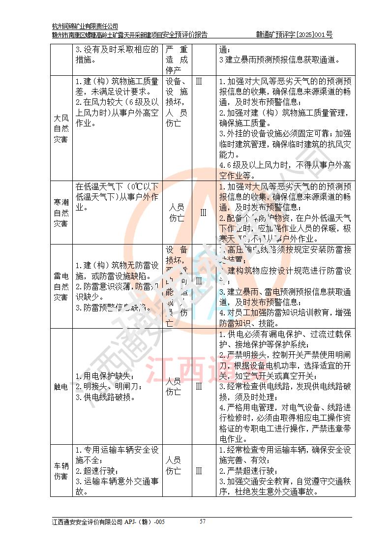 其它 | 评价范围为该新建项目《采矿许可证》划定范围内(平面范围面积:0.0839km2,垂直范围:标高+355m~+285m)拟选用的生产系统(设备设施、采矿工艺)和辅助设施的安全设施、总平面布置(包括项目选址、与周边环境的相互影响)等安全生产管理。 该公司的**问题、产品的厂外运输等不在本次评价范围内。 运用模拟法和类推原理对企业在建设、生产活动中可能存在的危险有害因素进行了辨识。 选用了安全检查表分析和预先危险性分析两种评价方法,进行定性定量的分析评价。 针对评价结果提出相应的对策措施和建议, 针对该项目在今后生产中存在的危险、危害因素,在下一步进行的《安全设施设计》中应充分采纳《三合一报告》及《安全预评价报告》中提出的安全对策措施,严格遵守《金属非金属矿山安全规程》的要求,杭州润锦矿业有限责任公司赣州市南康区螺塘高岭土矿露天开采新建项目可以满足安全生产法律法规和技术规程、标准和规范的要求,风险处在可控范围。 | ||||