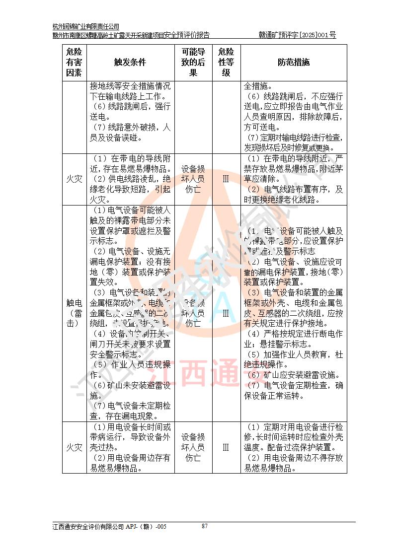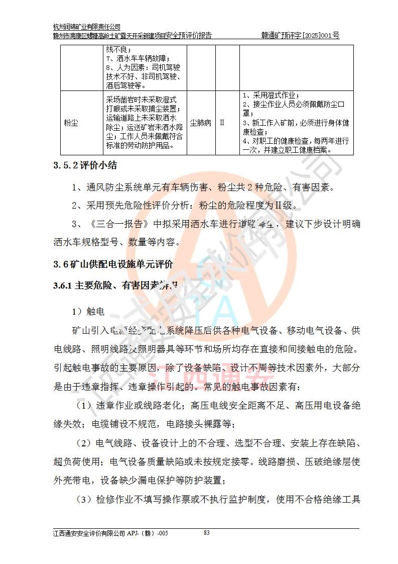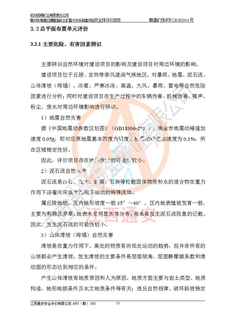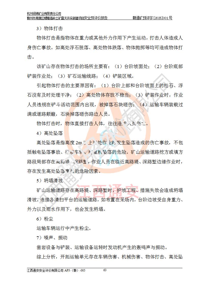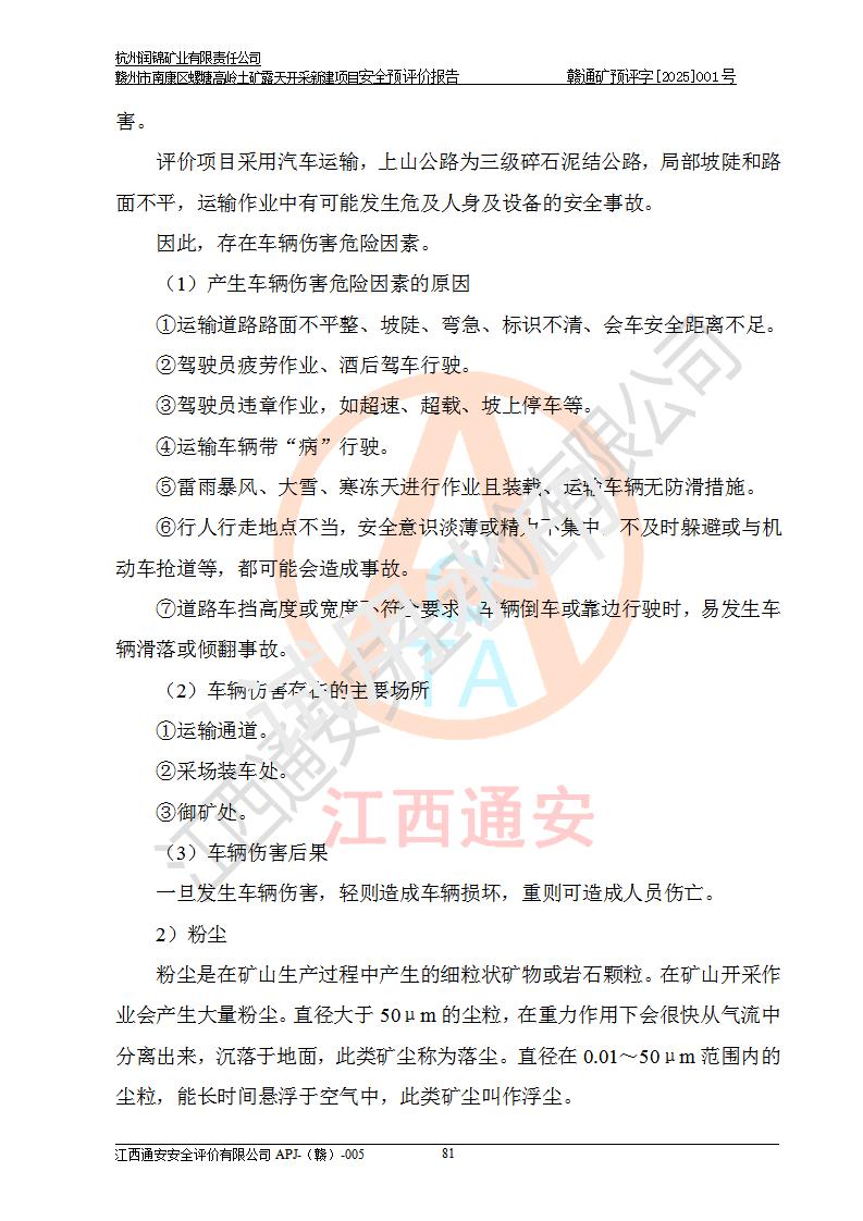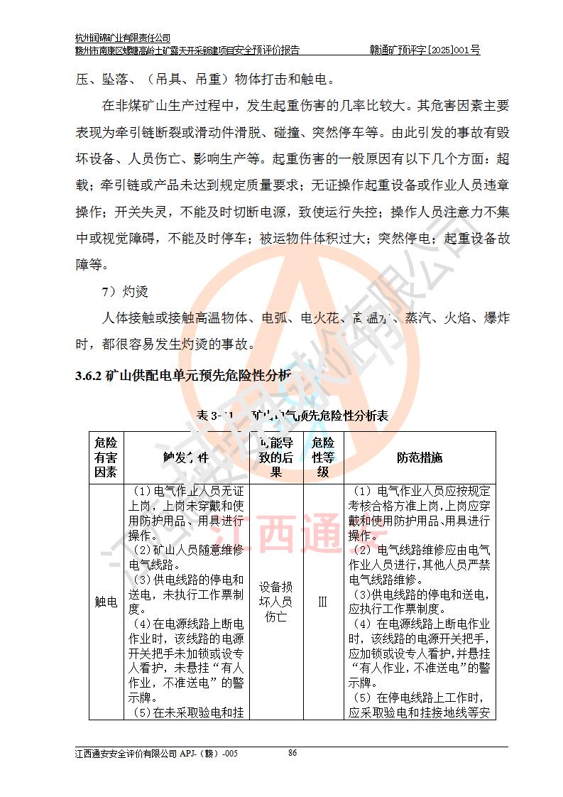 其它 | 评价范围为该新建项目《采矿许可证》划定范围内(平面范围面积:0.0839km2,垂直范围:标高+355m~+285m)拟选用的生产系统(设备设施、采矿工艺)和辅助设施的安全设施、总平面布置(包括项目选址、与周边环境的相互影响)等安全生产管理。 该公司的**问题、产品的厂外运输等不在本次评价范围内。 运用模拟法和类推原理对企业在建设、生产活动中可能存在的危险有害因素进行了辨识。 选用了安全检查表分析和预先危险性分析两种评价方法,进行定性定量的分析评价。 针对评价结果提出相应的对策措施和建议, 针对该项目在今后生产中存在的危险、危害因素,在下一步进行的《安全设施设计》中应充分采纳《三合一报告》及《安全预评价报告》中提出的安全对策措施,严格遵守《金属非金属矿山安全规程》的要求,杭州润锦矿业有限责任公司赣州市南康区螺塘高岭土矿露天开采新建项目可以满足安全生产法律法规和技术规程、标准和规范的要求,风险处在可控范围。 | ||||