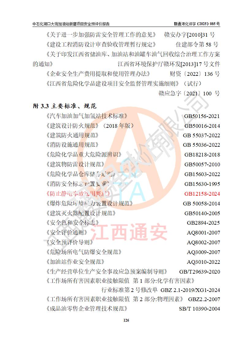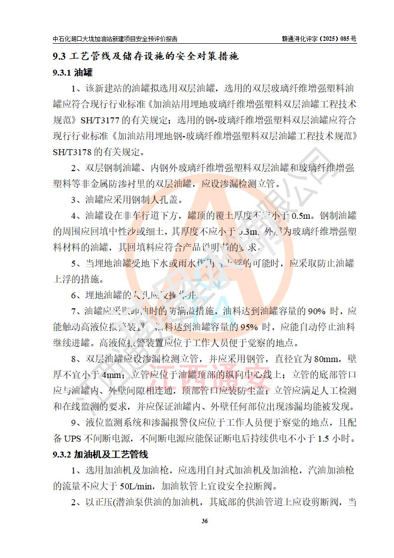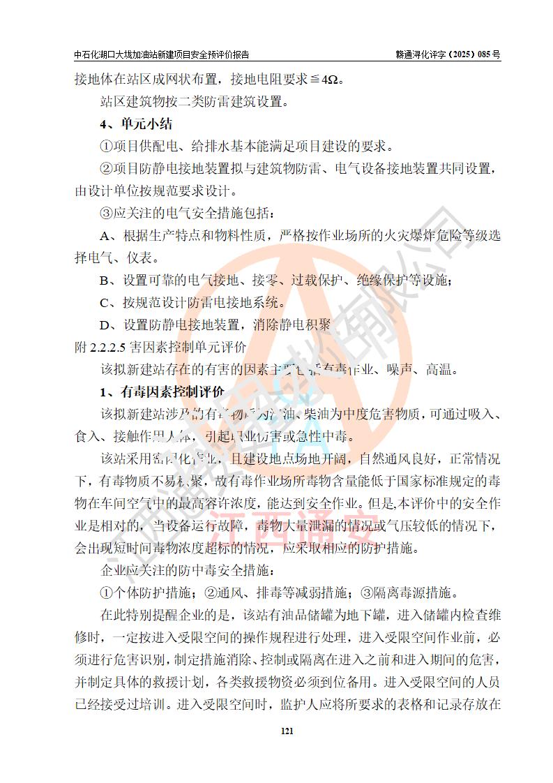 评价结论 | 中国石化销售股份有限公司江西九江石油分公司湖口大垅加油站新建项目的选址、自然条件适宜该项目工程的建设;项目规划设计中的总体布局方案可行,符合有关法规、标准要求;项目选择的工艺过程及设备设施的安全可靠性能达到**法规、标准规定要求;项目存在的危险有害因素可控,在落实项目建设方案及评价报告提出的有关安全对策措施后,其危险有害程度能达到可以接受的程度,项目建设能够实现安全运行的目标。 | |||