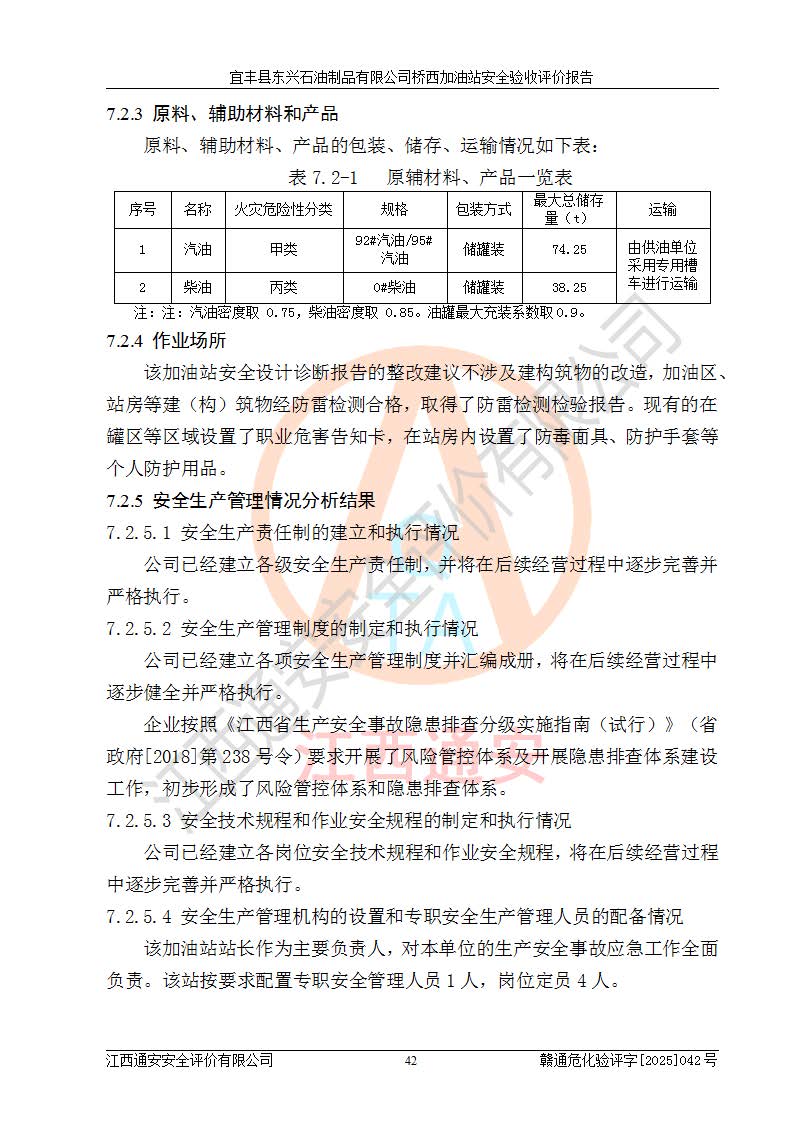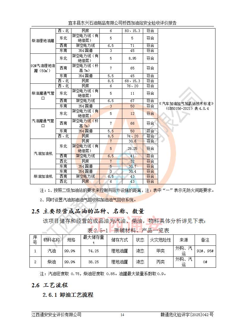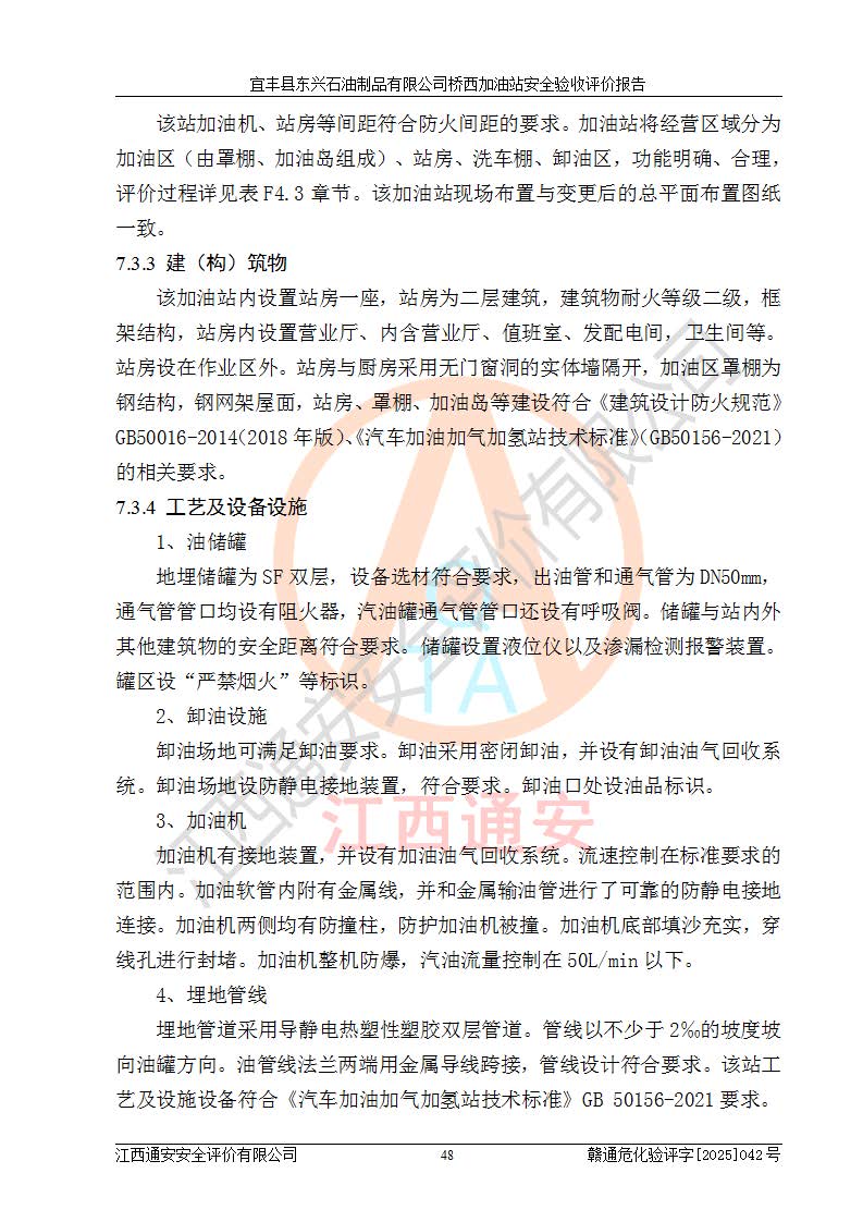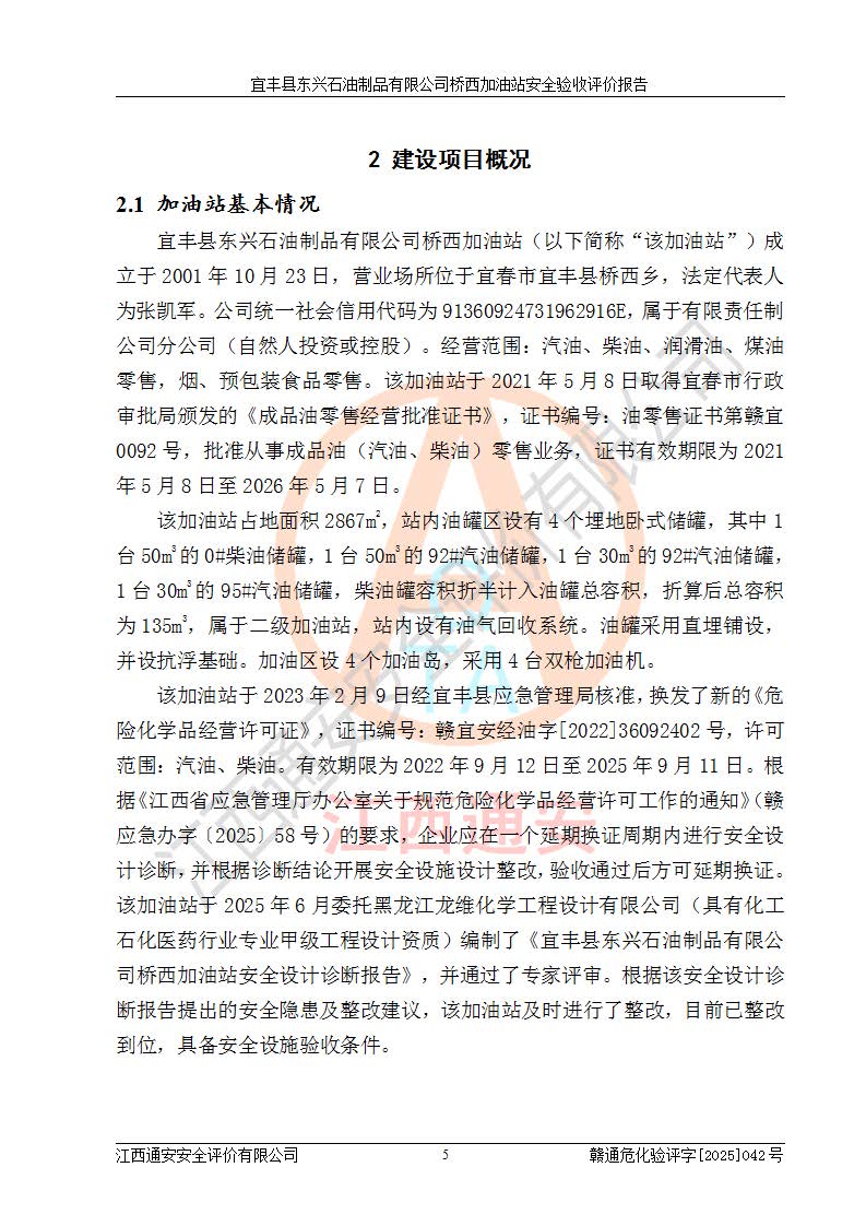 项目简介 | 宜丰县东兴石油制品有限公司桥西加油站(以下简称“该加油站”)成立于2001年10月23日,营业场所位于宜春市宜丰县桥西乡,法定**人为张凯军。该加油站统一社会信用代码为91360924731962916E,属于有限责任制公司分公司(自然人投资或控股)。经营范围:汽油、柴油、润滑油、煤油零售,烟、预包装食品零售。 该加油站油罐区设有4个埋地卧式储罐,其中1台50m3的0#柴油储罐,1台50m3的92#汽油储罐,1台30m3的92#汽油储罐,1台30m3的95#汽油储罐,柴油罐容积折半计入油罐总容积,折算后总容积为135m3,属于二级加油站,站内设有油气回收系统。油罐采用直埋铺设,并设抗浮基础。加油区设4个加油岛,采用4台双枪加油机。该加油站于2023年2月9日经宜丰县应急管理局核准,换发了新的《危险化学品经营许可证》,证书编号:赣宜安经油字[2022]36092402号,许可范围:汽油、柴油。**期限为2022年9月12日至2025年9月11日。 根据《危险化学品安全管理条例》(经***令第344号发布,***令第591号、***令第645号修改),《危险化学品经营许可证管理办法》(2012年7月17日**安全生产监督管理总局令第55号公布,自2012年9月1日起施行;根据2015年5月27日**安全生产监督管理总局令第79号修正)等法律法规及文件要求,该加油站的危险化学品经营许可证三年**期即将到期,需要重新进行安全现状评价。由于该加油站2013年建成投运,安全设施“三同时”资料不全,根据《江西省应急管理厅办公室关于规范危险化学品经营许可工作的通知》(赣应急办字〔2025〕58号)等要求,危险化学品经营企业应在一个延期换证周期内进行安全设计诊断,并根据诊断结论开展安全设施设计整改,验收通过后方可延期换证。该加油站于2025年6月委托黑龙江龙维化学工程设计有限公司(具有化工石化医药行业专业**工程设计资质)编制了《宜丰县东兴石油制品有限公司桥西加油站安全设计诊断报告》,并通过了专家评审。根据该安全设计诊断报告提出的安全隐患及整改建议,该加油站及时进行了整改,目前已整改到位,具备安全设施验收条件。