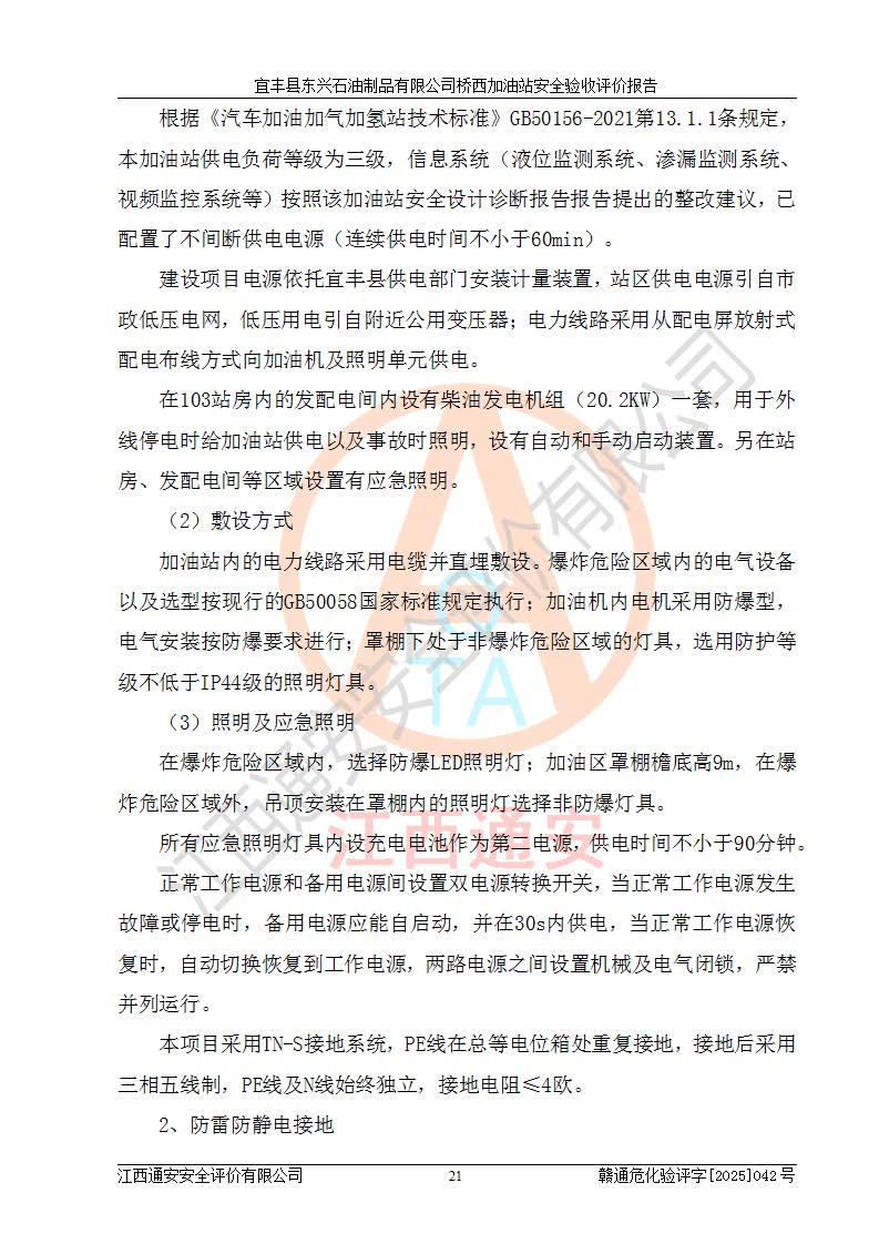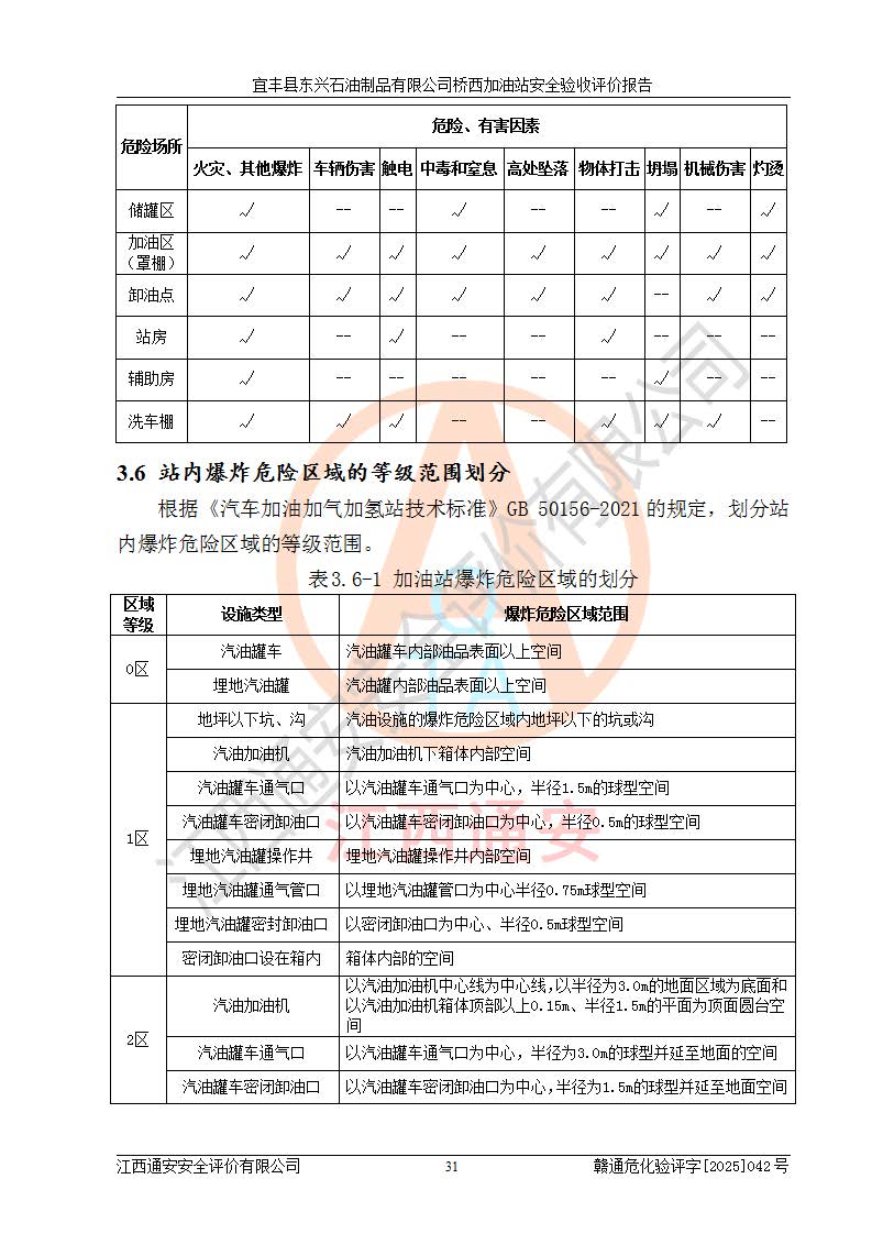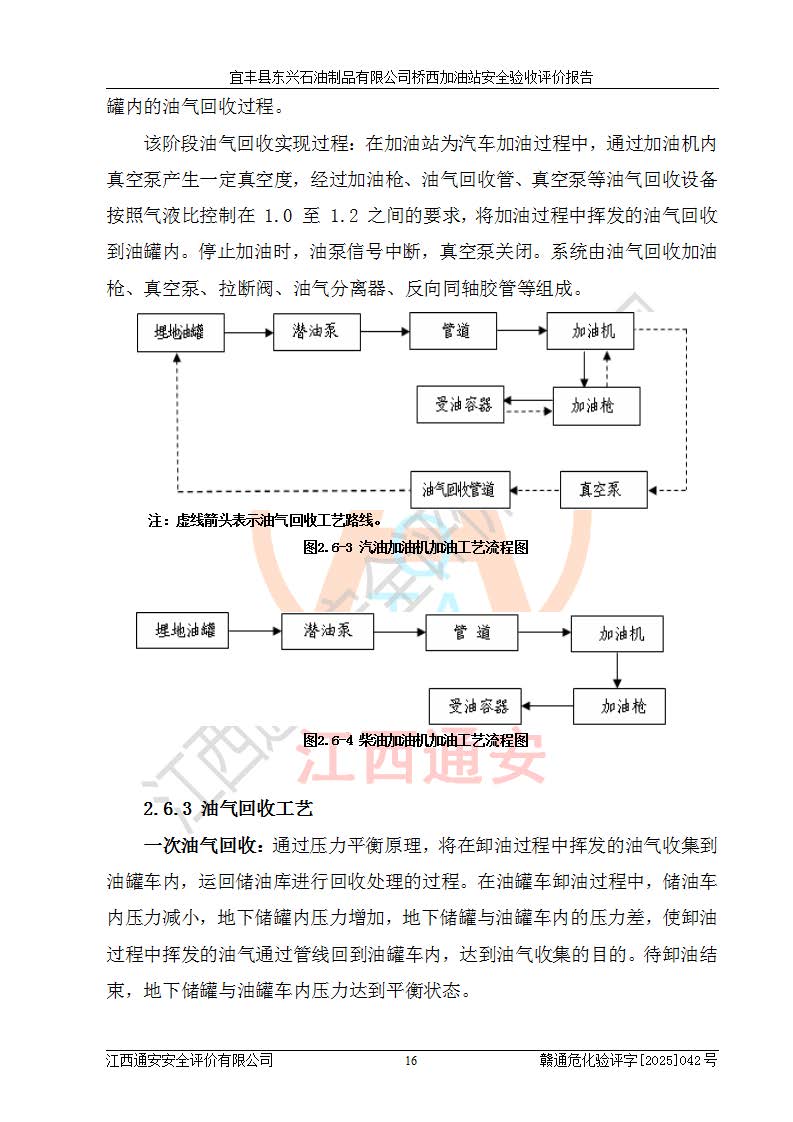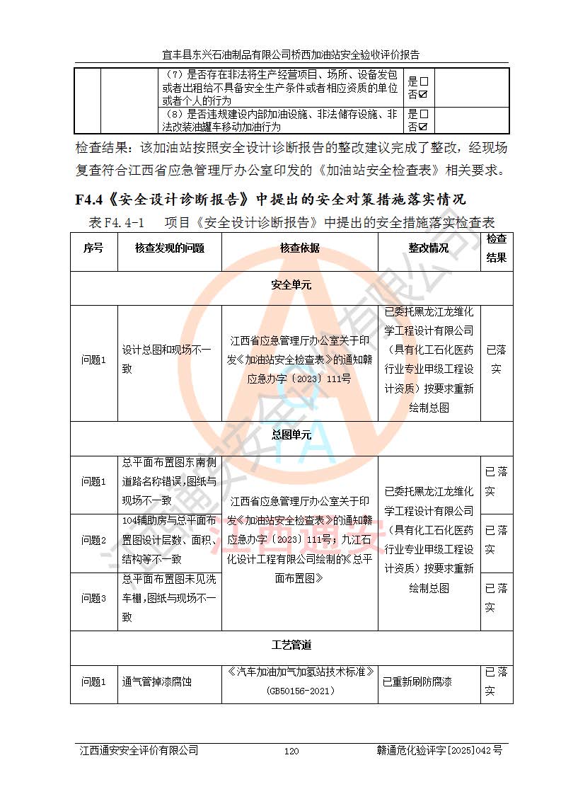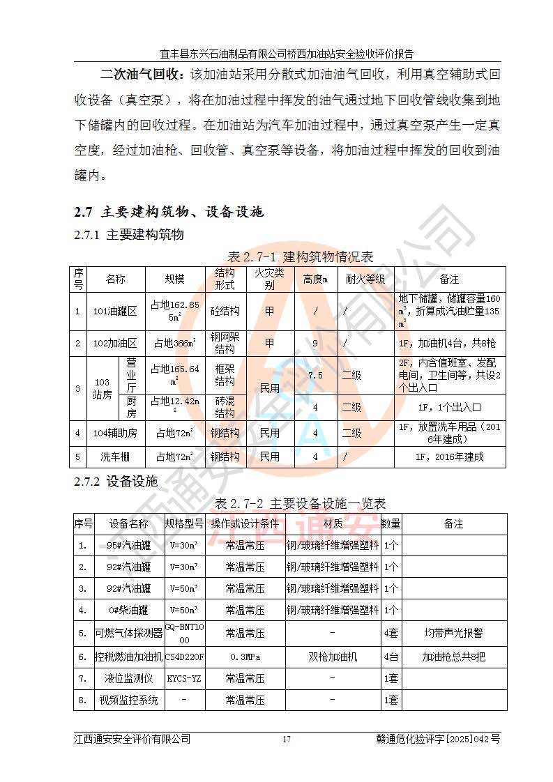 项目简介 | 宜丰县东兴石油制品有限公司桥西加油站(以下简称“该加油站”)成立于2001年10月23日,营业场所位于宜春市宜丰县桥西乡,法定**人为张凯军。该加油站统一社会信用代码为91360924731962916E,属于有限责任制公司分公司(自然人投资或控股)。经营范围:汽油、柴油、润滑油、煤油零售,烟、预包装食品零售。 该加油站油罐区设有4个埋地卧式储罐,其中1台50m3的0#柴油储罐,1台50m3的92#汽油储罐,1台30m3的92#汽油储罐,1台30m3的95#汽油储罐,柴油罐容积折半计入油罐总容积,折算后总容积为135m3,属于二级加油站,站内设有油气回收系统。油罐采用直埋铺设,并设抗浮基础。加油区设4个加油岛,采用4台双枪加油机。该加油站于2023年2月9日经宜丰县应急管理局核准,换发了新的《危险化学品经营许可证》,证书编号:赣宜安经油字[2022]36092402号,许可范围:汽油、柴油。**期限为2022年9月12日至2025年9月11日。 根据《危险化学品安全管理条例》(经***令第344号发布,***令第591号、***令第645号修改),《危险化学品经营许可证管理办法》(2012年7月17日**安全生产监督管理总局令第55号公布,自2012年9月1日起施行;根据2015年5月27日**安全生产监督管理总局令第79号修正)等法律法规及文件要求,该加油站的危险化学品经营许可证三年**期即将到期,需要重新进行安全现状评价。由于该加油站2013年建成投运,安全设施“三同时”资料不全,根据《江西省应急管理厅办公室关于规范危险化学品经营许可工作的通知》(赣应急办字〔2025〕58号)等要求,危险化学品经营企业应在一个延期换证周期内进行安全设计诊断,并根据诊断结论开展安全设施设计整改,验收通过后方可延期换证。该加油站于2025年6月委托黑龙江龙维化学工程设计有限公司(具有化工石化医药行业专业**工程设计资质)编制了《宜丰县东兴石油制品有限公司桥西加油站安全设计诊断报告》,并通过了专家评审。根据该安全设计诊断报告提出的安全隐患及整改建议,该加油站及时进行了整改,目前已整改到位,具备安全设施验收条件。