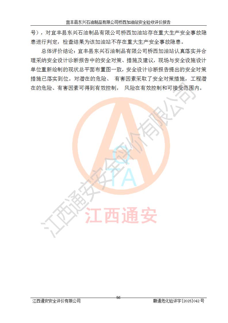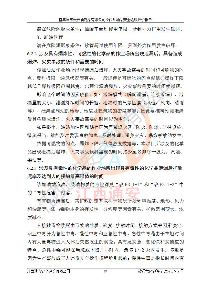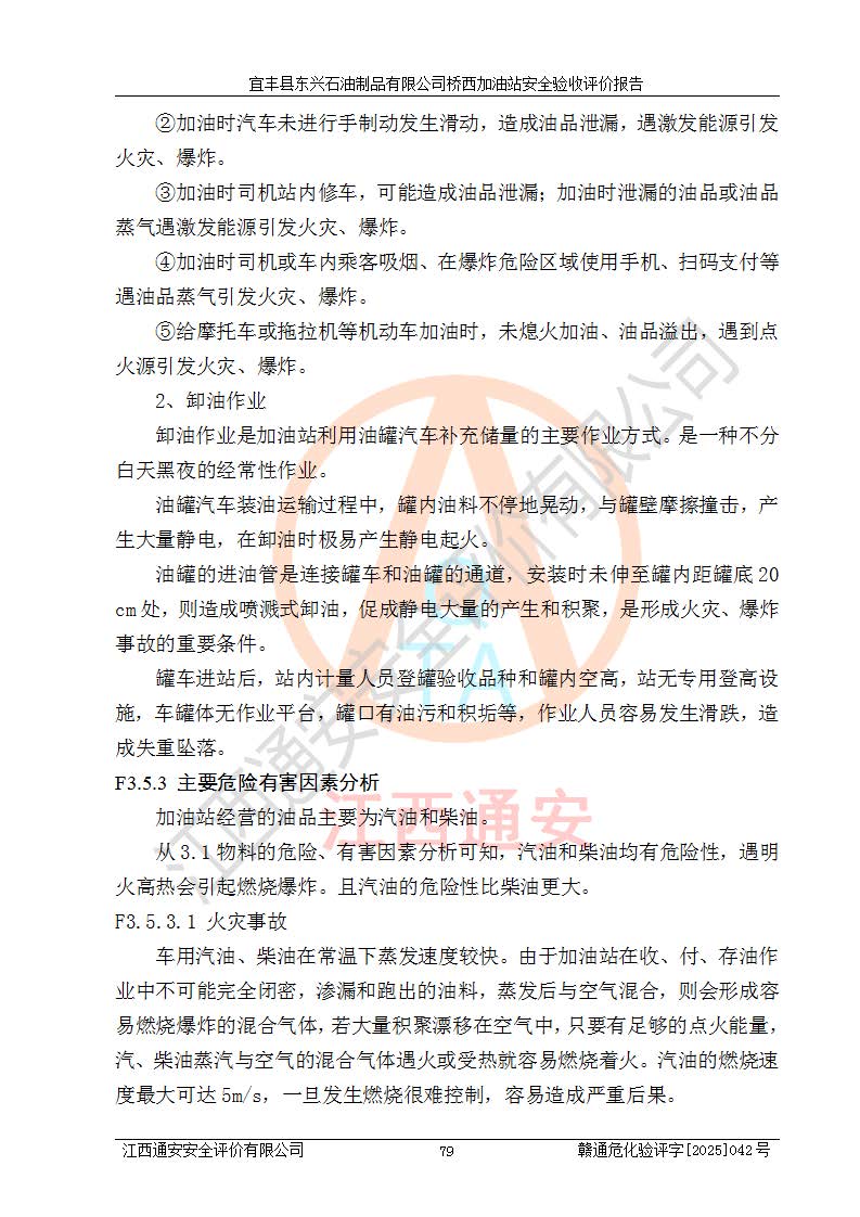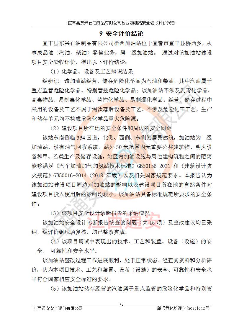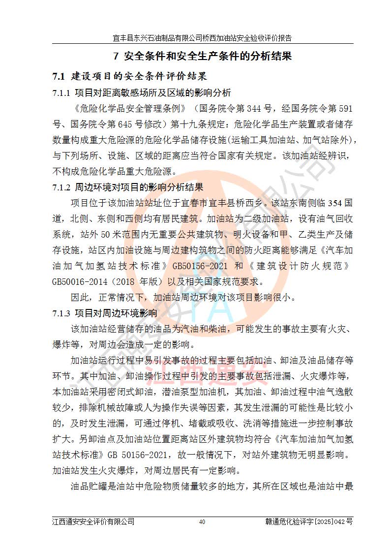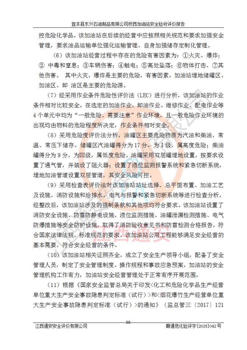 其它 | 一、安全状况综合评述 宜丰县东兴石油制品有限公司桥西加油站位于宜春市宜丰县桥西乡,从事成品油(汽油、柴油)零售业务,属二级加油站。 通过对该加油站建设项目安全验收评价,得出以下评价结论: 化学品、设备及工艺辨识结果 经辨识,该加油站经营、储存危险化学品为汽油和柴油,其中汽油属于重点监管危险化学品、特别管控危险化学品;该加油站不涉及剧毒化学品、高毒物品、易制毒化学品、监控化学品、易制爆化学品。经营、储存过程中采用的设备及工艺不属于淘汰落后设备及工艺、不涉及危险化工工艺,生产和储存单元均不构成危险化学品重大危险源。 建设项目所在地的安全条件和周边的安全间距 该站东南侧临354国道,北侧、西侧、东侧为居民建筑,加油站为二级加油站,设有油气回收系统,站外50米范围内无重要公共建筑物、明火设备和甲、乙类生产及储存设施,站区内加油设施与周边建构筑物之间的距离能够满足《汽车加油加气加氢站技术标准》GB50156-2021 和《建筑设计防火规范》GB50016-2014(2018 年版)以及相关**规范要求。本报告认为该加油站建设项目周边对加油站的影响以及建设项目所在地的自然条件对建设项目投入使用后的影响均较小,该加油站具备标准规范所要求的安全条件。 该项目安全设计诊断报告的采纳情况 该加油站安全设计诊断报告核查的问题(共15项)及整改建议均已采纳,经评价组现场复核,均已整改完成。 该项目调试中表现出的技术、工艺和装置、设备(设施)的安全、 可靠性和安全水平。 该加油站整改过程工作进展顺利,处于正常状态。经查阅资料和分析评价,认为本项目技术、工艺和装置、设备(设施)的安全、可靠性和安全水平符合**相应安全标准的要求。 该加油站储存经营的汽油属于重点监管的危险化学品和特别管控危险化学品,该加油站在后续的经营中应按照相关规范和要求加强安全管理,要求油品运输单位强化运输管理、自身加强储存定制化管理。 该加油站经营过程中存在的危险有害因素为:①火灾、爆炸;② 中毒和窒息;③**伤害;④触电;⑤高处坠落;⑥物体打击、⑦其他伤害。 其中火灾、爆炸是主要的危险、有害因素,加油站埋地储罐区、加油区、卸 油区是主要的危险源。 (7)经采用作业条件危险性评价法(LEC)进行分析,该加油站的作业条件相对比较安全。在选定的加油作业、卸油作业、维修作业、配电作业等4个单元中均为“一般危险、需要注意”作业环境,且一般危险作业环境的出现均由物料的危险程度所决定,作业条件相对安全。 (8)采用危险度评价法分析,油罐区主要危险物质为汽油和柴油,常温、常压下储存。储罐区汽油罐为Ⅰ级,属**危险;柴油罐得分为为Ⅲ级,属低度危险。油罐采用双层罐埋地设置,按要求设置了通气管,并装设了阻火器;设置了液位监测报警系统和紧急切断系统,埋地加油管道设置双层管道,其安全风险可控。 (9)采用检查表评价法对该加油站站址选择、总平面布置、加油工艺及设施、消防设施和给排水、电气与报警和紧急切断系统等进行检查分析,经整改后,该加油站涉及的强制条款和其他项均符合要求。该加油站设置了消防安全设施、防雷防静电设施、液位监测措施、油罐泄漏检测措施、电气防爆措施等安全防护设施,取得了消防验收意见书和防雷检测合格报告,符合**法律法规、标准规范的要求。该加油站公用工程能够满足安全经营的基本需要,符合安全经营的条件。 (10)该加油站相关证照齐全,成立了安全生产**小组,配备了安全管理人员,制定了安全管理制度、操作规程和事故应急预案,加油站的安全管理机构工作有力,加油站安全经营管理处于正常有序开展范围。 (11)对宜丰县东兴石油制品有限公司桥西加油站存在重大生产安全事故隐患进行判定,检查结果为该加油站不存在重大生产安全事故隐患。 总体评价结论:宜丰县东兴石油制品有限公司桥西加油站认真落实并合理采纳安全设计诊断报告中的安全对策、措施及建议,现场与安全设施设计单位重新绘制的现状总平面布置图一致,安全设计诊断报告提出的安全对策措施已落实到位。对潜在的危险、 有害因素采取了安全对策措施,工程潜在的危险、有害因素可得到**控制, 风险在**控制和可接受范围内。