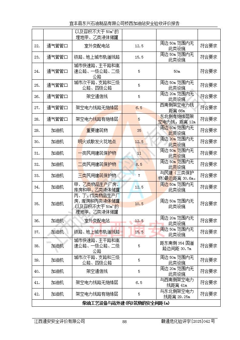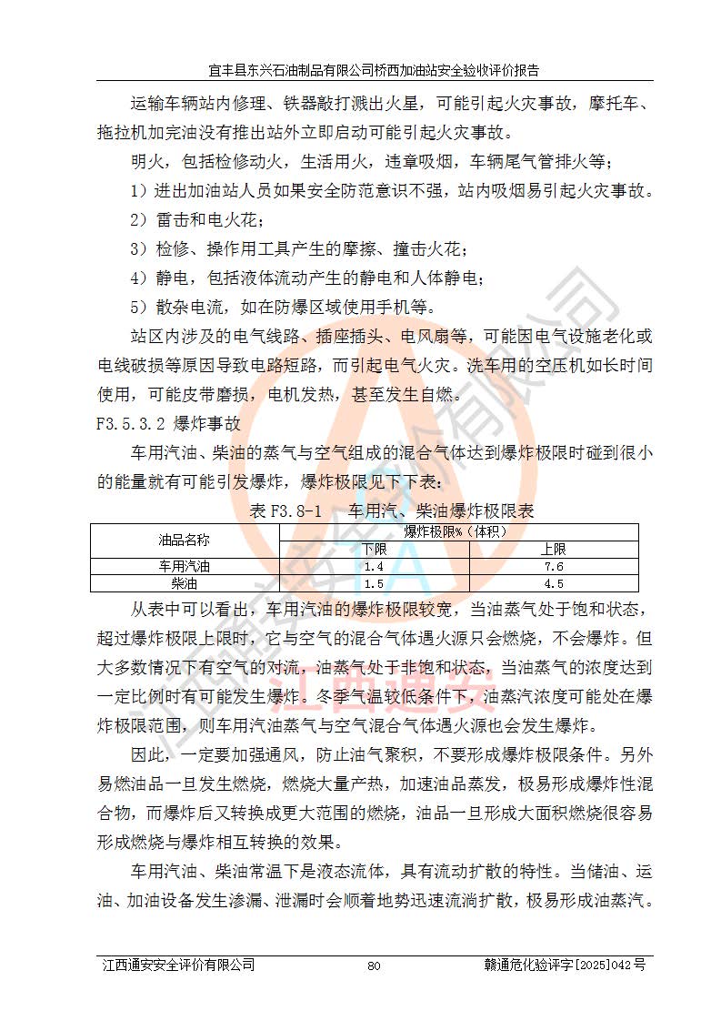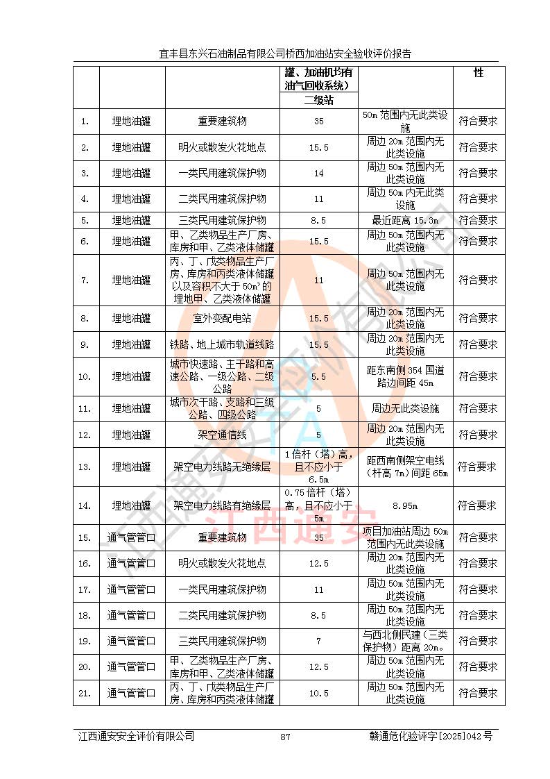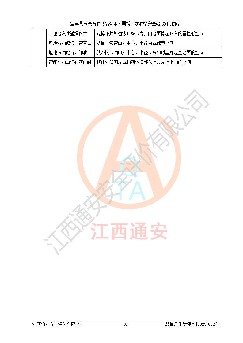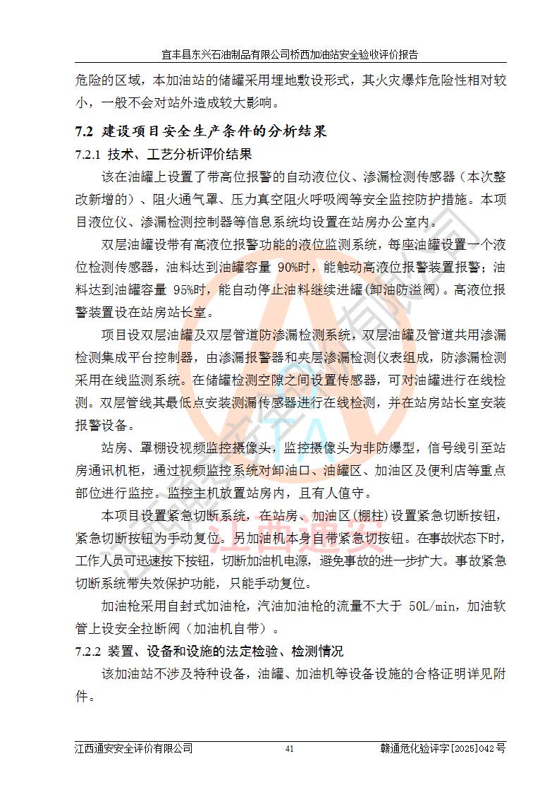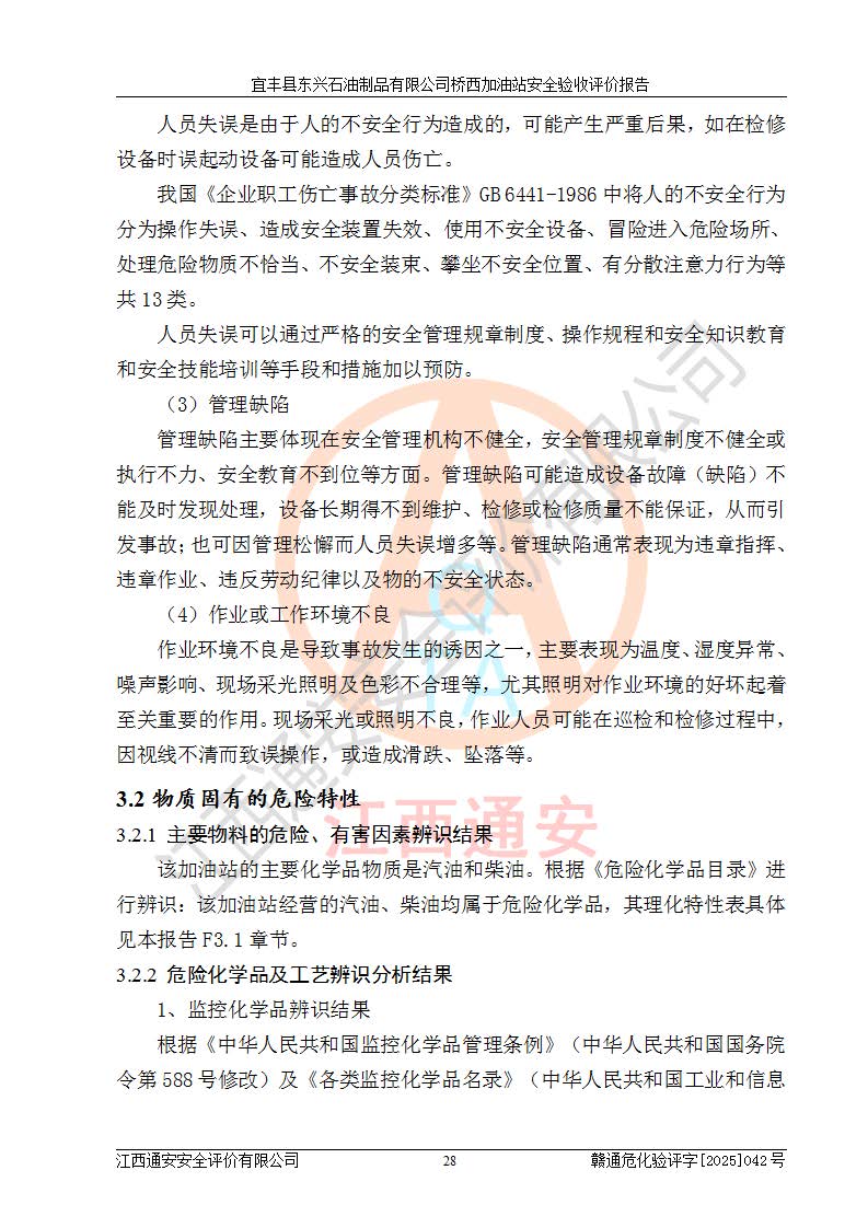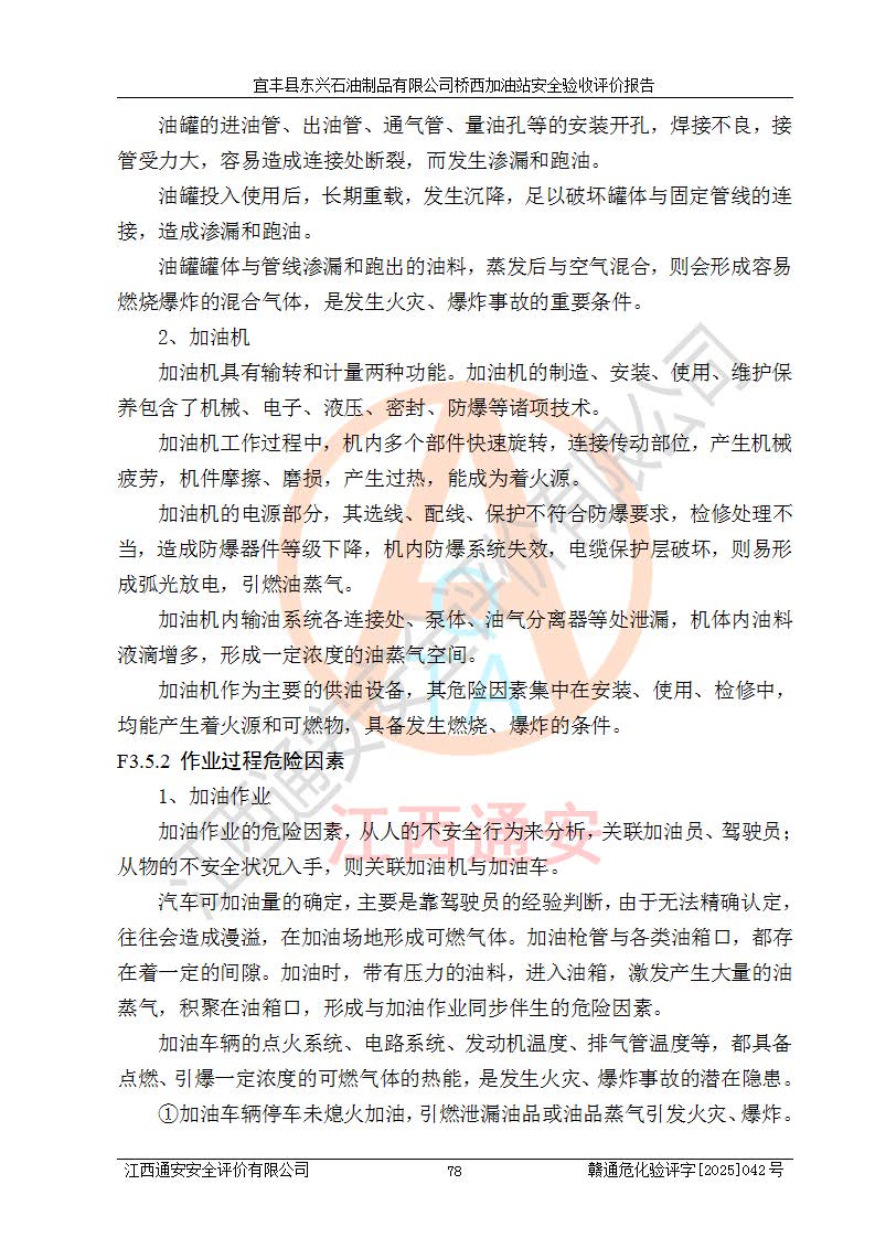 其它 | 一、安全状况综合评述 宜丰县东兴石油制品有限公司桥西加油站位于宜春市宜丰县桥西乡,从事成品油(汽油、柴油)零售业务,属二级加油站。 通过对该加油站建设项目安全验收评价,得出以下评价结论: 化学品、设备及工艺辨识结果 经辨识,该加油站经营、储存危险化学品为汽油和柴油,其中汽油属于重点监管危险化学品、特别管控危险化学品;该加油站不涉及剧毒化学品、高毒物品、易制毒化学品、监控化学品、易制爆化学品。经营、储存过程中采用的设备及工艺不属于淘汰落后设备及工艺、不涉及危险化工工艺,生产和储存单元均不构成危险化学品重大危险源。 建设项目所在地的安全条件和周边的安全间距 该站东南侧临354国道,北侧、西侧、东侧为居民建筑,加油站为二级加油站,设有油气回收系统,站外50米范围内无重要公共建筑物、明火设备和甲、乙类生产及储存设施,站区内加油设施与周边建构筑物之间的距离能够满足《汽车加油加气加氢站技术标准》GB50156-2021 和《建筑设计防火规范》GB50016-2014(2018 年版)以及相关**规范要求。本报告认为该加油站建设项目周边对加油站的影响以及建设项目所在地的自然条件对建设项目投入使用后的影响均较小,该加油站具备标准规范所要求的安全条件。 该项目安全设计诊断报告的采纳情况 该加油站安全设计诊断报告核查的问题(共15项)及整改建议均已采纳,经评价组现场复核,均已整改完成。 该项目调试中表现出的技术、工艺和装置、设备(设施)的安全、 可靠性和安全水平。 该加油站整改过程工作进展顺利,处于正常状态。经查阅资料和分析评价,认为本项目技术、工艺和装置、设备(设施)的安全、可靠性和安全水平符合**相应安全标准的要求。 该加油站储存经营的汽油属于重点监管的危险化学品和特别管控危险化学品,该加油站在后续的经营中应按照相关规范和要求加强安全管理,要求油品运输单位强化运输管理、自身加强储存定制化管理。 该加油站经营过程中存在的危险有害因素为:①火灾、爆炸;② 中毒和窒息;③**伤害;④触电;⑤高处坠落;⑥物体打击、⑦其他伤害。 其中火灾、爆炸是主要的危险、有害因素,加油站埋地储罐区、加油区、卸 油区是主要的危险源。 (7)经采用作业条件危险性评价法(LEC)进行分析,该加油站的作业条件相对比较安全。在选定的加油作业、卸油作业、维修作业、配电作业等4个单元中均为“一般危险、需要注意”作业环境,且一般危险作业环境的出现均由物料的危险程度所决定,作业条件相对安全。 (8)采用危险度评价法分析,油罐区主要危险物质为汽油和柴油,常温、常压下储存。储罐区汽油罐为Ⅰ级,属**危险;柴油罐得分为为Ⅲ级,属低度危险。油罐采用双层罐埋地设置,按要求设置了通气管,并装设了阻火器;设置了液位监测报警系统和紧急切断系统,埋地加油管道设置双层管道,其安全风险可控。 (9)采用检查表评价法对该加油站站址选择、总平面布置、加油工艺及设施、消防设施和给排水、电气与报警和紧急切断系统等进行检查分析,经整改后,该加油站涉及的强制条款和其他项均符合要求。该加油站设置了消防安全设施、防雷防静电设施、液位监测措施、油罐泄漏检测措施、电气防爆措施等安全防护设施,取得了消防验收意见书和防雷检测合格报告,符合**法律法规、标准规范的要求。该加油站公用工程能够满足安全经营的基本需要,符合安全经营的条件。 (10)该加油站相关证照齐全,成立了安全生产**小组,配备了安全管理人员,制定了安全管理制度、操作规程和事故应急预案,加油站的安全管理机构工作有力,加油站安全经营管理处于正常有序开展范围。 (11)对宜丰县东兴石油制品有限公司桥西加油站存在重大生产安全事故隐患进行判定,检查结果为该加油站不存在重大生产安全事故隐患。 总体评价结论:宜丰县东兴石油制品有限公司桥西加油站认真落实并合理采纳安全设计诊断报告中的安全对策、措施及建议,现场与安全设施设计单位重新绘制的现状总平面布置图一致,安全设计诊断报告提出的安全对策措施已落实到位。对潜在的危险、 有害因素采取了安全对策措施,工程潜在的危险、有害因素可得到**控制, 风险在**控制和可接受范围内。