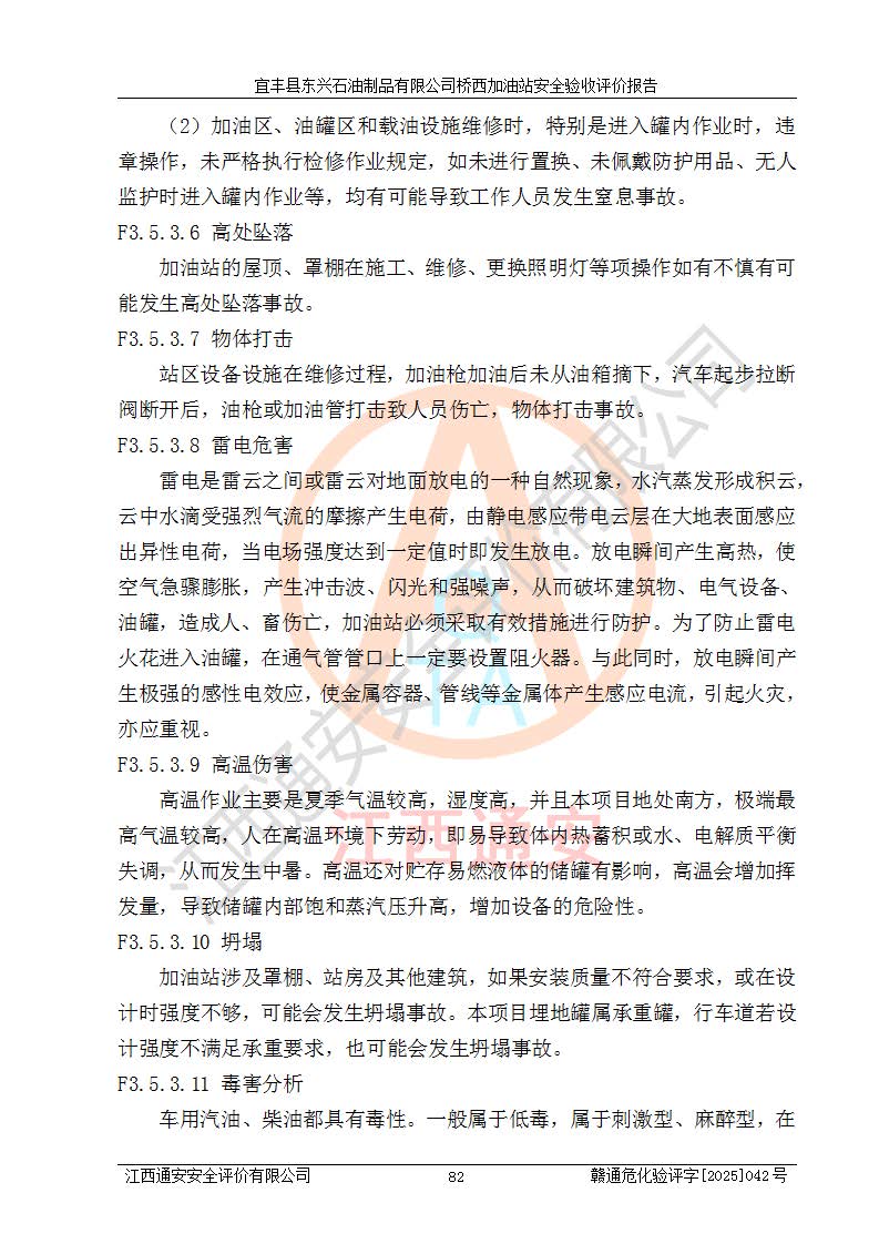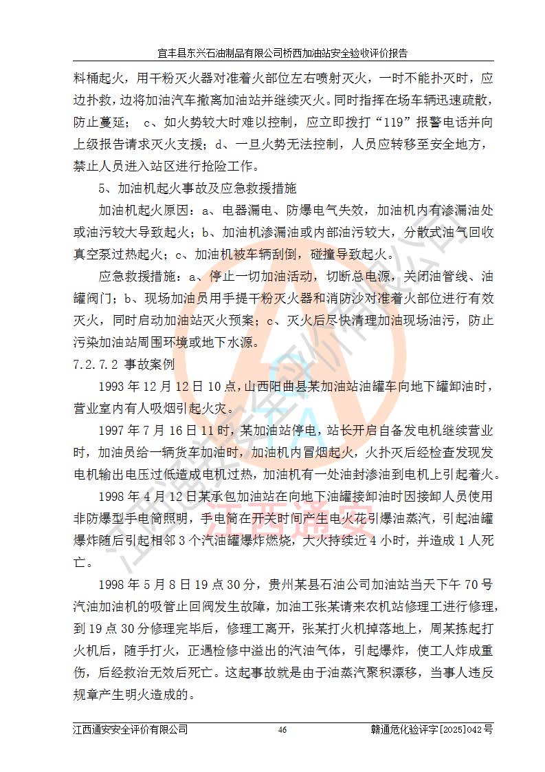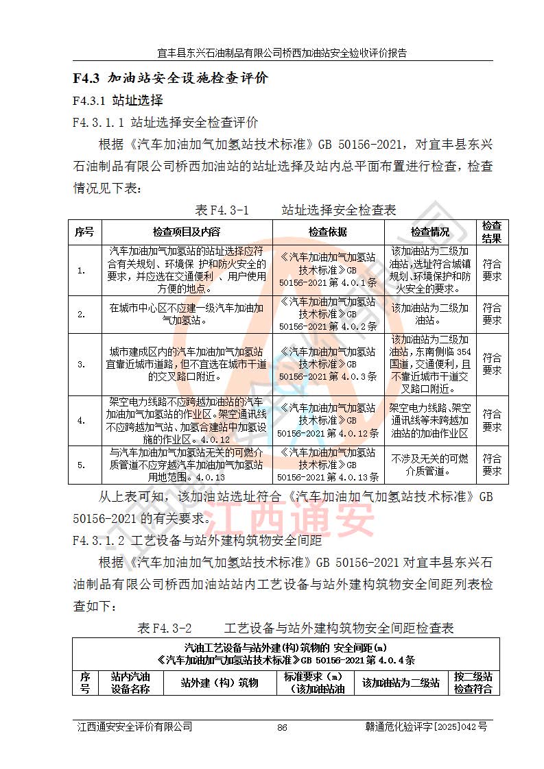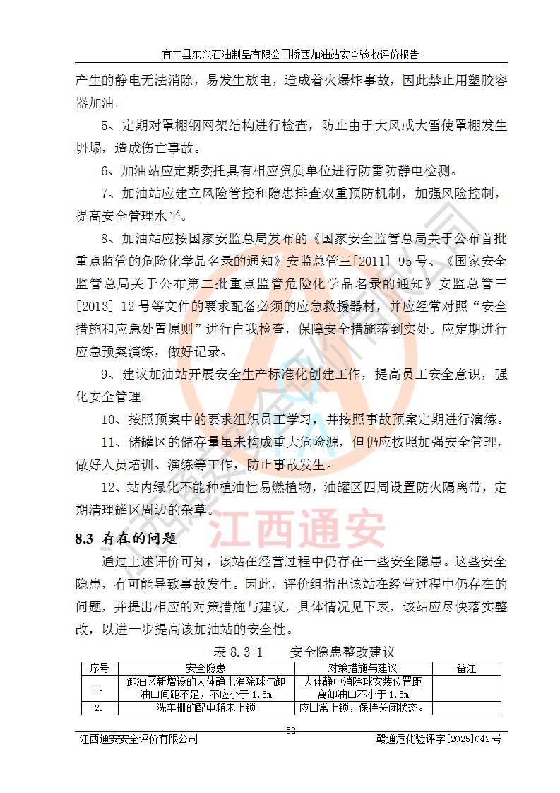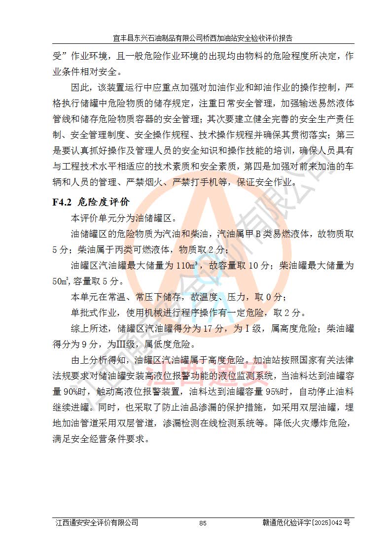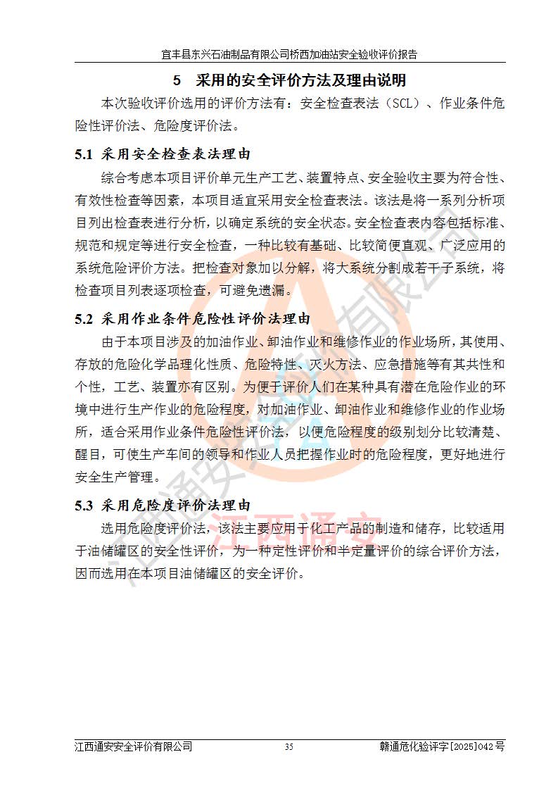 其它 | 一、安全状况综合评述 宜丰县东兴石油制品有限公司桥西加油站位于宜春市宜丰县桥西乡,从事成品油(汽油、柴油)零售业务,属二级加油站。 通过对该加油站建设项目安全验收评价,得出以下评价结论: 化学品、设备及工艺辨识结果 经辨识,该加油站经营、储存危险化学品为汽油和柴油,其中汽油属于重点监管危险化学品、特别管控危险化学品;该加油站不涉及剧毒化学品、高毒物品、易制毒化学品、监控化学品、易制爆化学品。经营、储存过程中采用的设备及工艺不属于淘汰落后设备及工艺、不涉及危险化工工艺,生产和储存单元均不构成危险化学品重大危险源。 建设项目所在地的安全条件和周边的安全间距 该站东南侧临354国道,北侧、西侧、东侧为居民建筑,加油站为二级加油站,设有油气回收系统,站外50米范围内无重要公共建筑物、明火设备和甲、乙类生产及储存设施,站区内加油设施与周边建构筑物之间的距离能够满足《汽车加油加气加氢站技术标准》GB50156-2021 和《建筑设计防火规范》GB50016-2014(2018 年版)以及相关**规范要求。本报告认为该加油站建设项目周边对加油站的影响以及建设项目所在地的自然条件对建设项目投入使用后的影响均较小,该加油站具备标准规范所要求的安全条件。 该项目安全设计诊断报告的采纳情况 该加油站安全设计诊断报告核查的问题(共15项)及整改建议均已采纳,经评价组现场复核,均已整改完成。 该项目调试中表现出的技术、工艺和装置、设备(设施)的安全、 可靠性和安全水平。 该加油站整改过程工作进展顺利,处于正常状态。经查阅资料和分析评价,认为本项目技术、工艺和装置、设备(设施)的安全、可靠性和安全水平符合**相应安全标准的要求。 该加油站储存经营的汽油属于重点监管的危险化学品和特别管控危险化学品,该加油站在后续的经营中应按照相关规范和要求加强安全管理,要求油品运输单位强化运输管理、自身加强储存定制化管理。 该加油站经营过程中存在的危险有害因素为:①火灾、爆炸;② 中毒和窒息;③**伤害;④触电;⑤高处坠落;⑥物体打击、⑦其他伤害。 其中火灾、爆炸是主要的危险、有害因素,加油站埋地储罐区、加油区、卸 油区是主要的危险源。 (7)经采用作业条件危险性评价法(LEC)进行分析,该加油站的作业条件相对比较安全。在选定的加油作业、卸油作业、维修作业、配电作业等4个单元中均为“一般危险、需要注意”作业环境,且一般危险作业环境的出现均由物料的危险程度所决定,作业条件相对安全。 (8)采用危险度评价法分析,油罐区主要危险物质为汽油和柴油,常温、常压下储存。储罐区汽油罐为Ⅰ级,属**危险;柴油罐得分为为Ⅲ级,属低度危险。油罐采用双层罐埋地设置,按要求设置了通气管,并装设了阻火器;设置了液位监测报警系统和紧急切断系统,埋地加油管道设置双层管道,其安全风险可控。 (9)采用检查表评价法对该加油站站址选择、总平面布置、加油工艺及设施、消防设施和给排水、电气与报警和紧急切断系统等进行检查分析,经整改后,该加油站涉及的强制条款和其他项均符合要求。该加油站设置了消防安全设施、防雷防静电设施、液位监测措施、油罐泄漏检测措施、电气防爆措施等安全防护设施,取得了消防验收意见书和防雷检测合格报告,符合**法律法规、标准规范的要求。该加油站公用工程能够满足安全经营的基本需要,符合安全经营的条件。 (10)该加油站相关证照齐全,成立了安全生产**小组,配备了安全管理人员,制定了安全管理制度、操作规程和事故应急预案,加油站的安全管理机构工作有力,加油站安全经营管理处于正常有序开展范围。 (11)对宜丰县东兴石油制品有限公司桥西加油站存在重大生产安全事故隐患进行判定,检查结果为该加油站不存在重大生产安全事故隐患。 总体评价结论:宜丰县东兴石油制品有限公司桥西加油站认真落实并合理采纳安全设计诊断报告中的安全对策、措施及建议,现场与安全设施设计单位重新绘制的现状总平面布置图一致,安全设计诊断报告提出的安全对策措施已落实到位。对潜在的危险、 有害因素采取了安全对策措施,工程潜在的危险、有害因素可得到**控制, 风险在**控制和可接受范围内。