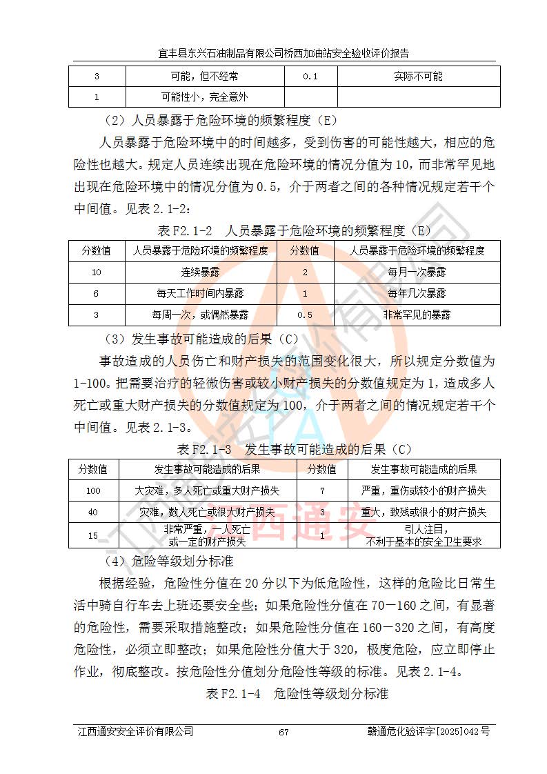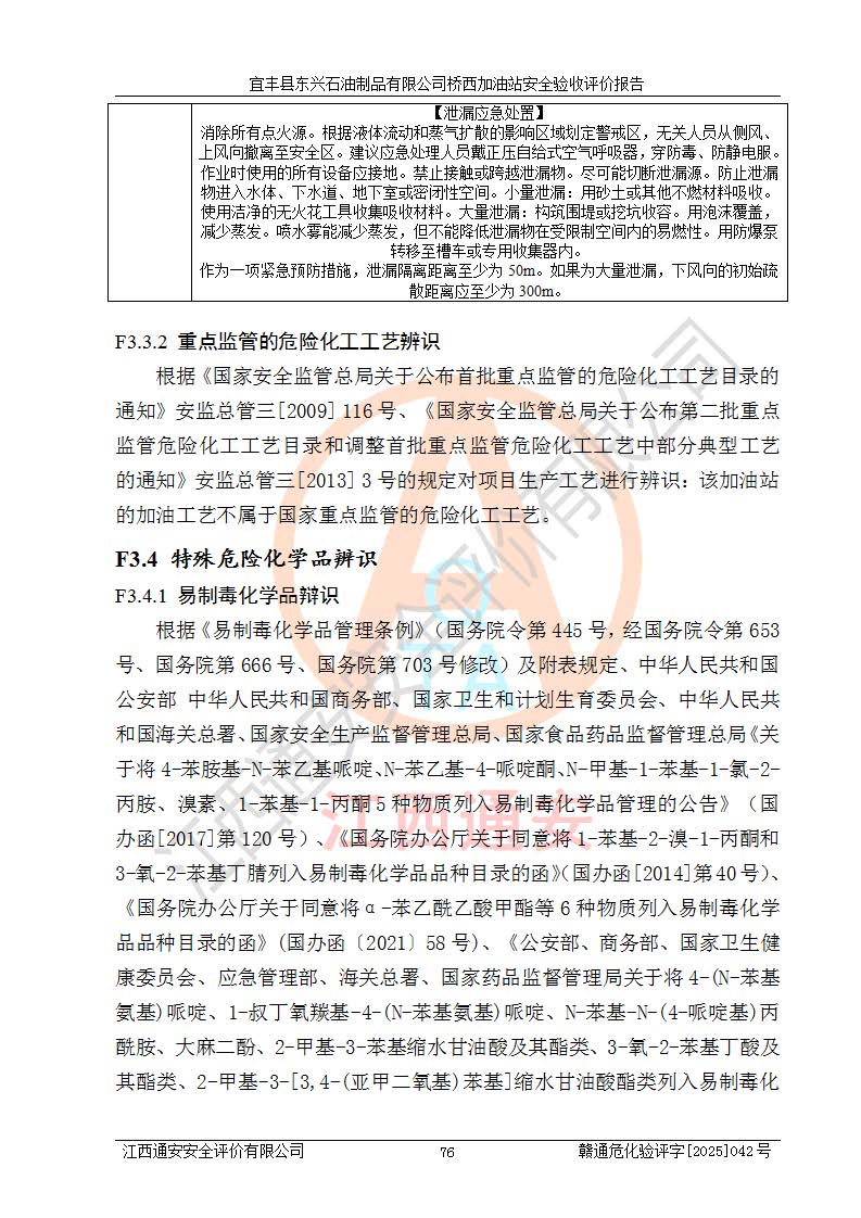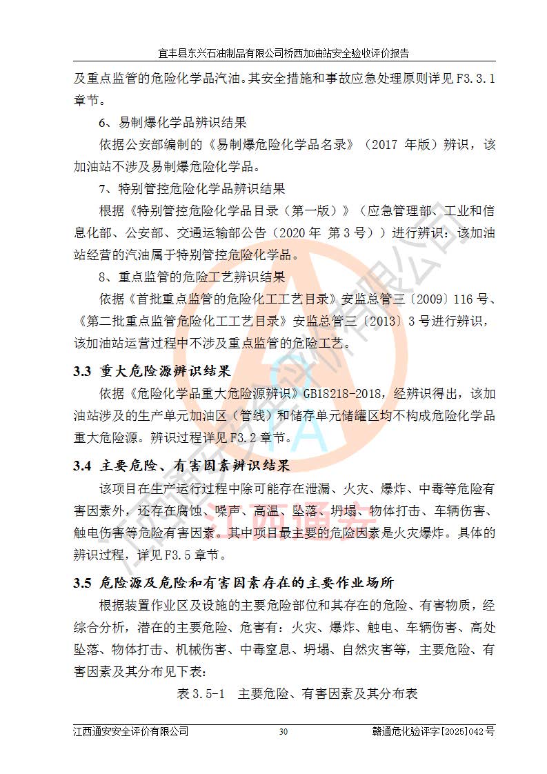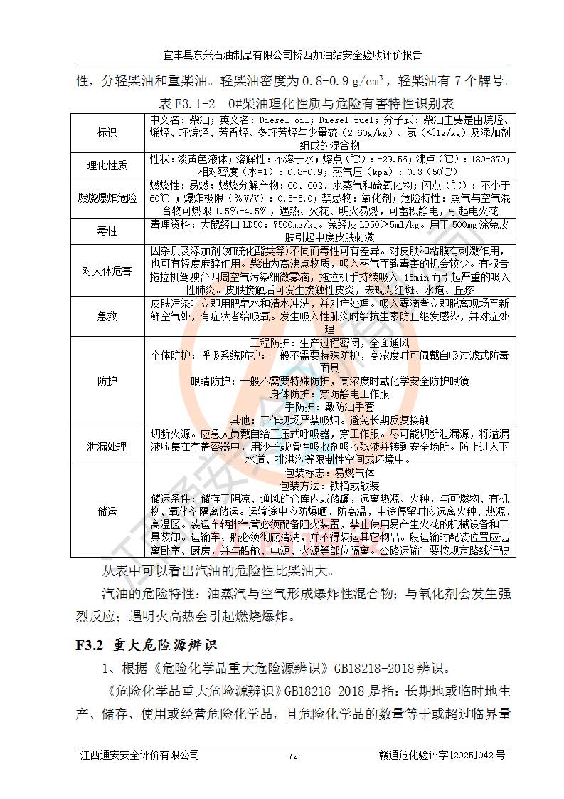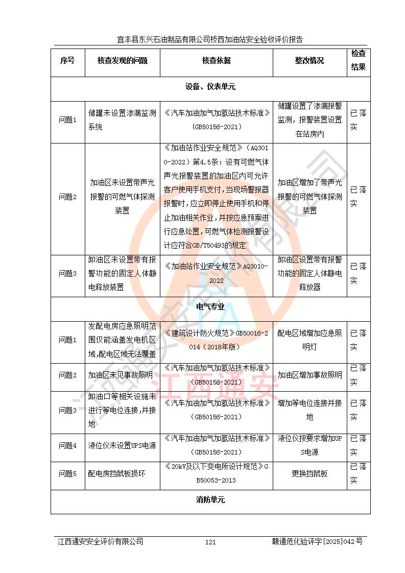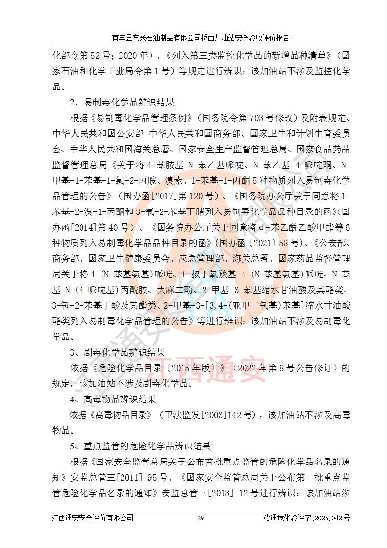 其它 | 一、安全状况综合评述 宜丰县东兴石油制品有限公司桥西加油站位于宜春市宜丰县桥西乡,从事成品油(汽油、柴油)零售业务,属二级加油站。 通过对该加油站建设项目安全验收评价,得出以下评价结论: 化学品、设备及工艺辨识结果 经辨识,该加油站经营、储存危险化学品为汽油和柴油,其中汽油属于重点监管危险化学品、特别管控危险化学品;该加油站不涉及剧毒化学品、高毒物品、易制毒化学品、监控化学品、易制爆化学品。经营、储存过程中采用的设备及工艺不属于淘汰落后设备及工艺、不涉及危险化工工艺,生产和储存单元均不构成危险化学品重大危险源。 建设项目所在地的安全条件和周边的安全间距 该站东南侧临354国道,北侧、西侧、东侧为居民建筑,加油站为二级加油站,设有油气回收系统,站外50米范围内无重要公共建筑物、明火设备和甲、乙类生产及储存设施,站区内加油设施与周边建构筑物之间的距离能够满足《汽车加油加气加氢站技术标准》GB50156-2021 和《建筑设计防火规范》GB50016-2014(2018 年版)以及相关**规范要求。本报告认为该加油站建设项目周边对加油站的影响以及建设项目所在地的自然条件对建设项目投入使用后的影响均较小,该加油站具备标准规范所要求的安全条件。 该项目安全设计诊断报告的采纳情况 该加油站安全设计诊断报告核查的问题(共15项)及整改建议均已采纳,经评价组现场复核,均已整改完成。 该项目调试中表现出的技术、工艺和装置、设备(设施)的安全、 可靠性和安全水平。 该加油站整改过程工作进展顺利,处于正常状态。经查阅资料和分析评价,认为本项目技术、工艺和装置、设备(设施)的安全、可靠性和安全水平符合**相应安全标准的要求。 该加油站储存经营的汽油属于重点监管的危险化学品和特别管控危险化学品,该加油站在后续的经营中应按照相关规范和要求加强安全管理,要求油品运输单位强化运输管理、自身加强储存定制化管理。 该加油站经营过程中存在的危险有害因素为:①火灾、爆炸;② 中毒和窒息;③**伤害;④触电;⑤高处坠落;⑥物体打击、⑦其他伤害。 其中火灾、爆炸是主要的危险、有害因素,加油站埋地储罐区、加油区、卸 油区是主要的危险源。 (7)经采用作业条件危险性评价法(LEC)进行分析,该加油站的作业条件相对比较安全。在选定的加油作业、卸油作业、维修作业、配电作业等4个单元中均为“一般危险、需要注意”作业环境,且一般危险作业环境的出现均由物料的危险程度所决定,作业条件相对安全。 (8)采用危险度评价法分析,油罐区主要危险物质为汽油和柴油,常温、常压下储存。储罐区汽油罐为Ⅰ级,属**危险;柴油罐得分为为Ⅲ级,属低度危险。油罐采用双层罐埋地设置,按要求设置了通气管,并装设了阻火器;设置了液位监测报警系统和紧急切断系统,埋地加油管道设置双层管道,其安全风险可控。 (9)采用检查表评价法对该加油站站址选择、总平面布置、加油工艺及设施、消防设施和给排水、电气与报警和紧急切断系统等进行检查分析,经整改后,该加油站涉及的强制条款和其他项均符合要求。该加油站设置了消防安全设施、防雷防静电设施、液位监测措施、油罐泄漏检测措施、电气防爆措施等安全防护设施,取得了消防验收意见书和防雷检测合格报告,符合**法律法规、标准规范的要求。该加油站公用工程能够满足安全经营的基本需要,符合安全经营的条件。 (10)该加油站相关证照齐全,成立了安全生产**小组,配备了安全管理人员,制定了安全管理制度、操作规程和事故应急预案,加油站的安全管理机构工作有力,加油站安全经营管理处于正常有序开展范围。 (11)对宜丰县东兴石油制品有限公司桥西加油站存在重大生产安全事故隐患进行判定,检查结果为该加油站不存在重大生产安全事故隐患。 总体评价结论:宜丰县东兴石油制品有限公司桥西加油站认真落实并合理采纳安全设计诊断报告中的安全对策、措施及建议,现场与安全设施设计单位重新绘制的现状总平面布置图一致,安全设计诊断报告提出的安全对策措施已落实到位。对潜在的危险、 有害因素采取了安全对策措施,工程潜在的危险、有害因素可得到**控制, 风险在**控制和可接受范围内。