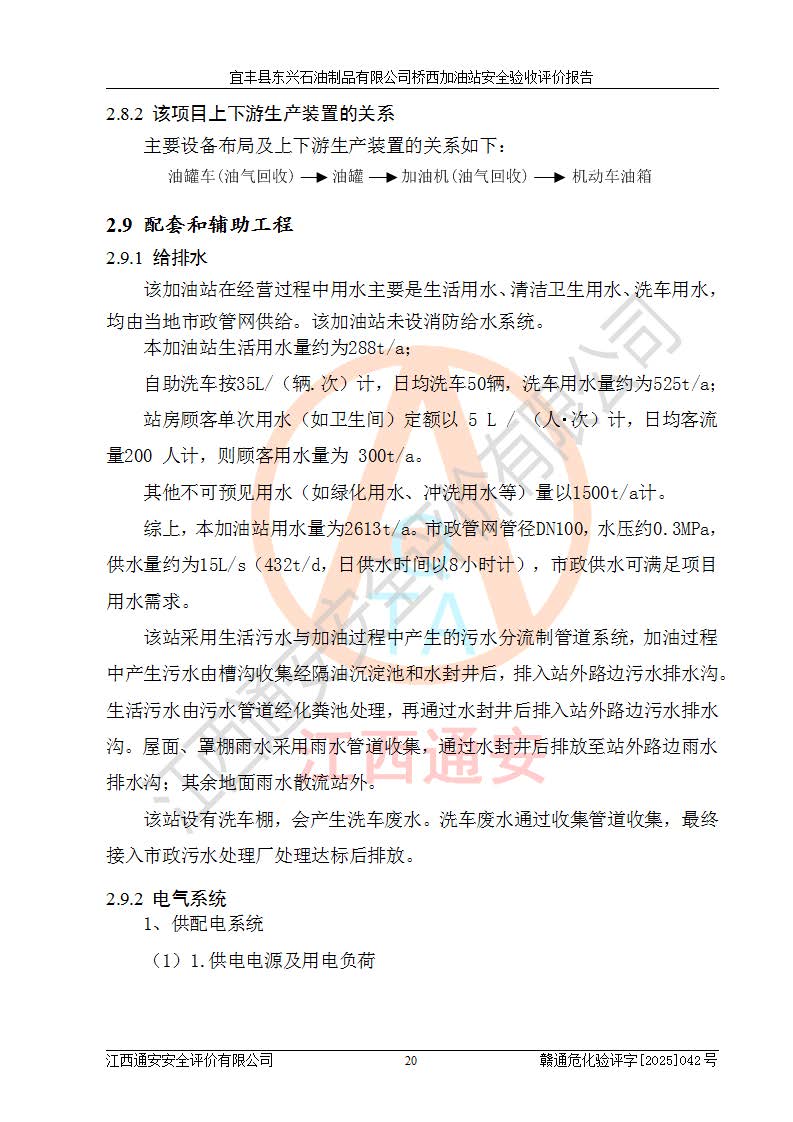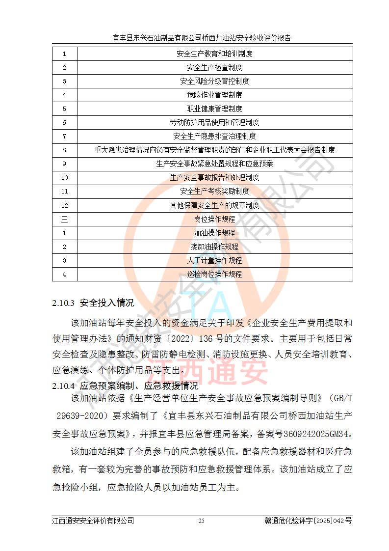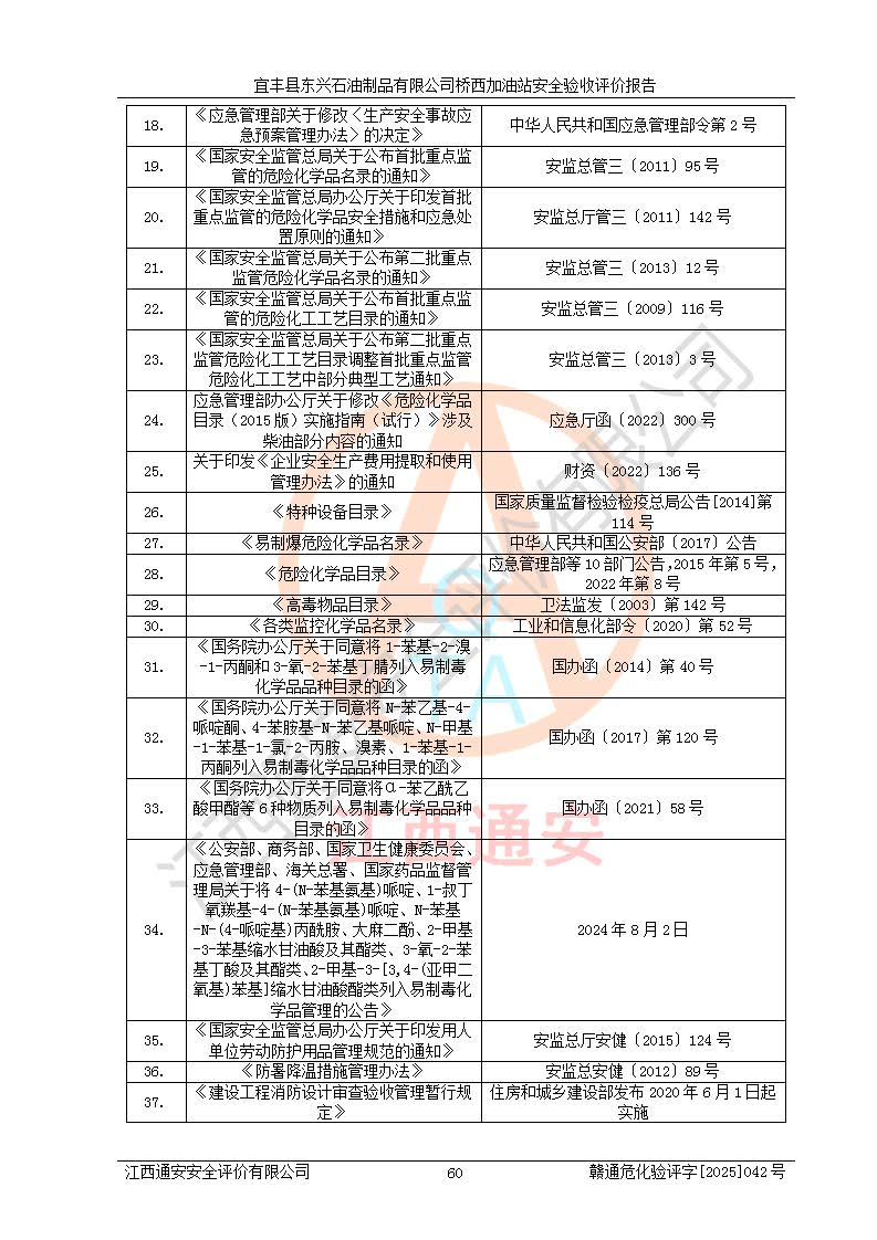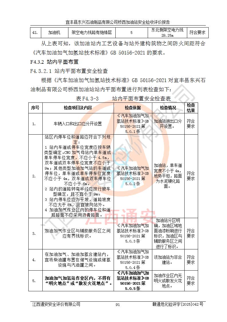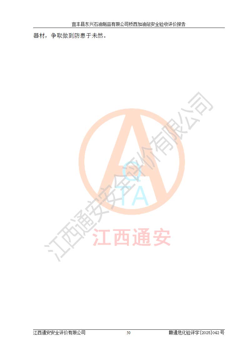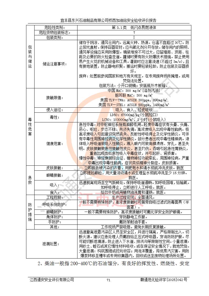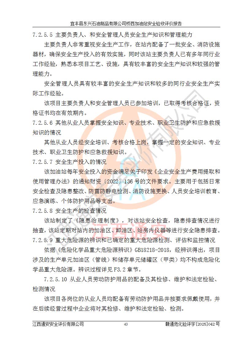 其它 | 一、安全状况综合评述 宜丰县东兴石油制品有限公司桥西加油站位于宜春市宜丰县桥西乡,从事成品油(汽油、柴油)零售业务,属二级加油站。 通过对该加油站建设项目安全验收评价,得出以下评价结论: 化学品、设备及工艺辨识结果 经辨识,该加油站经营、储存危险化学品为汽油和柴油,其中汽油属于重点监管危险化学品、特别管控危险化学品;该加油站不涉及剧毒化学品、高毒物品、易制毒化学品、监控化学品、易制爆化学品。经营、储存过程中采用的设备及工艺不属于淘汰落后设备及工艺、不涉及危险化工工艺,生产和储存单元均不构成危险化学品重大危险源。 建设项目所在地的安全条件和周边的安全间距 该站东南侧临354国道,北侧、西侧、东侧为居民建筑,加油站为二级加油站,设有油气回收系统,站外50米范围内无重要公共建筑物、明火设备和甲、乙类生产及储存设施,站区内加油设施与周边建构筑物之间的距离能够满足《汽车加油加气加氢站技术标准》GB50156-2021 和《建筑设计防火规范》GB50016-2014(2018 年版)以及相关**规范要求。本报告认为该加油站建设项目周边对加油站的影响以及建设项目所在地的自然条件对建设项目投入使用后的影响均较小,该加油站具备标准规范所要求的安全条件。 该项目安全设计诊断报告的采纳情况 该加油站安全设计诊断报告核查的问题(共15项)及整改建议均已采纳,经评价组现场复核,均已整改完成。 该项目调试中表现出的技术、工艺和装置、设备(设施)的安全、 可靠性和安全水平。 该加油站整改过程工作进展顺利,处于正常状态。经查阅资料和分析评价,认为本项目技术、工艺和装置、设备(设施)的安全、可靠性和安全水平符合**相应安全标准的要求。 该加油站储存经营的汽油属于重点监管的危险化学品和特别管控危险化学品,该加油站在后续的经营中应按照相关规范和要求加强安全管理,要求油品运输单位强化运输管理、自身加强储存定制化管理。 该加油站经营过程中存在的危险有害因素为:①火灾、爆炸;② 中毒和窒息;③**伤害;④触电;⑤高处坠落;⑥物体打击、⑦其他伤害。 其中火灾、爆炸是主要的危险、有害因素,加油站埋地储罐区、加油区、卸 油区是主要的危险源。 (7)经采用作业条件危险性评价法(LEC)进行分析,该加油站的作业条件相对比较安全。在选定的加油作业、卸油作业、维修作业、配电作业等4个单元中均为“一般危险、需要注意”作业环境,且一般危险作业环境的出现均由物料的危险程度所决定,作业条件相对安全。 (8)采用危险度评价法分析,油罐区主要危险物质为汽油和柴油,常温、常压下储存。储罐区汽油罐为Ⅰ级,属**危险;柴油罐得分为为Ⅲ级,属低度危险。油罐采用双层罐埋地设置,按要求设置了通气管,并装设了阻火器;设置了液位监测报警系统和紧急切断系统,埋地加油管道设置双层管道,其安全风险可控。 (9)采用检查表评价法对该加油站站址选择、总平面布置、加油工艺及设施、消防设施和给排水、电气与报警和紧急切断系统等进行检查分析,经整改后,该加油站涉及的强制条款和其他项均符合要求。该加油站设置了消防安全设施、防雷防静电设施、液位监测措施、油罐泄漏检测措施、电气防爆措施等安全防护设施,取得了消防验收意见书和防雷检测合格报告,符合**法律法规、标准规范的要求。该加油站公用工程能够满足安全经营的基本需要,符合安全经营的条件。 (10)该加油站相关证照齐全,成立了安全生产**小组,配备了安全管理人员,制定了安全管理制度、操作规程和事故应急预案,加油站的安全管理机构工作有力,加油站安全经营管理处于正常有序开展范围。 (11)对宜丰县东兴石油制品有限公司桥西加油站存在重大生产安全事故隐患进行判定,检查结果为该加油站不存在重大生产安全事故隐患。 总体评价结论:宜丰县东兴石油制品有限公司桥西加油站认真落实并合理采纳安全设计诊断报告中的安全对策、措施及建议,现场与安全设施设计单位重新绘制的现状总平面布置图一致,安全设计诊断报告提出的安全对策措施已落实到位。对潜在的危险、 有害因素采取了安全对策措施,工程潜在的危险、有害因素可得到**控制, 风险在**控制和可接受范围内。