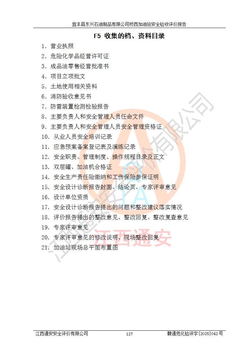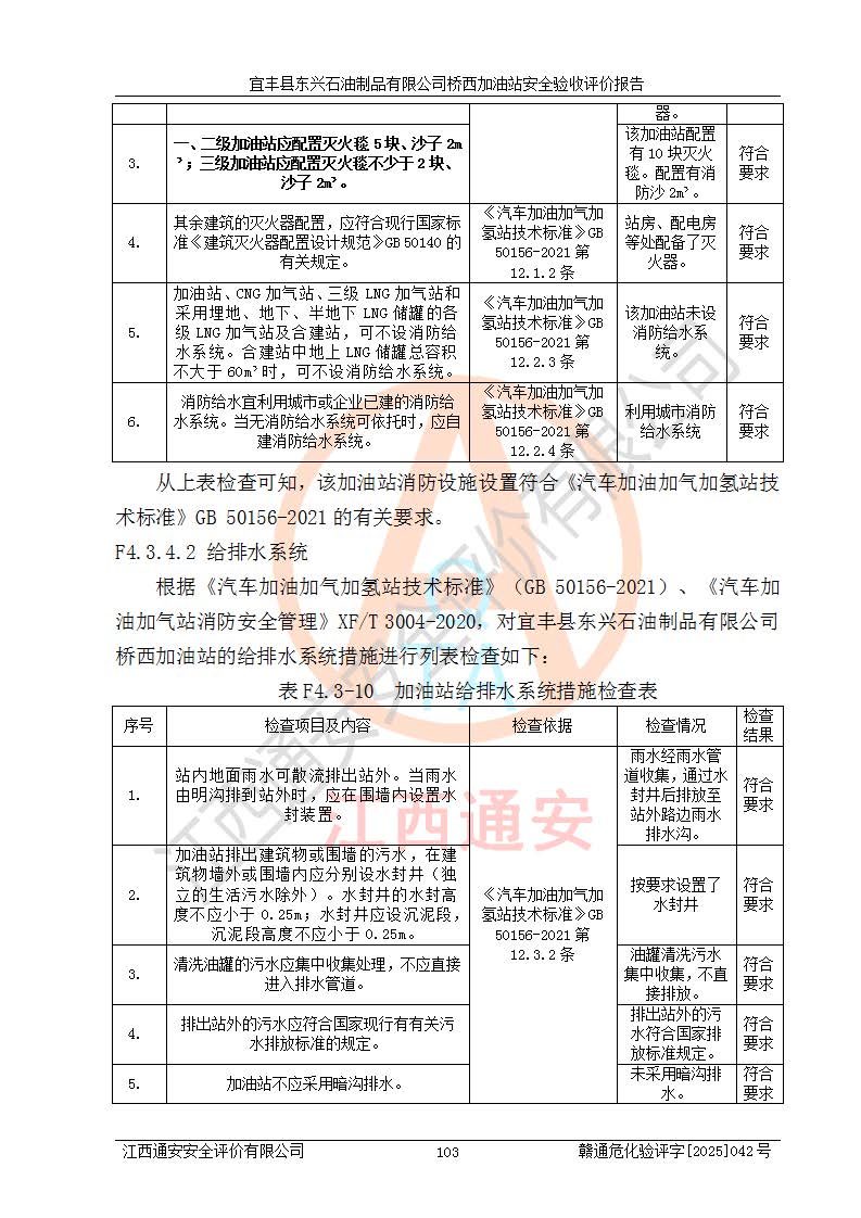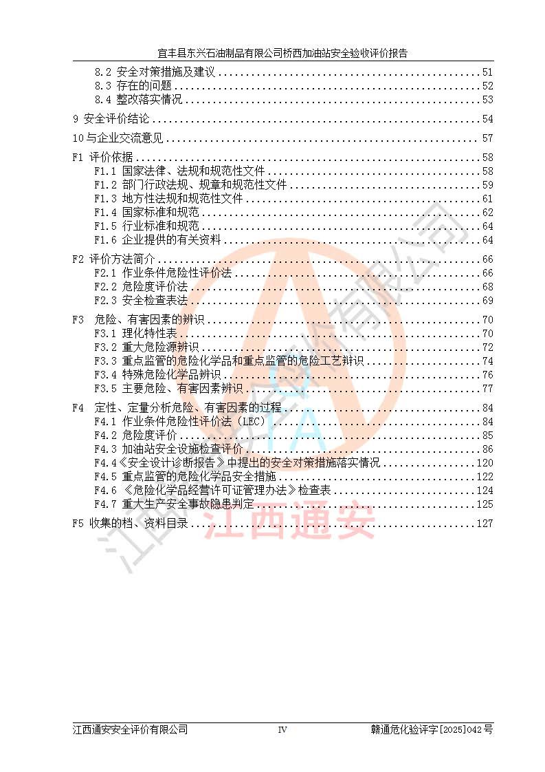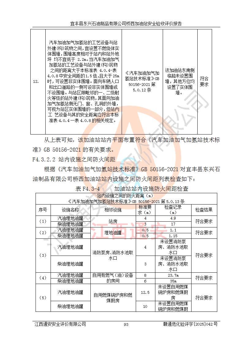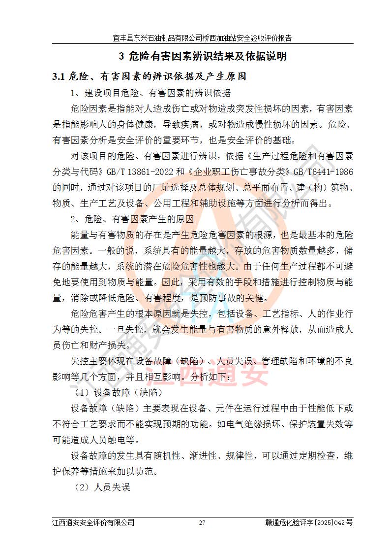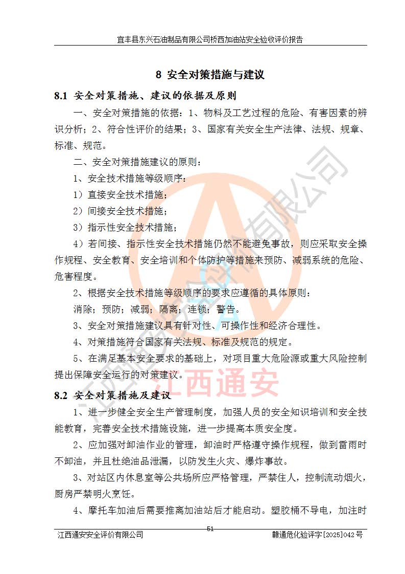 其它 | 一、安全状况综合评述 宜丰县东兴石油制品有限公司桥西加油站位于宜春市宜丰县桥西乡,从事成品油(汽油、柴油)零售业务,属二级加油站。 通过对该加油站建设项目安全验收评价,得出以下评价结论: 化学品、设备及工艺辨识结果 经辨识,该加油站经营、储存危险化学品为汽油和柴油,其中汽油属于重点监管危险化学品、特别管控危险化学品;该加油站不涉及剧毒化学品、高毒物品、易制毒化学品、监控化学品、易制爆化学品。经营、储存过程中采用的设备及工艺不属于淘汰落后设备及工艺、不涉及危险化工工艺,生产和储存单元均不构成危险化学品重大危险源。 建设项目所在地的安全条件和周边的安全间距 该站东南侧临354国道,北侧、西侧、东侧为居民建筑,加油站为二级加油站,设有油气回收系统,站外50米范围内无重要公共建筑物、明火设备和甲、乙类生产及储存设施,站区内加油设施与周边建构筑物之间的距离能够满足《汽车加油加气加氢站技术标准》GB50156-2021 和《建筑设计防火规范》GB50016-2014(2018 年版)以及相关**规范要求。本报告认为该加油站建设项目周边对加油站的影响以及建设项目所在地的自然条件对建设项目投入使用后的影响均较小,该加油站具备标准规范所要求的安全条件。 该项目安全设计诊断报告的采纳情况 该加油站安全设计诊断报告核查的问题(共15项)及整改建议均已采纳,经评价组现场复核,均已整改完成。 该项目调试中表现出的技术、工艺和装置、设备(设施)的安全、 可靠性和安全水平。 该加油站整改过程工作进展顺利,处于正常状态。经查阅资料和分析评价,认为本项目技术、工艺和装置、设备(设施)的安全、可靠性和安全水平符合**相应安全标准的要求。 该加油站储存经营的汽油属于重点监管的危险化学品和特别管控危险化学品,该加油站在后续的经营中应按照相关规范和要求加强安全管理,要求油品运输单位强化运输管理、自身加强储存定制化管理。 该加油站经营过程中存在的危险有害因素为:①火灾、爆炸;② 中毒和窒息;③**伤害;④触电;⑤高处坠落;⑥物体打击、⑦其他伤害。 其中火灾、爆炸是主要的危险、有害因素,加油站埋地储罐区、加油区、卸 油区是主要的危险源。 (7)经采用作业条件危险性评价法(LEC)进行分析,该加油站的作业条件相对比较安全。在选定的加油作业、卸油作业、维修作业、配电作业等4个单元中均为“一般危险、需要注意”作业环境,且一般危险作业环境的出现均由物料的危险程度所决定,作业条件相对安全。 (8)采用危险度评价法分析,油罐区主要危险物质为汽油和柴油,常温、常压下储存。储罐区汽油罐为Ⅰ级,属**危险;柴油罐得分为为Ⅲ级,属低度危险。油罐采用双层罐埋地设置,按要求设置了通气管,并装设了阻火器;设置了液位监测报警系统和紧急切断系统,埋地加油管道设置双层管道,其安全风险可控。 (9)采用检查表评价法对该加油站站址选择、总平面布置、加油工艺及设施、消防设施和给排水、电气与报警和紧急切断系统等进行检查分析,经整改后,该加油站涉及的强制条款和其他项均符合要求。该加油站设置了消防安全设施、防雷防静电设施、液位监测措施、油罐泄漏检测措施、电气防爆措施等安全防护设施,取得了消防验收意见书和防雷检测合格报告,符合**法律法规、标准规范的要求。该加油站公用工程能够满足安全经营的基本需要,符合安全经营的条件。 (10)该加油站相关证照齐全,成立了安全生产**小组,配备了安全管理人员,制定了安全管理制度、操作规程和事故应急预案,加油站的安全管理机构工作有力,加油站安全经营管理处于正常有序开展范围。 (11)对宜丰县东兴石油制品有限公司桥西加油站存在重大生产安全事故隐患进行判定,检查结果为该加油站不存在重大生产安全事故隐患。 总体评价结论:宜丰县东兴石油制品有限公司桥西加油站认真落实并合理采纳安全设计诊断报告中的安全对策、措施及建议,现场与安全设施设计单位重新绘制的现状总平面布置图一致,安全设计诊断报告提出的安全对策措施已落实到位。对潜在的危险、 有害因素采取了安全对策措施,工程潜在的危险、有害因素可得到**控制, 风险在**控制和可接受范围内。
