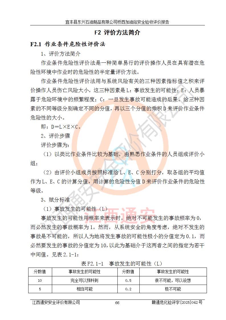 主要任务 | 本评价报告主要针对评价范围内汽油、柴油储存经营过程所涉及的危险、有害因素及重大危险源等进行辨识与分析,根据相应法律、法规、标准的要求检查安全设施的配置及相关检测检验情况及其符合性,检查公用工程及辅助设施的配套性,审核安全生产管理机构、制度、人员培训、设备管理、操作规程、应急预案及劳动防护用品的配备等,对该项目安全设施及安全措施进行符合性评价,并在此基础上提出相应的安全对策措施及建议。 | ||||
