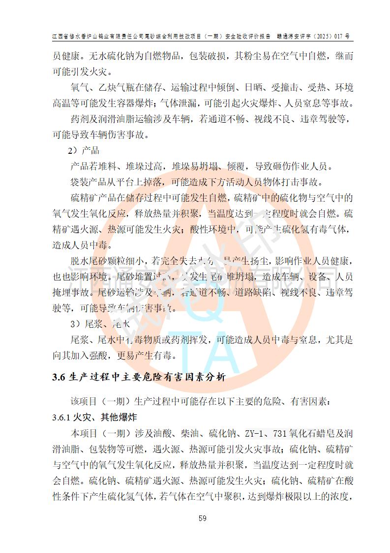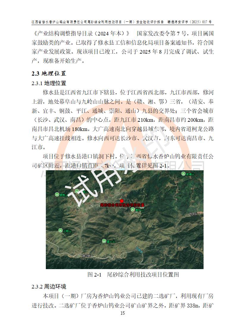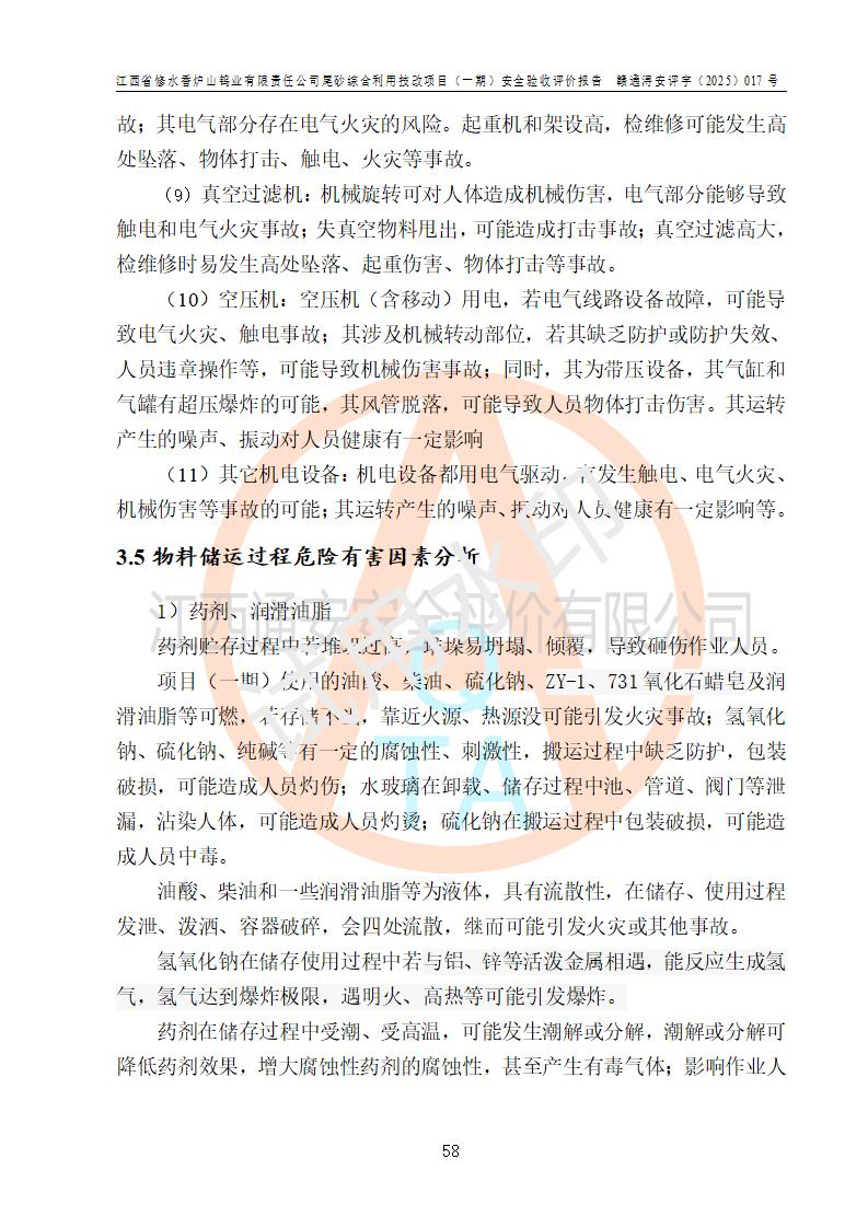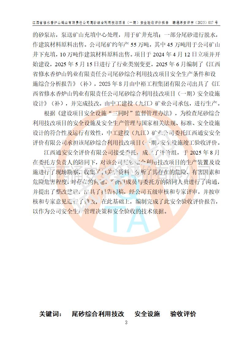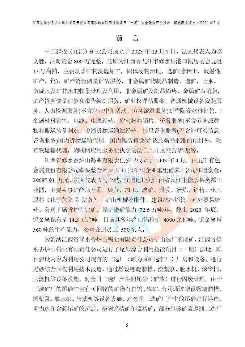 项目简介 | 江西省修水香炉山钨业有限责任公司成立于2003年4月,由五矿有色金属股份有限公司牵头整合香炉山11家矿山企业重组而来。公司注册资金:29687.93 万元,法人**人为李靖,注册地址为江西省九江市修水县吴都工业园,主要从事矿产品开采、经营、加工、选矿、研发、冶炼、销售,化工原料(化学危险品 除外)、矿山机械及配件、建筑材料销售,对外贸易经营。公司下属香炉山钨矿,原矿采矿能力 72.6万吨/年,截止 2023 年底,钨金属保有量14.3万余吨,目前具备年产白钨精矿4000余标吨、铜金属量360吨的生产能力,公司在册员工 500余人。 为消纳江西省修水香炉山钨业有限责任公司矿山选厂的尾矿,江西省修水香炉山钨业有限责任公司进行了尾砂综合利用技改项目(一期)建设,项目建设内容为利用公司现有的二选厂(原为原矿选矿厂)厂房和设备,进行尾砂综合回收利用技术改造,通过增设螺旋溜槽、渣浆泵、脱水机、浓密桶、压滤机等设备设施,对公司三选厂产生的尾砂(矿浆)进行固废处理。由于三选矿厂的尾砂中含有可回收的矿物有白钨、硫矿,公司通过增设螺旋溜槽、渣浆泵、脱水机、压滤机等设备设施,对公司三选矿厂产生的尾砂进行浮选、重力选和含硫尾矿的沉淀,得到钨精矿和硫精矿;部分尾砂矿浆返回三选厂的砂泵站,泵送矿山充填中心处理,用于矿井充填;一部分尾砂进行脱水,作建筑材料原料出售。公司尾矿约年产55万吨,其中45万吨用于公司矿山井下充填,10万吨作建筑材料原料出售。项目于2024年4月12日立项并开始建设,2025年5月15日进行了行业类别变更,2025年6月编制了《江西省修水香炉山钨业有限责任公司尾砂综合利用技改项目安全生产条件和设施综合分析报告》(补),2025年8月由中裕工程集团有限公司出具了《江西省修水香炉山钨业有限责任公司尾砂综合利用技改项目(一期)安全设施设计》(补),并完成技改。由中工建投(九江)矿业公司承包,进行生产。 中工建投(九江)矿业公司成立于2023年12月7日,法人**人为李文胜,注册资金800万元整,住所为江西省九江市修水县港口镇居委会五组13号商铺,主要从事矿物洗选加工,固体废物治理,选矿(除稀土、放射性矿产、钨)、矿产资源储量评估服务,非金属矿物制品制造,选矿,雨水、微咸水及矿井水的收集处理及利用,非金属矿及制品销售,金属矿石销售,矿产资源储量估算和报告编制服务,矿业权评估服务,普通机械设备安装服务,人力资源服务(不含职业中介活动、劳务派遣服务)新型陶瓷材料销售,!金属材料销售,电线、电缆经营,耐火材料销售,劳务服务(不含劳务派遣物料搬运装备制造,道路货物运输站经营,信息咨询服务(不含许可类信息咨询服务)**货物运输代理,**集装箱货(除依法须经批准的项目外,凭营物运输代理,物联网应用服务业执照依法自主开展经营活动)等。 | |||||
