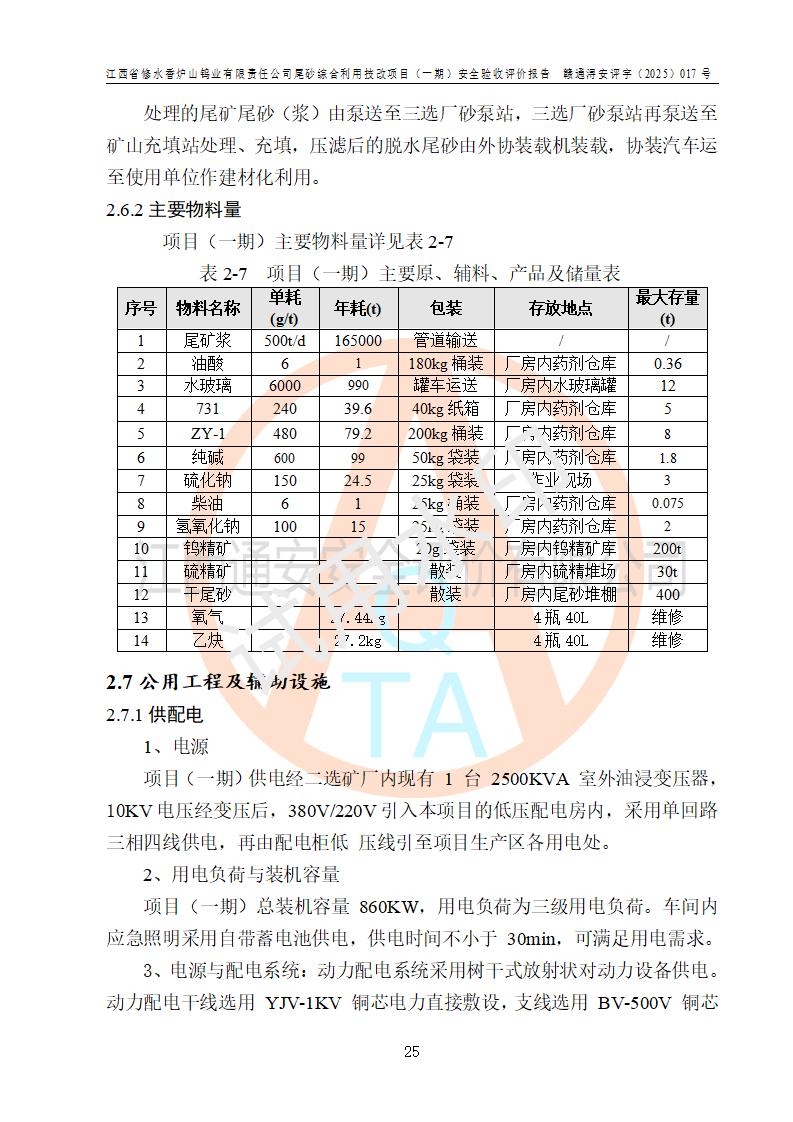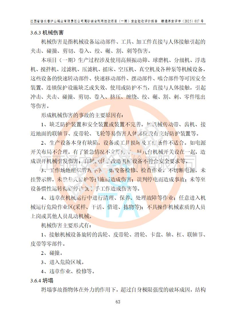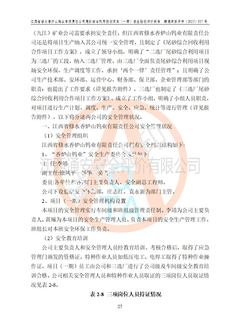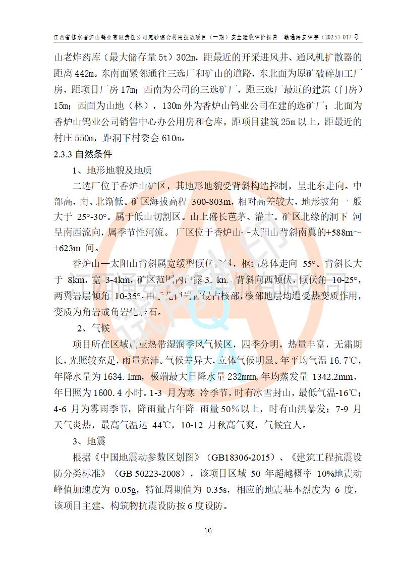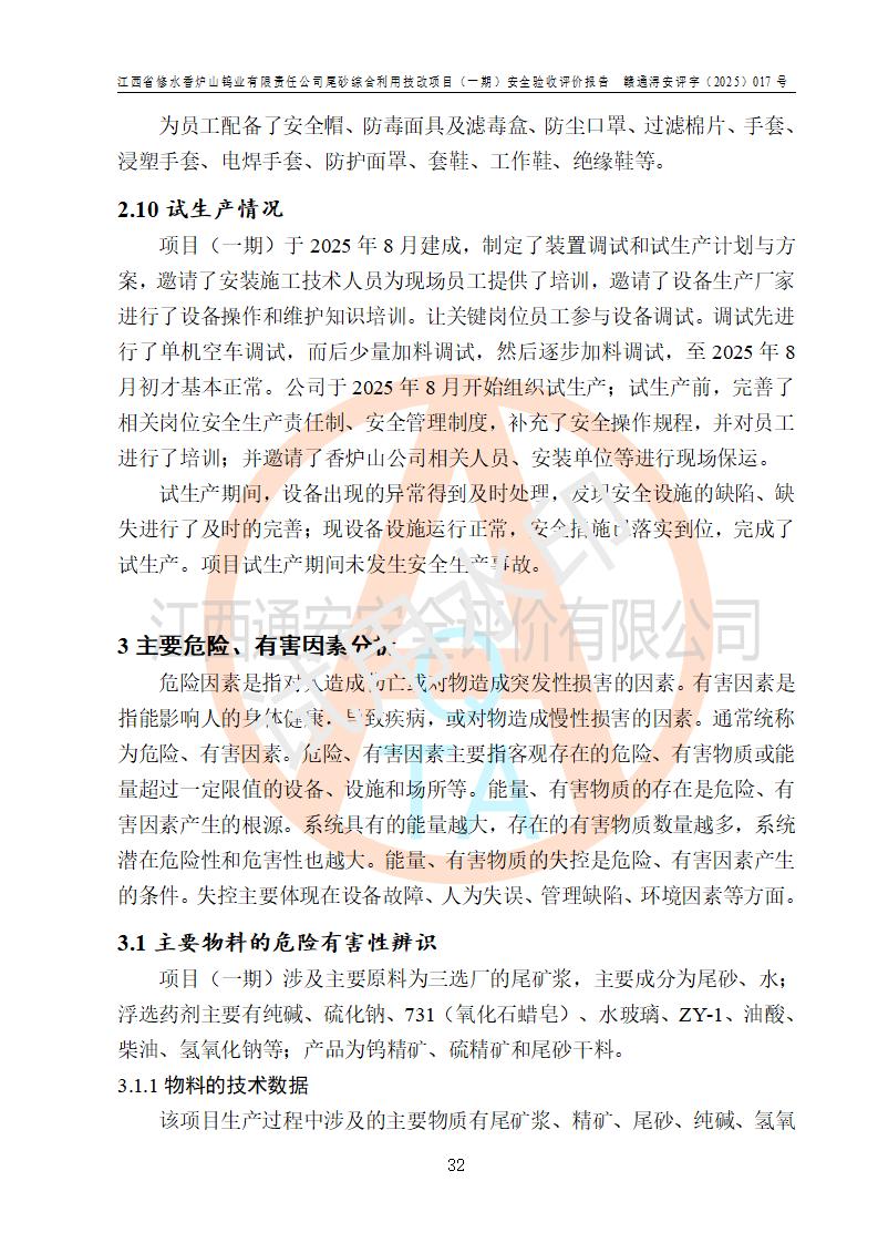 项目简介 | 江西省修水香炉山钨业有限责任公司成立于2003年4月,由五矿有色金属股份有限公司牵头整合香炉山11家矿山企业重组而来。公司注册资金:29687.93 万元,法人**人为李靖,注册地址为江西省九江市修水县吴都工业园,主要从事矿产品开采、经营、加工、选矿、研发、冶炼、销售,化工原料(化学危险品 除外)、矿山机械及配件、建筑材料销售,对外贸易经营。公司下属香炉山钨矿,原矿采矿能力 72.6万吨/年,截止 2023 年底,钨金属保有量14.3万余吨,目前具备年产白钨精矿4000余标吨、铜金属量360吨的生产能力,公司在册员工 500余人。 为消纳江西省修水香炉山钨业有限责任公司矿山选厂的尾矿,江西省修水香炉山钨业有限责任公司进行了尾砂综合利用技改项目(一期)建设,项目建设内容为利用公司现有的二选厂(原为原矿选矿厂)厂房和设备,进行尾砂综合回收利用技术改造,通过增设螺旋溜槽、渣浆泵、脱水机、浓密桶、压滤机等设备设施,对公司三选厂产生的尾砂(矿浆)进行固废处理。由于三选矿厂的尾砂中含有可回收的矿物有白钨、硫矿,公司通过增设螺旋溜槽、渣浆泵、脱水机、压滤机等设备设施,对公司三选矿厂产生的尾砂进行浮选、重力选和含硫尾矿的沉淀,得到钨精矿和硫精矿;部分尾砂矿浆返回三选厂的砂泵站,泵送矿山充填中心处理,用于矿井充填;一部分尾砂进行脱水,作建筑材料原料出售。公司尾矿约年产55万吨,其中45万吨用于公司矿山井下充填,10万吨作建筑材料原料出售。项目于2024年4月12日立项并开始建设,2025年5月15日进行了行业类别变更,2025年6月编制了《江西省修水香炉山钨业有限责任公司尾砂综合利用技改项目安全生产条件和设施综合分析报告》(补),2025年8月由中裕工程集团有限公司出具了《江西省修水香炉山钨业有限责任公司尾砂综合利用技改项目(一期)安全设施设计》(补),并完成技改。由中工建投(九江)矿业公司承包,进行生产。 中工建投(九江)矿业公司成立于2023年12月7日,法人**人为李文胜,注册资金800万元整,住所为江西省九江市修水县港口镇居委会五组13号商铺,主要从事矿物洗选加工,固体废物治理,选矿(除稀土、放射性矿产、钨)、矿产资源储量评估服务,非金属矿物制品制造,选矿,雨水、微咸水及矿井水的收集处理及利用,非金属矿及制品销售,金属矿石销售,矿产资源储量估算和报告编制服务,矿业权评估服务,普通机械设备安装服务,人力资源服务(不含职业中介活动、劳务派遣服务)新型陶瓷材料销售,!金属材料销售,电线、电缆经营,耐火材料销售,劳务服务(不含劳务派遣物料搬运装备制造,道路货物运输站经营,信息咨询服务(不含许可类信息咨询服务)**货物运输代理,**集装箱货(除依法须经批准的项目外,凭营物运输代理,物联网应用服务业执照依法自主开展经营活动)等。 | |||||