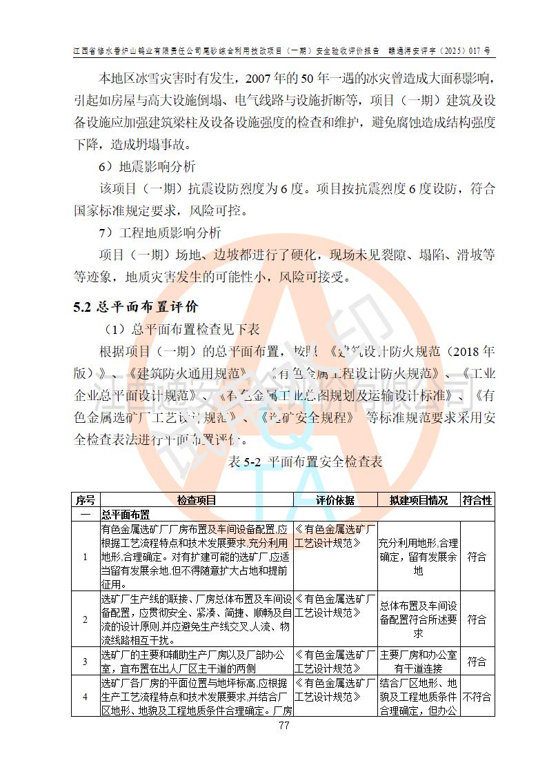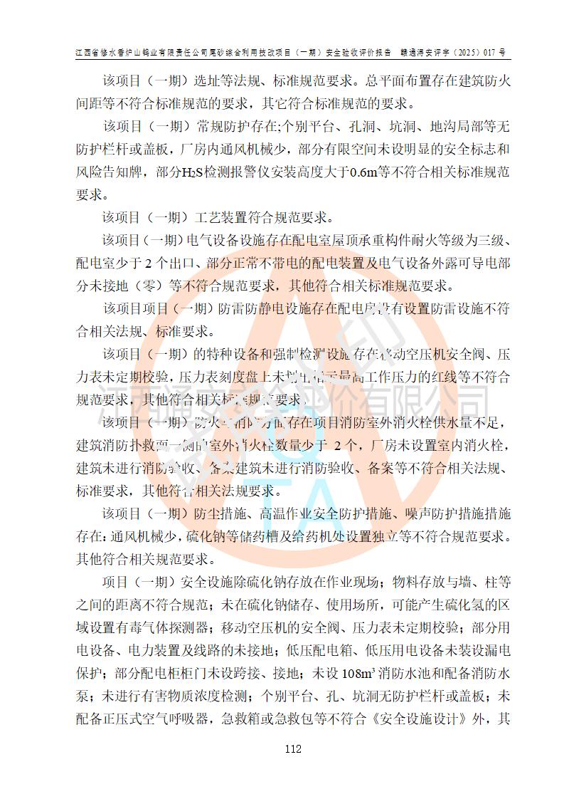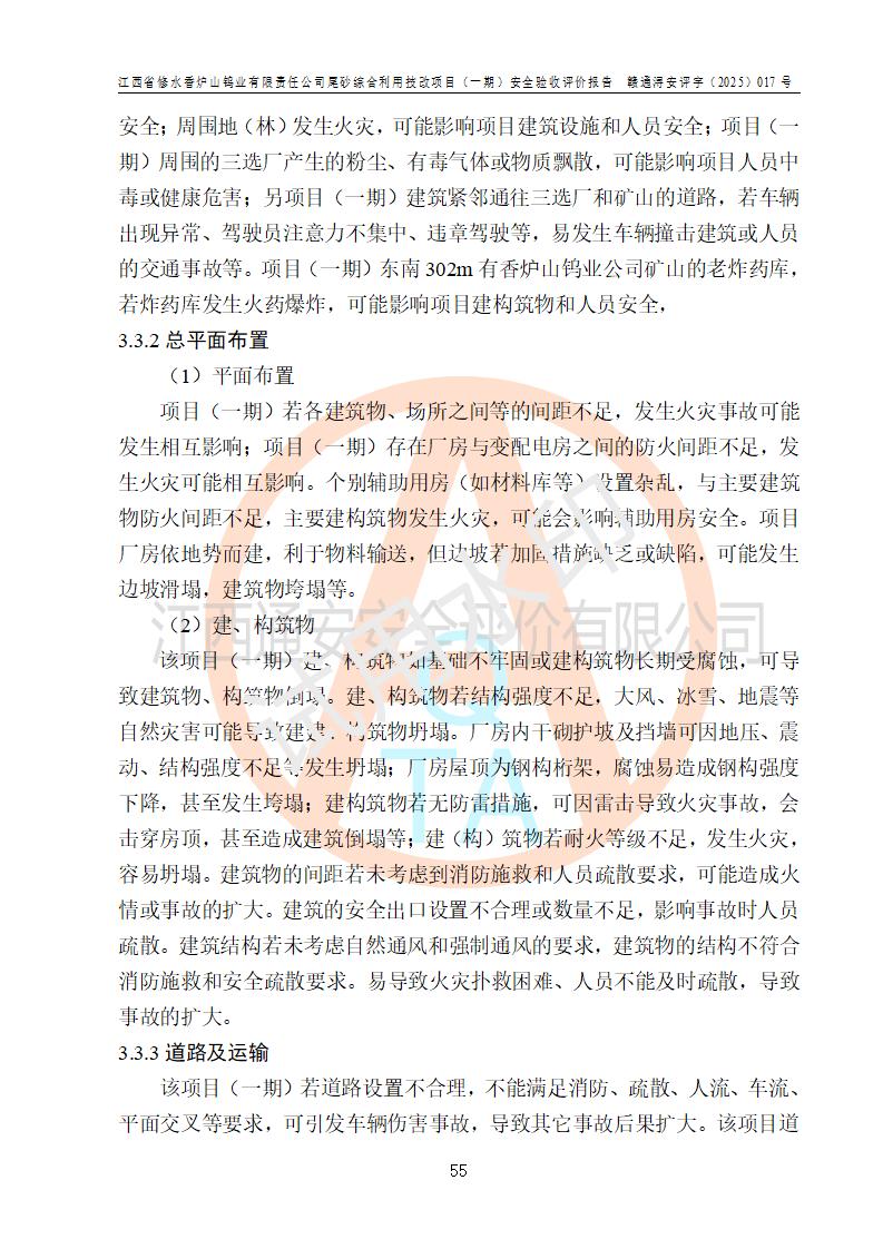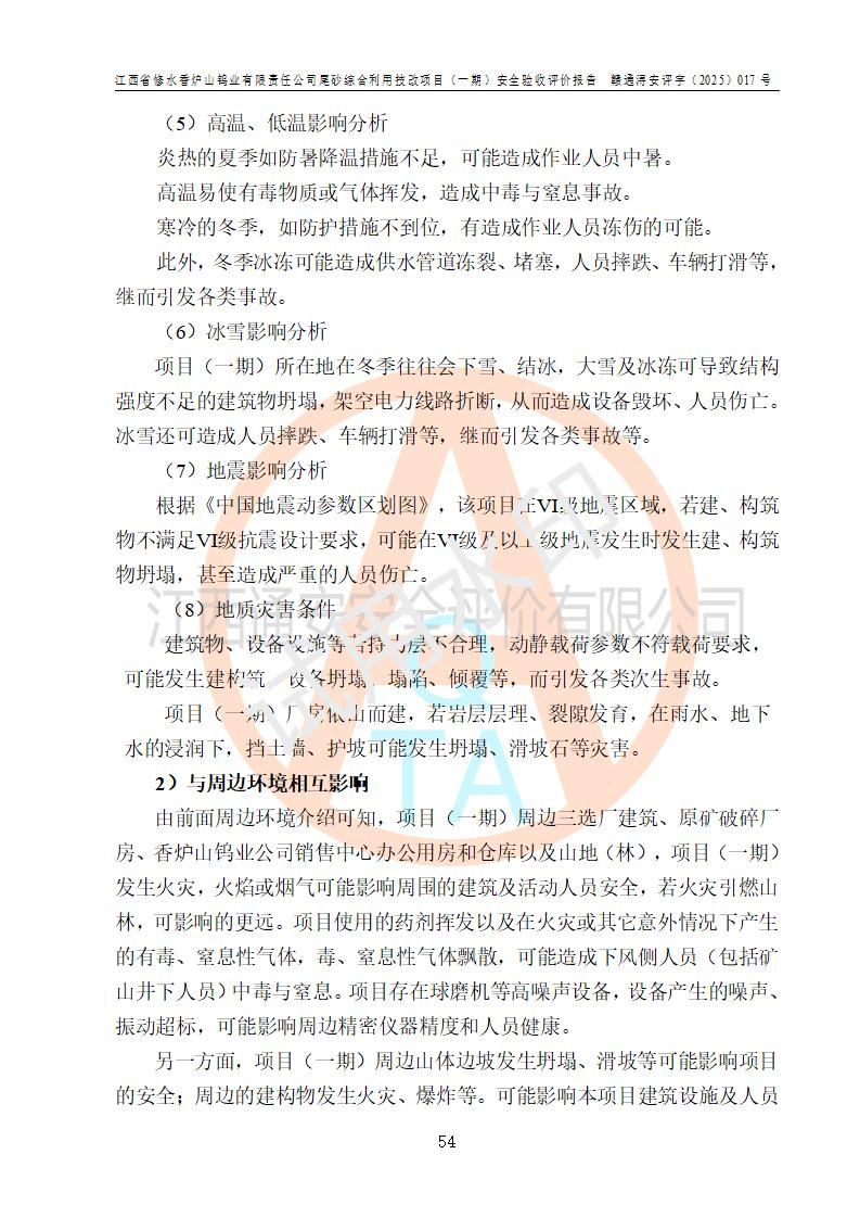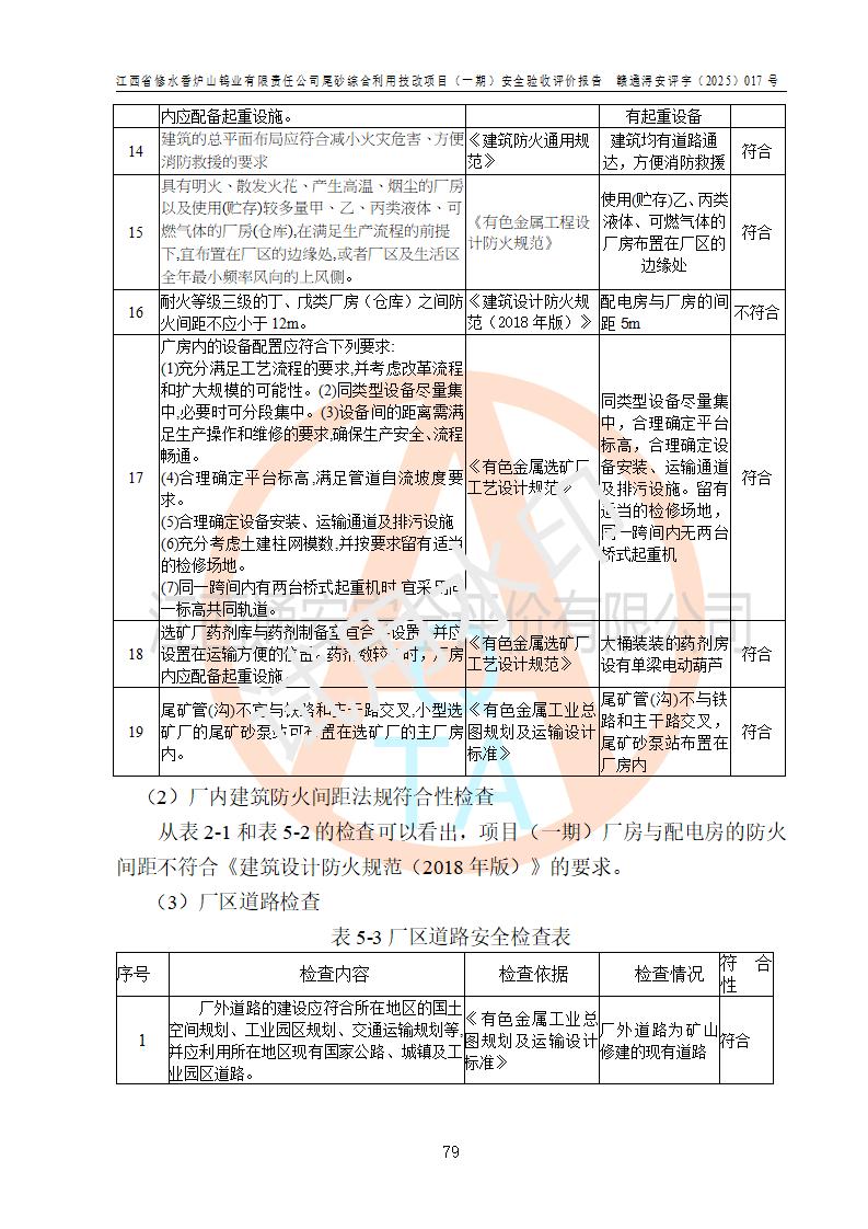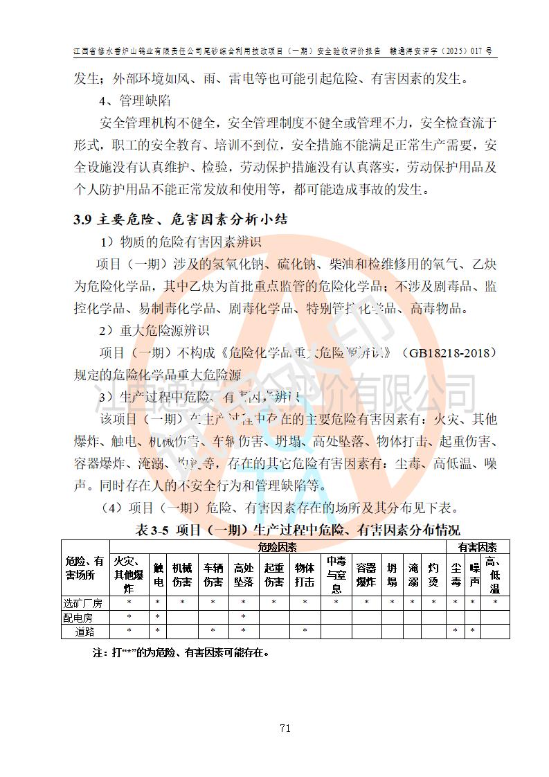 评价结论 | 总体结论:江西省修水香炉山钨业有限责任公司尾砂综合利用技改项目(一期)的选址符合有关法规、标准要求,周边环境符合有关法规、标准要求,平面布置防火间距不足,工艺过程及设备设施总体达到了《安全设施设计》和**法规、标准规定要求,其生产过程中存在的主要危险有害因素火灾、其他爆炸、触电、机械伤害、**伤害、坍塌、高处坠落、物体打击、起重伤害、中毒与窒息、淹溺、灼烫、尘毒、高温与低温、噪声等落实本报告提出的对策措施,风险可控,可以满足安全生产要求,具备竣工安全验收的条件。但企业应进一步完成和落实本报告的对策措施和建议。 | |||||