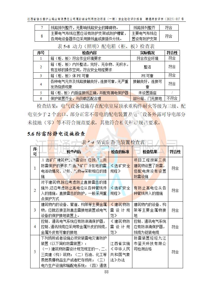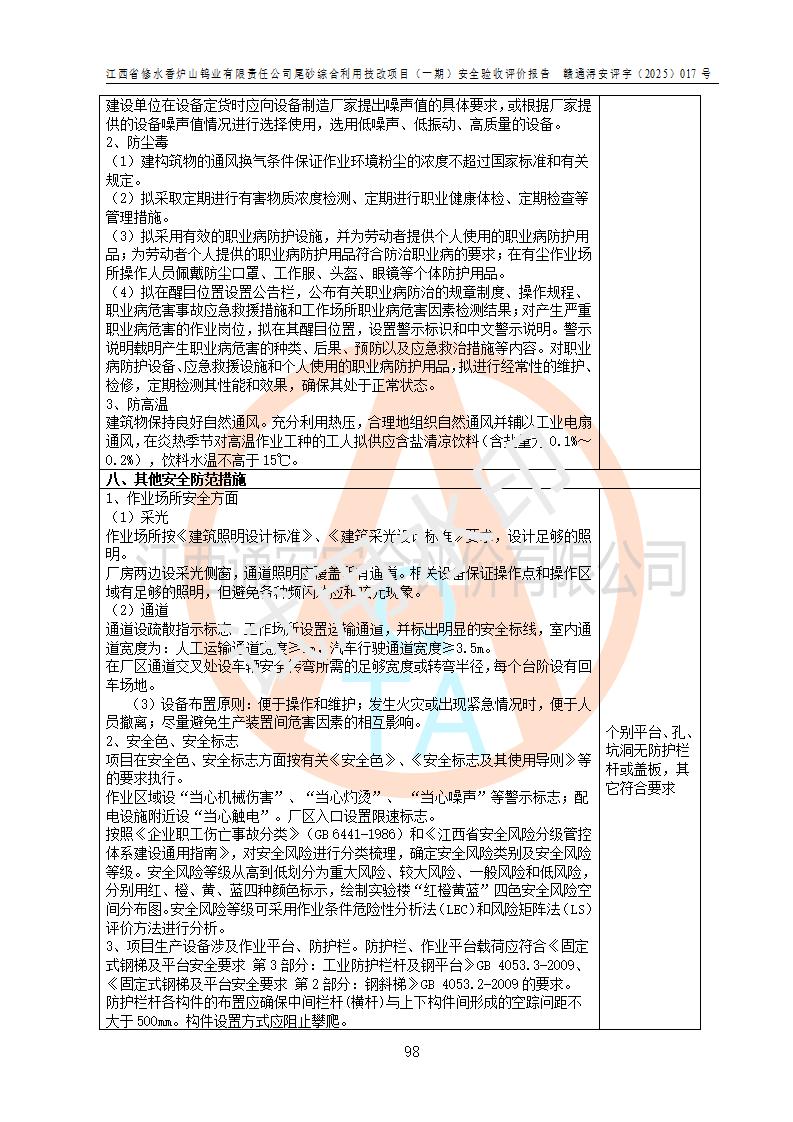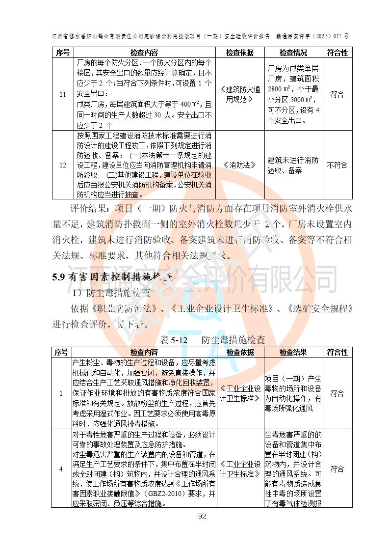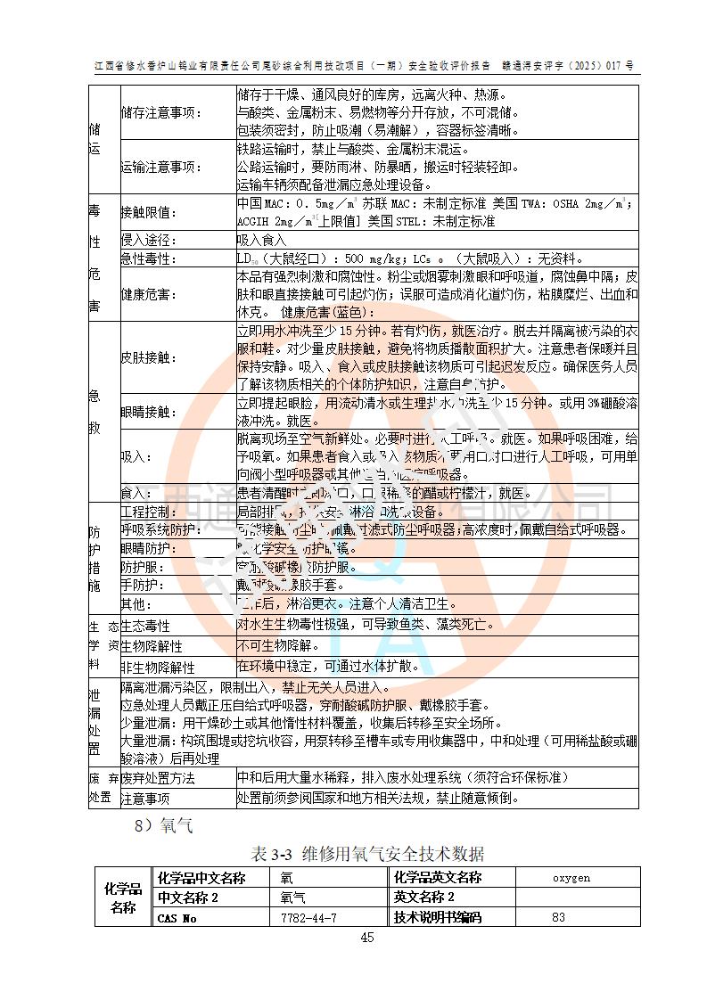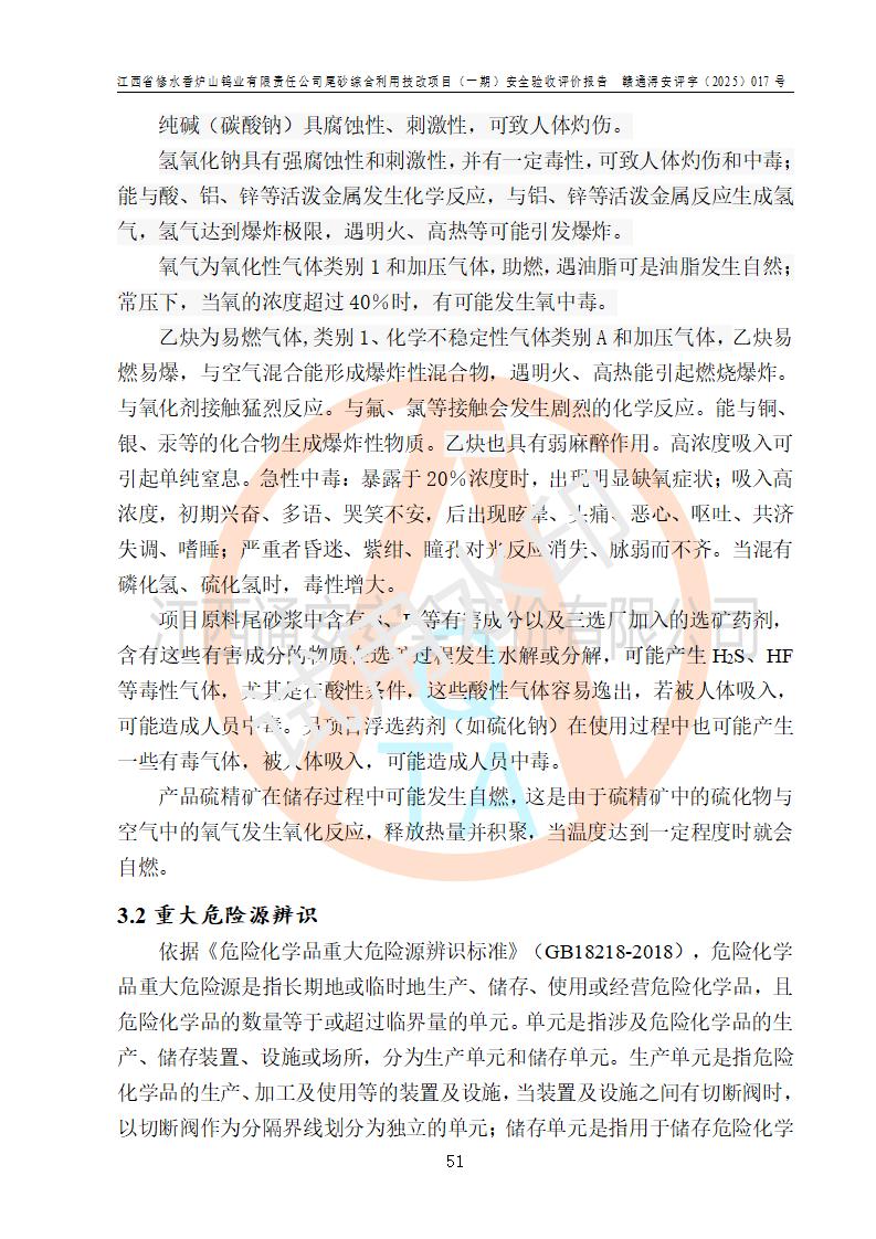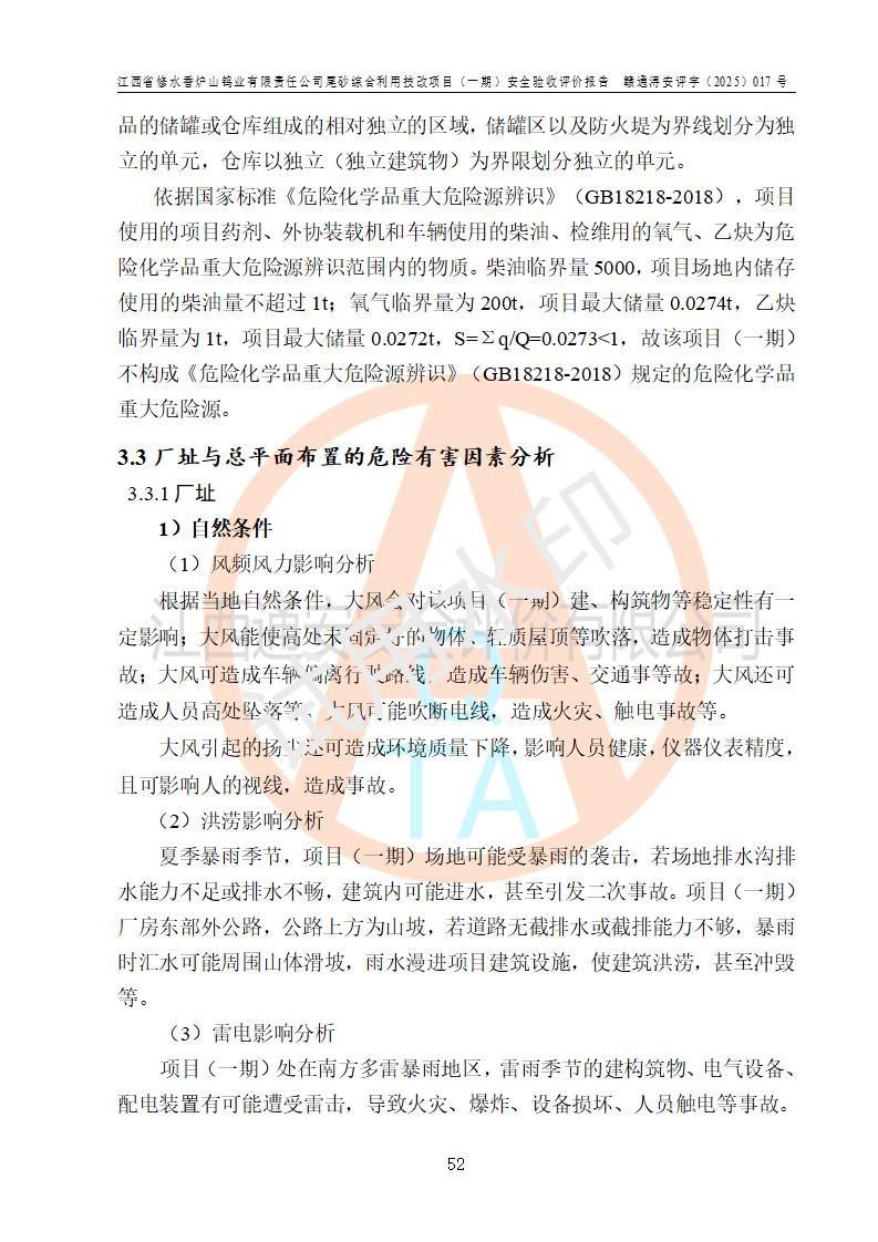 评价结论 | 总体结论:江西省修水香炉山钨业有限责任公司尾砂综合利用技改项目(一期)的选址符合有关法规、标准要求,周边环境符合有关法规、标准要求,平面布置防火间距不足,工艺过程及设备设施总体达到了《安全设施设计》和**法规、标准规定要求,其生产过程中存在的主要危险有害因素火灾、其他爆炸、触电、机械伤害、**伤害、坍塌、高处坠落、物体打击、起重伤害、中毒与窒息、淹溺、灼烫、尘毒、高温与低温、噪声等落实本报告提出的对策措施,风险可控,可以满足安全生产要求,具备竣工安全验收的条件。但企业应进一步完成和落实本报告的对策措施和建议。 | |||||