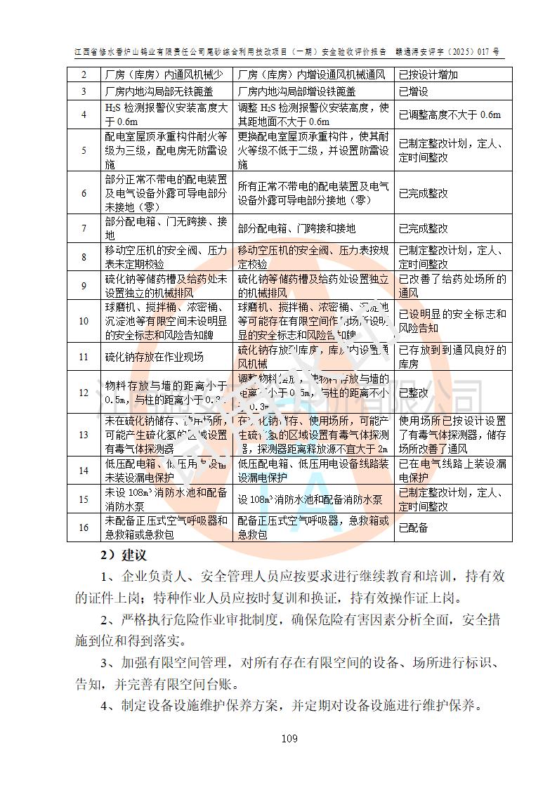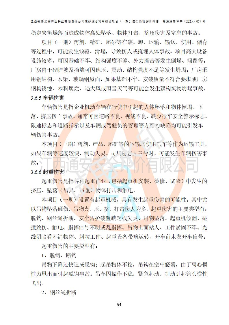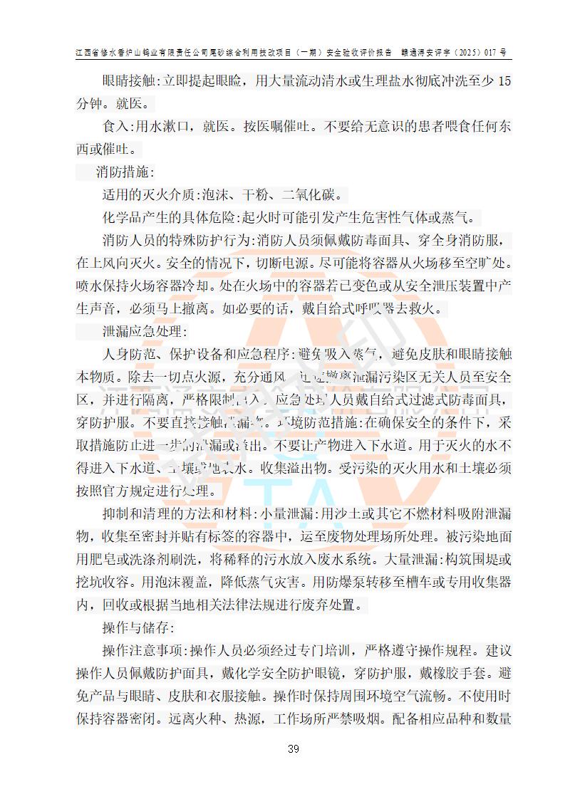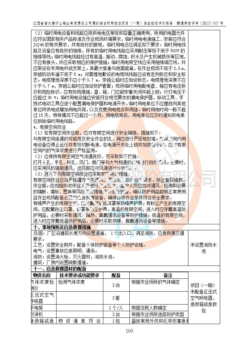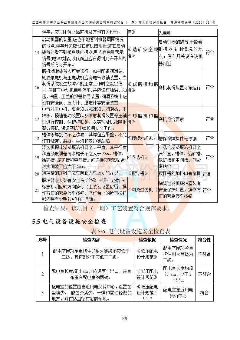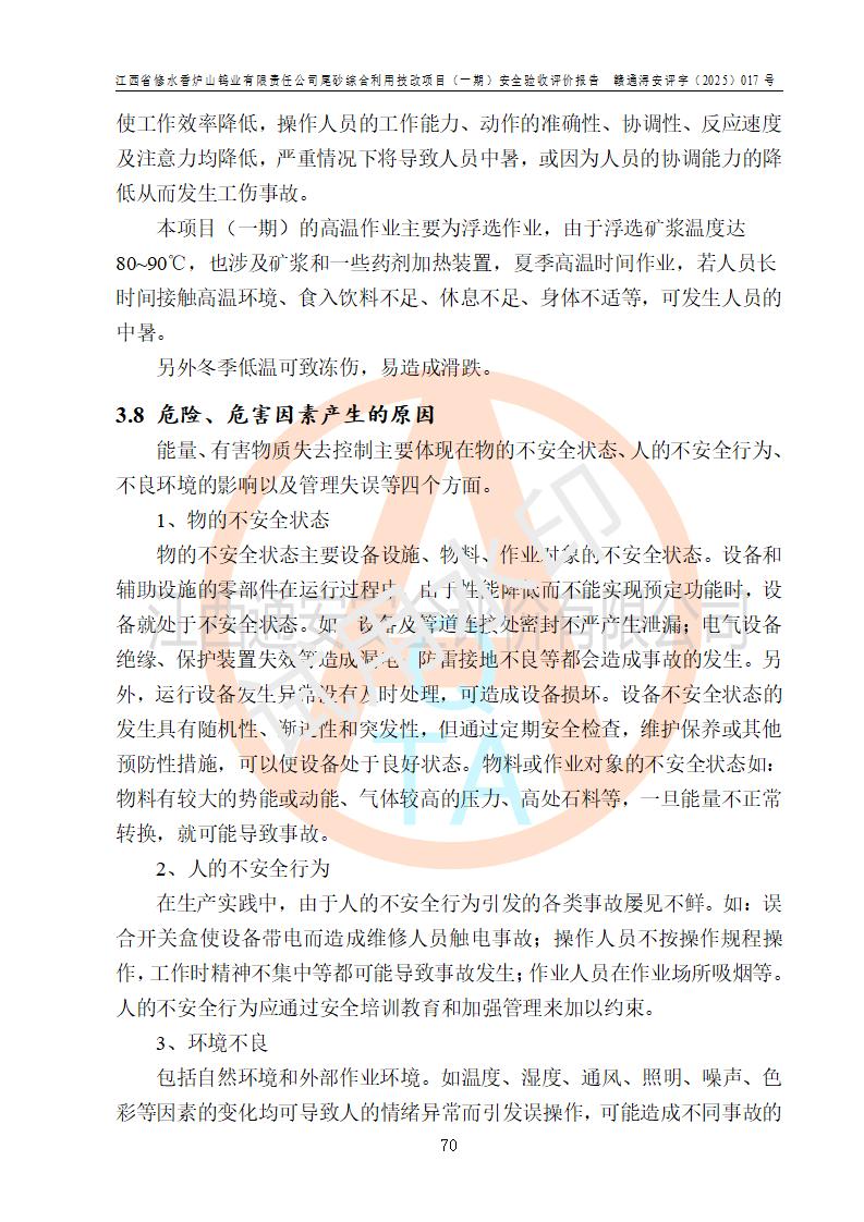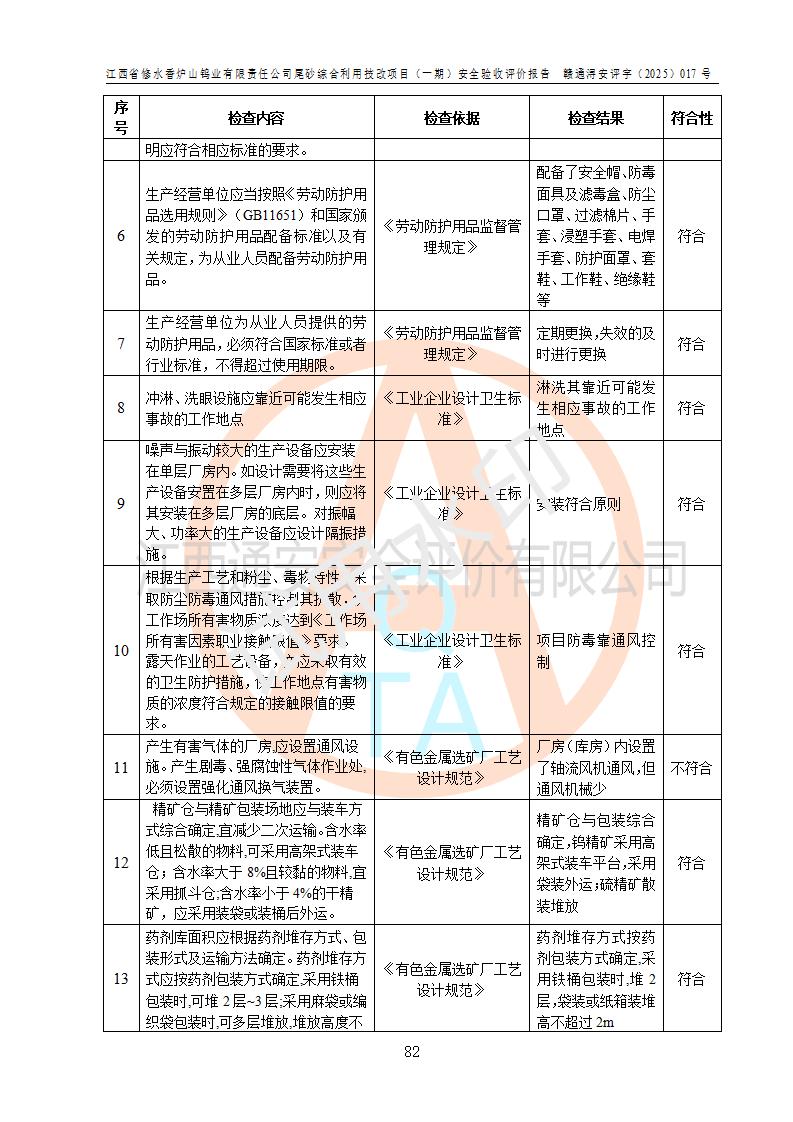 评价结论 | 总体结论:江西省修水香炉山钨业有限责任公司尾砂综合利用技改项目(一期)的选址符合有关法规、标准要求,周边环境符合有关法规、标准要求,平面布置防火间距不足,工艺过程及设备设施总体达到了《安全设施设计》和**法规、标准规定要求,其生产过程中存在的主要危险有害因素火灾、其他爆炸、触电、机械伤害、**伤害、坍塌、高处坠落、物体打击、起重伤害、中毒与窒息、淹溺、灼烫、尘毒、高温与低温、噪声等落实本报告提出的对策措施,风险可控,可以满足安全生产要求,具备竣工安全验收的条件。但企业应进一步完成和落实本报告的对策措施和建议。 | |||||