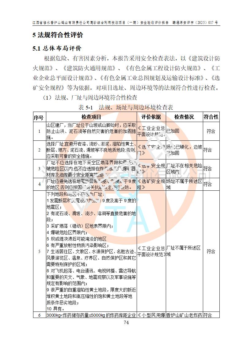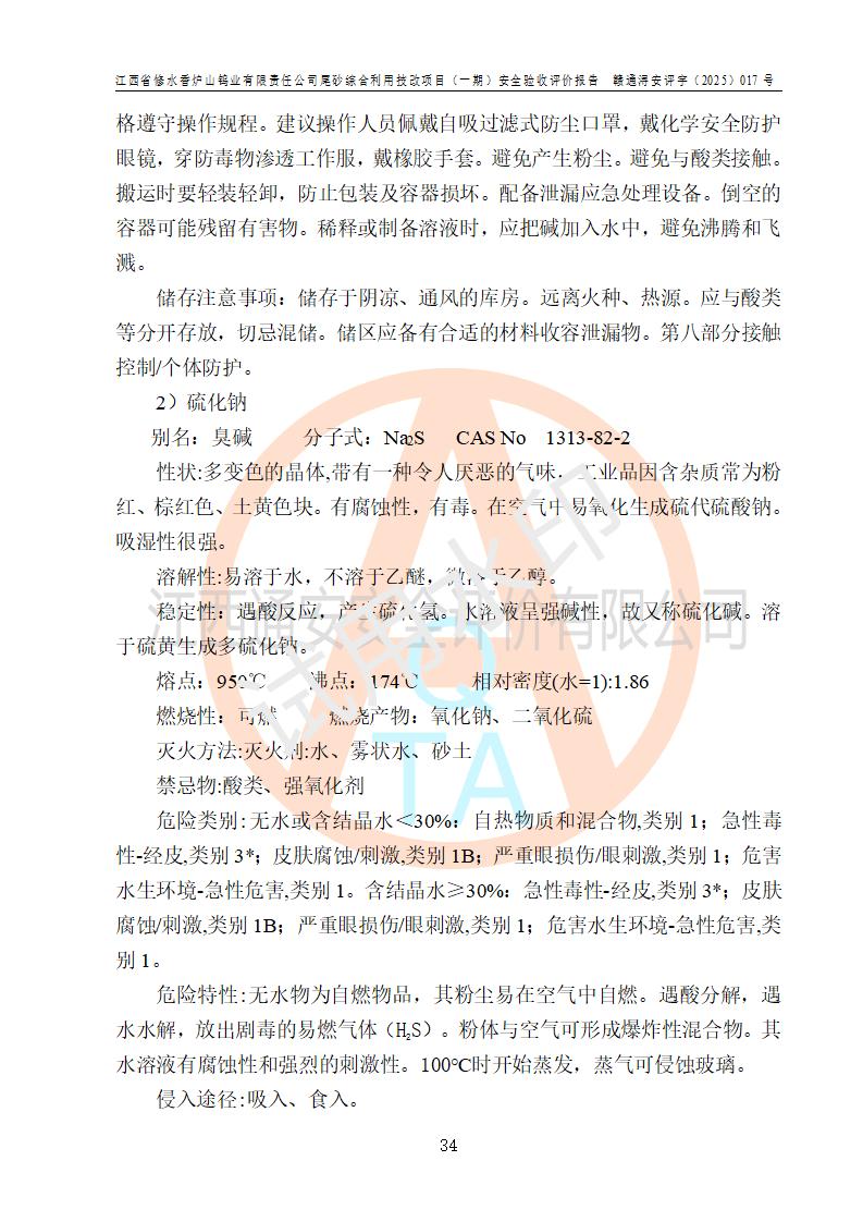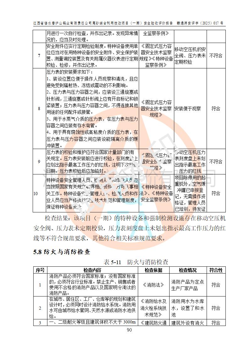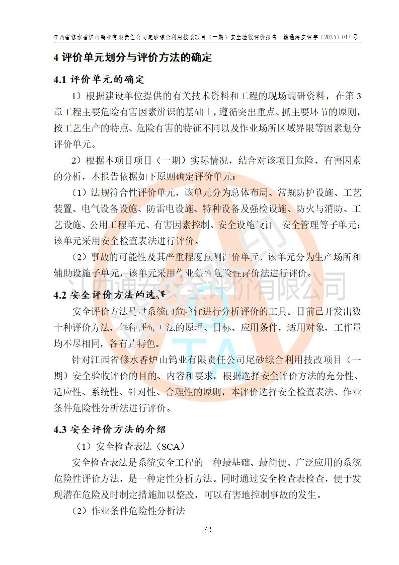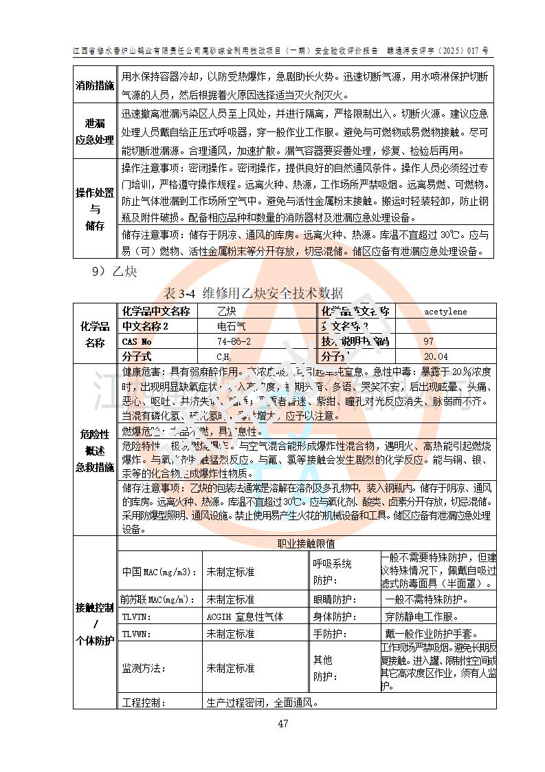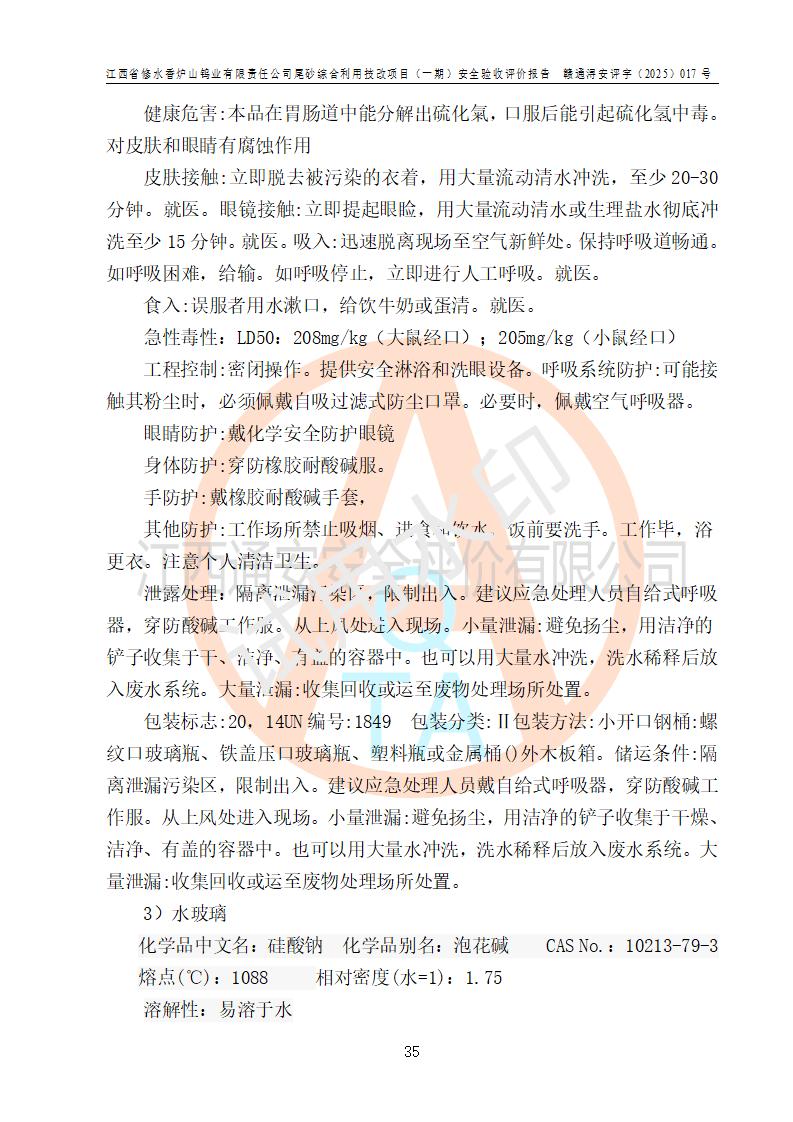 评价结论 | 总体结论:江西省修水香炉山钨业有限责任公司尾砂综合利用技改项目(一期)的选址符合有关法规、标准要求,周边环境符合有关法规、标准要求,平面布置防火间距不足,工艺过程及设备设施总体达到了《安全设施设计》和**法规、标准规定要求,其生产过程中存在的主要危险有害因素火灾、其他爆炸、触电、机械伤害、**伤害、坍塌、高处坠落、物体打击、起重伤害、中毒与窒息、淹溺、灼烫、尘毒、高温与低温、噪声等落实本报告提出的对策措施,风险可控,可以满足安全生产要求,具备竣工安全验收的条件。但企业应进一步完成和落实本报告的对策措施和建议。 | |||||