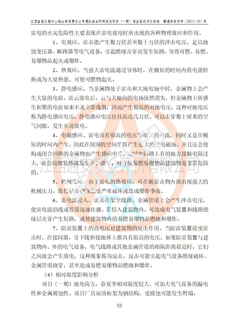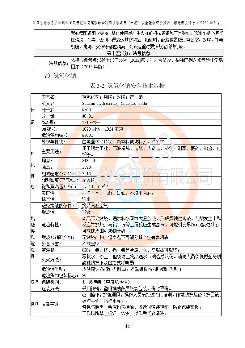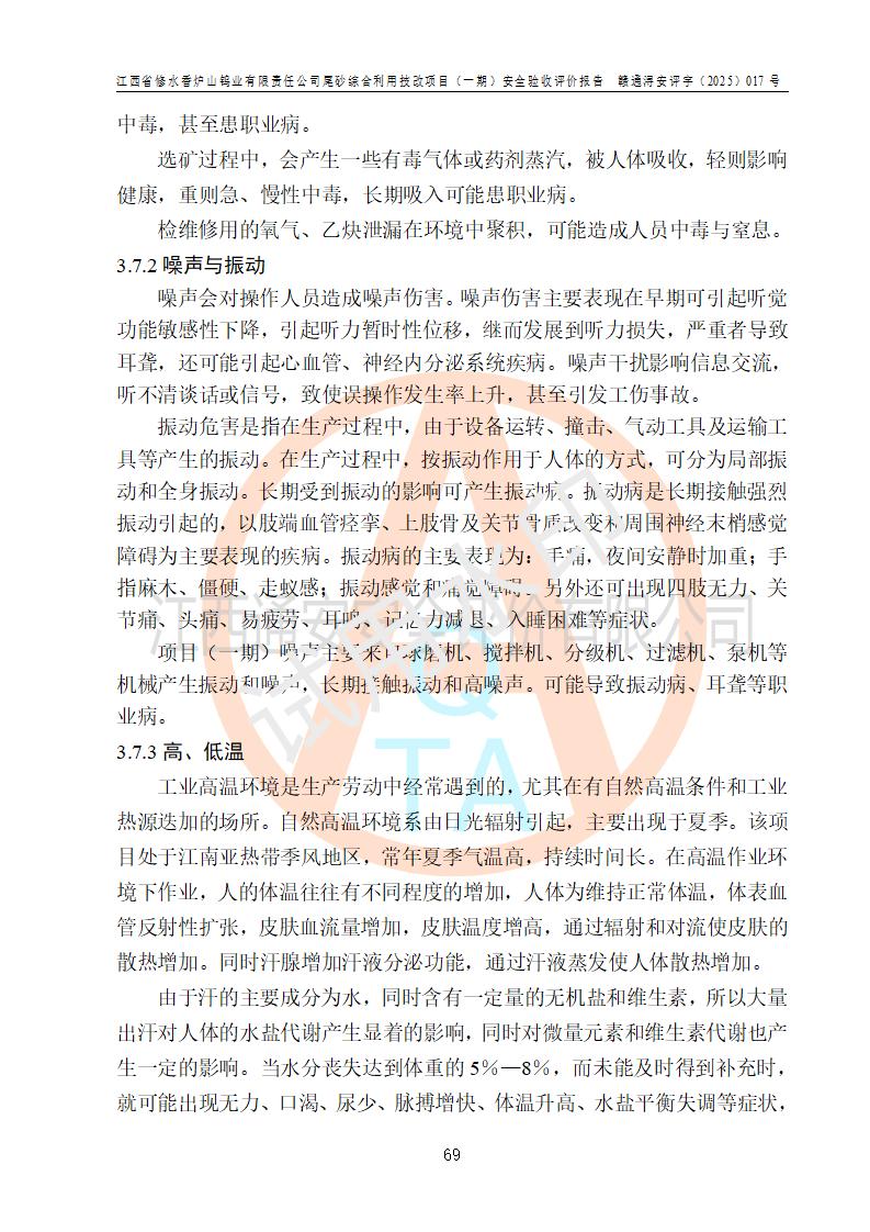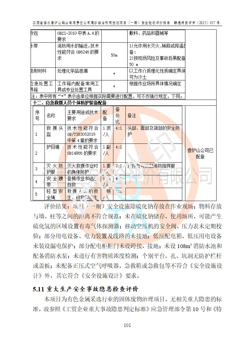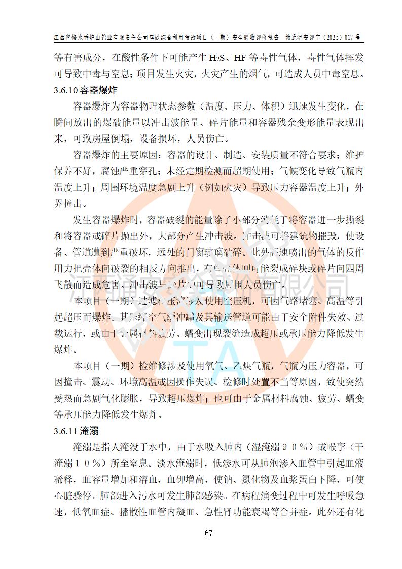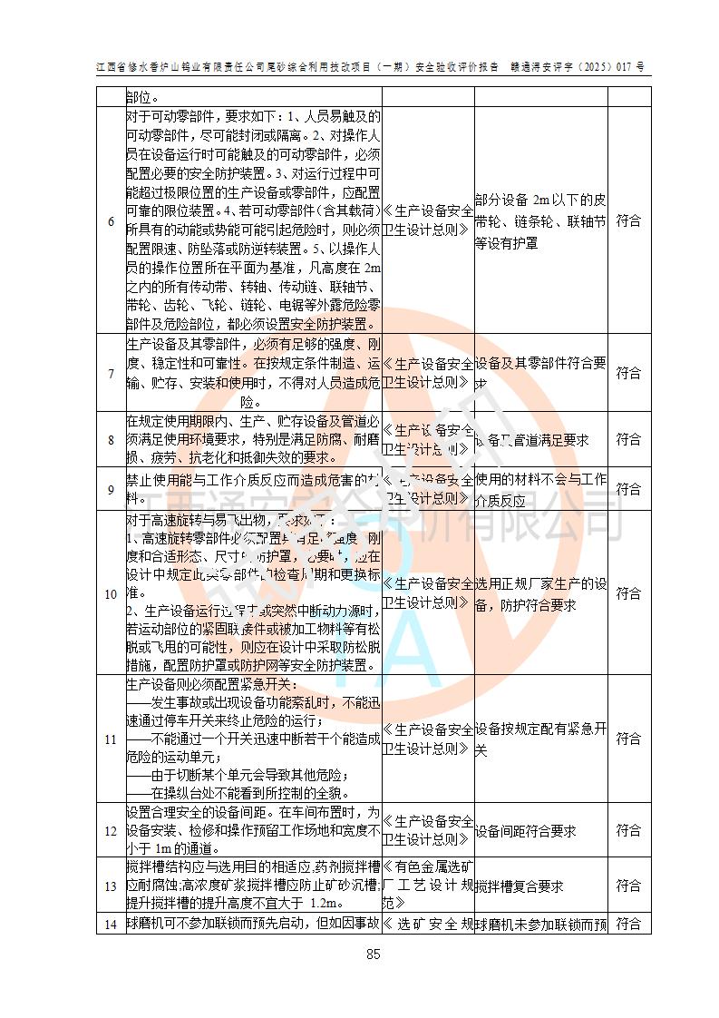 评价结论 | 总体结论:江西省修水香炉山钨业有限责任公司尾砂综合利用技改项目(一期)的选址符合有关法规、标准要求,周边环境符合有关法规、标准要求,平面布置防火间距不足,工艺过程及设备设施总体达到了《安全设施设计》和**法规、标准规定要求,其生产过程中存在的主要危险有害因素火灾、其他爆炸、触电、机械伤害、**伤害、坍塌、高处坠落、物体打击、起重伤害、中毒与窒息、淹溺、灼烫、尘毒、高温与低温、噪声等落实本报告提出的对策措施,风险可控,可以满足安全生产要求,具备竣工安全验收的条件。但企业应进一步完成和落实本报告的对策措施和建议。 | |||||