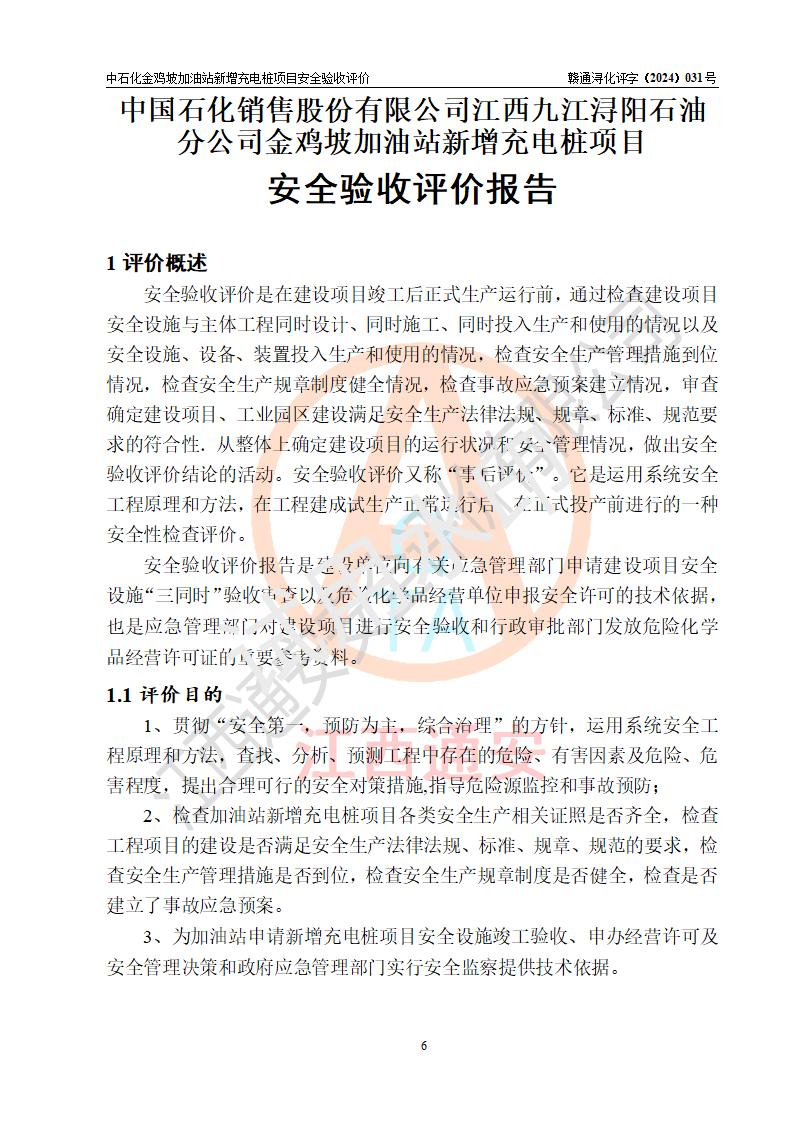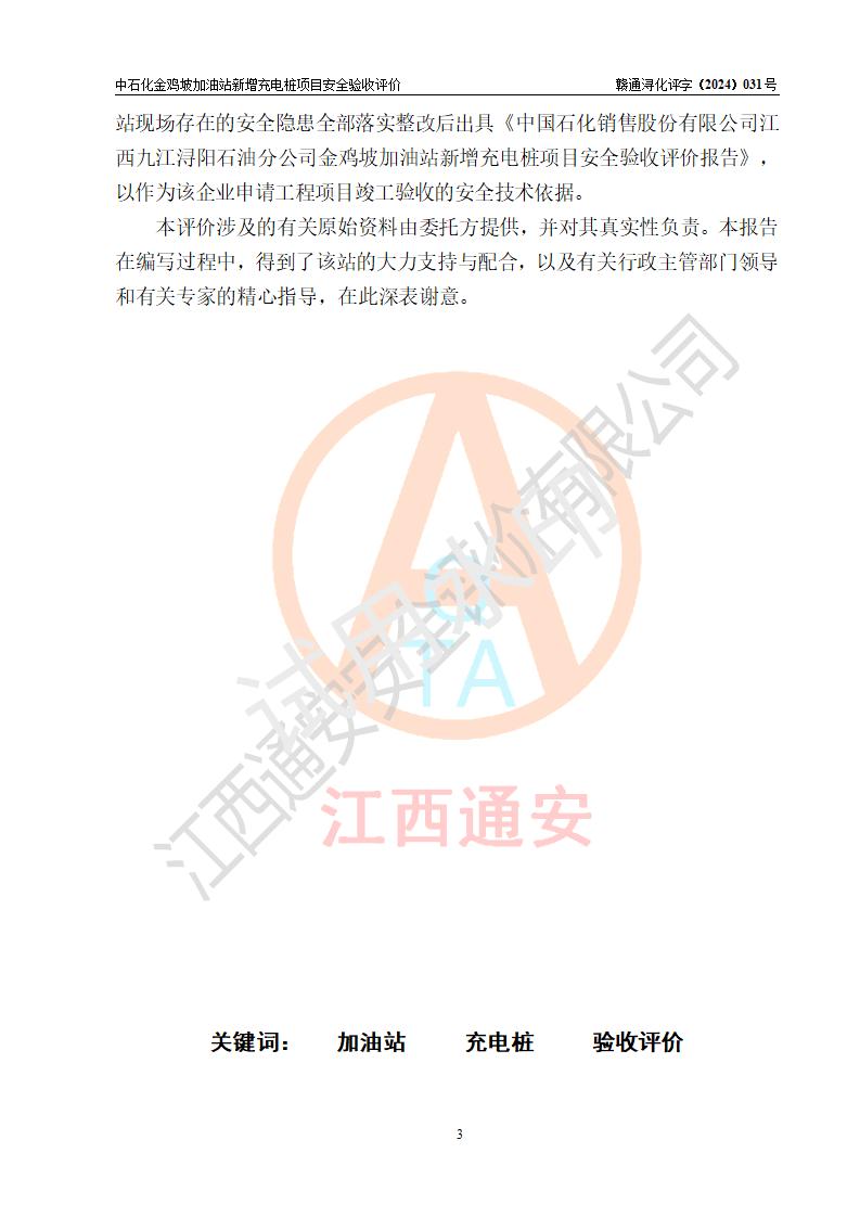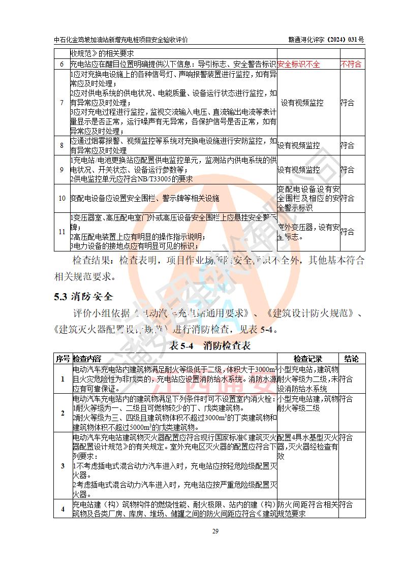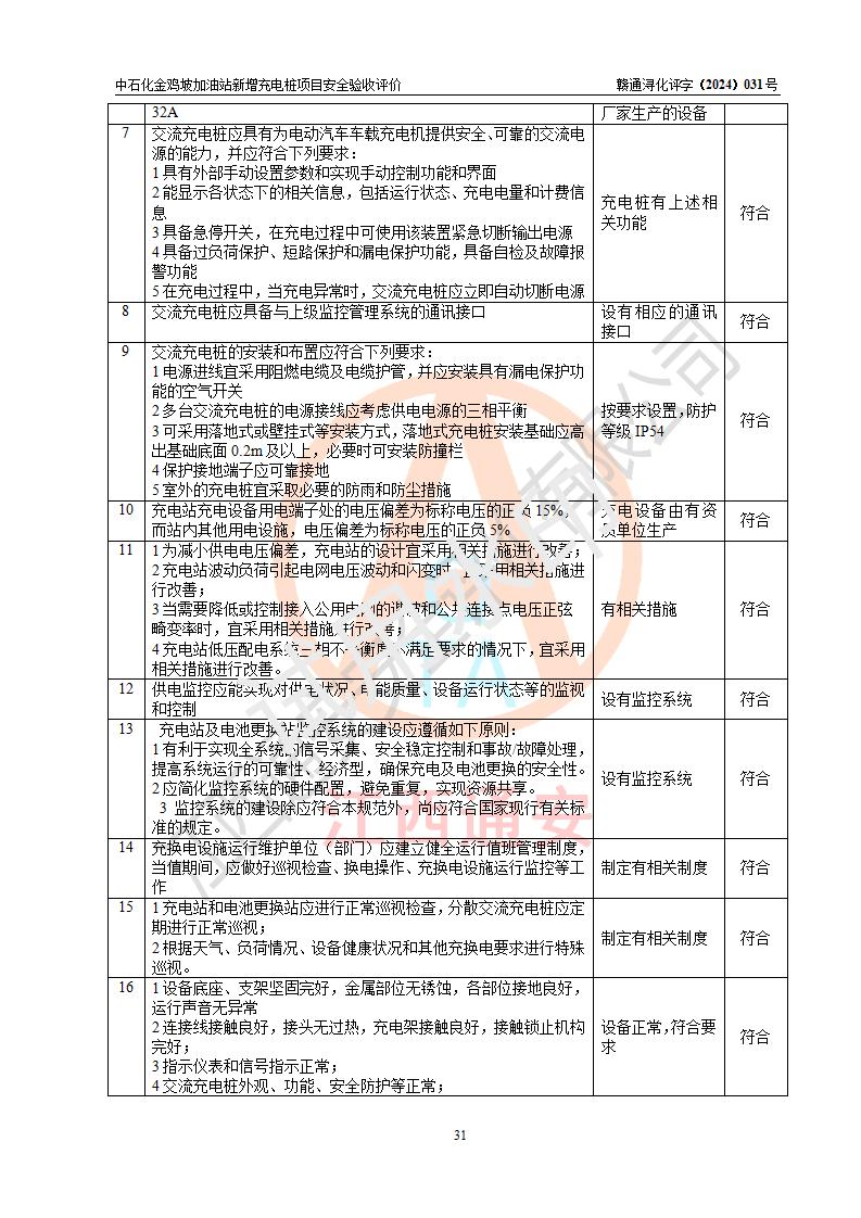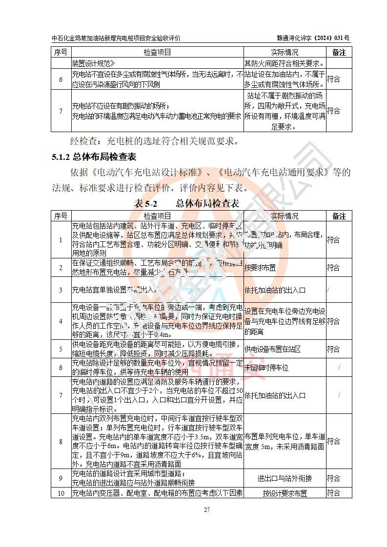评价结论 | 中国石化销售股份有限公司江西九江浔阳石油分公司金鸡坡加油站新增充电桩项目涉及的安全条件、安全生产条件、安全生产管理符合《电动汽车充电站设计规范》、《汽车加油加气加氢站技术标准》等**有关法规、标准、规范要求,能满足经营单位的安全条件,具备项目竣工验收的条件。 | |||
