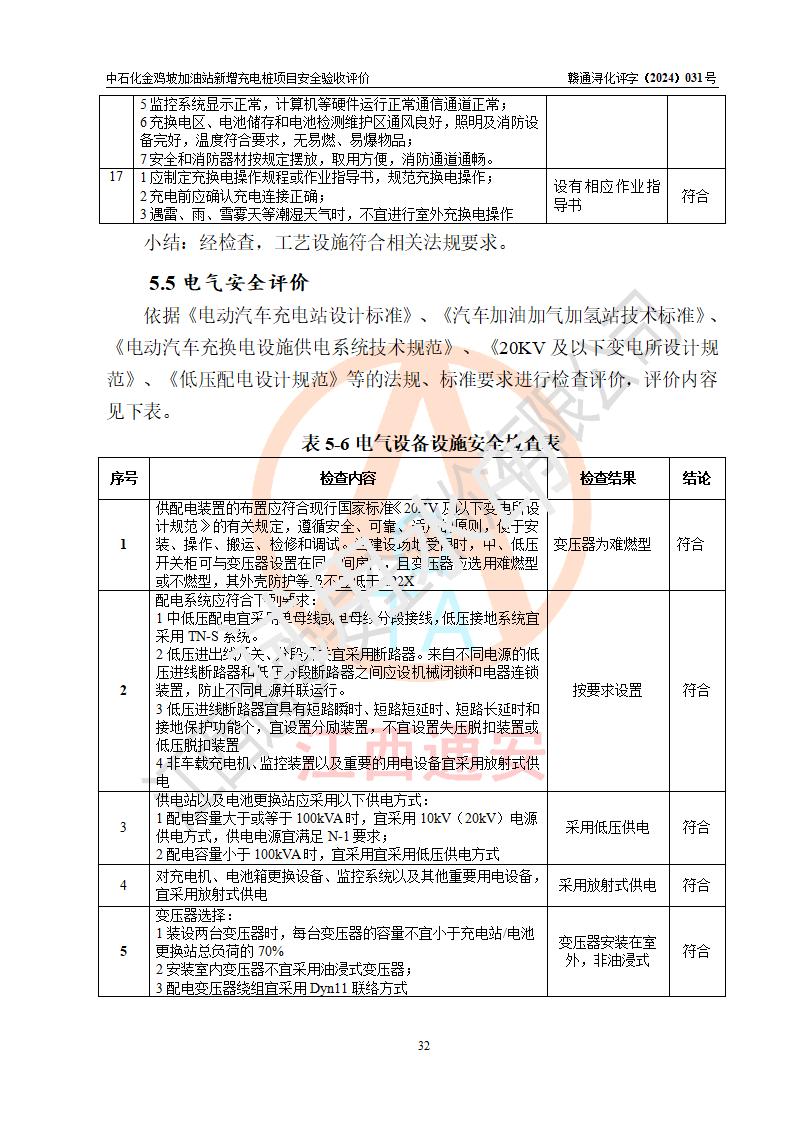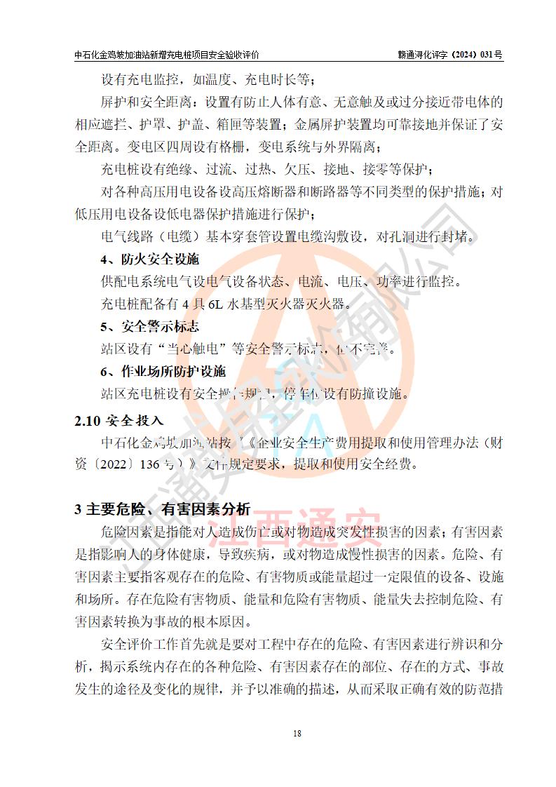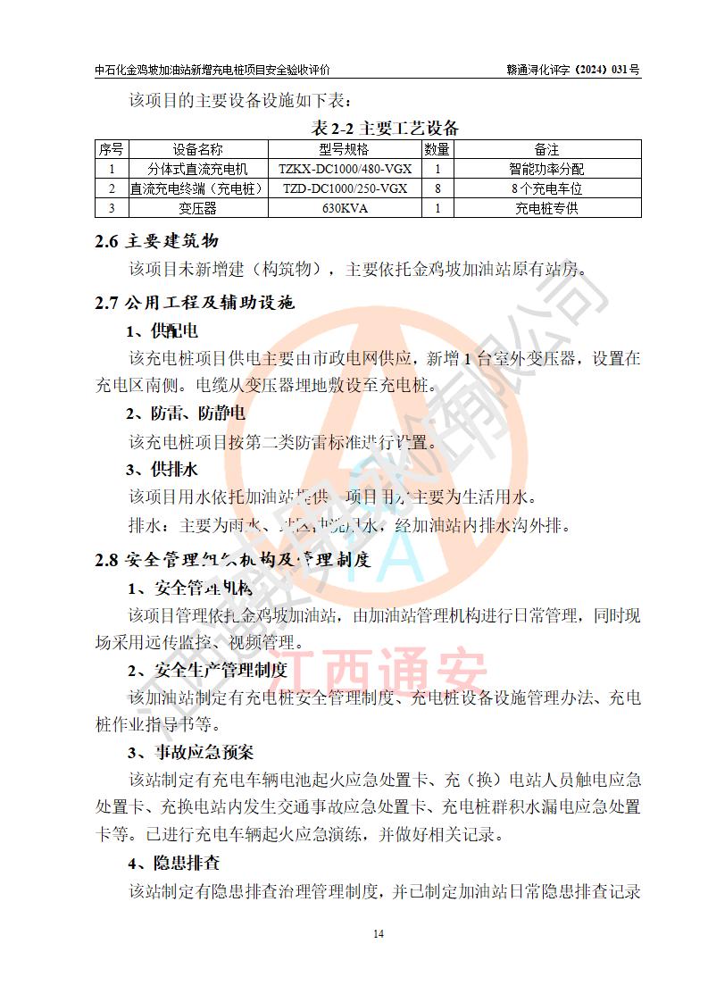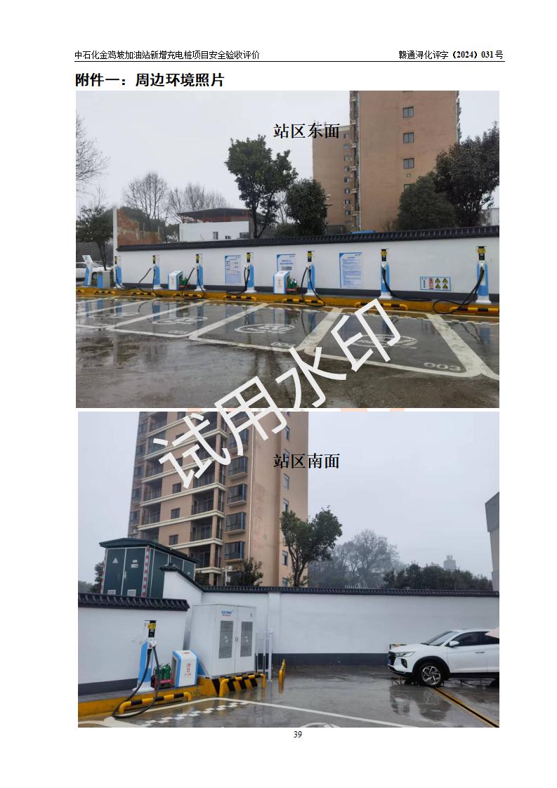 评价结论 | 中国石化销售股份有限公司江西九江浔阳石油分公司金鸡坡加油站新增充电桩项目涉及的安全条件、安全生产条件、安全生产管理符合《电动汽车充电站设计规范》、《汽车加油加气加氢站技术标准》等**有关法规、标准、规范要求,能满足经营单位的安全条件,具备项目竣工验收的条件。 | |||