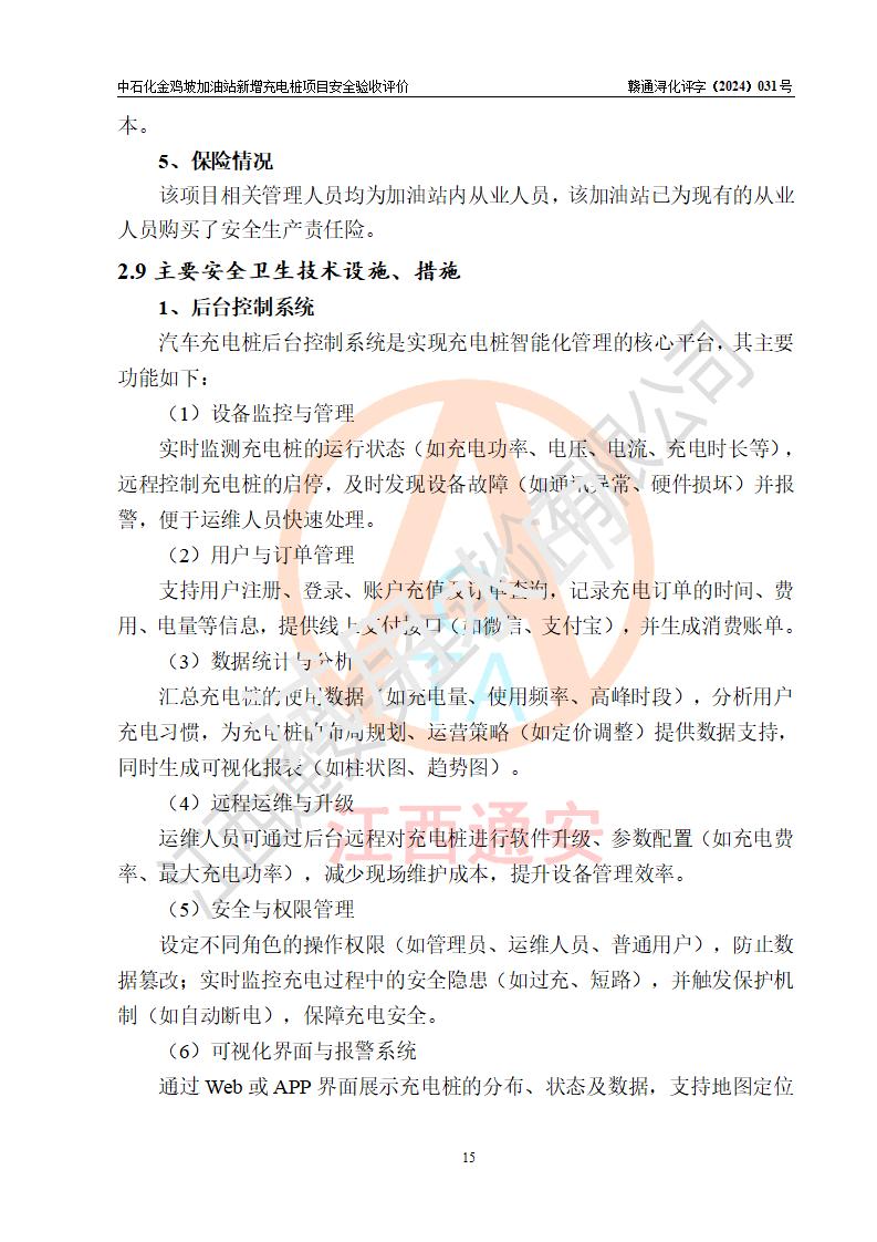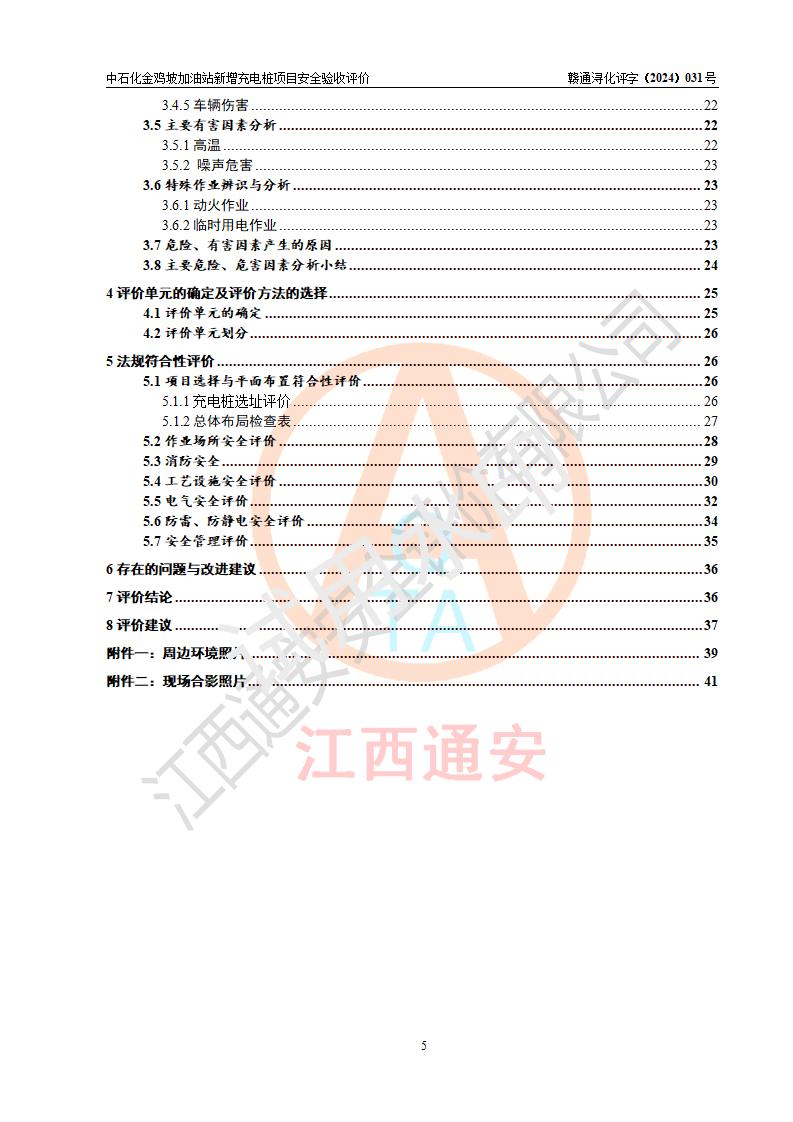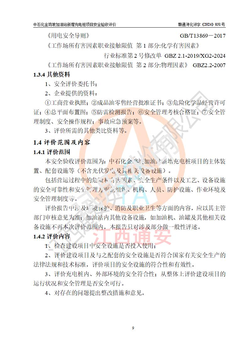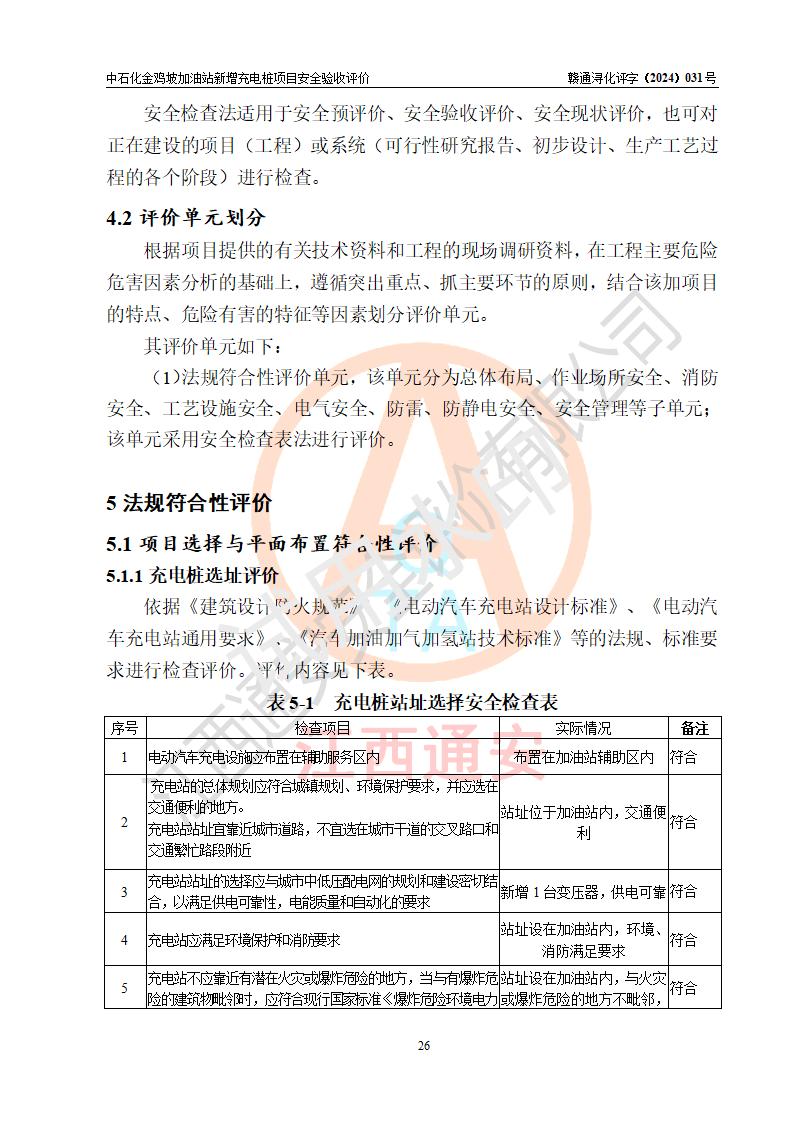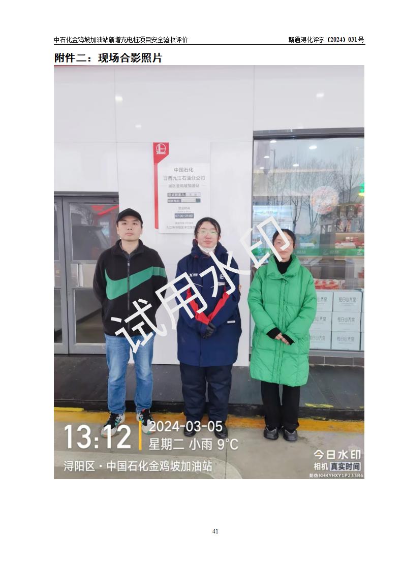 评价结论 | 中国石化销售股份有限公司江西九江浔阳石油分公司金鸡坡加油站新增充电桩项目涉及的安全条件、安全生产条件、安全生产管理符合《电动汽车充电站设计规范》、《汽车加油加气加氢站技术标准》等**有关法规、标准、规范要求,能满足经营单位的安全条件,具备项目竣工验收的条件。 | |||