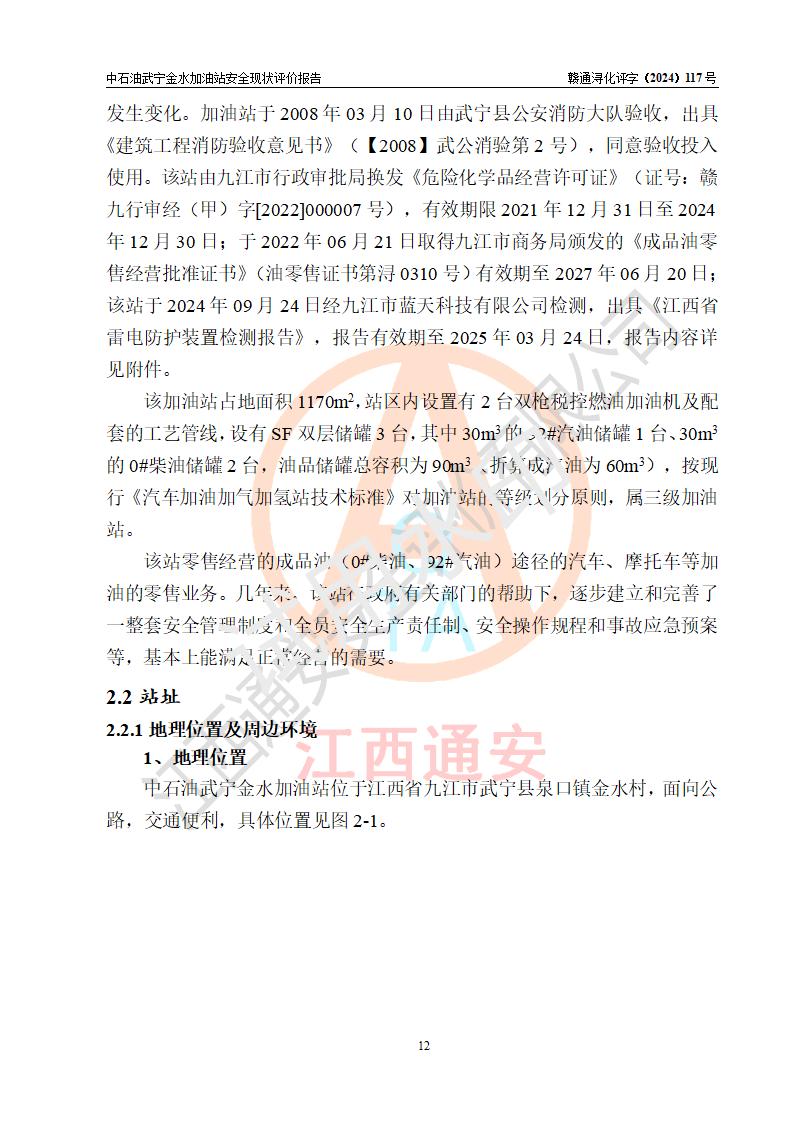 项目简介 | 中国石油天然气股份有限公司江西九江武宁金水加油站是一家专门从事成品油零售经营的股份有限公司分公司(上市、国有控股),经营场所位于江西省九江市武宁县泉口镇金水村。现有从业人员4名,其中安全管理人员1人,加油站负责人杨全荣。 该加油站占地面积1170m2,站区内设置有2台双枪税控燃油加油机及配套的工艺管线,设有SF双层储罐3台,其中30m3的92#汽油储罐1台、30m3的0#柴油储罐2台,油品储罐总容积为90m3(折算成汽油为60m3),按现行《汽车加油加气加氢站技术标准》对加油站的等级划分原则,属三级加油站。 该站由九江市行政审批局换发《危险化学品经营许可证》(证号:赣九行审经(甲)字[2022]000007号),**期限2021年12月31日至2024年12月30日。 | |||