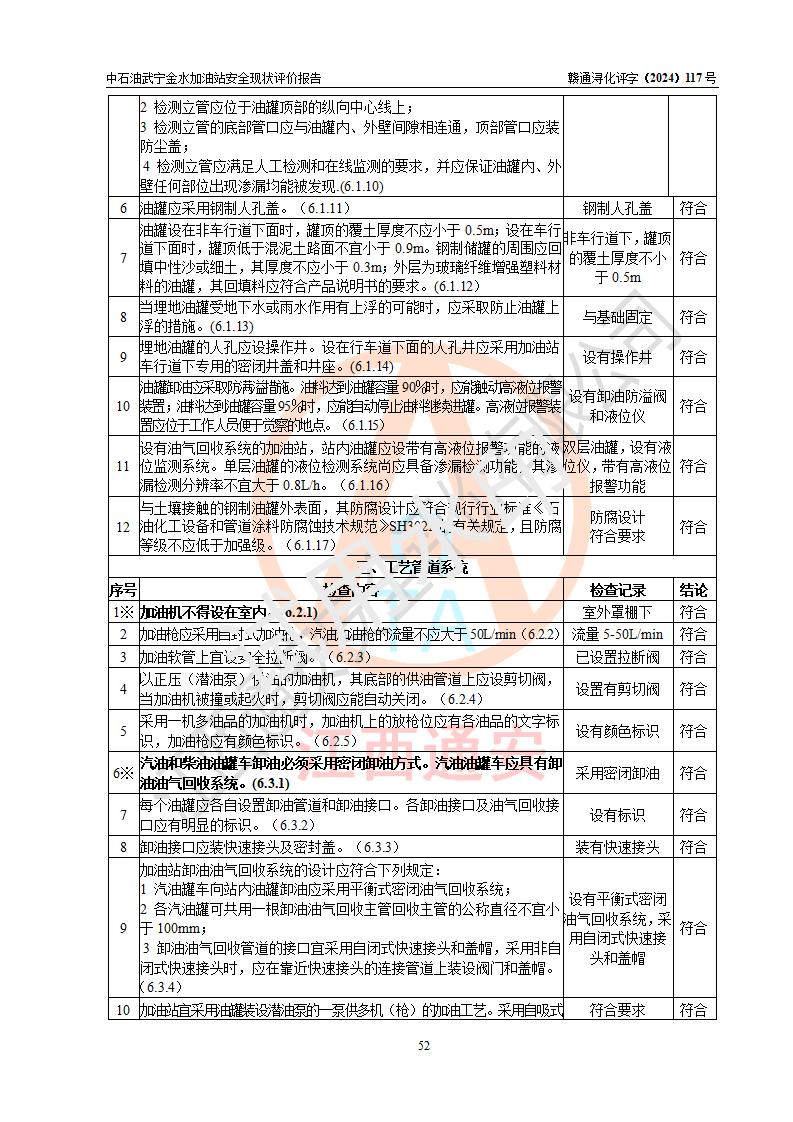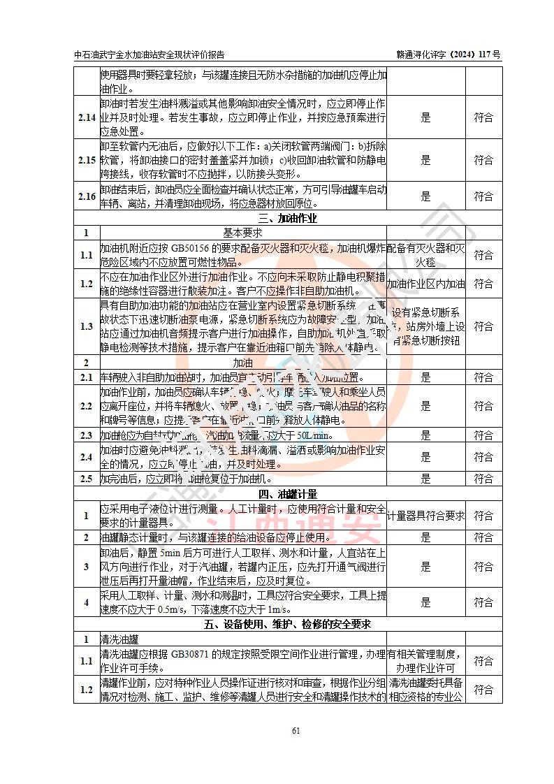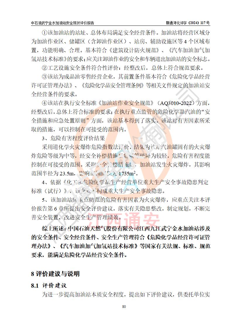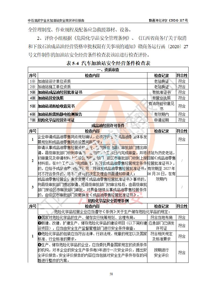 评价结论 | 中国石油天然气股份有限公司江西九江武宁金水加油站涉及的安全条件、安全经营条件、安全生产管理符合《危险化学品经营许可证管理办法》、《汽车加油加气加氢站技术标准》等**有关法规、标准、规范要求,能满足危险化学品经营安全条件。 | |||