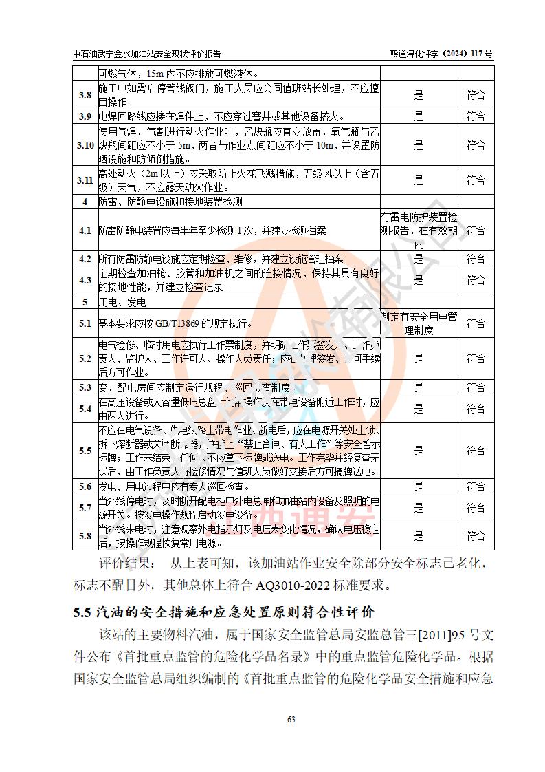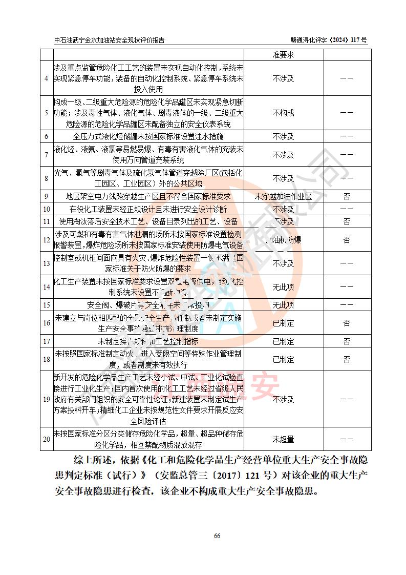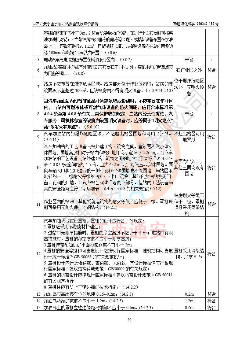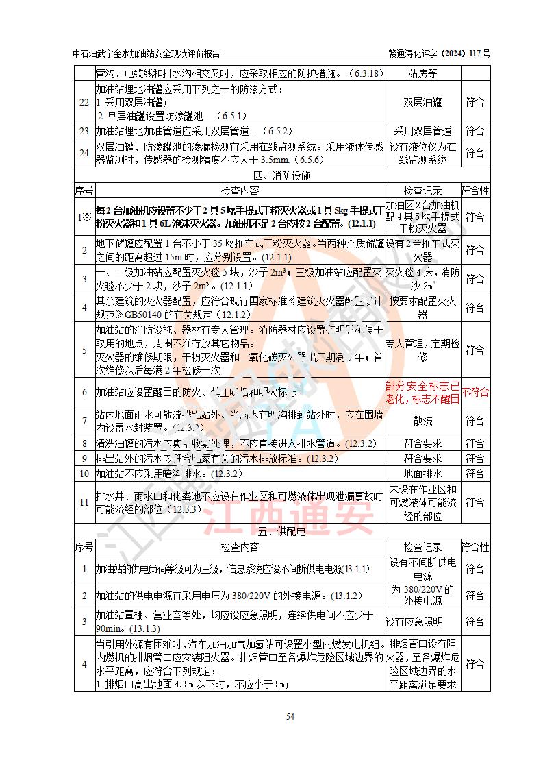 评价结论 | 中国石油天然气股份有限公司江西九江武宁金水加油站涉及的安全条件、安全经营条件、安全生产管理符合《危险化学品经营许可证管理办法》、《汽车加油加气加氢站技术标准》等**有关法规、标准、规范要求,能满足危险化学品经营安全条件。 | |||