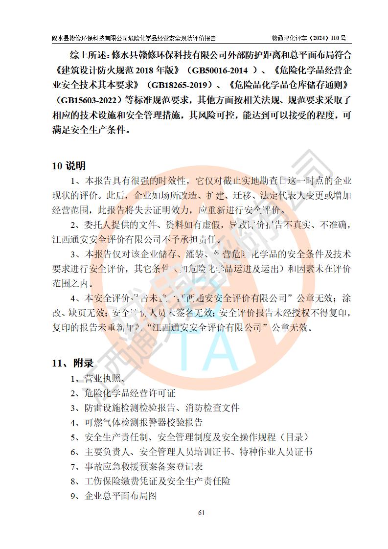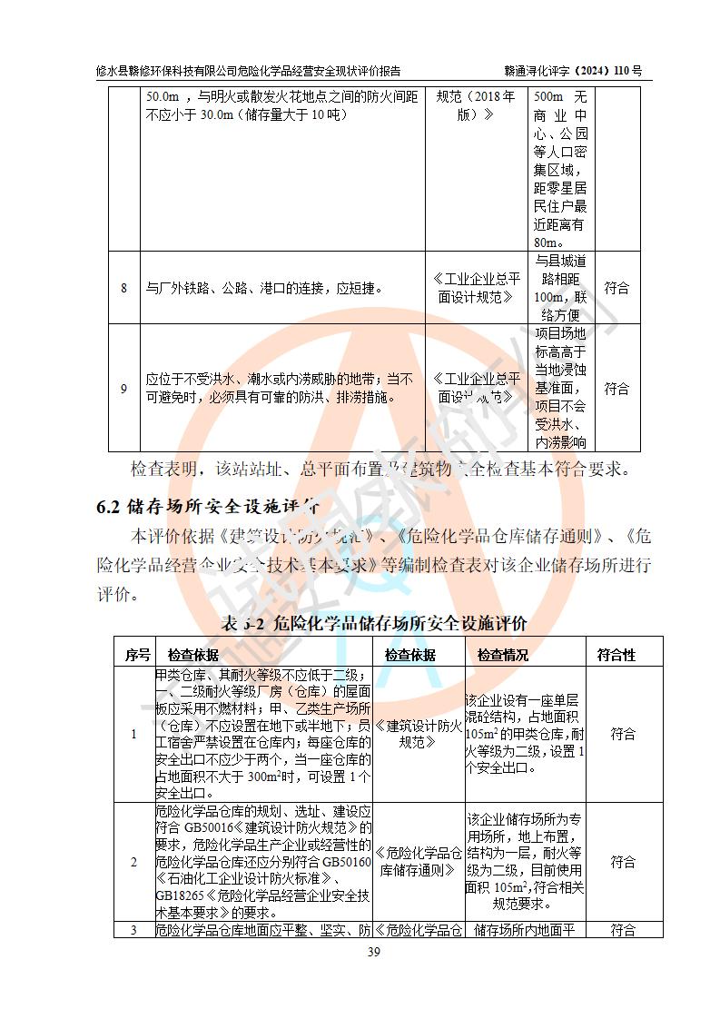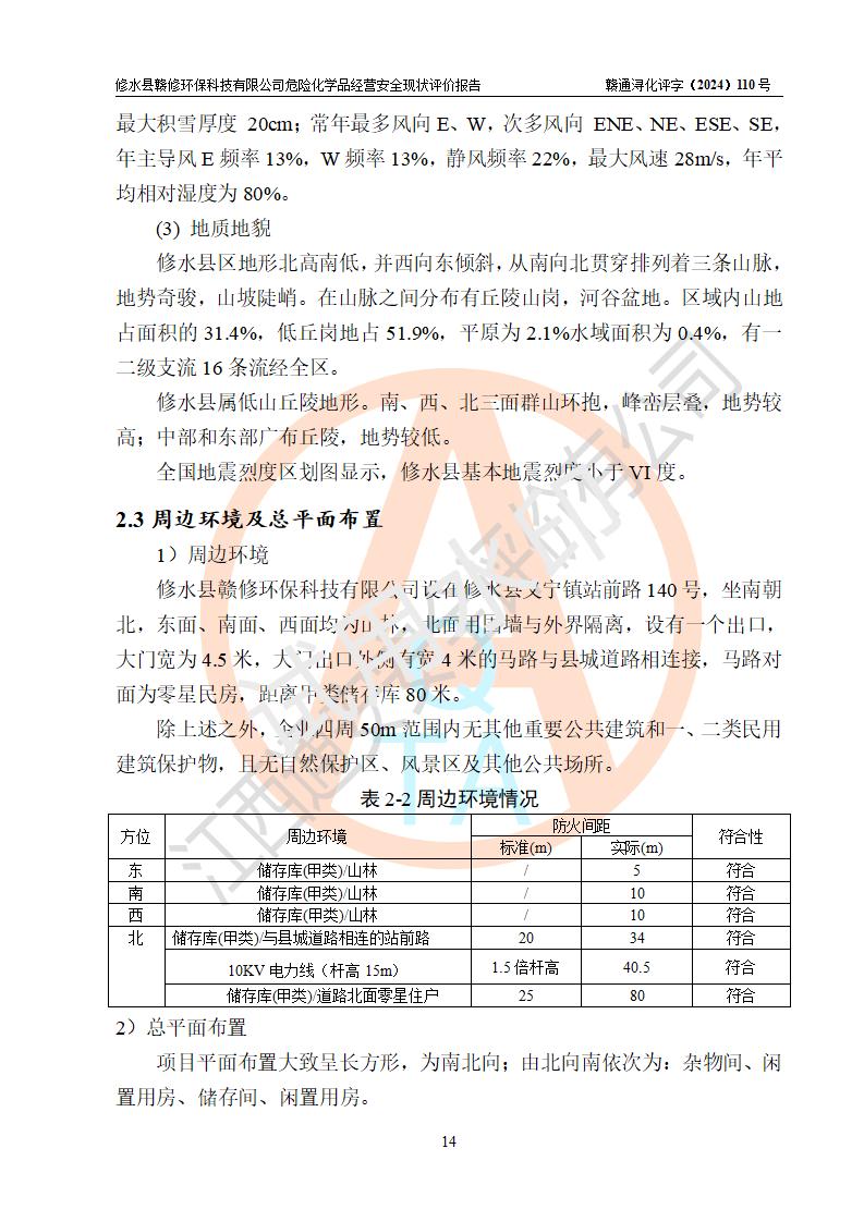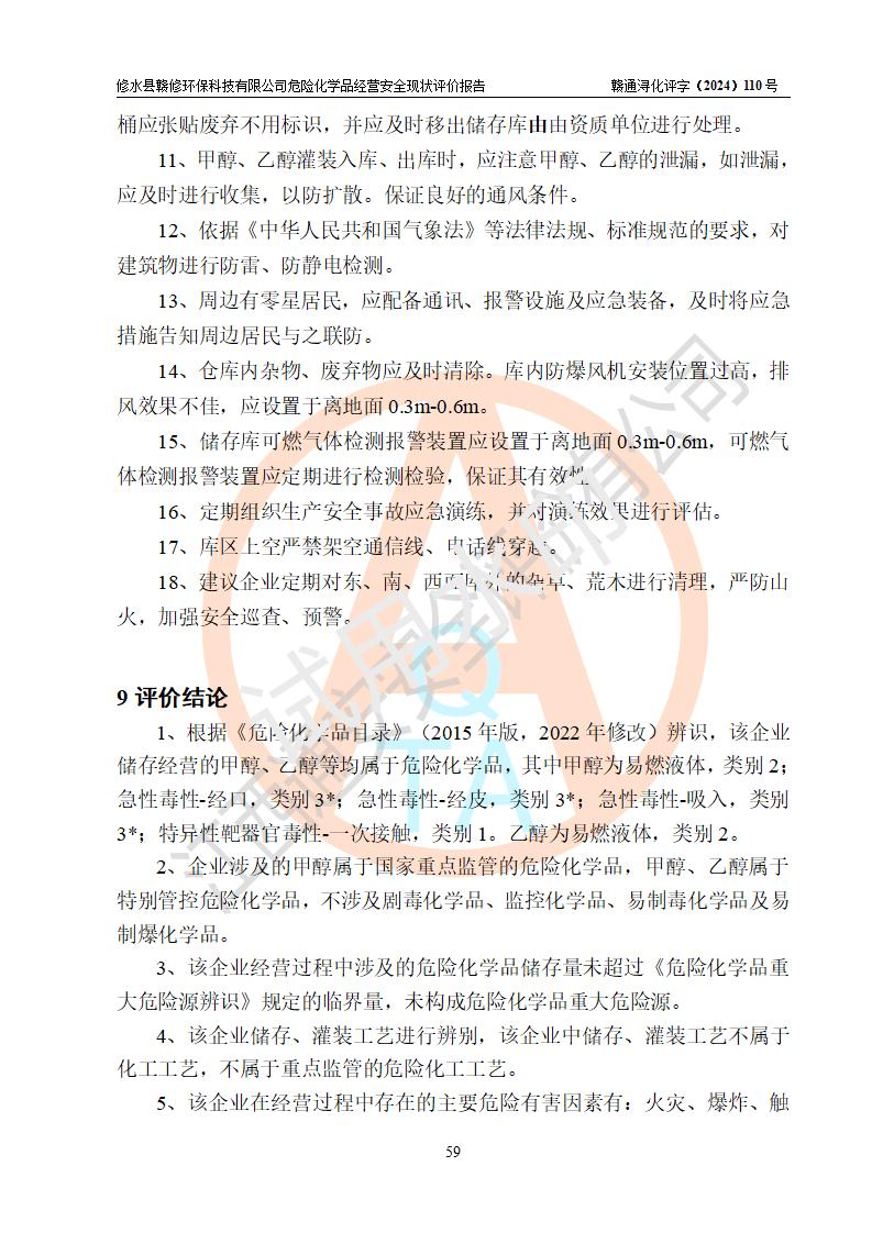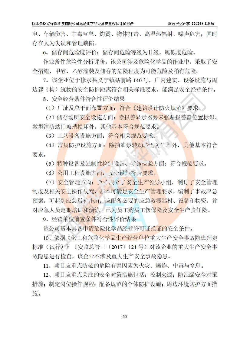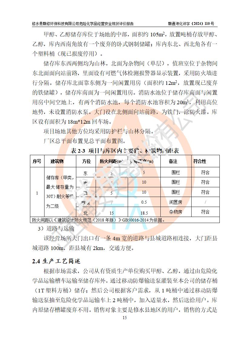 评价结论 | 修水县赣修**科技有限公司外部防护距离和总平面布局符合《建筑设计防火规范2018年版》(GB50016-2014 )、《危险化学品经营企业安全技术其本要求》(GB18265-2019)、《危险品化学品仓库储存通则》 (GB15603-2022)等标准规范要求,其他方面按相关法规、规范要求采取了相应的技术设施和安全管理措施,其风险可控,能达到可以接受的程度,可满足安全生产条件。 | ||||||