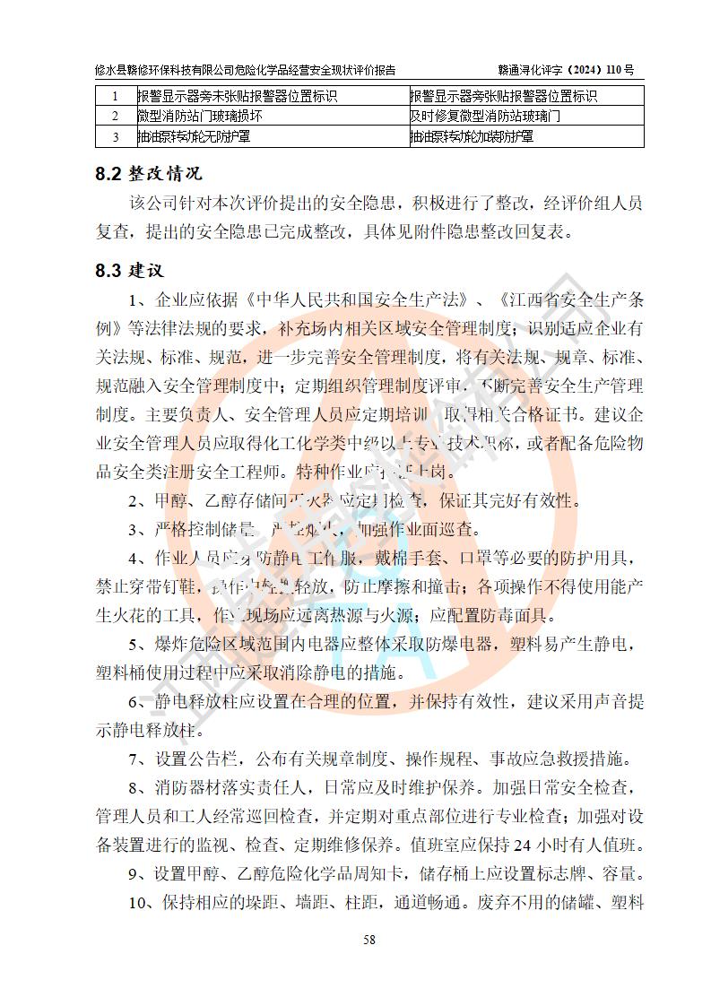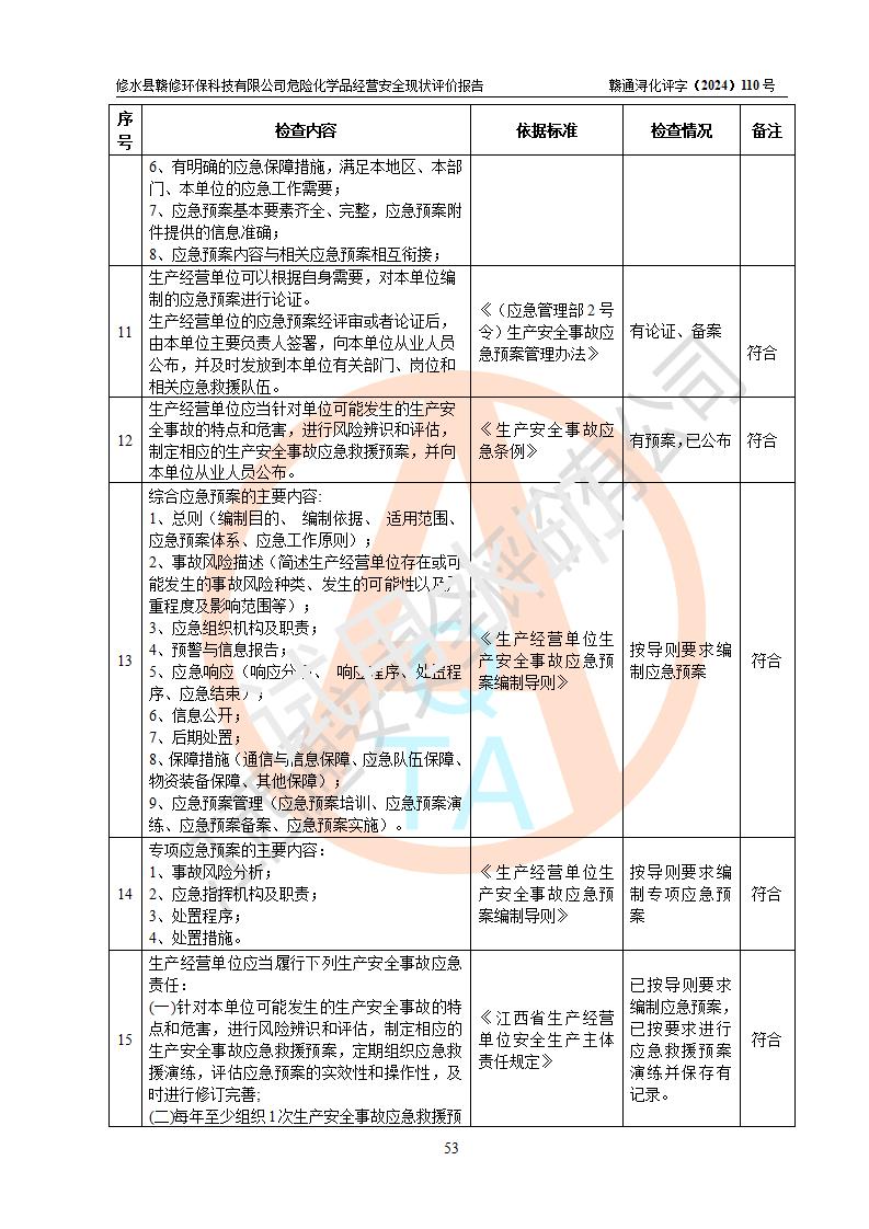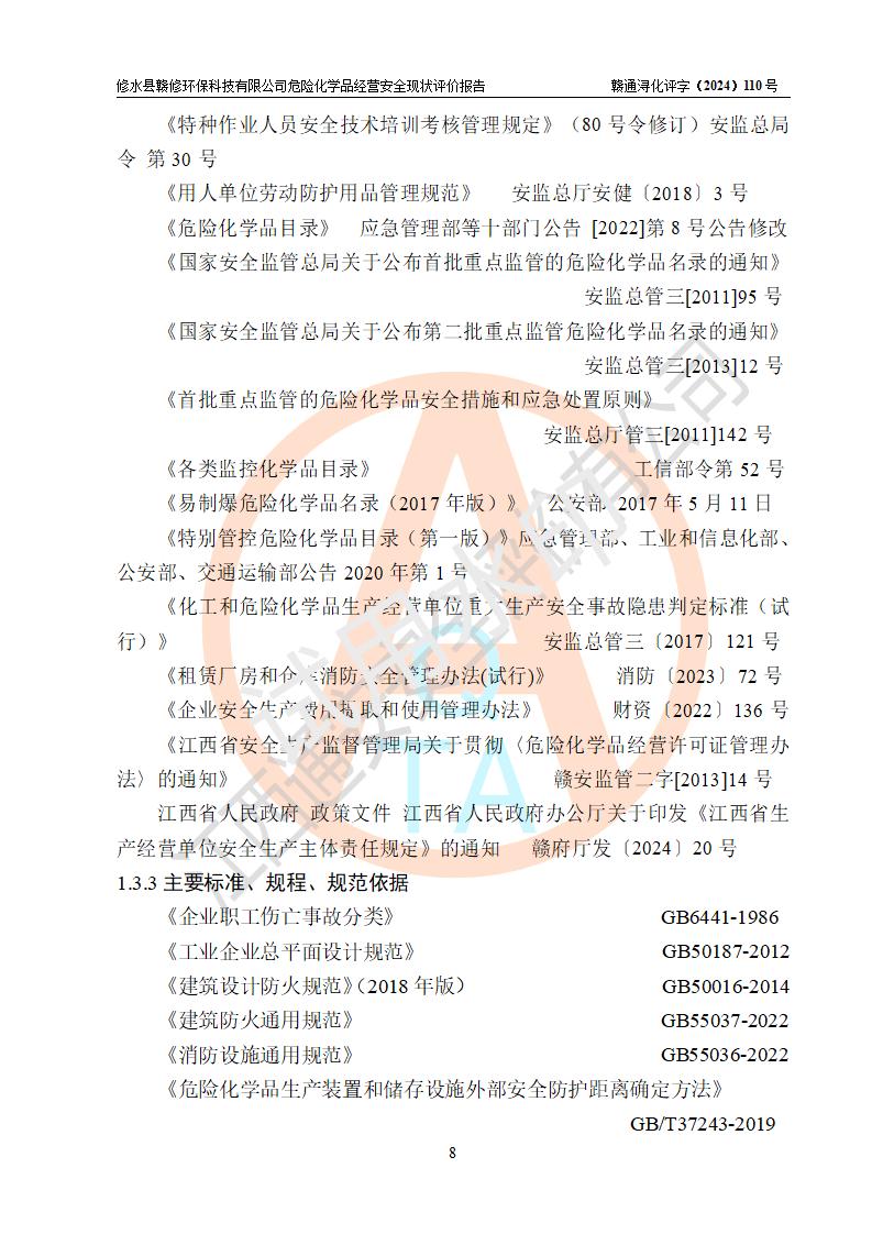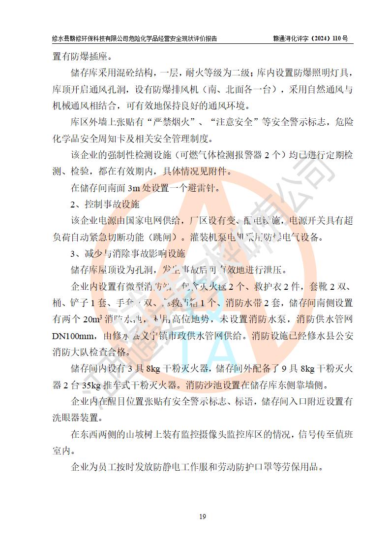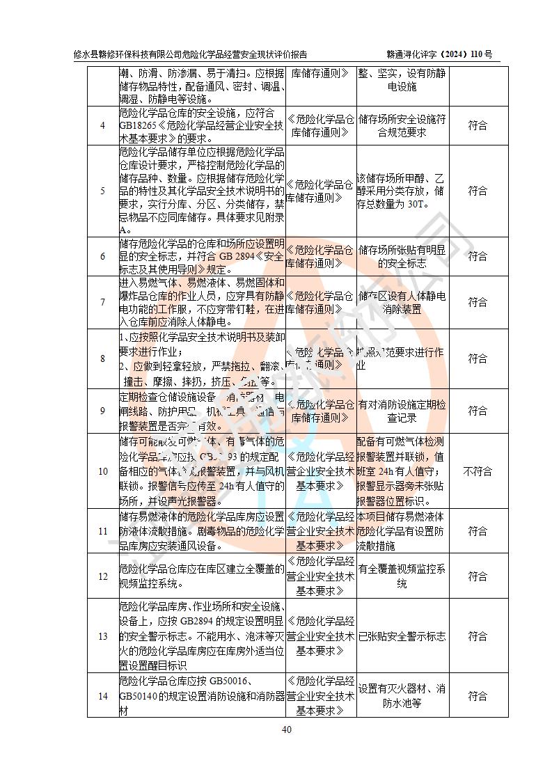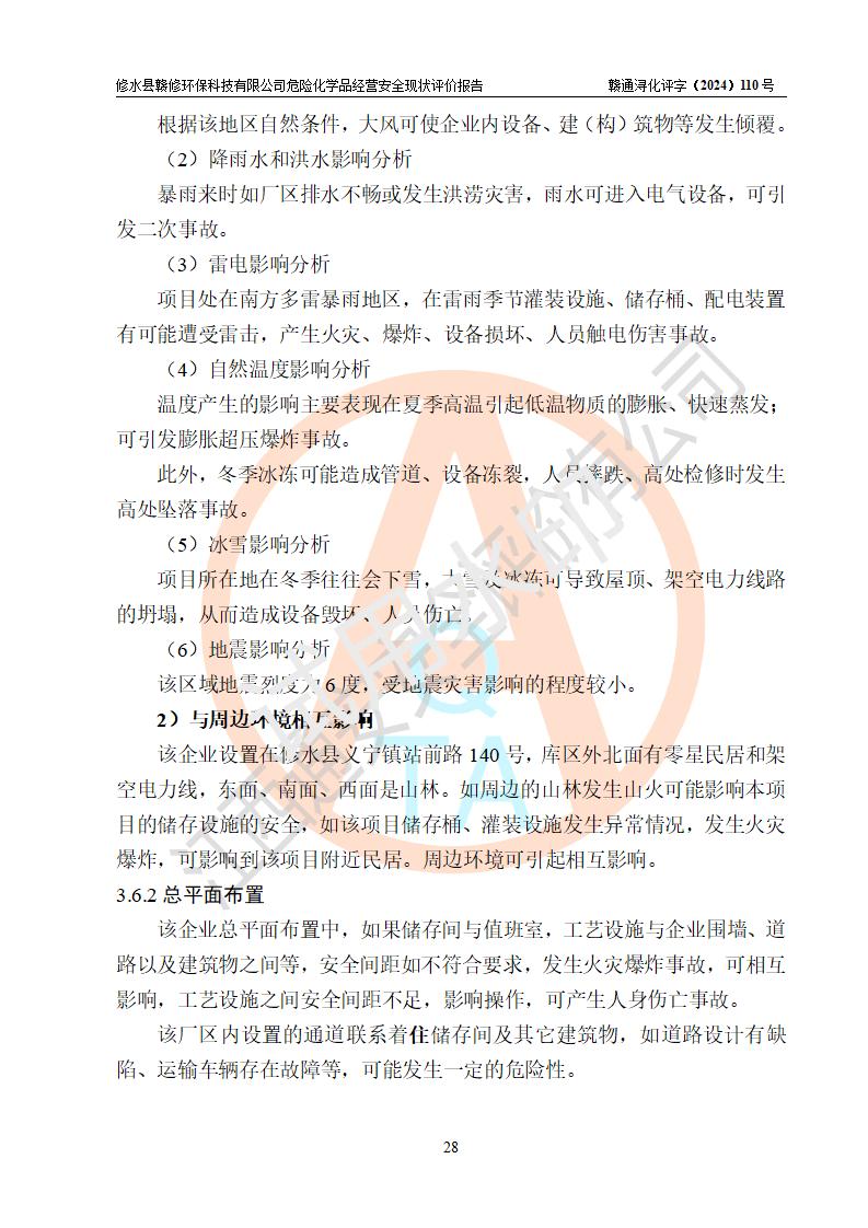 评价结论 | 修水县赣修**科技有限公司外部防护距离和总平面布局符合《建筑设计防火规范2018年版》(GB50016-2014 )、《危险化学品经营企业安全技术其本要求》(GB18265-2019)、《危险品化学品仓库储存通则》 (GB15603-2022)等标准规范要求,其他方面按相关法规、规范要求采取了相应的技术设施和安全管理措施,其风险可控,能达到可以接受的程度,可满足安全生产条件。 | ||||||