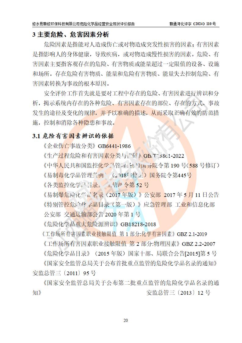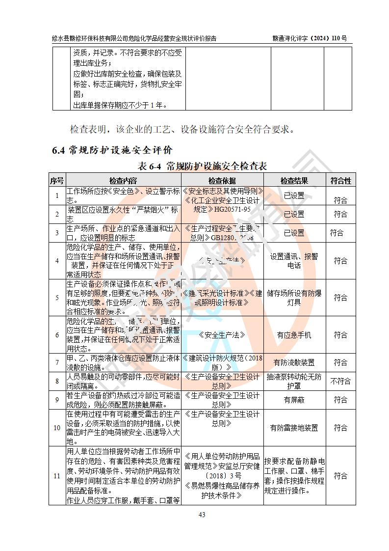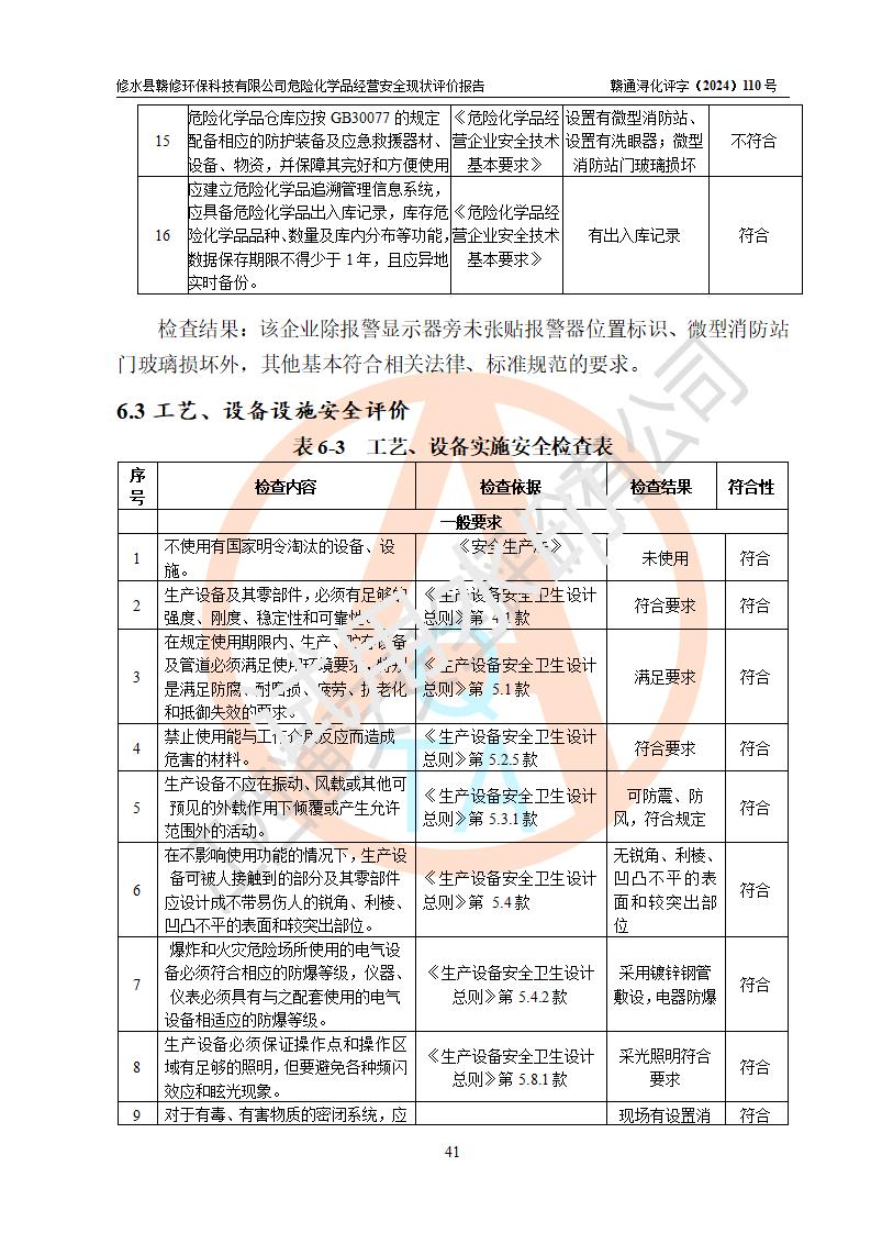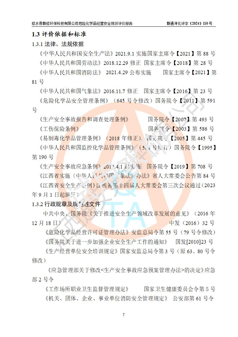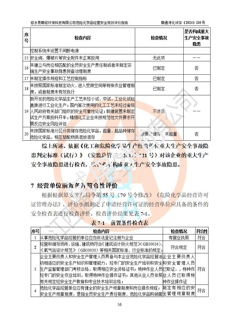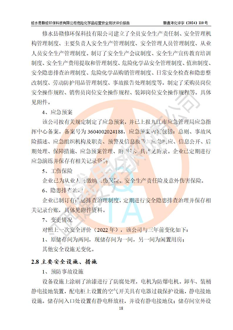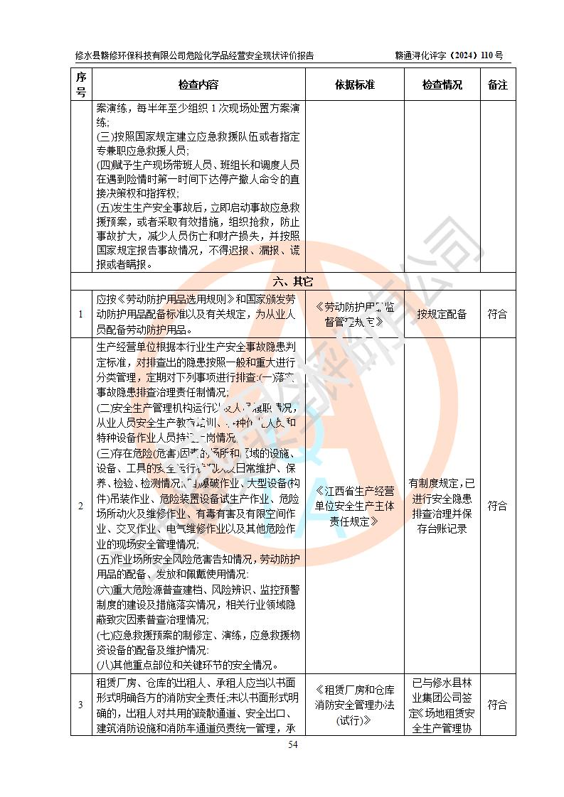 评价结论 | 修水县赣修**科技有限公司外部防护距离和总平面布局符合《建筑设计防火规范2018年版》(GB50016-2014 )、《危险化学品经营企业安全技术其本要求》(GB18265-2019)、《危险品化学品仓库储存通则》 (GB15603-2022)等标准规范要求,其他方面按相关法规、规范要求采取了相应的技术设施和安全管理措施,其风险可控,能达到可以接受的程度,可满足安全生产条件。 | ||||||
