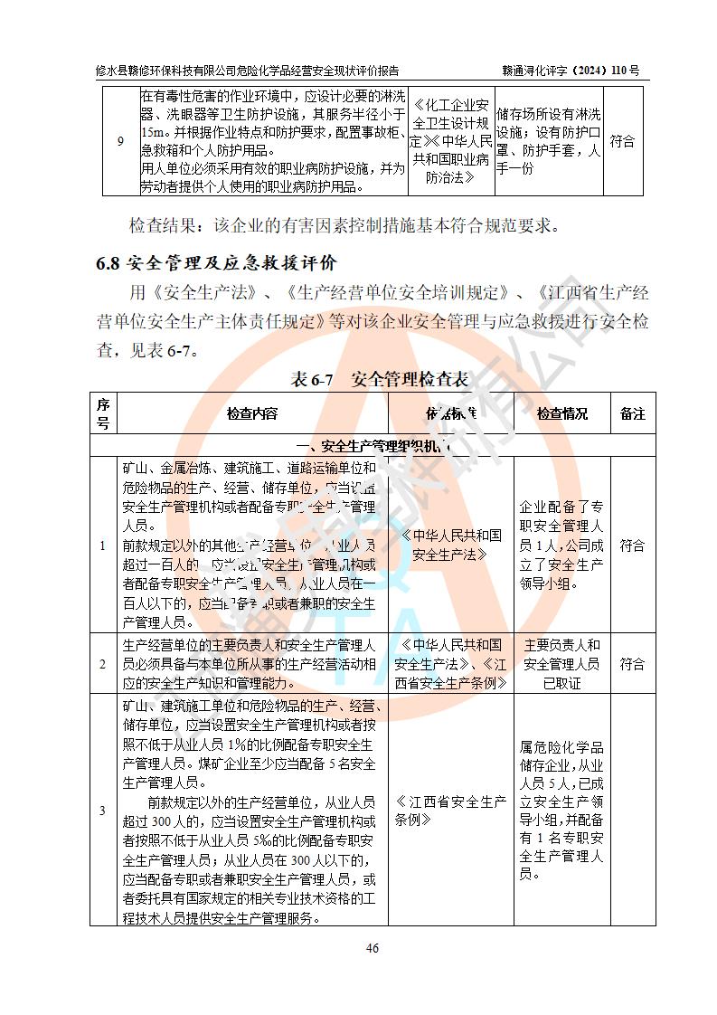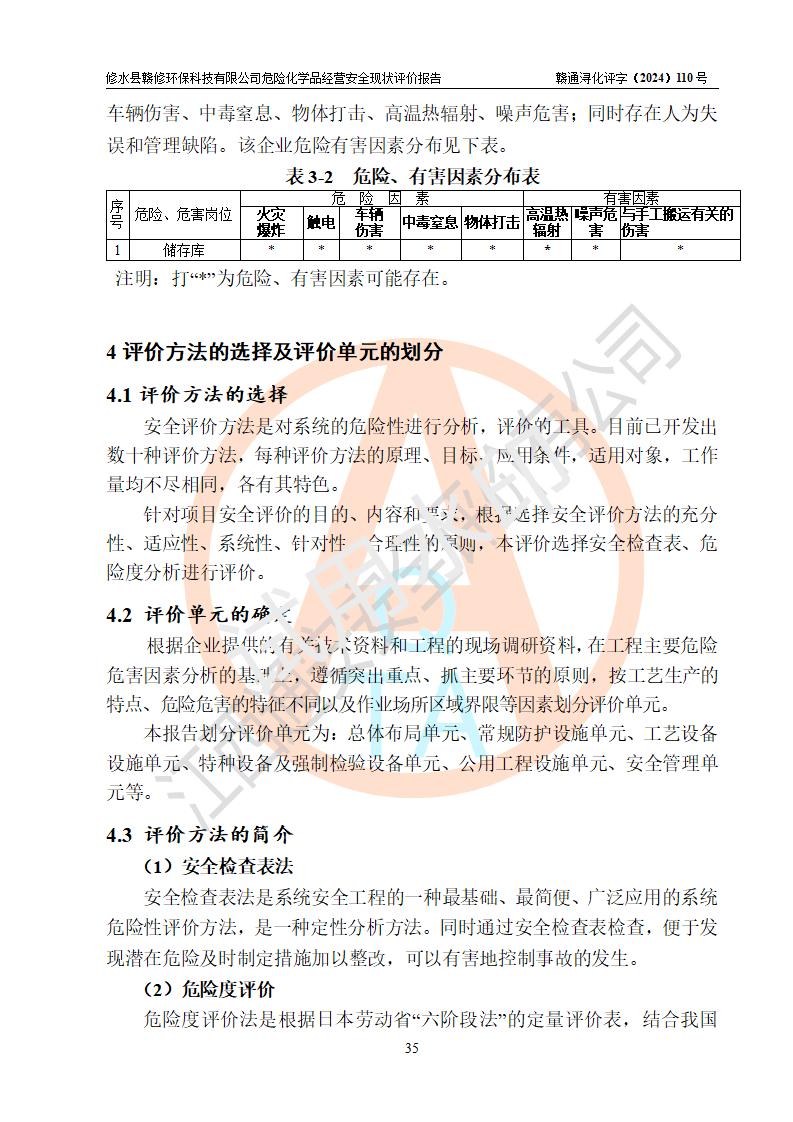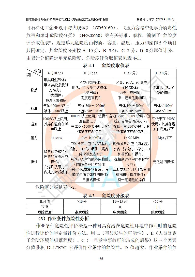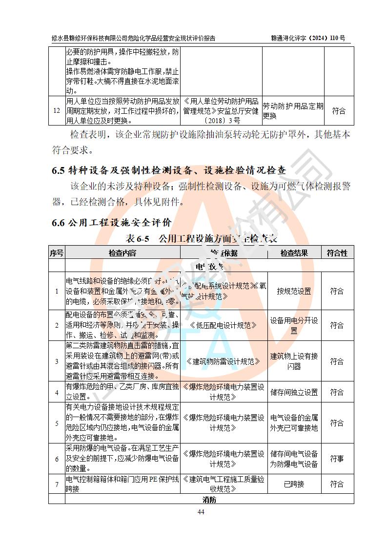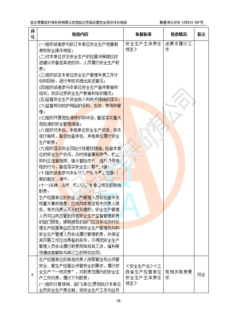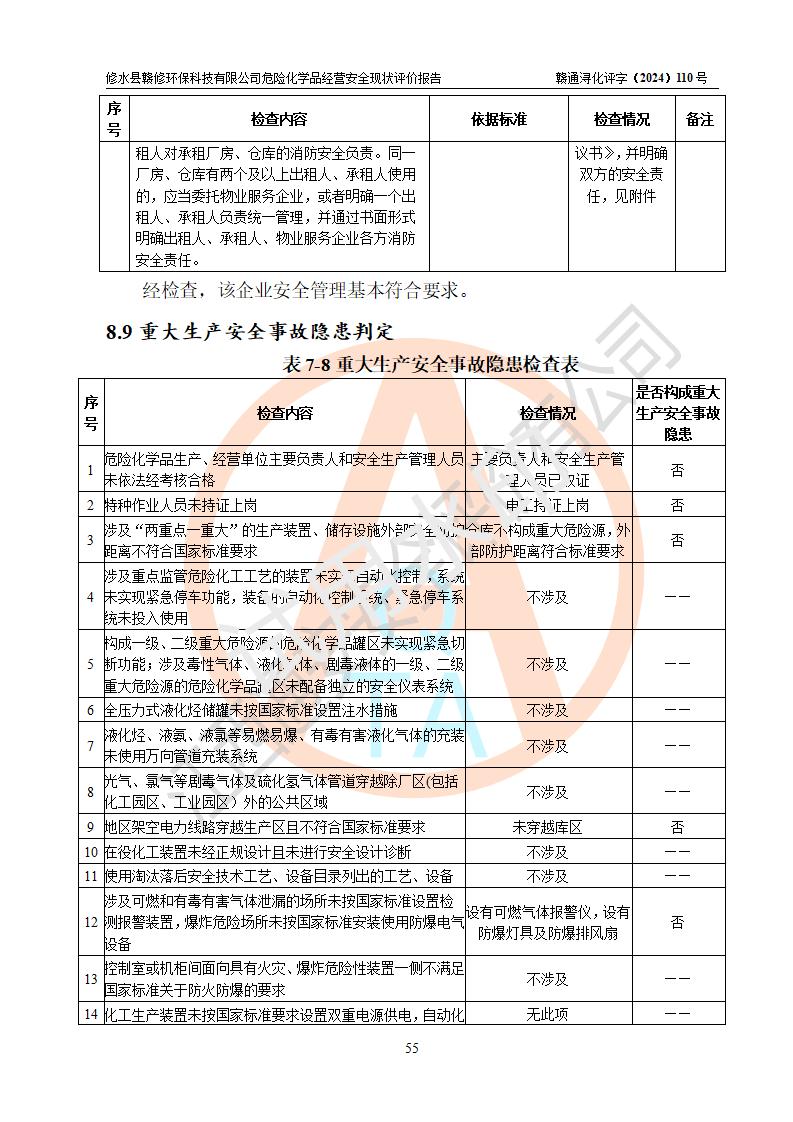 评价结论 | 修水县赣修**科技有限公司外部防护距离和总平面布局符合《建筑设计防火规范2018年版》(GB50016-2014 )、《危险化学品经营企业安全技术其本要求》(GB18265-2019)、《危险品化学品仓库储存通则》 (GB15603-2022)等标准规范要求,其他方面按相关法规、规范要求采取了相应的技术设施和安全管理措施,其风险可控,能达到可以接受的程度,可满足安全生产条件。 | ||||||