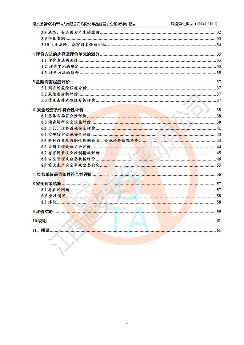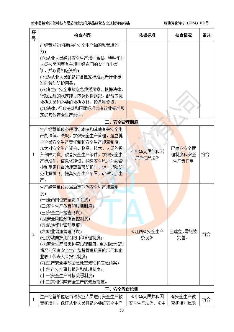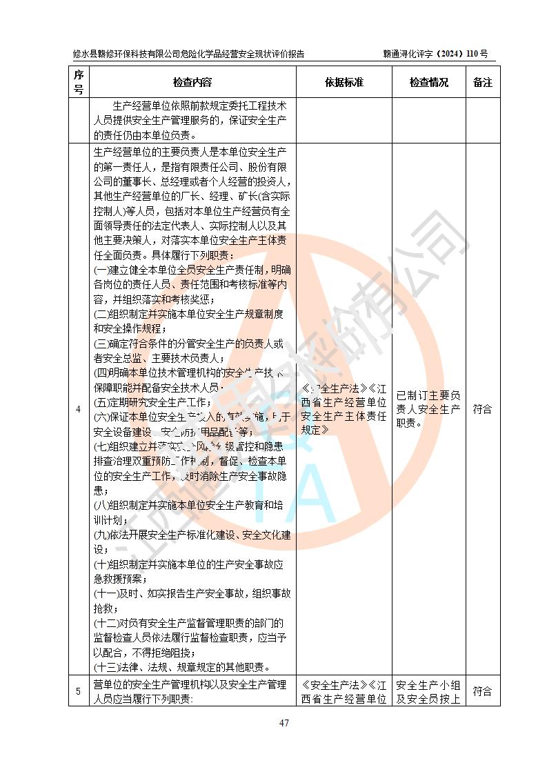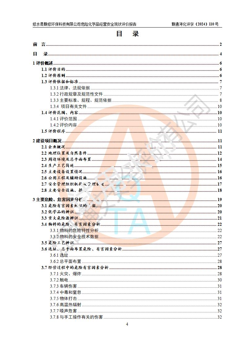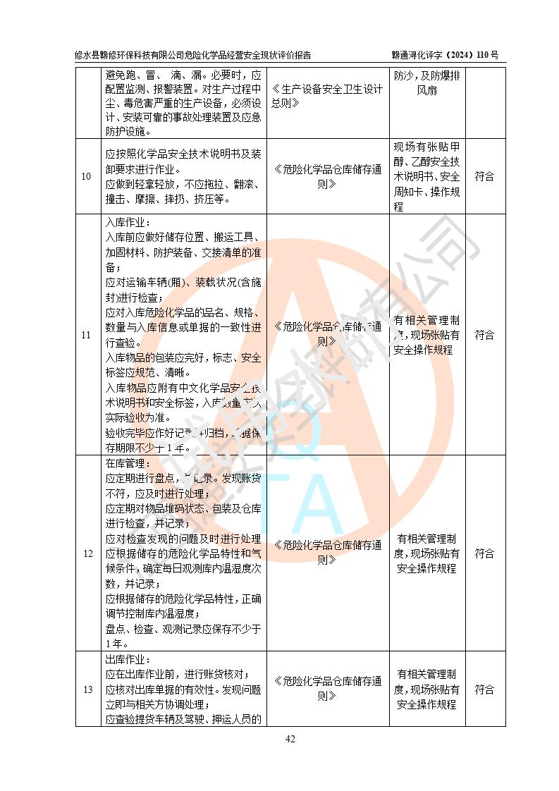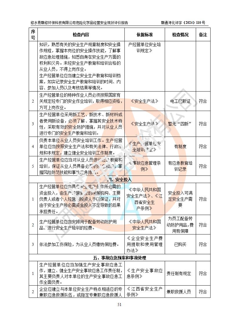 评价结论 | 修水县赣修**科技有限公司外部防护距离和总平面布局符合《建筑设计防火规范2018年版》(GB50016-2014 )、《危险化学品经营企业安全技术其本要求》(GB18265-2019)、《危险品化学品仓库储存通则》 (GB15603-2022)等标准规范要求,其他方面按相关法规、规范要求采取了相应的技术设施和安全管理措施,其风险可控,能达到可以接受的程度,可满足安全生产条件。 | ||||||