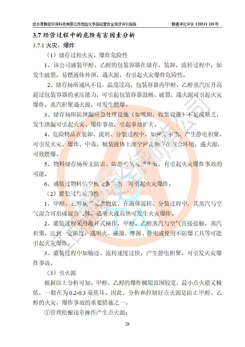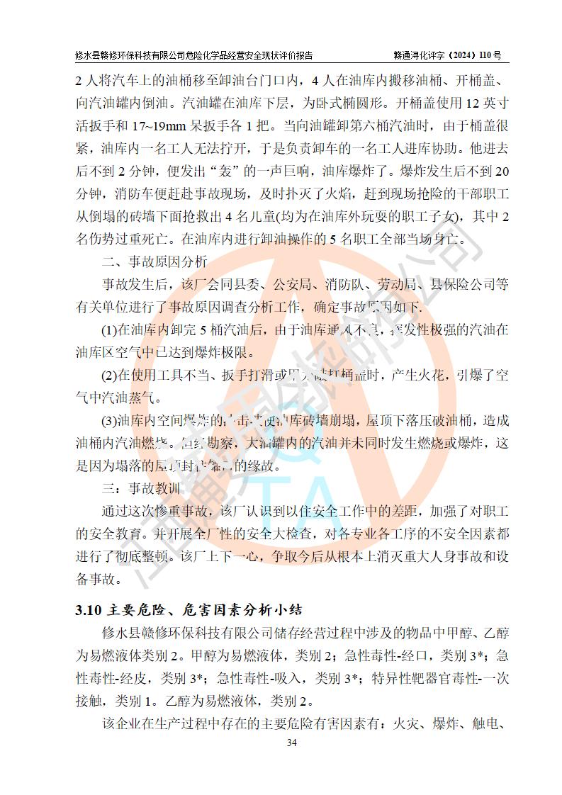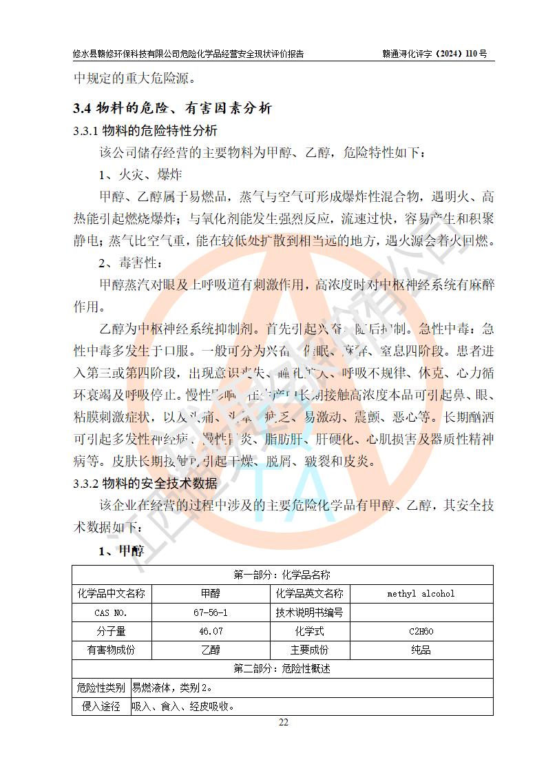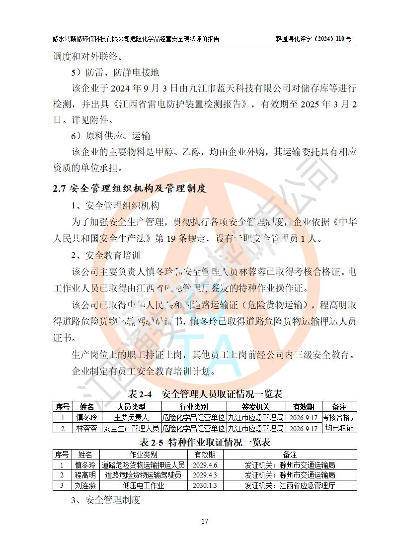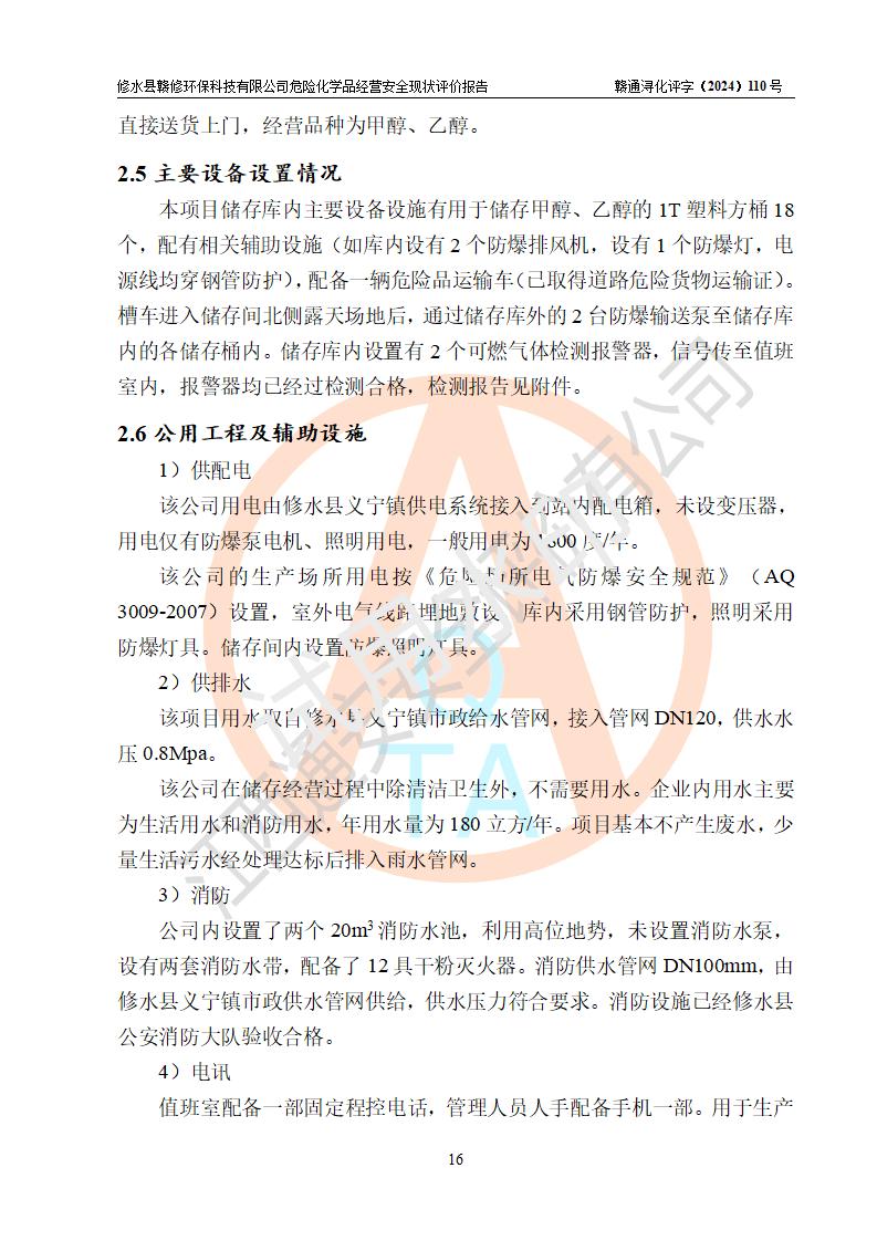 项目简介 | 修水县赣修**科技有限公司是一家从事储存经营甲醇、乙醇等危险化学品的有限责任公司(自然人投资或控股),法定**人慎冬玲。经营范围:许可项目:甲醇、乙醇,燃气燃烧器具安装、维修(依法须批准的项目,经相关部门批准后方可开展经营活动),一般项目:**咨询服务,技术服务、技术开发、技术咨询、技术交流、技术**、技术推广,非食用植物油加工 ,非食用植物油销售,**化学产品销售(不含危险化学品),生物质液体燃料生产工艺研发,化工产品销售(不含许可类化工产品),厨具卫具及日用杂品批发,日用品销售,非电力家用器具销售(除许可业务外,可自主依法经营法律法规非禁止或限制的项目)。企业住所位于江西省九江市修水县义宁镇站前路140号,注册资本伍拾万元整。现有员工5人,其中安全管理人员1人,法定**人慎冬玲。 该公司租赁修水县林业集团公司(汽配公司)位于九江市修水县北门神仙脑林业汽车配件公司场地,占地面积为500m2。该企业在储存、经营过程中涉及的危险化学品有甲醇、乙醇等。该公司设有1吨的方形桶储存甲醇、乙醇及配套设施,从事储存经营;设有1个甲类储存仓库,储存库占地面积105m2。企业经营过程中涉及的危险化学品均已列入《危险化学品目录(2015年版,2022年修改)》。该公司于2022年05月16日由九江市行政审批局签发的《危险化学品经营许可证》(证号:赣九行审经(甲)字[2022]000067),**期至2025年01月23日。 根据《危险化学品经营许可证管理办法》(**安监总局第55号令,第79号令修改)以及《江西省安全生产监督管理局关于贯彻﹤危险化学品经营许可证管理办法﹥的通知》(赣安监管二字﹝2013﹞14号)的要求,危险化学品经营许可证的**期为3年。**期满后,企业需要继续从事危险化学品经营活动的,应当在危险化学品经营许可证**期满3个月前,向发证机关提出危险化学品经营许可证的延期申请。申请证照延期的所有储存、经营危险化学品的单位,应当提供安全评价报告。修水县赣修**科技有限公司目前正在做危险化学品经营许可证延期换证的准备工作,故委托江西通安安全评价有限公司承担其危险化学品经营现状评价工作。 江西通安安全评价有限公司接受委托后,组织了评价小组。根据相关法律、法规和标准的规定,于2024 年11月勘察了企业经营场所。在对委托方相关装置的运行及其安全管理的现状进行充分了解后,充分查找了其存在的危险、有害因素种类和危险危害程度;对存在的问题,评价组成员和委托方的陪同人员进行了及时的沟通,并提出了整改措施;企业及时完成了整改。评价小组在委托方提供的有关技术和管理资料基础上,按照《安全评价通则》(AQ8001-2007)的要求,依据**有关法律、法规、标准和规范,采用合适的安全评价方法,编制完成了本安全评价报告,以作为企业安全生产技术与安全生产管理决策及应急管理部门实施监督管理提供安全技术依据。 本次安全评价范围为:修水县赣修**科技有限公司储存经营甲醇、乙醇等的储存装置和辅助设施,以及储存过程中涉及的设备设施的安全技术措施和安全管理措施。包括储存经营过程中的危险有害因素、安全生产条件以及工艺、设备设施的安全可靠性和安全管理的组织、机构、人员、防护设施、作业环境、管理制度等。 项目涉及的环境保护、消防、职业卫生等问题则应执行**的有关规定及相关标准。本评价引用到的**、消防、职业卫生等方面的法规标准与安全评价有**的关联,环境保护、职业卫生与消防应以其主管部门审核意见为准。厂外运输不在评价范围,出库后经危化品运输车分装至用户不在本次评价范围,只作一般性描述。 | ||||||
