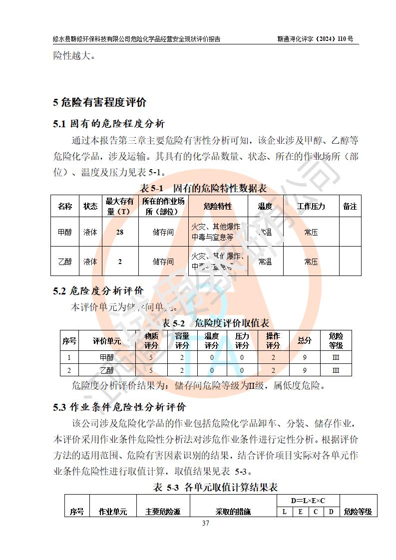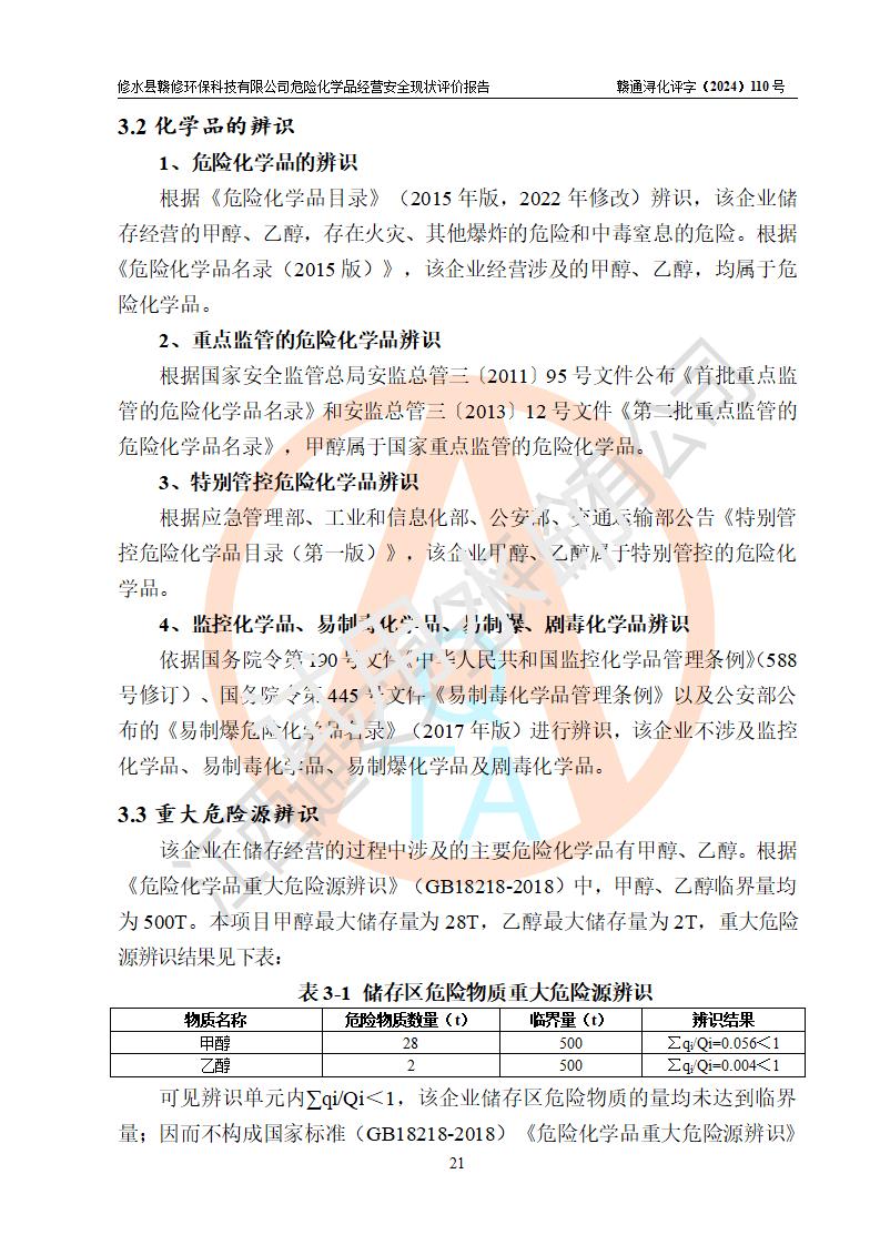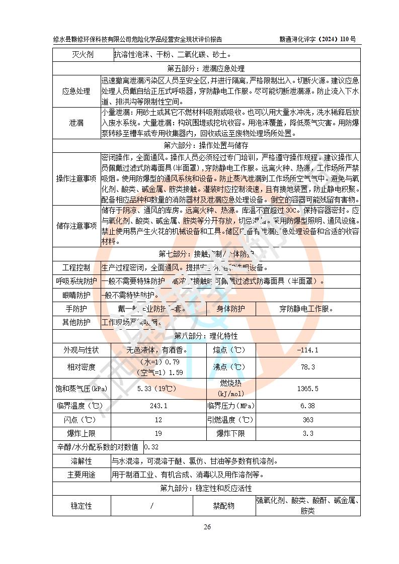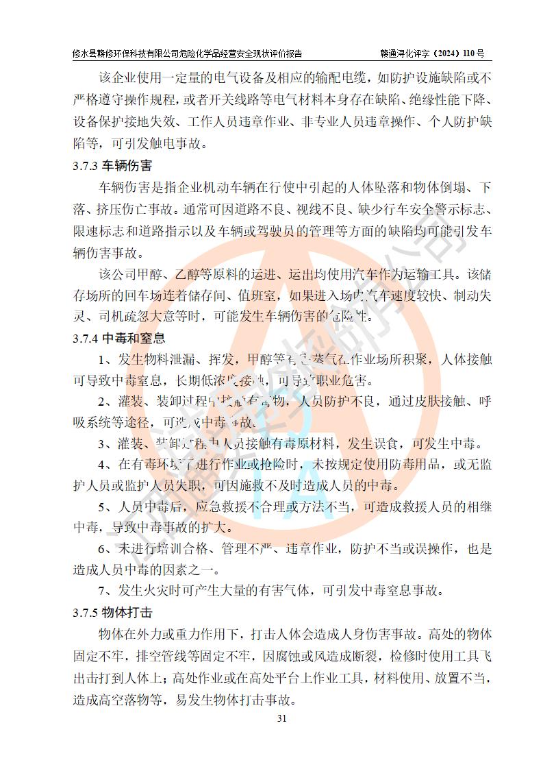 项目简介 | 修水县赣修**科技有限公司是一家从事储存经营甲醇、乙醇等危险化学品的有限责任公司(自然人投资或控股),法定**人慎冬玲。经营范围:许可项目:甲醇、乙醇,燃气燃烧器具安装、维修(依法须批准的项目,经相关部门批准后方可开展经营活动),一般项目:**咨询服务,技术服务、技术开发、技术咨询、技术交流、技术**、技术推广,非食用植物油加工 ,非食用植物油销售,**化学产品销售(不含危险化学品),生物质液体燃料生产工艺研发,化工产品销售(不含许可类化工产品),厨具卫具及日用杂品批发,日用品销售,非电力家用器具销售(除许可业务外,可自主依法经营法律法规非禁止或限制的项目)。企业住所位于江西省九江市修水县义宁镇站前路140号,注册资本伍拾万元整。现有员工5人,其中安全管理人员1人,法定**人慎冬玲。 该公司租赁修水县林业集团公司(汽配公司)位于九江市修水县北门神仙脑林业汽车配件公司场地,占地面积为500m2。该企业在储存、经营过程中涉及的危险化学品有甲醇、乙醇等。该公司设有1吨的方形桶储存甲醇、乙醇及配套设施,从事储存经营;设有1个甲类储存仓库,储存库占地面积105m2。企业经营过程中涉及的危险化学品均已列入《危险化学品目录(2015年版,2022年修改)》。该公司于2022年05月16日由九江市行政审批局签发的《危险化学品经营许可证》(证号:赣九行审经(甲)字[2022]000067),**期至2025年01月23日。 根据《危险化学品经营许可证管理办法》(**安监总局第55号令,第79号令修改)以及《江西省安全生产监督管理局关于贯彻﹤危险化学品经营许可证管理办法﹥的通知》(赣安监管二字﹝2013﹞14号)的要求,危险化学品经营许可证的**期为3年。**期满后,企业需要继续从事危险化学品经营活动的,应当在危险化学品经营许可证**期满3个月前,向发证机关提出危险化学品经营许可证的延期申请。申请证照延期的所有储存、经营危险化学品的单位,应当提供安全评价报告。修水县赣修**科技有限公司目前正在做危险化学品经营许可证延期换证的准备工作,故委托江西通安安全评价有限公司承担其危险化学品经营现状评价工作。 江西通安安全评价有限公司接受委托后,组织了评价小组。根据相关法律、法规和标准的规定,于2024 年11月勘察了企业经营场所。在对委托方相关装置的运行及其安全管理的现状进行充分了解后,充分查找了其存在的危险、有害因素种类和危险危害程度;对存在的问题,评价组成员和委托方的陪同人员进行了及时的沟通,并提出了整改措施;企业及时完成了整改。评价小组在委托方提供的有关技术和管理资料基础上,按照《安全评价通则》(AQ8001-2007)的要求,依据**有关法律、法规、标准和规范,采用合适的安全评价方法,编制完成了本安全评价报告,以作为企业安全生产技术与安全生产管理决策及应急管理部门实施监督管理提供安全技术依据。 本次安全评价范围为:修水县赣修**科技有限公司储存经营甲醇、乙醇等的储存装置和辅助设施,以及储存过程中涉及的设备设施的安全技术措施和安全管理措施。包括储存经营过程中的危险有害因素、安全生产条件以及工艺、设备设施的安全可靠性和安全管理的组织、机构、人员、防护设施、作业环境、管理制度等。 项目涉及的环境保护、消防、职业卫生等问题则应执行**的有关规定及相关标准。本评价引用到的**、消防、职业卫生等方面的法规标准与安全评价有**的关联,环境保护、职业卫生与消防应以其主管部门审核意见为准。厂外运输不在评价范围,出库后经危化品运输车分装至用户不在本次评价范围,只作一般性描述。 | ||||||