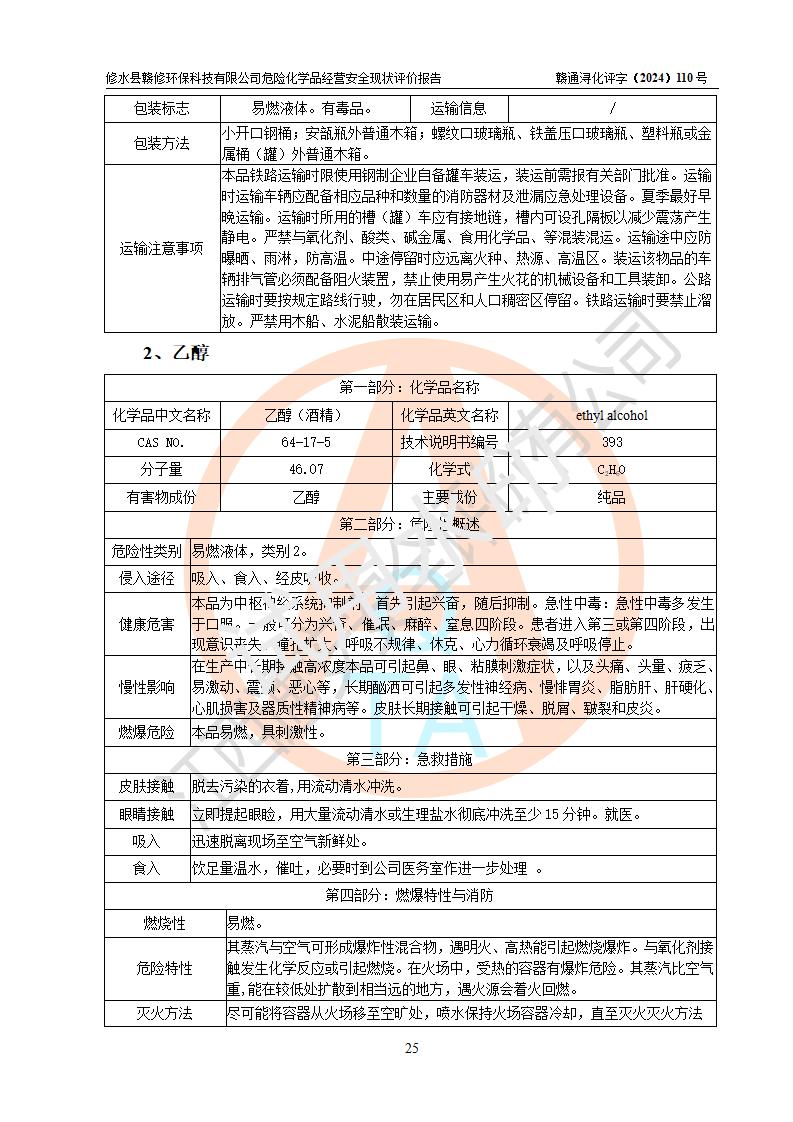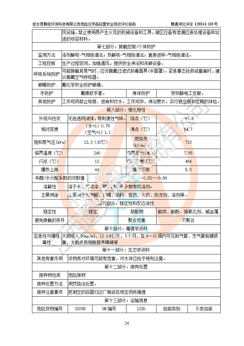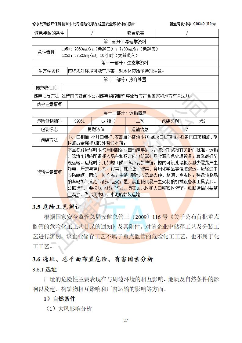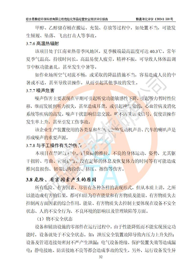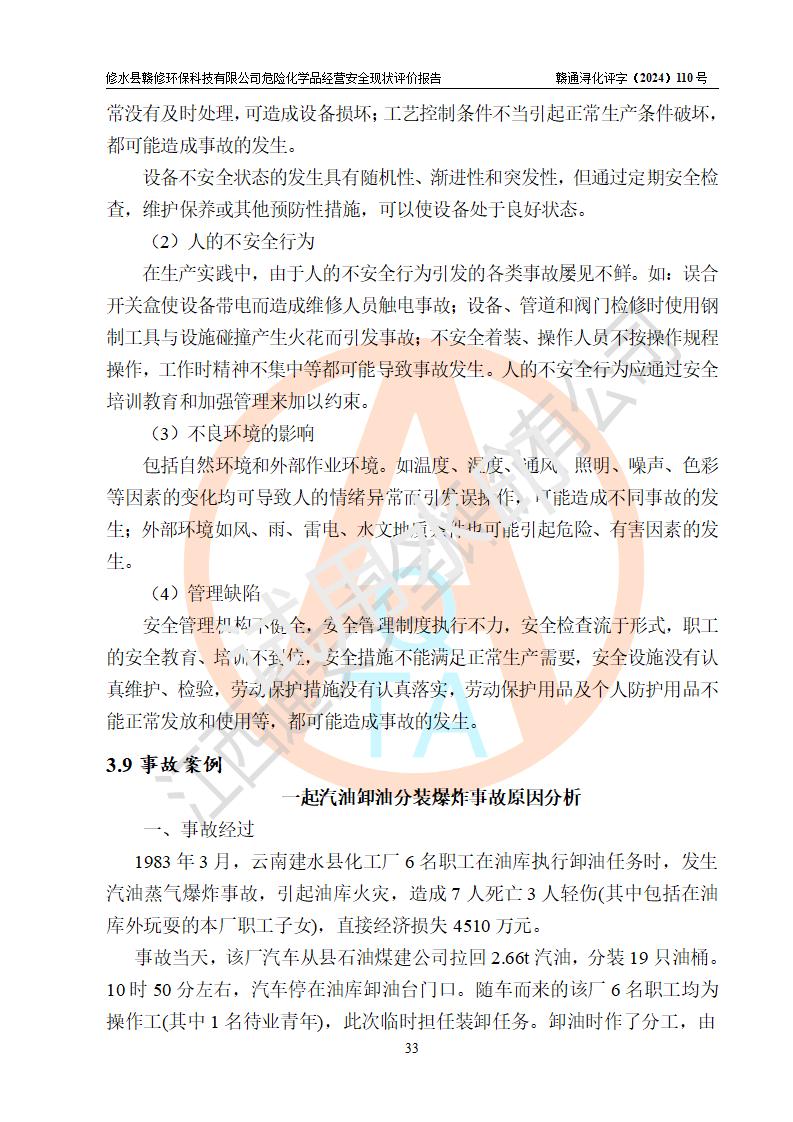 项目简介 | 修水县赣修**科技有限公司是一家从事储存经营甲醇、乙醇等危险化学品的有限责任公司(自然人投资或控股),法定**人慎冬玲。经营范围:许可项目:甲醇、乙醇,燃气燃烧器具安装、维修(依法须批准的项目,经相关部门批准后方可开展经营活动),一般项目:**咨询服务,技术服务、技术开发、技术咨询、技术交流、技术**、技术推广,非食用植物油加工 ,非食用植物油销售,**化学产品销售(不含危险化学品),生物质液体燃料生产工艺研发,化工产品销售(不含许可类化工产品),厨具卫具及日用杂品批发,日用品销售,非电力家用器具销售(除许可业务外,可自主依法经营法律法规非禁止或限制的项目)。企业住所位于江西省九江市修水县义宁镇站前路140号,注册资本伍拾万元整。现有员工5人,其中安全管理人员1人,法定**人慎冬玲。 该公司租赁修水县林业集团公司(汽配公司)位于九江市修水县北门神仙脑林业汽车配件公司场地,占地面积为500m2。该企业在储存、经营过程中涉及的危险化学品有甲醇、乙醇等。该公司设有1吨的方形桶储存甲醇、乙醇及配套设施,从事储存经营;设有1个甲类储存仓库,储存库占地面积105m2。企业经营过程中涉及的危险化学品均已列入《危险化学品目录(2015年版,2022年修改)》。该公司于2022年05月16日由九江市行政审批局签发的《危险化学品经营许可证》(证号:赣九行审经(甲)字[2022]000067),**期至2025年01月23日。 根据《危险化学品经营许可证管理办法》(**安监总局第55号令,第79号令修改)以及《江西省安全生产监督管理局关于贯彻﹤危险化学品经营许可证管理办法﹥的通知》(赣安监管二字﹝2013﹞14号)的要求,危险化学品经营许可证的**期为3年。**期满后,企业需要继续从事危险化学品经营活动的,应当在危险化学品经营许可证**期满3个月前,向发证机关提出危险化学品经营许可证的延期申请。申请证照延期的所有储存、经营危险化学品的单位,应当提供安全评价报告。修水县赣修**科技有限公司目前正在做危险化学品经营许可证延期换证的准备工作,故委托江西通安安全评价有限公司承担其危险化学品经营现状评价工作。 江西通安安全评价有限公司接受委托后,组织了评价小组。根据相关法律、法规和标准的规定,于2024 年11月勘察了企业经营场所。在对委托方相关装置的运行及其安全管理的现状进行充分了解后,充分查找了其存在的危险、有害因素种类和危险危害程度;对存在的问题,评价组成员和委托方的陪同人员进行了及时的沟通,并提出了整改措施;企业及时完成了整改。评价小组在委托方提供的有关技术和管理资料基础上,按照《安全评价通则》(AQ8001-2007)的要求,依据**有关法律、法规、标准和规范,采用合适的安全评价方法,编制完成了本安全评价报告,以作为企业安全生产技术与安全生产管理决策及应急管理部门实施监督管理提供安全技术依据。 本次安全评价范围为:修水县赣修**科技有限公司储存经营甲醇、乙醇等的储存装置和辅助设施,以及储存过程中涉及的设备设施的安全技术措施和安全管理措施。包括储存经营过程中的危险有害因素、安全生产条件以及工艺、设备设施的安全可靠性和安全管理的组织、机构、人员、防护设施、作业环境、管理制度等。 项目涉及的环境保护、消防、职业卫生等问题则应执行**的有关规定及相关标准。本评价引用到的**、消防、职业卫生等方面的法规标准与安全评价有**的关联,环境保护、职业卫生与消防应以其主管部门审核意见为准。厂外运输不在评价范围,出库后经危化品运输车分装至用户不在本次评价范围,只作一般性描述。 | ||||||