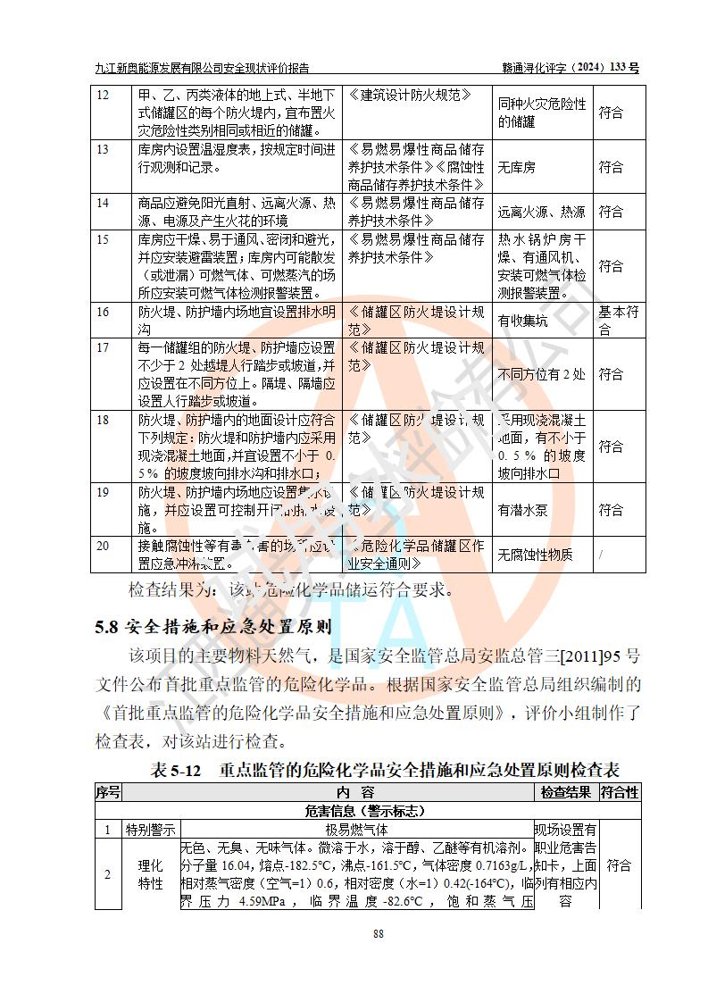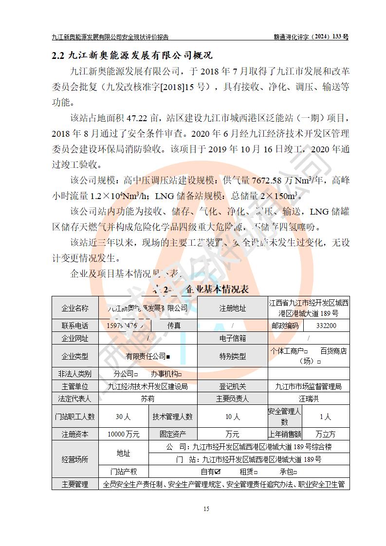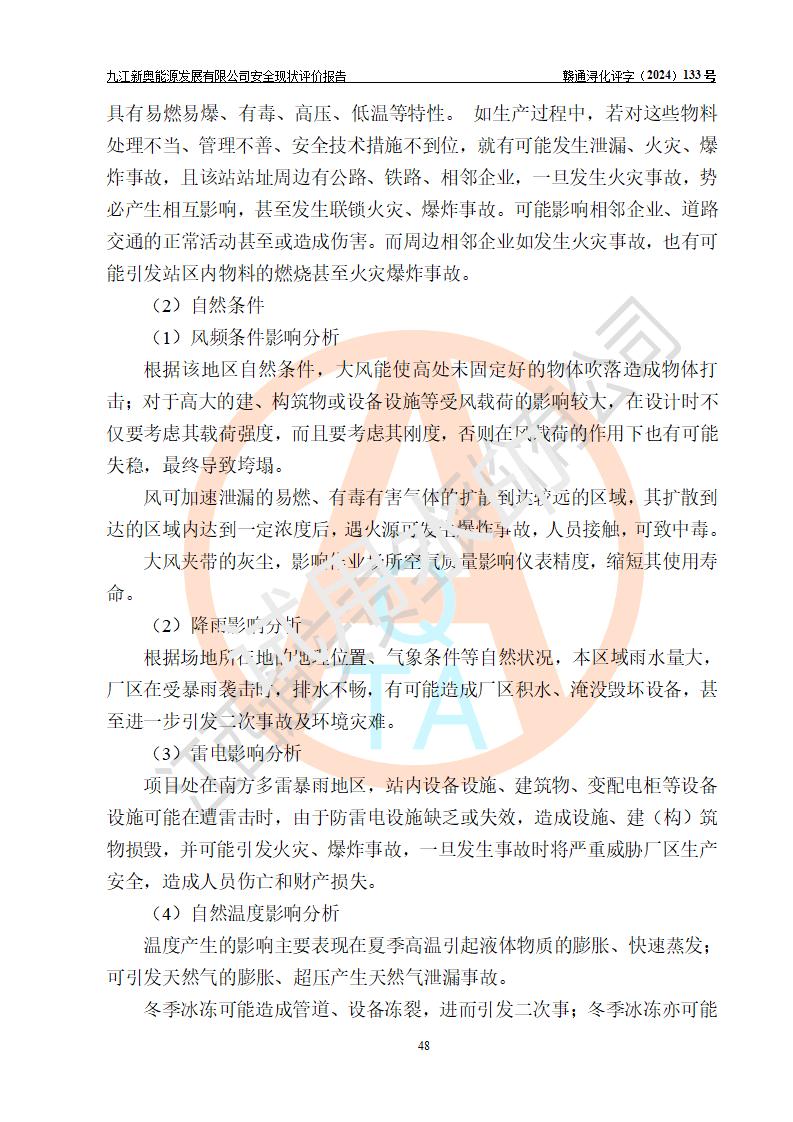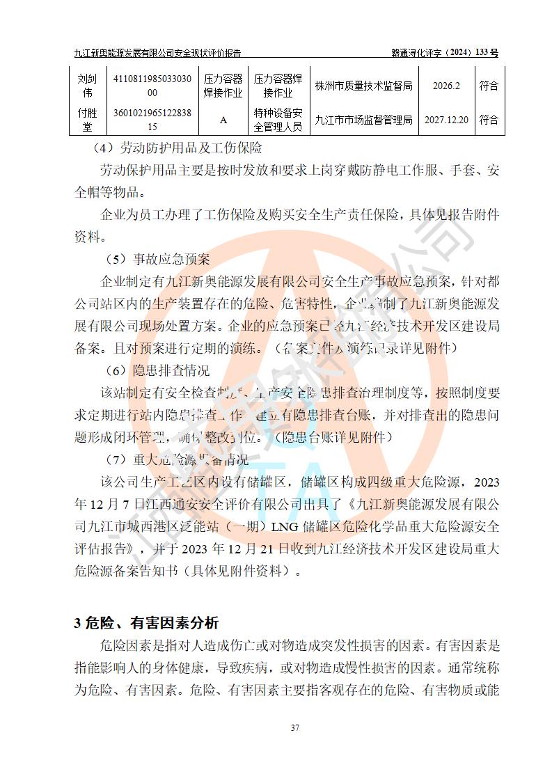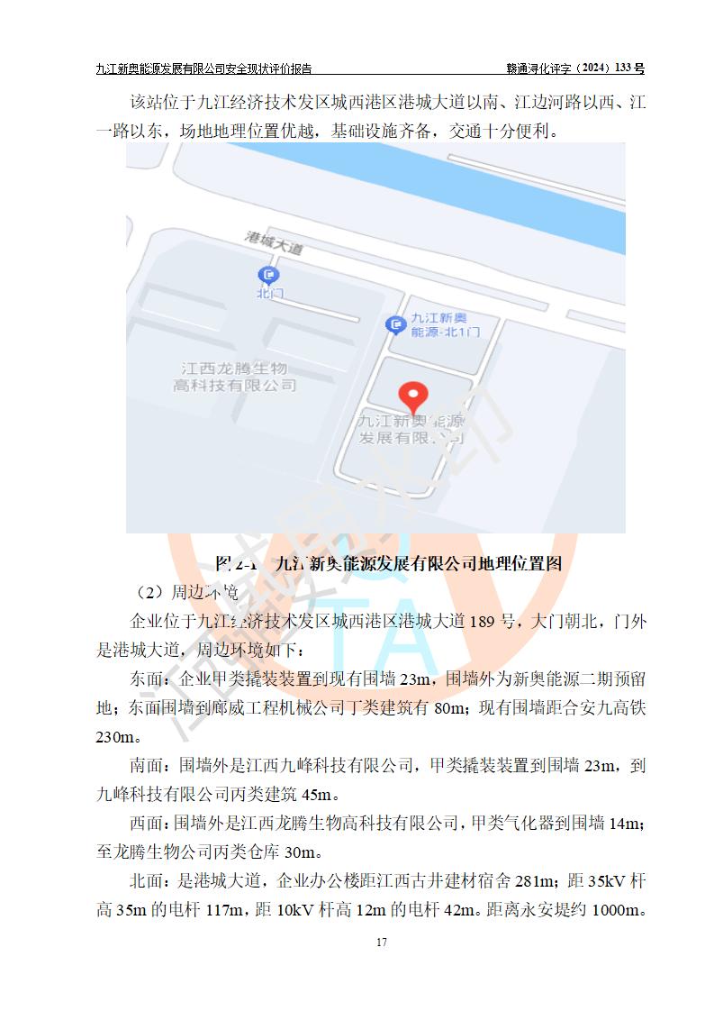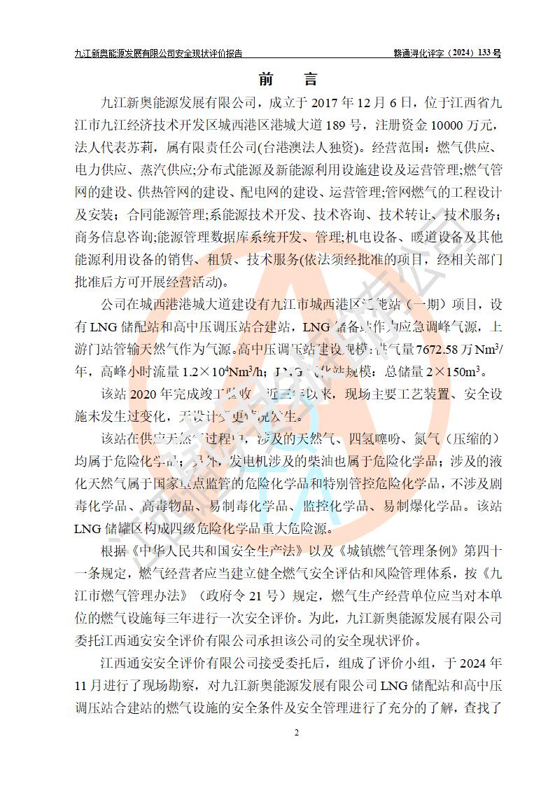项目简介 | 九江新奥能源发展有限公司,成立于2017年12月6日,位于江西省九江市九江经济技术开发区城西港区港城大道189号,注册资金10000万元,法人**苏莉,属有限责任公司(台港澳法人独资)。经营范围:燃气供应、电力供应、蒸汽供应;分布式能源及新能源利用设施建设及运营管理;燃气管网的建设、供热管网的建设、配电网的建设、运营管理;管网燃气的工程设计及安装;合同能源管理;系能源技术开发、技术咨询、技术**、技术服务;商务信息咨询;能源管理数据库系统开发、管理;机电设备、暖道设备及其他能源利用设备的销售、租赁、技术服务(依法须经批准的项目,经相关部门批准后方可开展经营活动)。 公司在城西港港城大道建设有九江市城西港区泛能站(一期)项目,设有LNG储配站和高中压调压站合建站,LNG储备站作为应急调峰气源,上游门站管输天然气作为气源。高中压调压站建设规模:供气量7672.58万Nm3/年,高峰小时流量1.2×104Nm3/h;LNG气化站规模:总储量2×150m3。 该站2020年完成竣工验收,近三年以来,现场主要工艺装置、安全设施未发生过变化,无设计变更情况发生。 该站在供应天然气过程中,涉及的天然气、四氢噻吩、氮气(压缩的)均属于危险化学品;另外,发电机涉及的柴油也属于危险化学品;涉及的液化天然气属于**重点监管的危险化学品和特别管控危险化学品,不涉及剧毒化学品、高毒物品、易制毒化学品、监控化学品、易制爆化学品。该站LNG储罐区构成四级危险化学品重大危险源。 根据《中华人民共和国安全生产法》以及《城镇燃气管理条例》第四十一条规定,燃气经营者应当建立健全燃气安全评估和风险管理体系,按《九江市燃气管理办法》(**令21号)规定,燃气生产经营单位应当对本单位的燃气设施每三年进行一次安全评价。为此,九江新奥能源发展有限公司委托江西通安安全评价有限公司承担该公司的安全现状评价。 江西通安安全评价有限公司接受委托后,组成了评价小组,于2024年11月进行了现场勘察,对九江新奥能源发展有限公司LNG储配站和高中压调压站合建站的燃气设施的安全条件及安全管理进行了充分的了解,查找了其存在的危险、有害因素种类和程度,对存在的问题,评价组成员和委托方的陪同人员进行了及时的沟通,并提出了整改措施;按照《安全评价通则》(AQ8001-2007)的要求,依据**有关法律、法规、标准和规范,采用合适的安全评价方法,编制完成了本安全评价报告,以作为企业安全生产技术与安全生产管理决策及应急管理部门实施安全监督管理提供技术依据。 本次安全评价范围为:九江新奥能源发展有限公司选址及总平面布置、主体装置和辅助设施,包括站区内天然气接收装置、过滤、计量、调压、加臭设施、LNG储罐区等主体装置和公共辅助设施;评价该公司的安全管理制度、安全组织机构及其安全管理等。 九江新奥能源发展有限公司上、下游的管道及管道输送工程不在评价范围内;项目配套的行政、生活设施除总体布局外,不在评价范围内。本站LNG气化后向用户输送的中压管道及站区外的天然气管网以及站外天然气运输不在本评估范围内。 本评价引用到的**、消防方面的法规标准与安全评价有**的关联,本评价涉及的环境保护与消防评价内容,不****和消防主管部门的意见,环境保护与消防应以其主管部门检查的意见为准;自然灾害方面不包括在本评价范围内,只对涉及部分做一般性评述。 | ||||||
