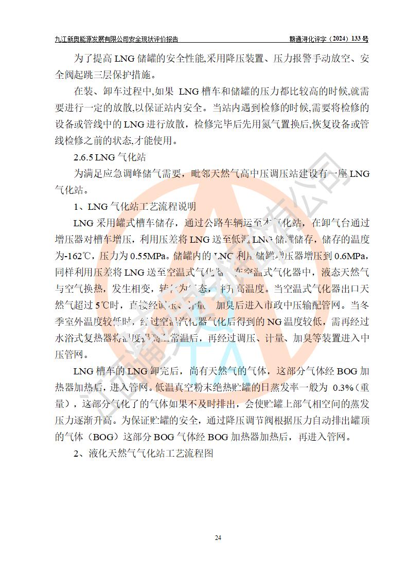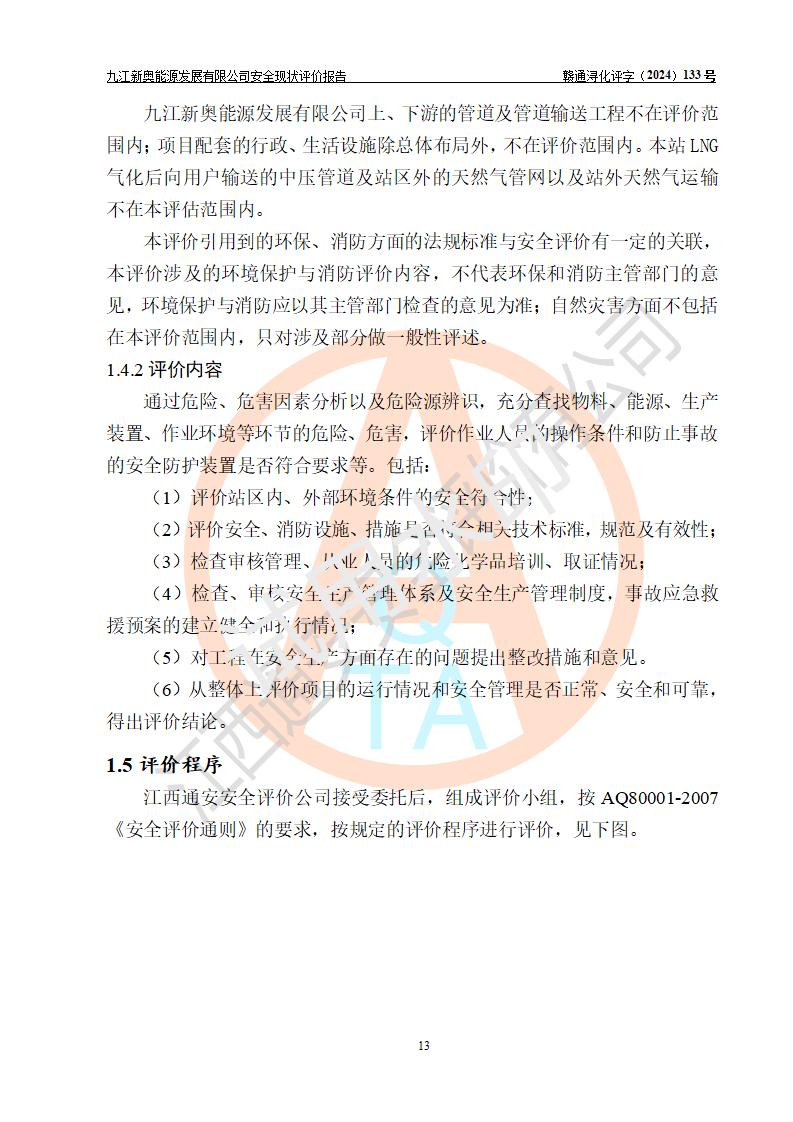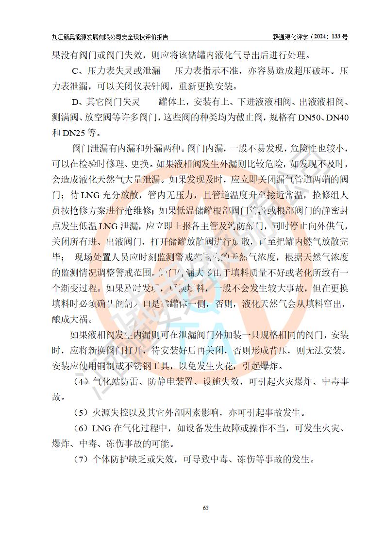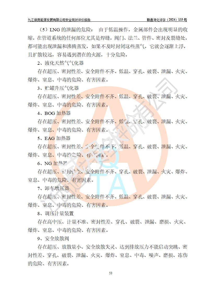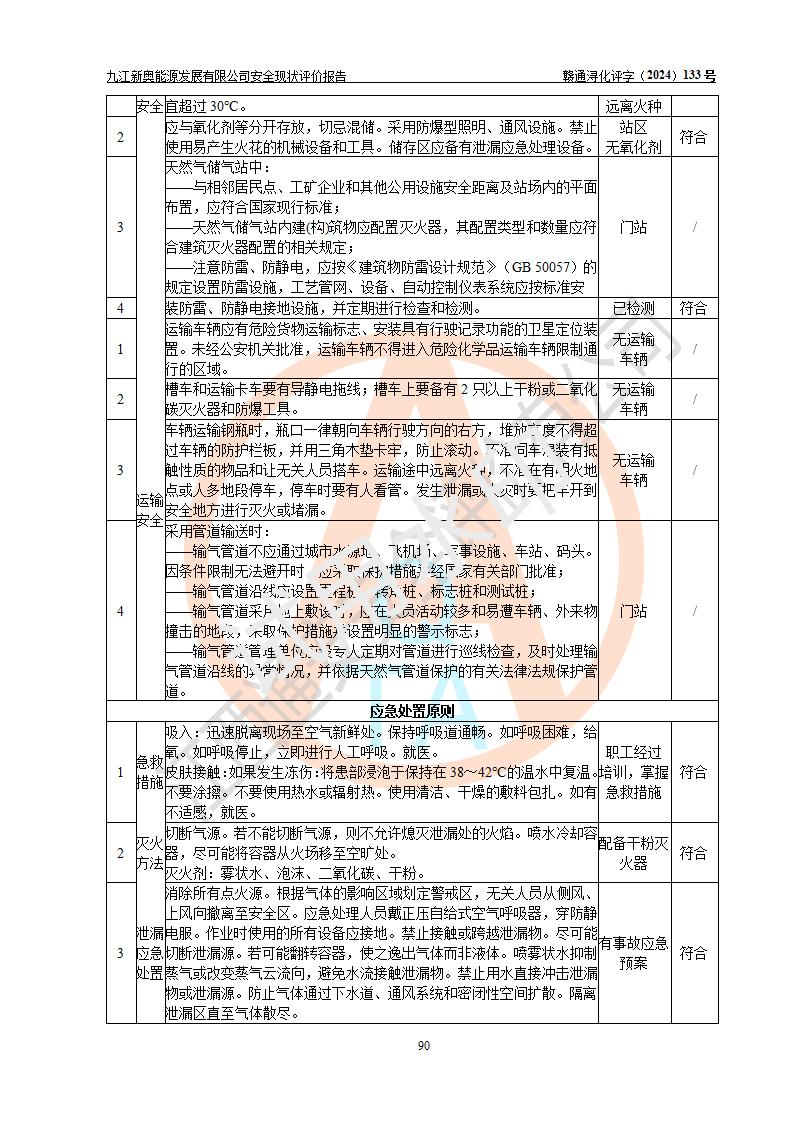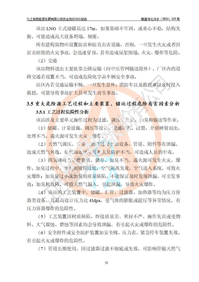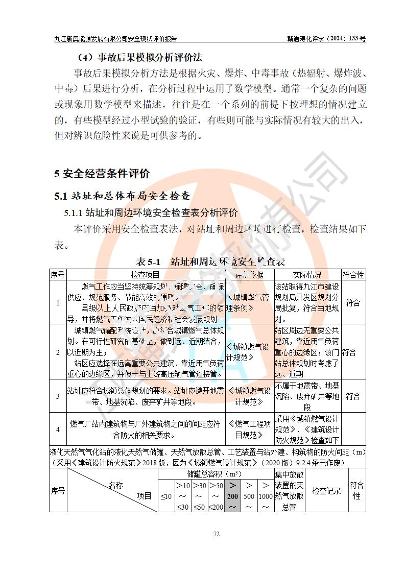 项目简介 | 九江新奥能源发展有限公司,成立于2017年12月6日,位于江西省九江市九江经济技术开发区城西港区港城大道189号,注册资金10000万元,法人**苏莉,属有限责任公司(台港澳法人独资)。经营范围:燃气供应、电力供应、蒸汽供应;分布式能源及新能源利用设施建设及运营管理;燃气管网的建设、供热管网的建设、配电网的建设、运营管理;管网燃气的工程设计及安装;合同能源管理;系能源技术开发、技术咨询、技术**、技术服务;商务信息咨询;能源管理数据库系统开发、管理;机电设备、暖道设备及其他能源利用设备的销售、租赁、技术服务(依法须经批准的项目,经相关部门批准后方可开展经营活动)。 公司在城西港港城大道建设有九江市城西港区泛能站(一期)项目,设有LNG储配站和高中压调压站合建站,LNG储备站作为应急调峰气源,上游门站管输天然气作为气源。高中压调压站建设规模:供气量7672.58万Nm3/年,高峰小时流量1.2×104Nm3/h;LNG气化站规模:总储量2×150m3。 该站2020年完成竣工验收,近三年以来,现场主要工艺装置、安全设施未发生过变化,无设计变更情况发生。 该站在供应天然气过程中,涉及的天然气、四氢噻吩、氮气(压缩的)均属于危险化学品;另外,发电机涉及的柴油也属于危险化学品;涉及的液化天然气属于**重点监管的危险化学品和特别管控危险化学品,不涉及剧毒化学品、高毒物品、易制毒化学品、监控化学品、易制爆化学品。该站LNG储罐区构成四级危险化学品重大危险源。 根据《中华人民共和国安全生产法》以及《城镇燃气管理条例》第四十一条规定,燃气经营者应当建立健全燃气安全评估和风险管理体系,按《九江市燃气管理办法》(**令21号)规定,燃气生产经营单位应当对本单位的燃气设施每三年进行一次安全评价。为此,九江新奥能源发展有限公司委托江西通安安全评价有限公司承担该公司的安全现状评价。 江西通安安全评价有限公司接受委托后,组成了评价小组,于2024年11月进行了现场勘察,对九江新奥能源发展有限公司LNG储配站和高中压调压站合建站的燃气设施的安全条件及安全管理进行了充分的了解,查找了其存在的危险、有害因素种类和程度,对存在的问题,评价组成员和委托方的陪同人员进行了及时的沟通,并提出了整改措施;按照《安全评价通则》(AQ8001-2007)的要求,依据**有关法律、法规、标准和规范,采用合适的安全评价方法,编制完成了本安全评价报告,以作为企业安全生产技术与安全生产管理决策及应急管理部门实施安全监督管理提供技术依据。 本次安全评价范围为:九江新奥能源发展有限公司选址及总平面布置、主体装置和辅助设施,包括站区内天然气接收装置、过滤、计量、调压、加臭设施、LNG储罐区等主体装置和公共辅助设施;评价该公司的安全管理制度、安全组织机构及其安全管理等。 九江新奥能源发展有限公司上、下游的管道及管道输送工程不在评价范围内;项目配套的行政、生活设施除总体布局外,不在评价范围内。本站LNG气化后向用户输送的中压管道及站区外的天然气管网以及站外天然气运输不在本评估范围内。 本评价引用到的**、消防方面的法规标准与安全评价有**的关联,本评价涉及的环境保护与消防评价内容,不****和消防主管部门的意见,环境保护与消防应以其主管部门检查的意见为准;自然灾害方面不包括在本评价范围内,只对涉及部分做一般性评述。 | ||||||