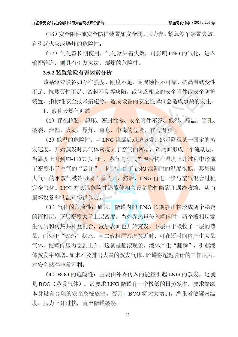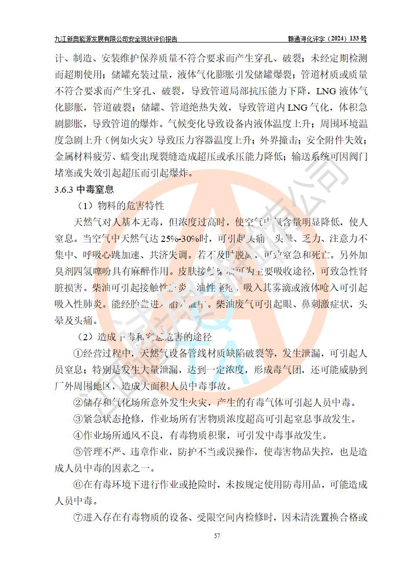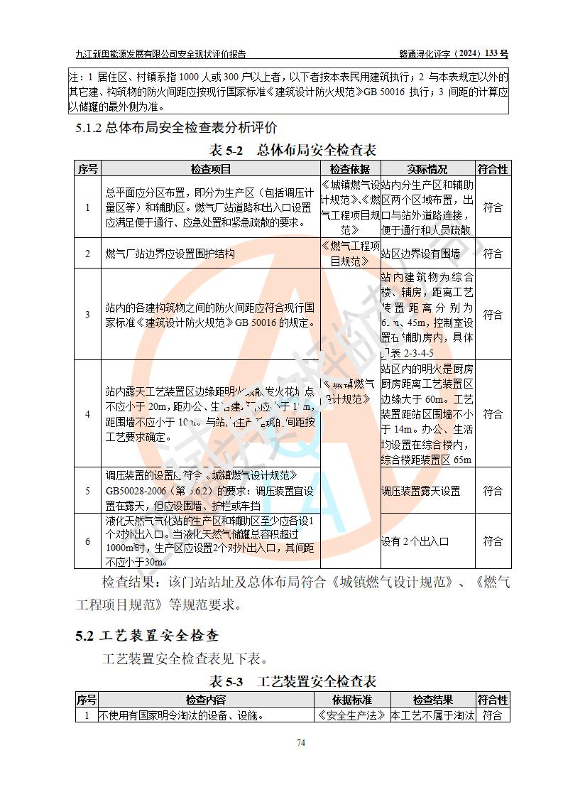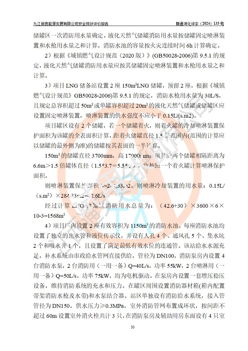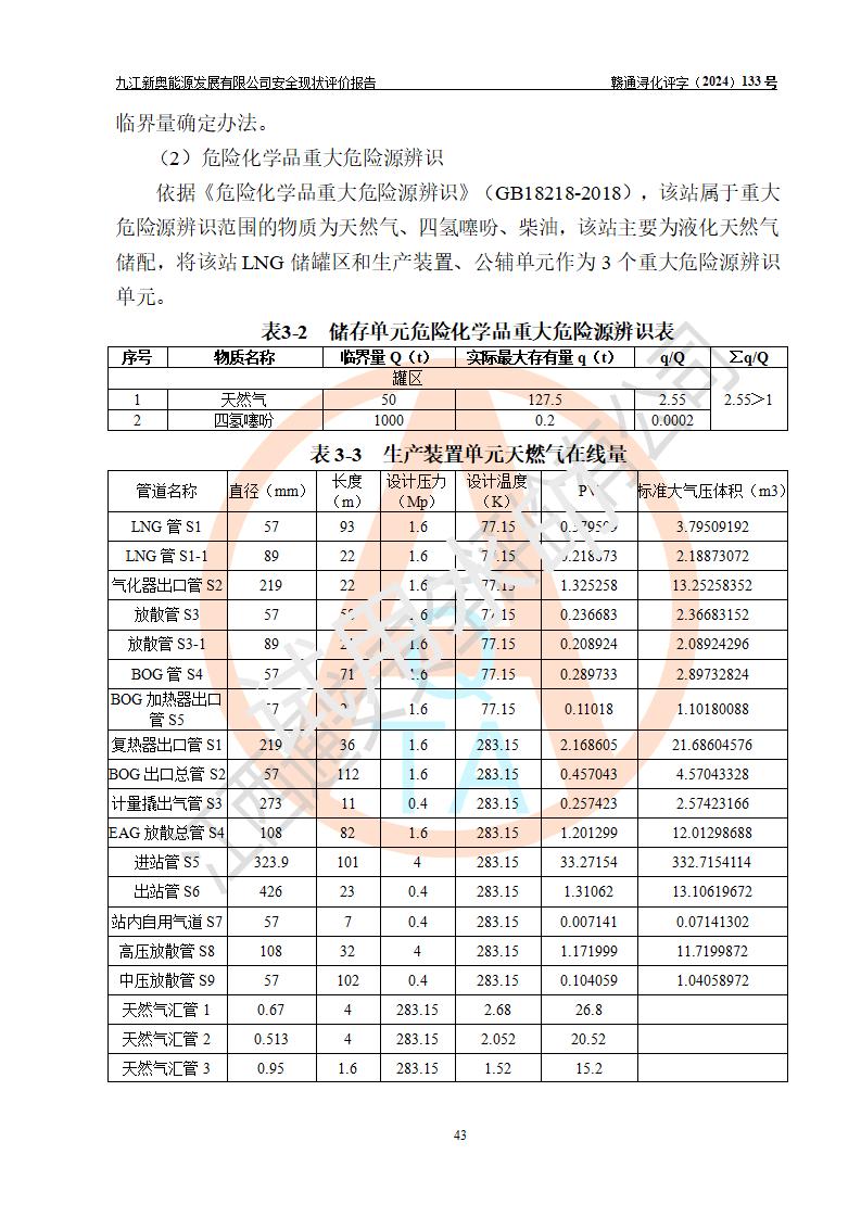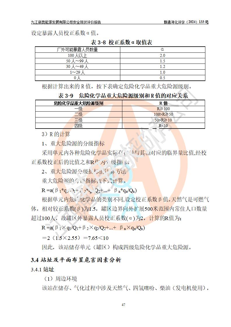 项目简介 | 九江新奥能源发展有限公司,成立于2017年12月6日,位于江西省九江市九江经济技术开发区城西港区港城大道189号,注册资金10000万元,法人**苏莉,属有限责任公司(台港澳法人独资)。经营范围:燃气供应、电力供应、蒸汽供应;分布式能源及新能源利用设施建设及运营管理;燃气管网的建设、供热管网的建设、配电网的建设、运营管理;管网燃气的工程设计及安装;合同能源管理;系能源技术开发、技术咨询、技术**、技术服务;商务信息咨询;能源管理数据库系统开发、管理;机电设备、暖道设备及其他能源利用设备的销售、租赁、技术服务(依法须经批准的项目,经相关部门批准后方可开展经营活动)。 公司在城西港港城大道建设有九江市城西港区泛能站(一期)项目,设有LNG储配站和高中压调压站合建站,LNG储备站作为应急调峰气源,上游门站管输天然气作为气源。高中压调压站建设规模:供气量7672.58万Nm3/年,高峰小时流量1.2×104Nm3/h;LNG气化站规模:总储量2×150m3。 该站2020年完成竣工验收,近三年以来,现场主要工艺装置、安全设施未发生过变化,无设计变更情况发生。 该站在供应天然气过程中,涉及的天然气、四氢噻吩、氮气(压缩的)均属于危险化学品;另外,发电机涉及的柴油也属于危险化学品;涉及的液化天然气属于**重点监管的危险化学品和特别管控危险化学品,不涉及剧毒化学品、高毒物品、易制毒化学品、监控化学品、易制爆化学品。该站LNG储罐区构成四级危险化学品重大危险源。 根据《中华人民共和国安全生产法》以及《城镇燃气管理条例》第四十一条规定,燃气经营者应当建立健全燃气安全评估和风险管理体系,按《九江市燃气管理办法》(**令21号)规定,燃气生产经营单位应当对本单位的燃气设施每三年进行一次安全评价。为此,九江新奥能源发展有限公司委托江西通安安全评价有限公司承担该公司的安全现状评价。 江西通安安全评价有限公司接受委托后,组成了评价小组,于2024年11月进行了现场勘察,对九江新奥能源发展有限公司LNG储配站和高中压调压站合建站的燃气设施的安全条件及安全管理进行了充分的了解,查找了其存在的危险、有害因素种类和程度,对存在的问题,评价组成员和委托方的陪同人员进行了及时的沟通,并提出了整改措施;按照《安全评价通则》(AQ8001-2007)的要求,依据**有关法律、法规、标准和规范,采用合适的安全评价方法,编制完成了本安全评价报告,以作为企业安全生产技术与安全生产管理决策及应急管理部门实施安全监督管理提供技术依据。 本次安全评价范围为:九江新奥能源发展有限公司选址及总平面布置、主体装置和辅助设施,包括站区内天然气接收装置、过滤、计量、调压、加臭设施、LNG储罐区等主体装置和公共辅助设施;评价该公司的安全管理制度、安全组织机构及其安全管理等。 九江新奥能源发展有限公司上、下游的管道及管道输送工程不在评价范围内;项目配套的行政、生活设施除总体布局外,不在评价范围内。本站LNG气化后向用户输送的中压管道及站区外的天然气管网以及站外天然气运输不在本评估范围内。 本评价引用到的**、消防方面的法规标准与安全评价有**的关联,本评价涉及的环境保护与消防评价内容,不****和消防主管部门的意见,环境保护与消防应以其主管部门检查的意见为准;自然灾害方面不包括在本评价范围内,只对涉及部分做一般性评述。 | ||||||